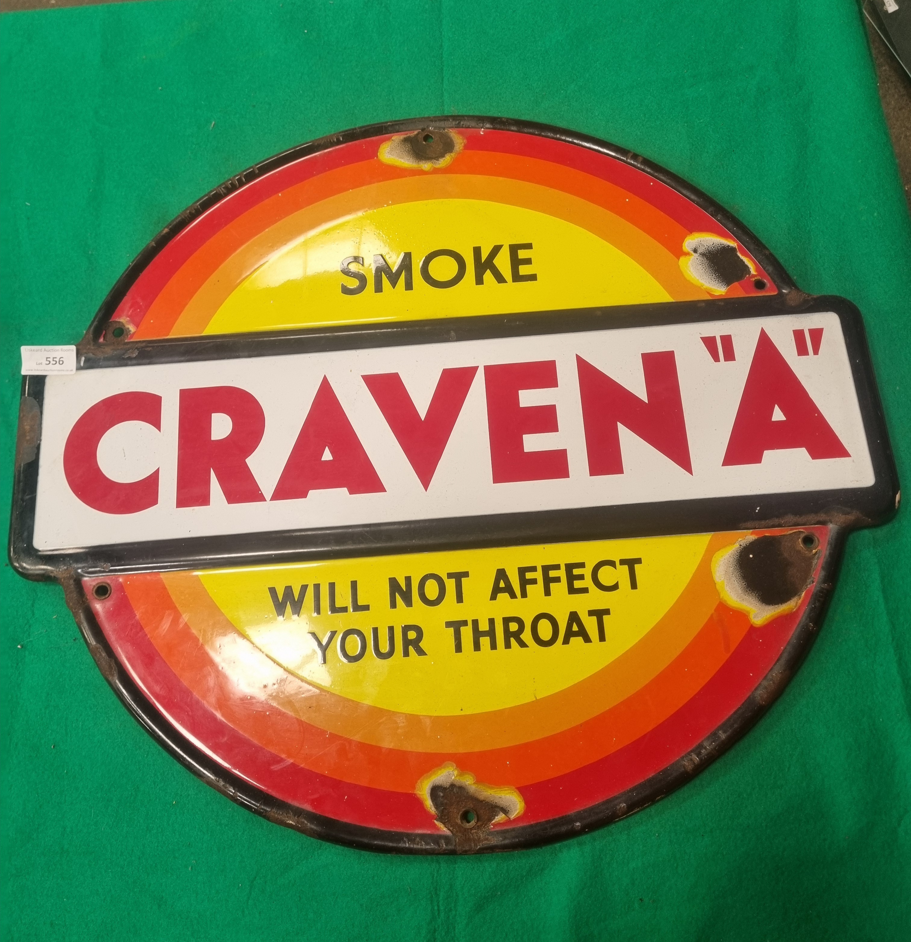 A mid-20th century circular vitreous enamel advertising sign for Craven A cigarettes. The sign features a design of concentric circles in red, orange, and yellow on a yellow ground. A central white horizontal bar with a black border contains the brand name CRAVEN A in red block lettering. The top section of the yellow circle is inscribed with the word SMOKE in black, while the bottom section reads WILL NOT AFFECT YOUR THROAT in black. The sign is constructed of vitreous enamel on a heavy-gauge steel backing. It includes several pre-drilled holes for mounting purposes. An auction lot label for Liskeard Auction Rooms, Lot 556, is attached to the lower-left edge.