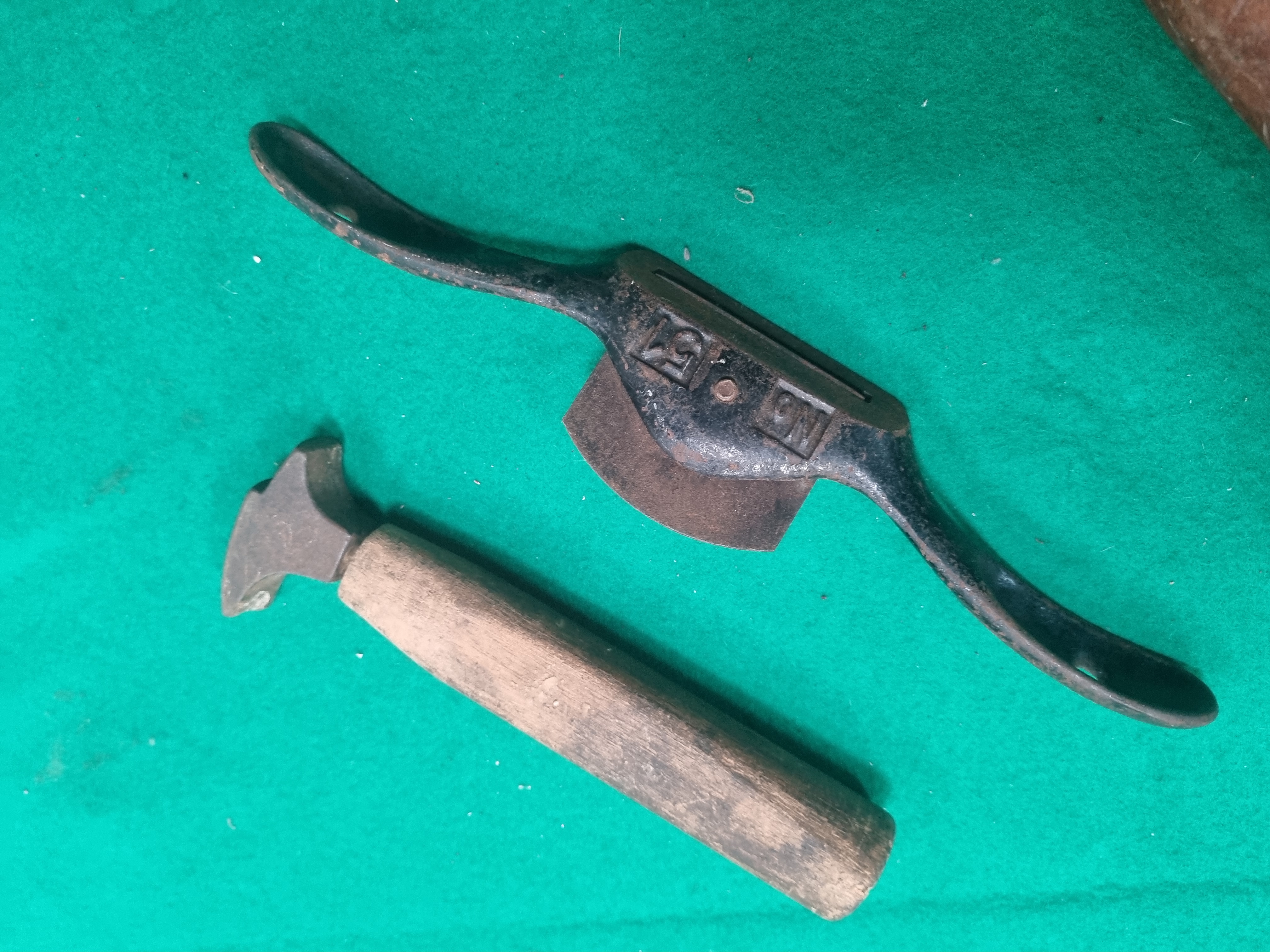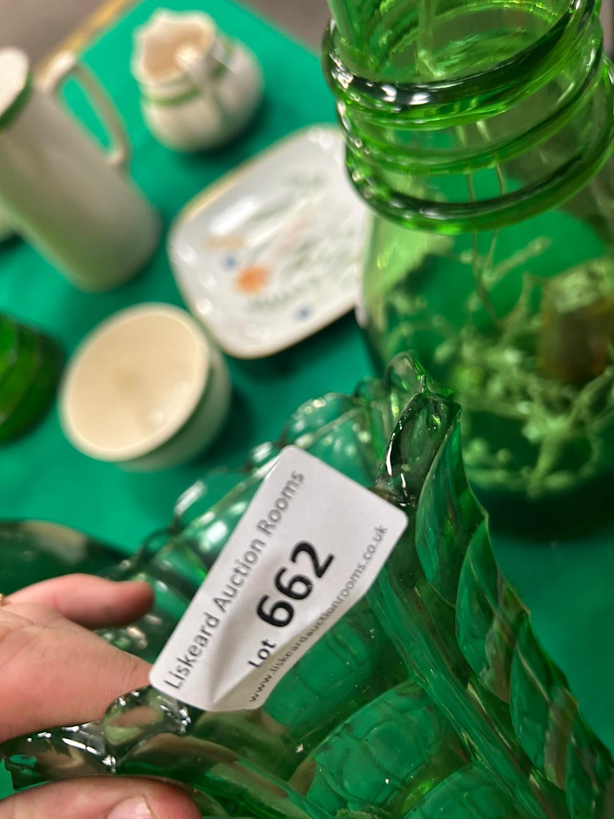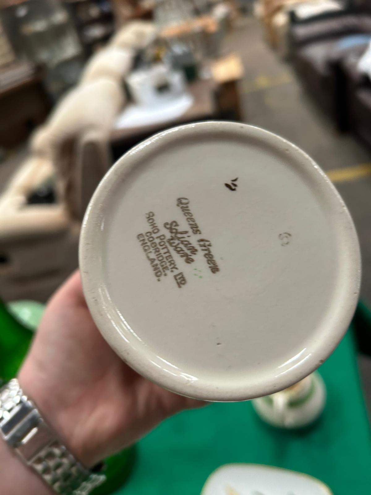 A collection of vintage hand tools and decorative household items. The tool group includes a Stanley No. 51 cast metal spoke shave, a two-part anatomical wooden shoe last with a metal-plated sole, and a specialized cobbler’s hammer or burnishing tool with a turned wooden handle. The shoe last bears various stamped and incised marks including IPP, 9/6, and 4102. The ceramic items include a group of Soho Pottery Ltd Solian Ware in the Queens Green pattern, comprising a teapot, milk jug, and creamer with green banded decoration and gilt accents. Also included is a square porcelain plate by Schönwald, Germany, featuring a hand-painted floral and grass motif, marked with a crown and tree logo, the number 192, and handwritten notations dated 1960. The glassware selection consists of various mid-20th-century green glass pieces, including a tall patterned decanter, two pressed glass vases with ruffled rims, a teal divided serving dish, a light green radial ribbed plate, and an embossed green glass bottle.
