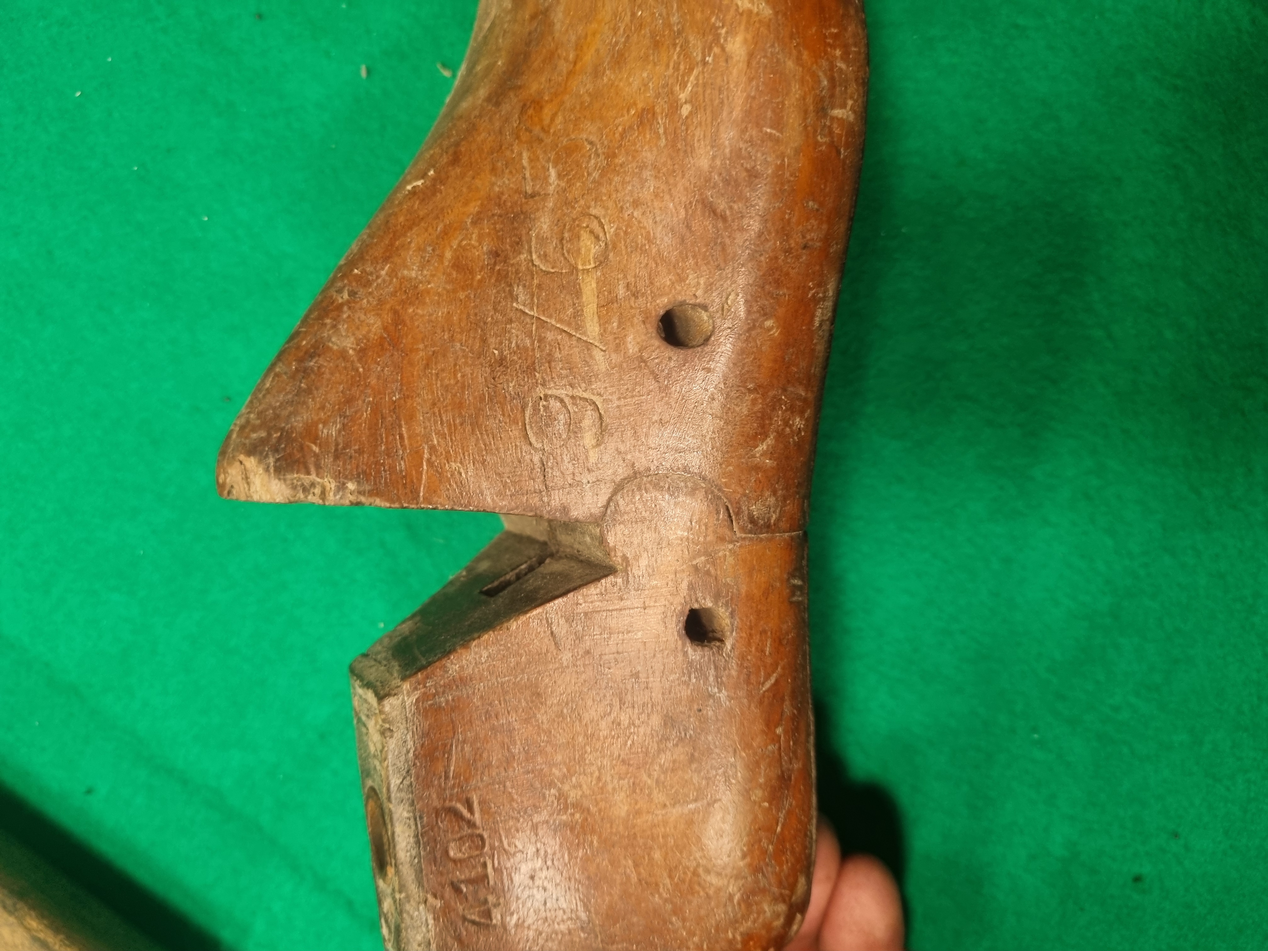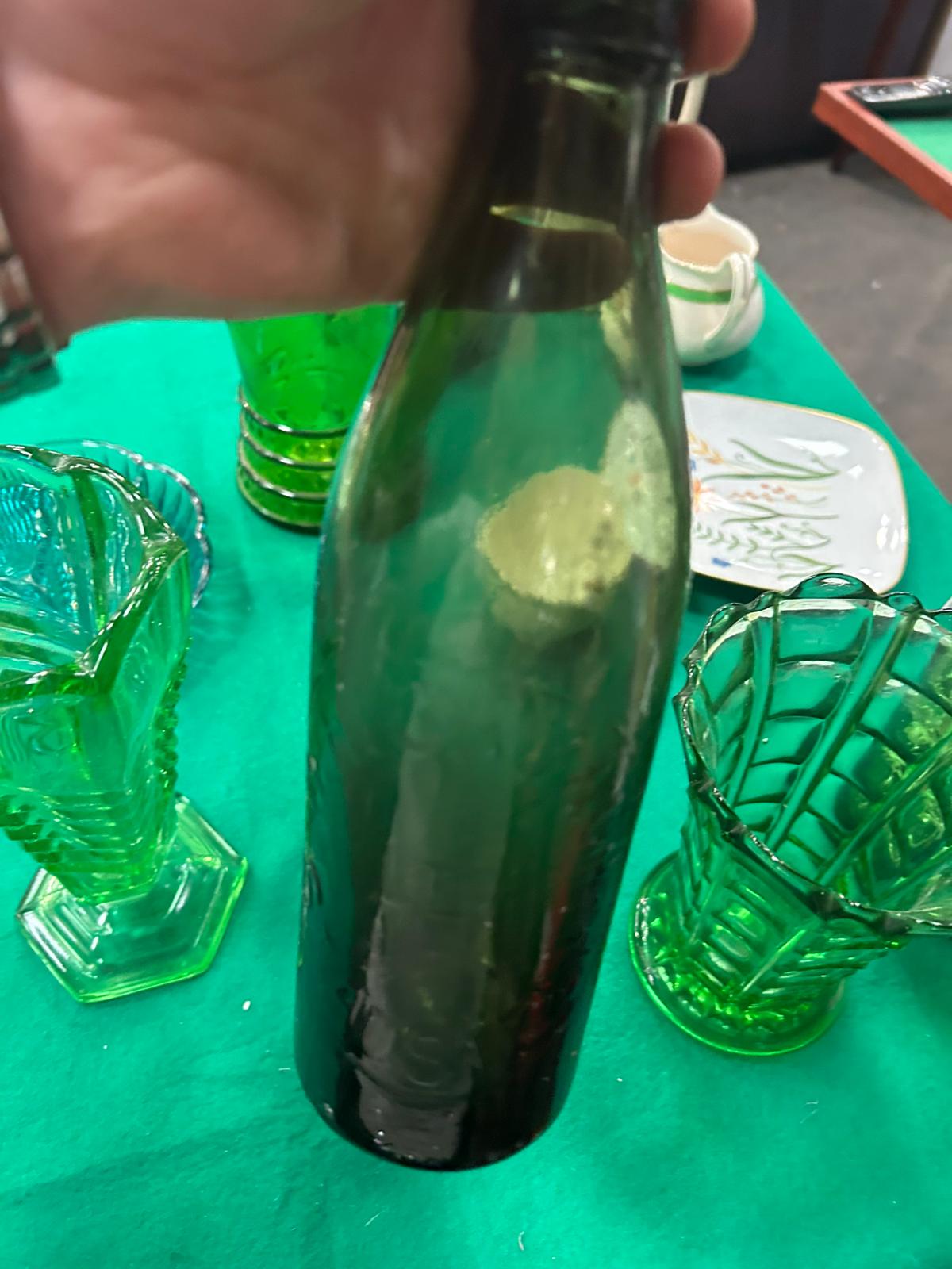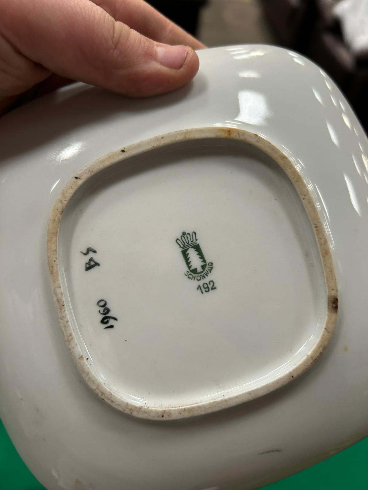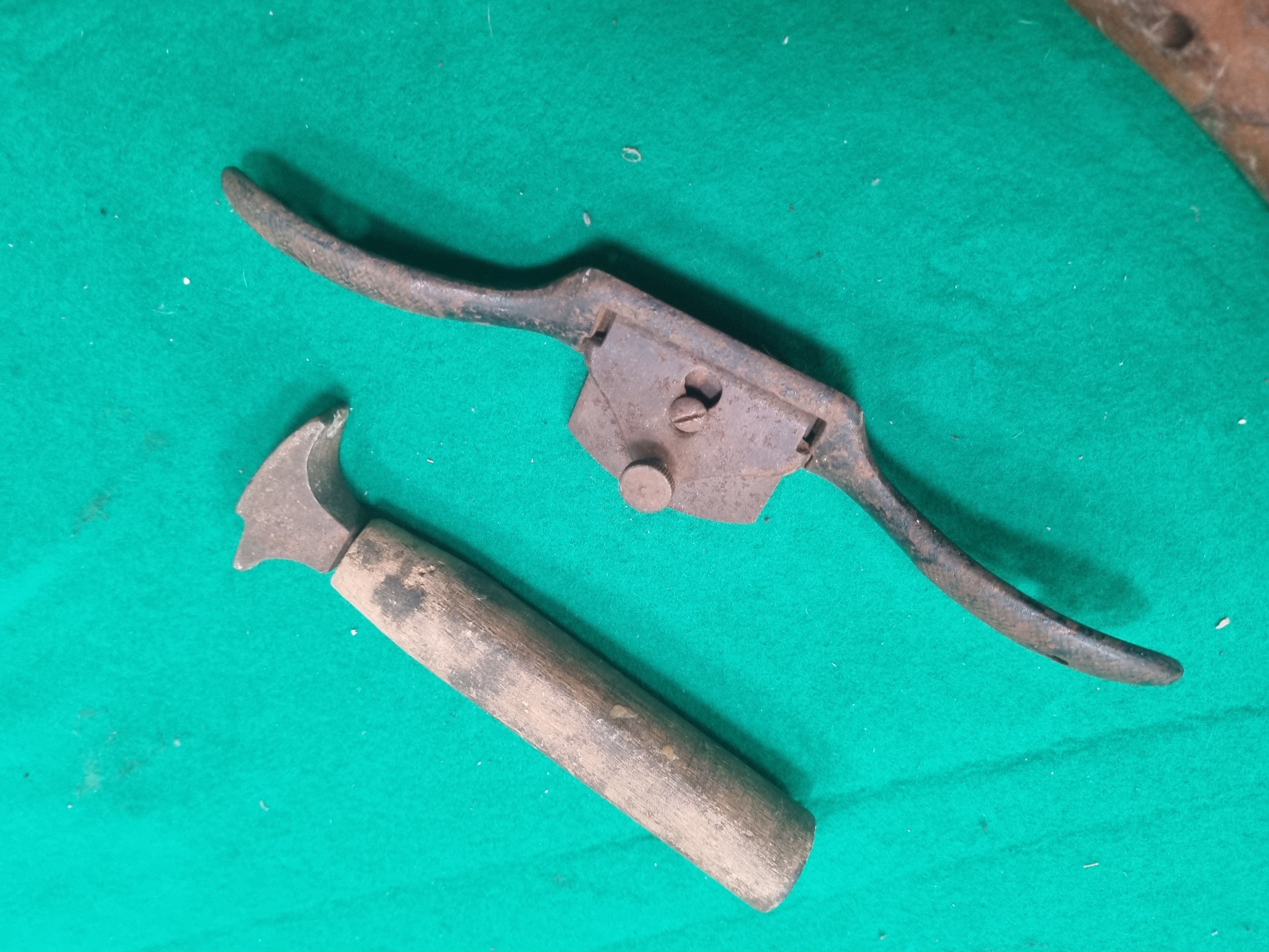 A collection of vintage hand tools and decorative household items. The tool group includes a Stanley No. 51 cast metal spoke shave, a two-part anatomical wooden shoe last with a metal-plated sole, and a specialized cobbler’s hammer or burnishing tool with a turned wooden handle. The shoe last bears various stamped and incised marks including IPP, 9/6, and 4102. The ceramic items include a group of Soho Pottery Ltd Solian Ware in the Queens Green pattern, comprising a teapot, milk jug, and creamer with green banded decoration and gilt accents. Also included is a square porcelain plate by Schönwald, Germany, featuring a hand-painted floral and grass motif, marked with a crown and tree logo, the number 192, and handwritten notations dated 1960. The glassware selection consists of various mid-20th-century green glass pieces, including a tall patterned decanter, two pressed glass vases with ruffled rims, a teal divided serving dish, a light green radial ribbed plate, and an embossed green glass bottle.