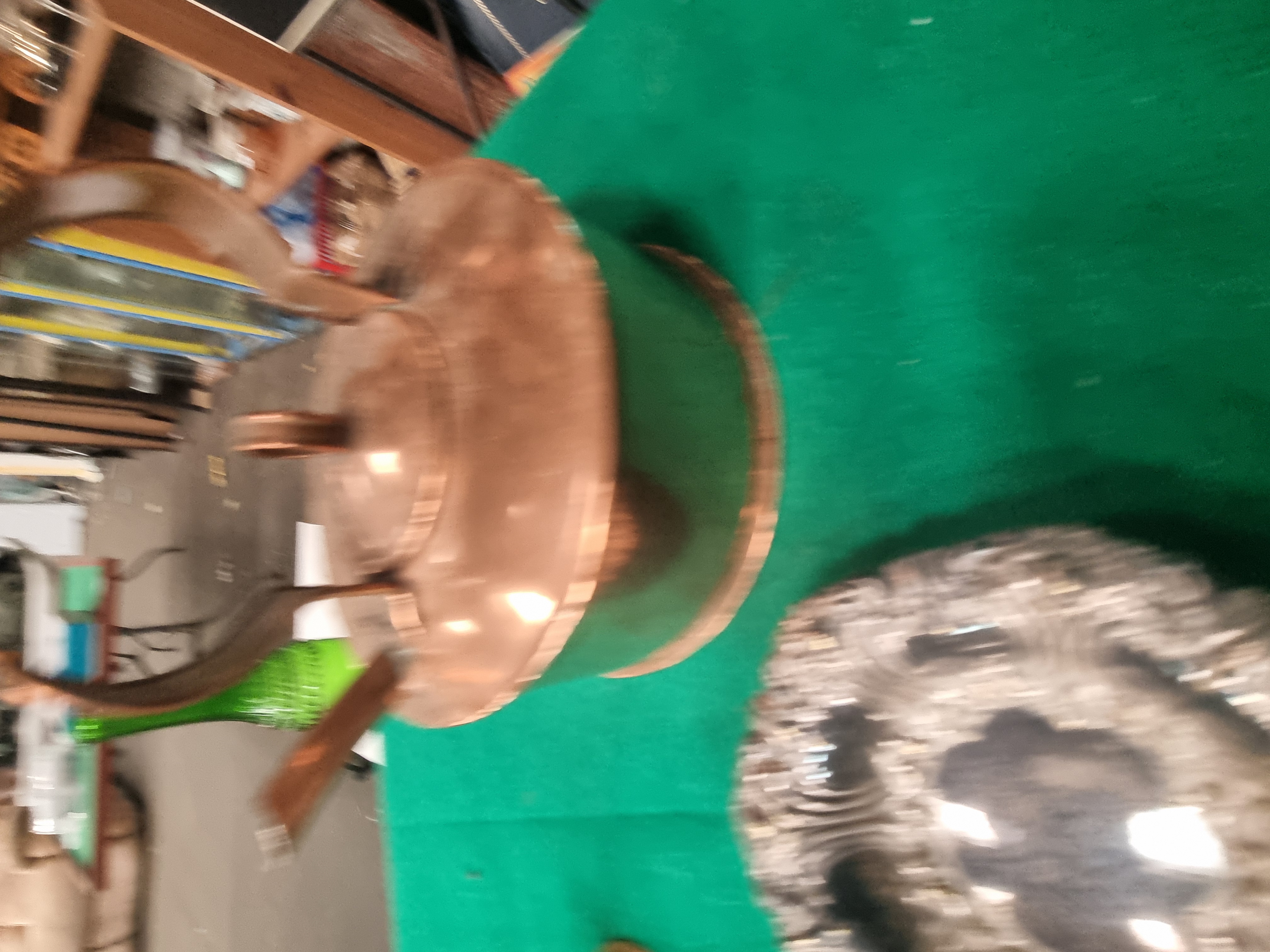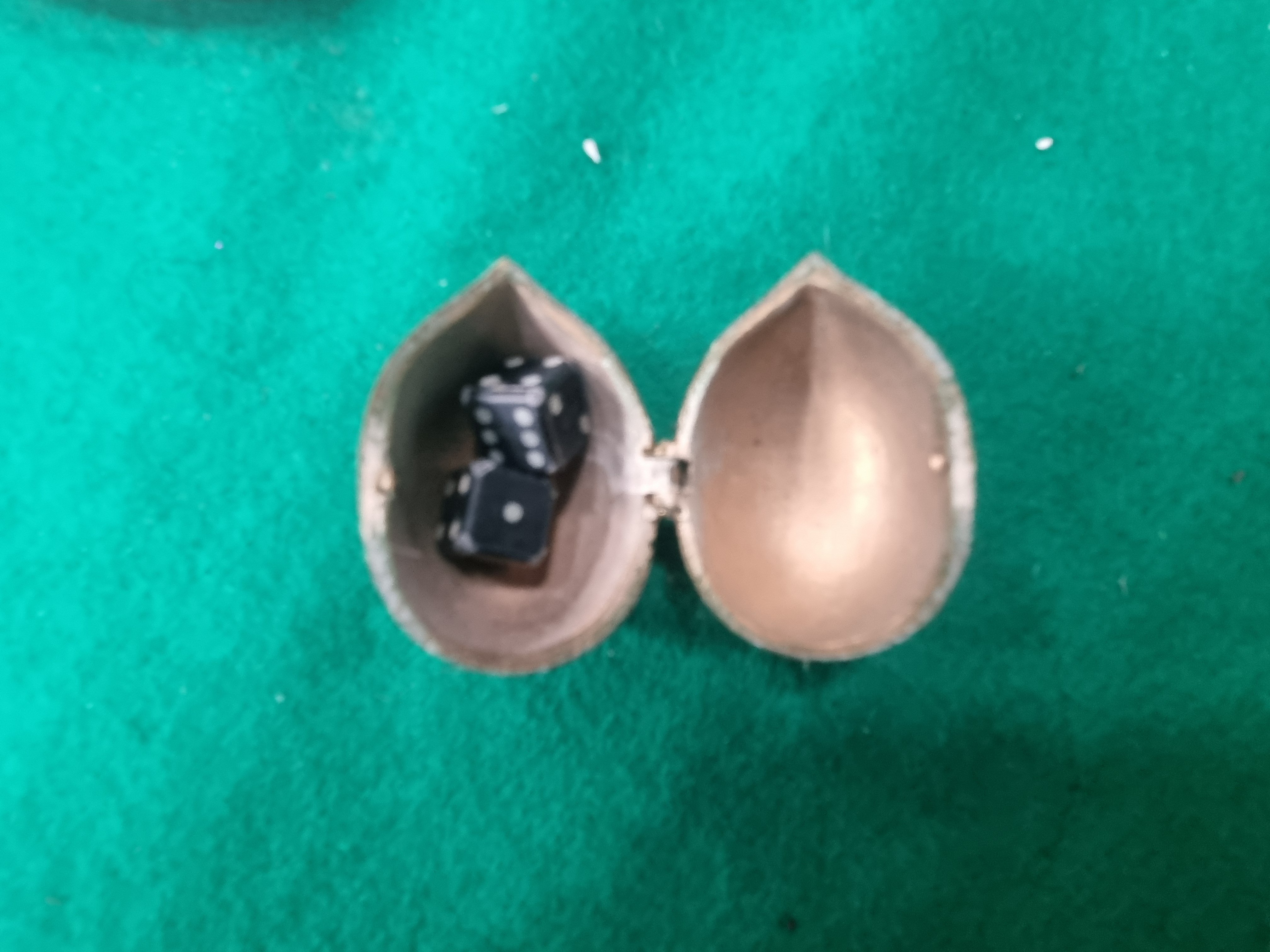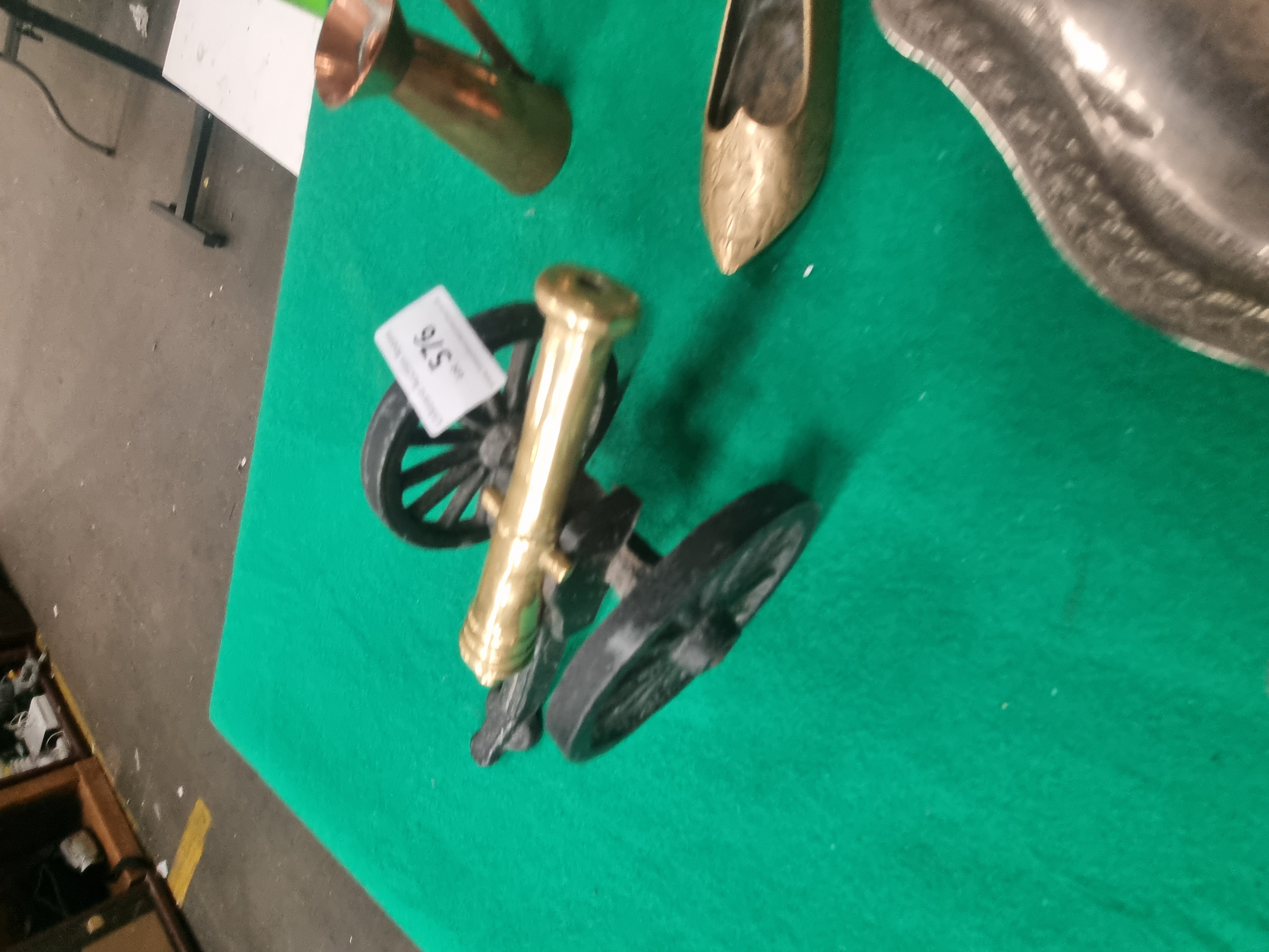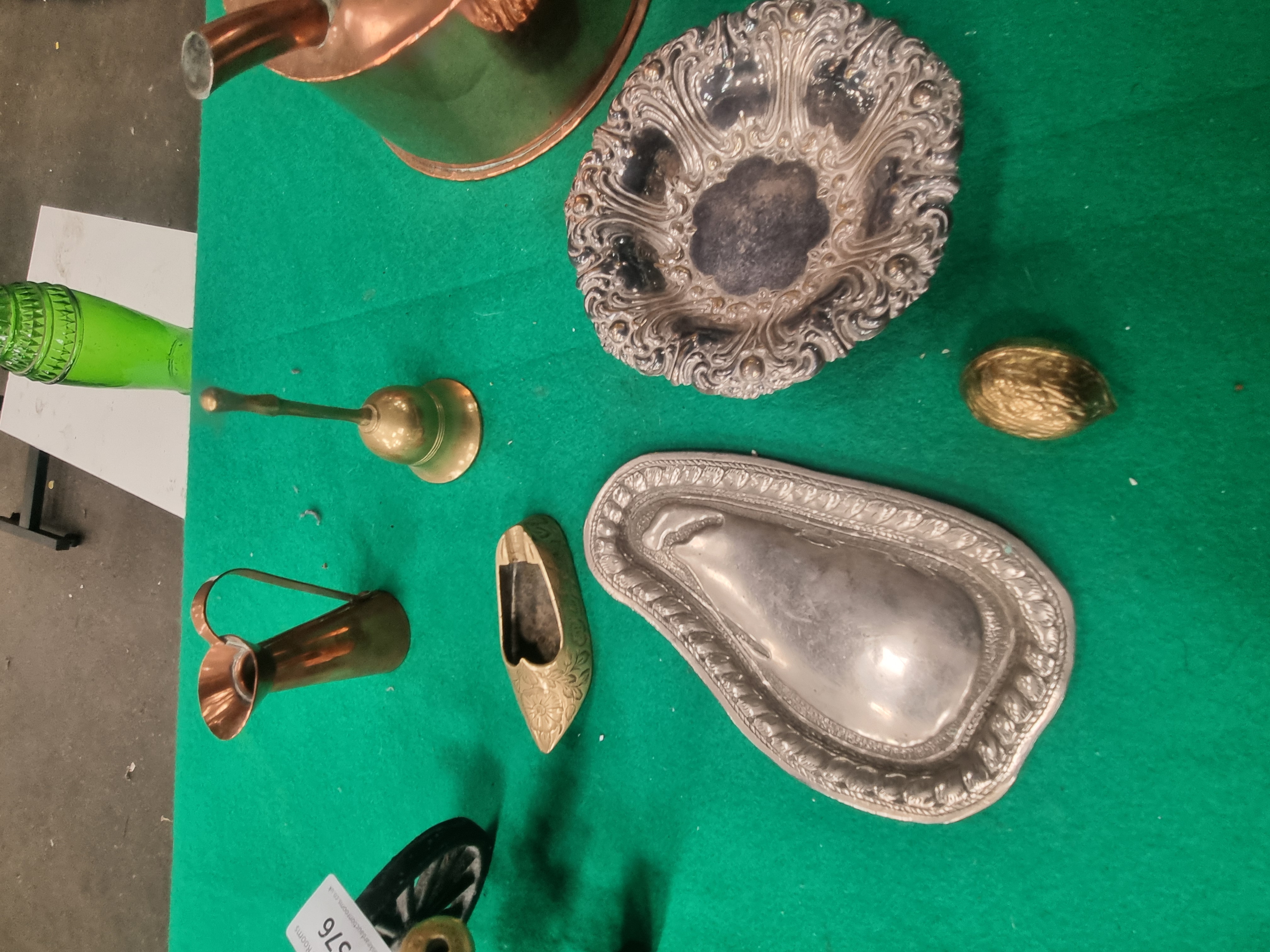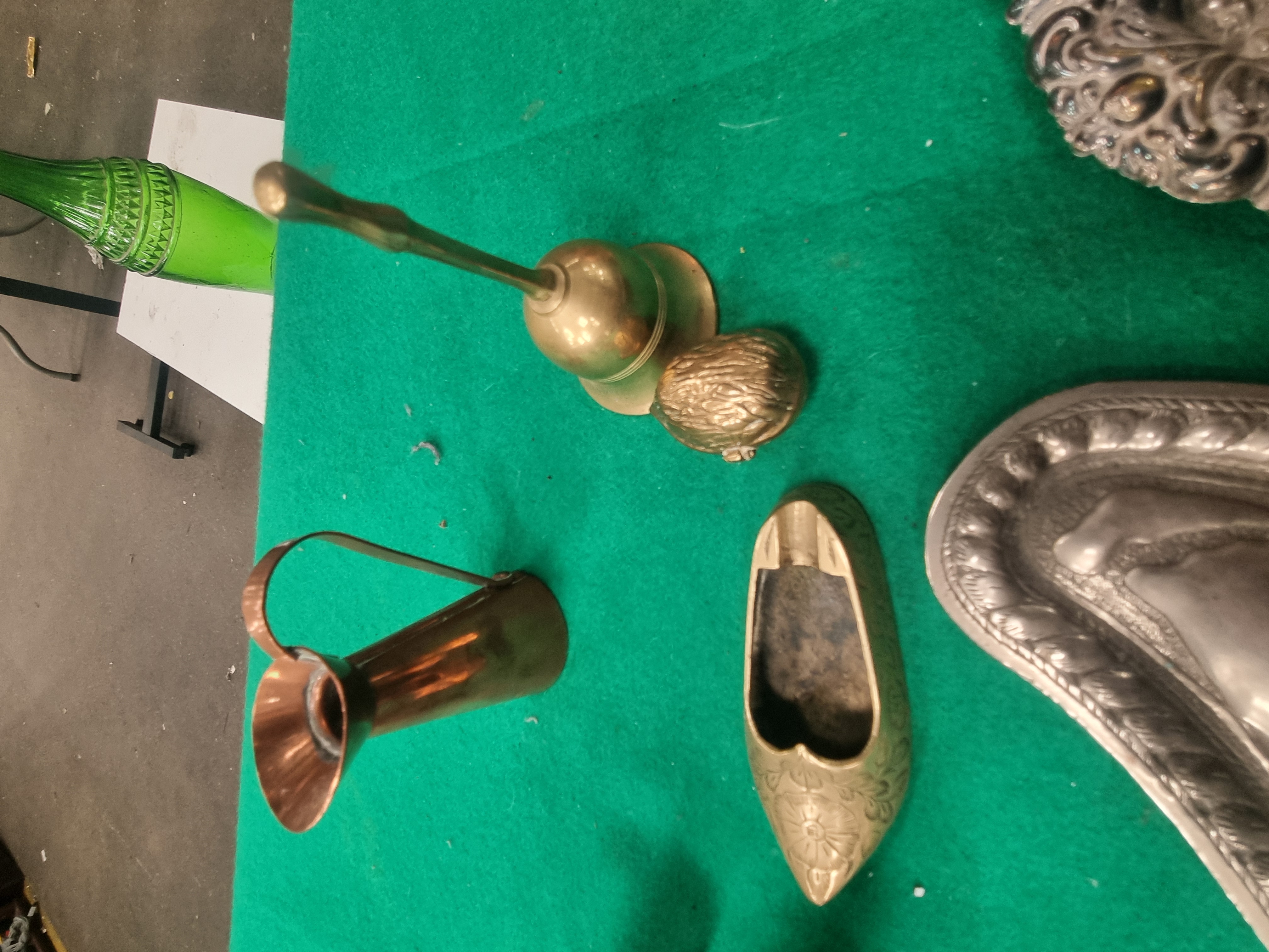 This lot consists of an assortment of decorative items and metalware. Featured items include a miniature model cannon with a cast brass barrel and a black-painted cast iron carriage. A large copper tea kettle is included, showing a traditional Victorian-style construction with visible seams, a fixed overhead handle, and a lid with an acorn finial. The collection also contains a cast brass hand bell with a turned handle, a small tapered copper pitcher with a loop handle, and a miniature cast brass Dutch-style clog with chased floral decoration. A hinged brass box modelled as a walnut contains two small black dice with white pips. Silver-tone metalware includes a small circular dish with scrolled repousse borders in the Rococo style and an elongated pear-shaped tray with a gadrooned rim. Also present is a single green moulded glass bottle with a ribbed surface. No maker’s marks or hallmarks are clearly visible on the items.