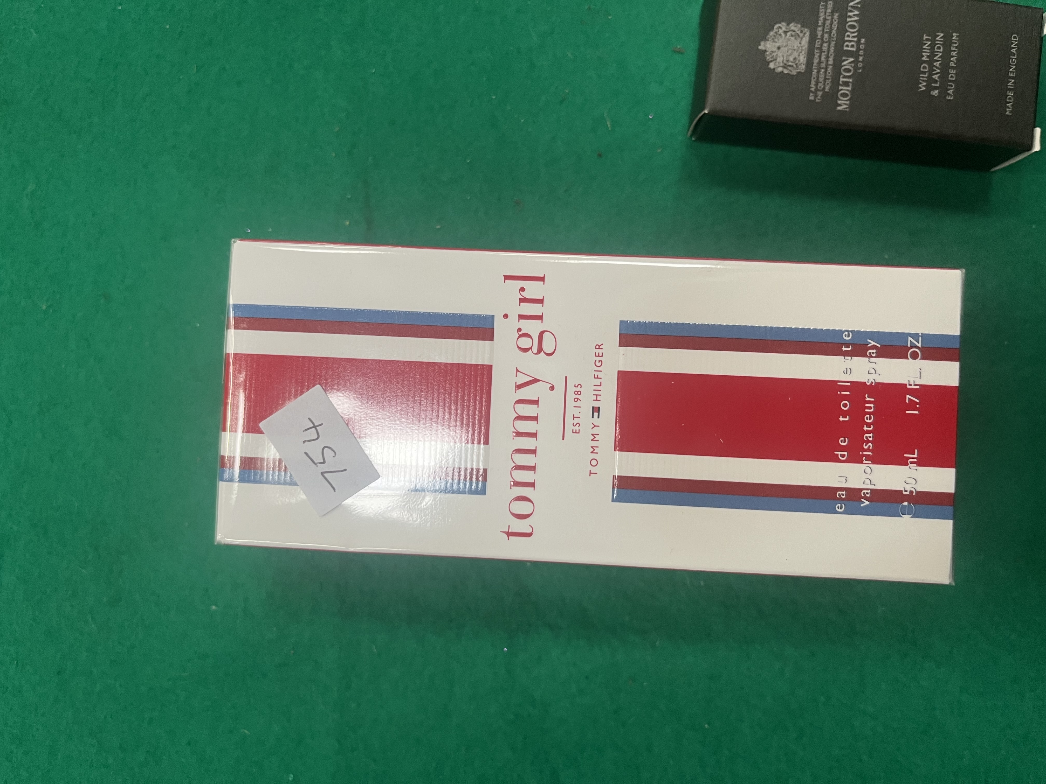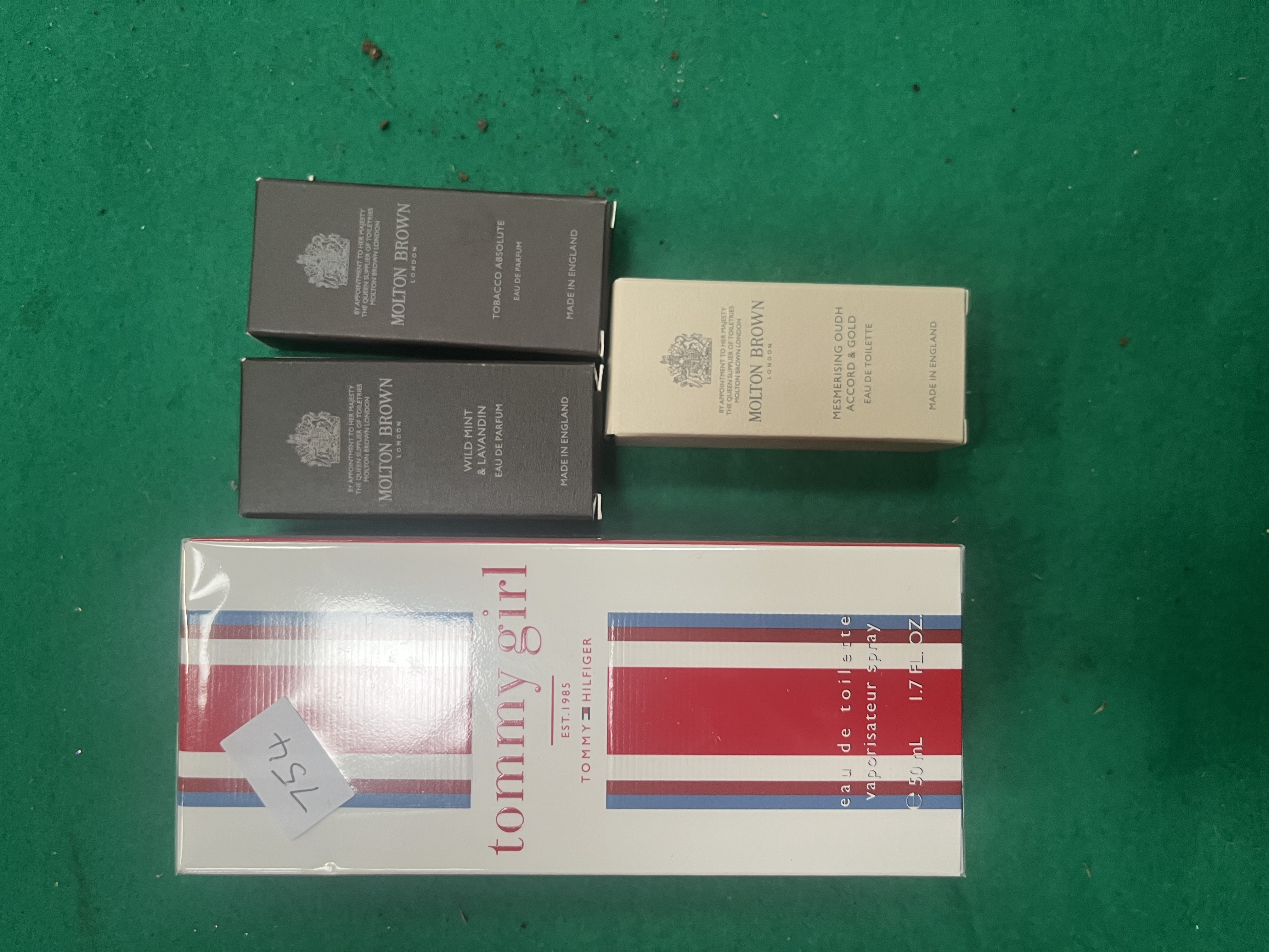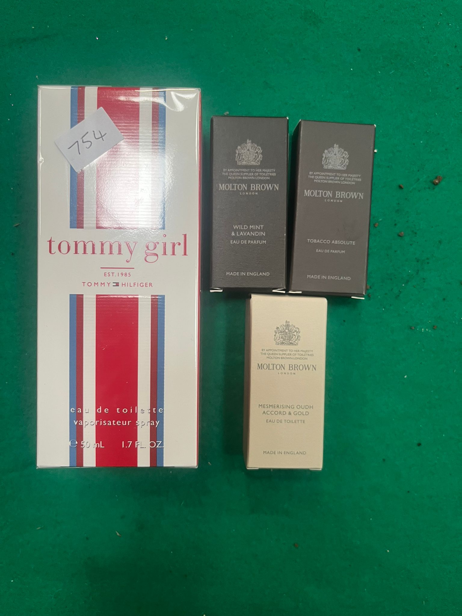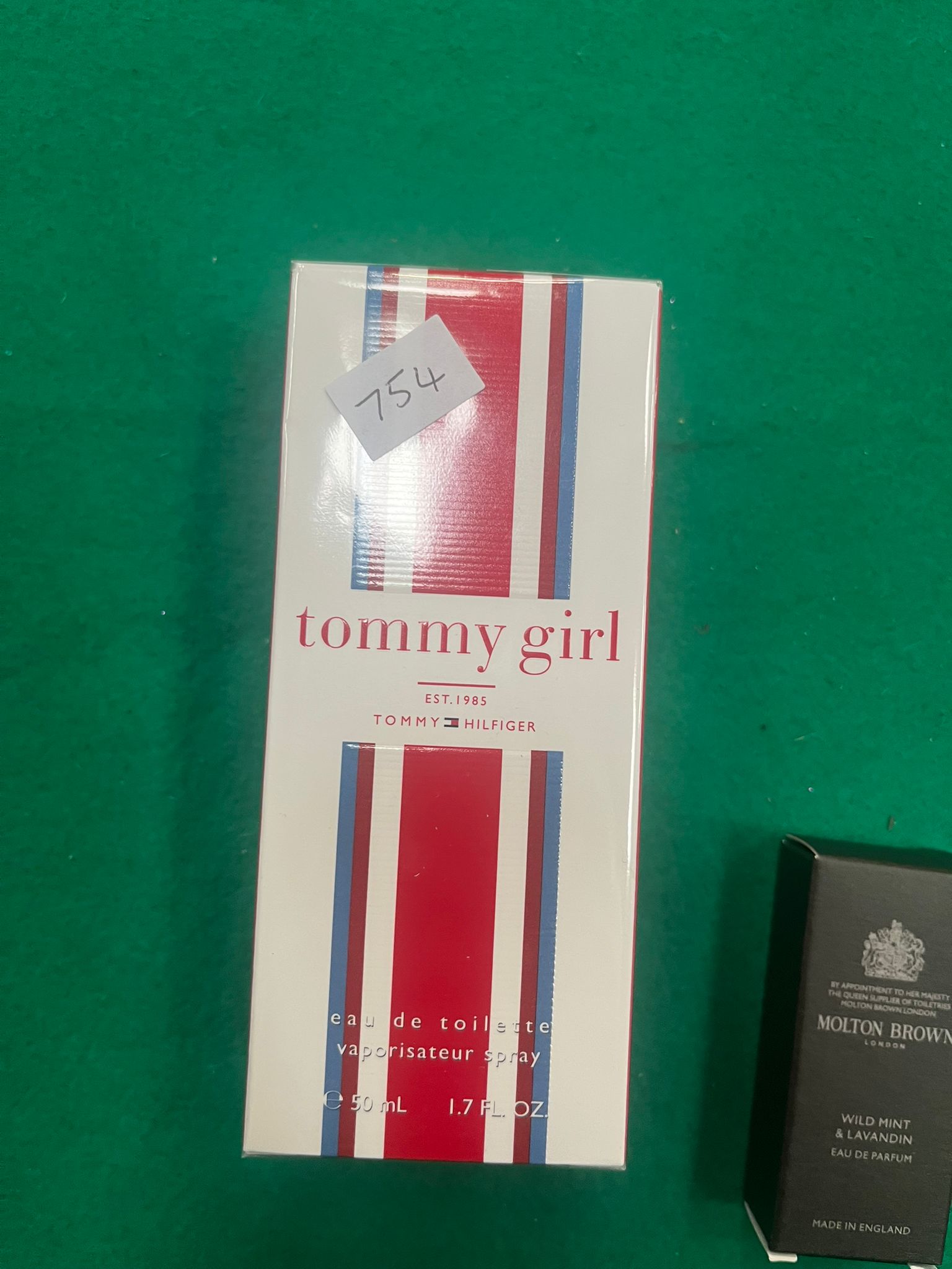 A selection of fragrances featuring a 50 mL (1.7 FL. OZ.) bottle of Tommy Hilfiger Tommy Girl eau de toilette vapouriser spray, presented in its original retail box and sealed in factory plastic. The collection also includes Molton Brown London fragrances in original boxes, featuring scents such as Wild Mint and Lavandin eau de parfum, Tobacco Absolute eau de parfum, and Mesmerising Oudh Accord and Gold eau de toilette. Each Molton Brown box is inscribed with the Royal Warrant text stating By Appointment to Her Majesty the Queen Supplier of Toiletries Molton Brown London and is marked as being made in England. The Tommy Hilfiger box bears a white sticker with the number 754.