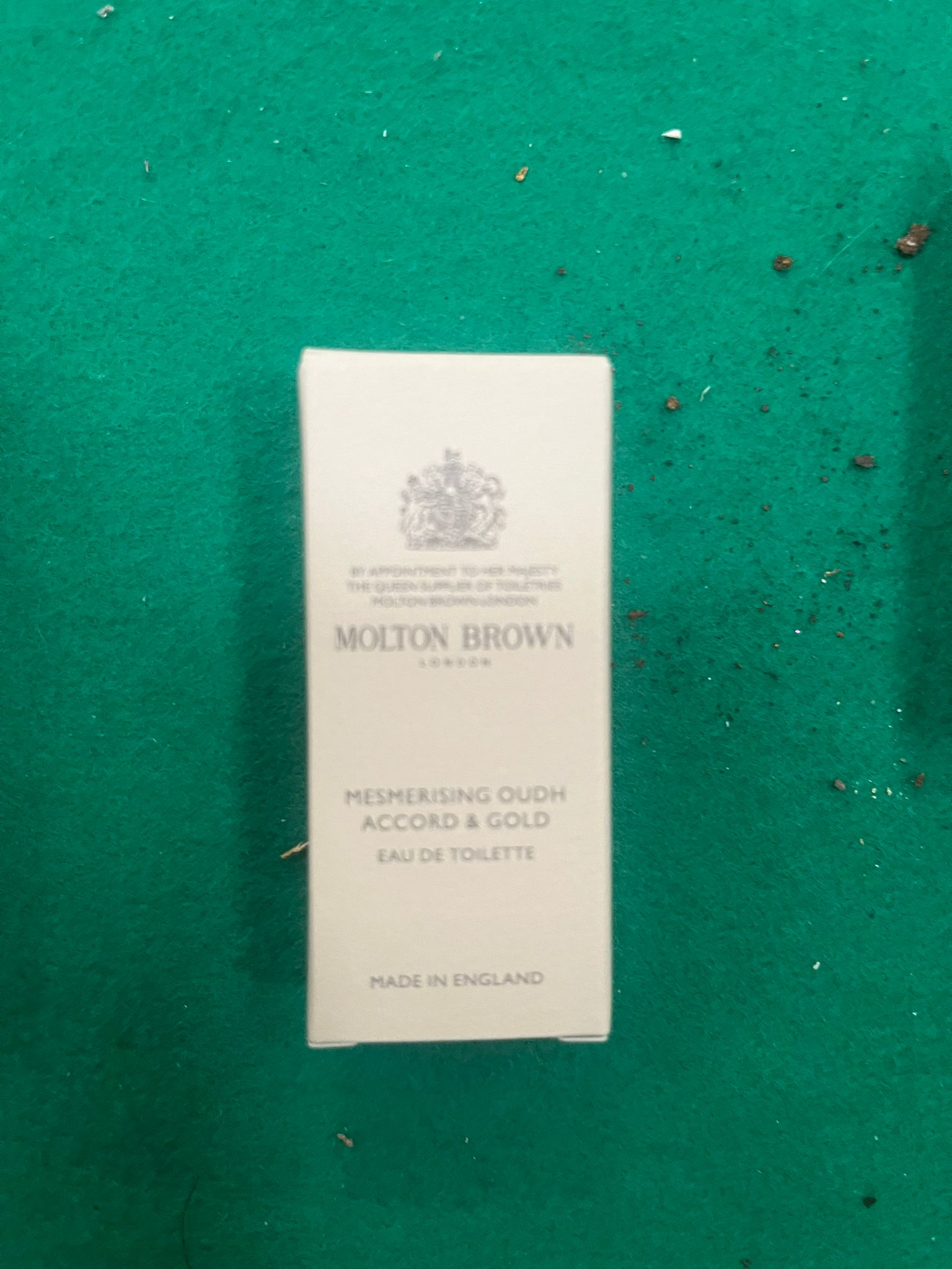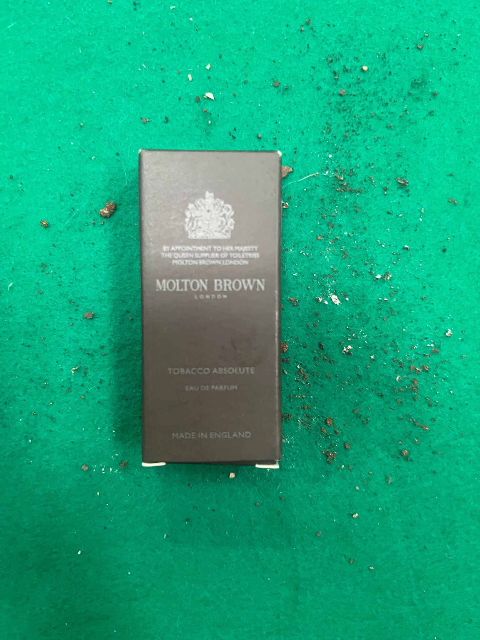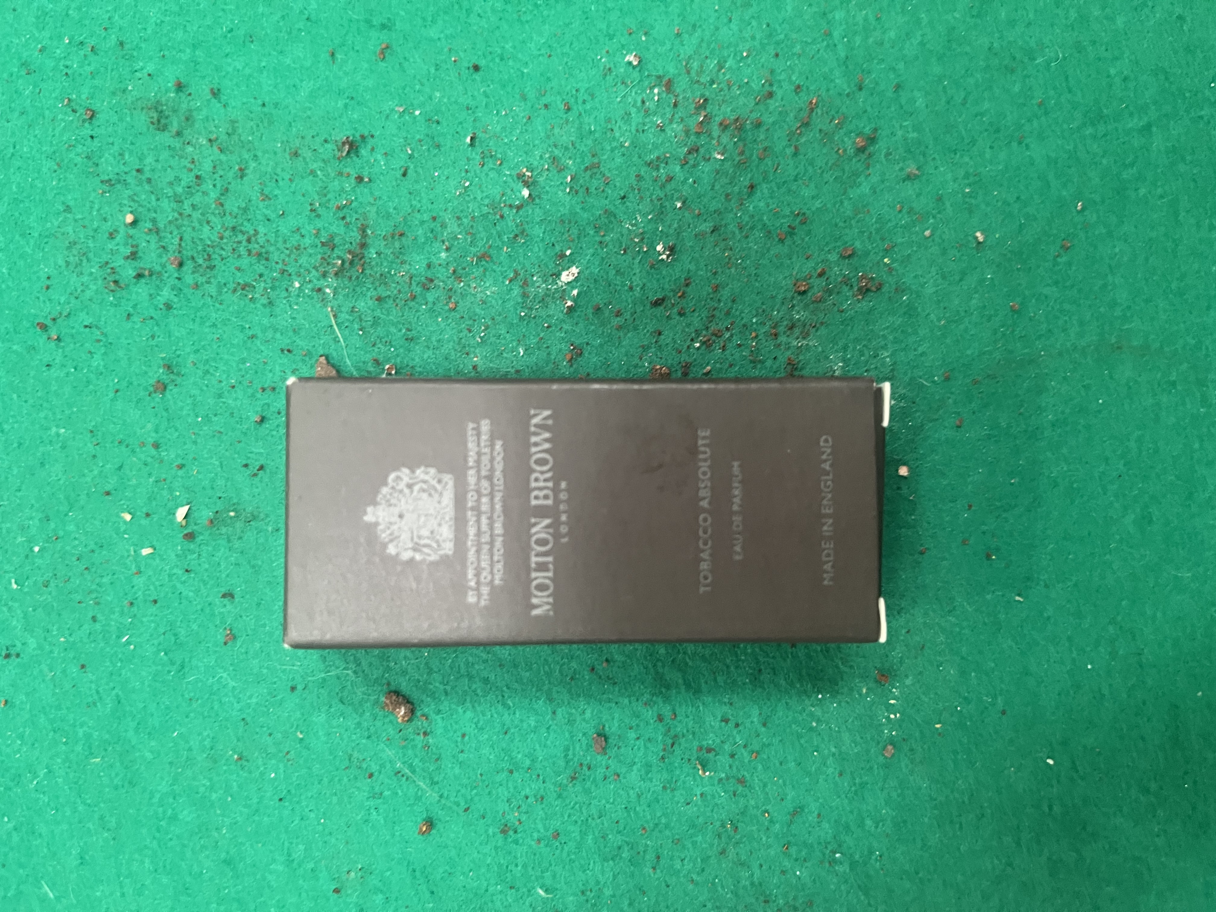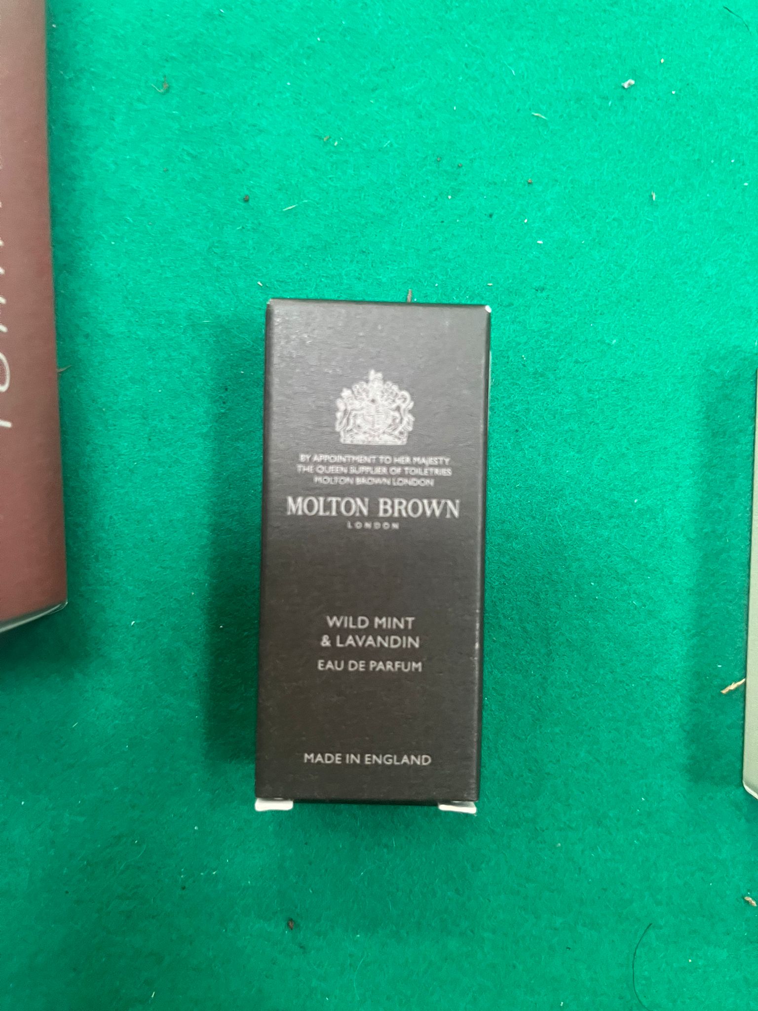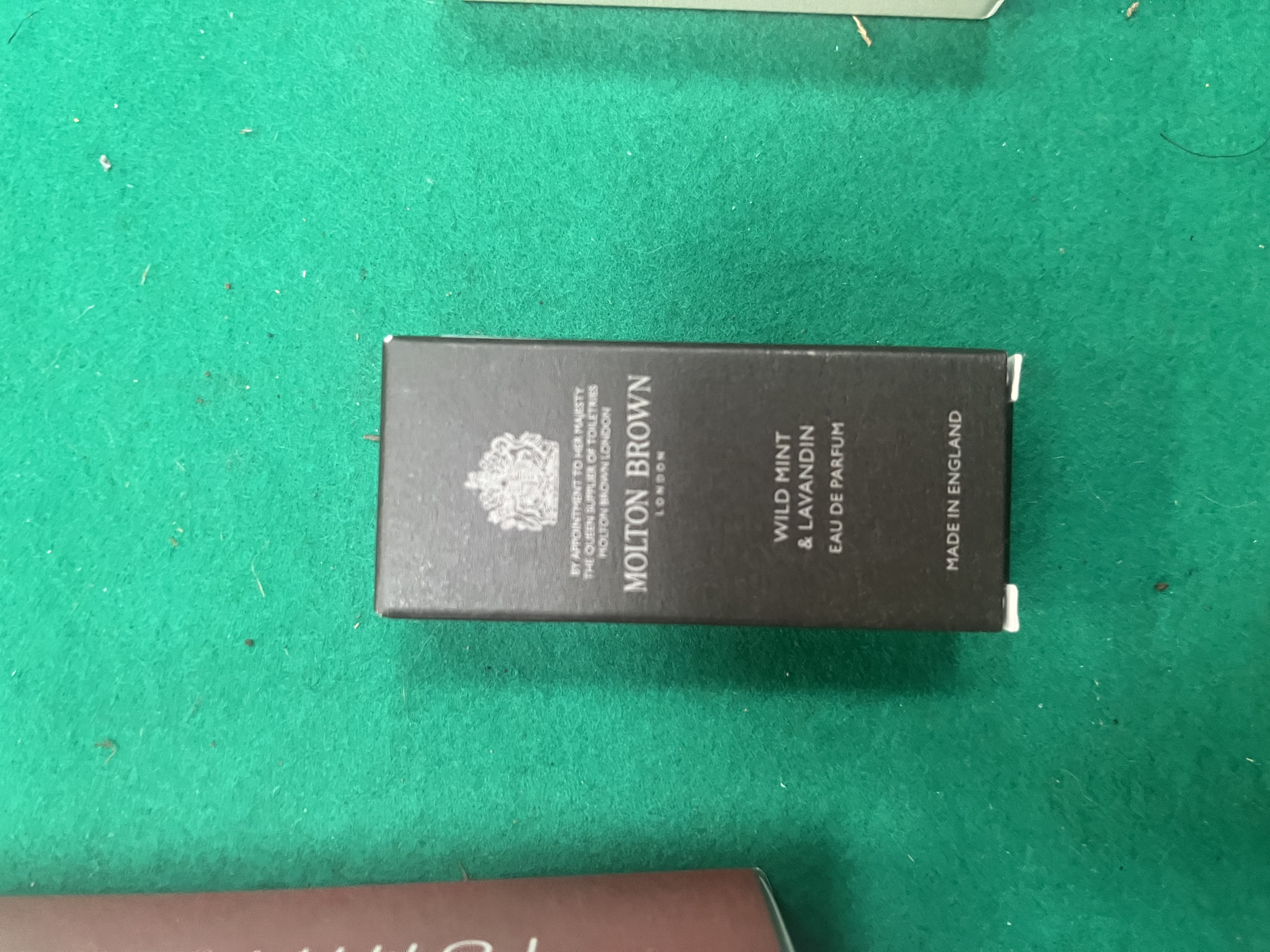 A selection of fragrances featuring a 50 mL (1.7 FL. OZ.) bottle of Tommy Hilfiger Tommy Girl eau de toilette vapouriser spray, presented in its original retail box and sealed in factory plastic. The collection also includes Molton Brown London fragrances in original boxes, featuring scents such as Wild Mint and Lavandin eau de parfum, Tobacco Absolute eau de parfum, and Mesmerising Oudh Accord and Gold eau de toilette. Each Molton Brown box is inscribed with the Royal Warrant text stating By Appointment to Her Majesty the Queen Supplier of Toiletries Molton Brown London and is marked as being made in England. The Tommy Hilfiger box bears a white sticker with the number 754.