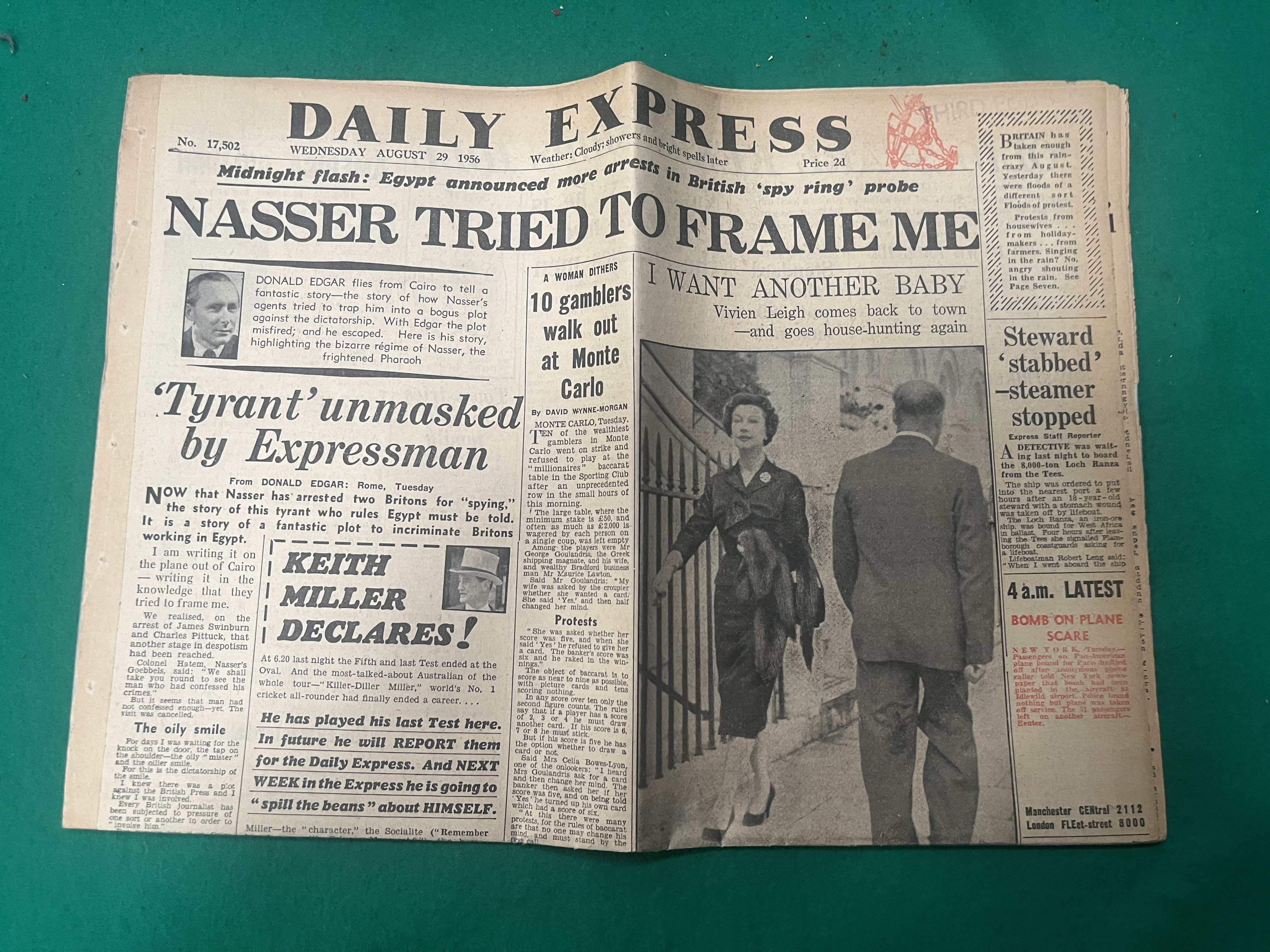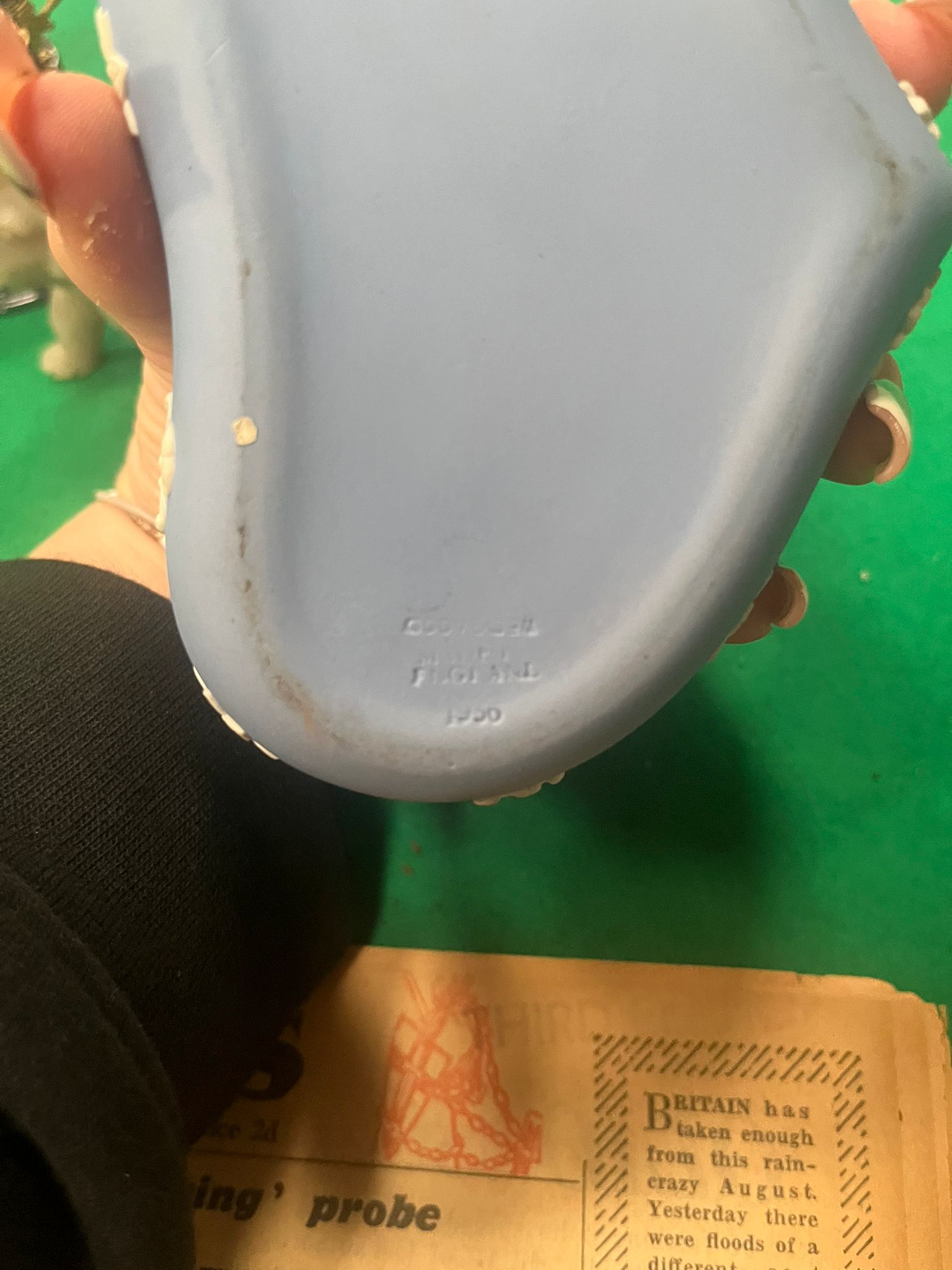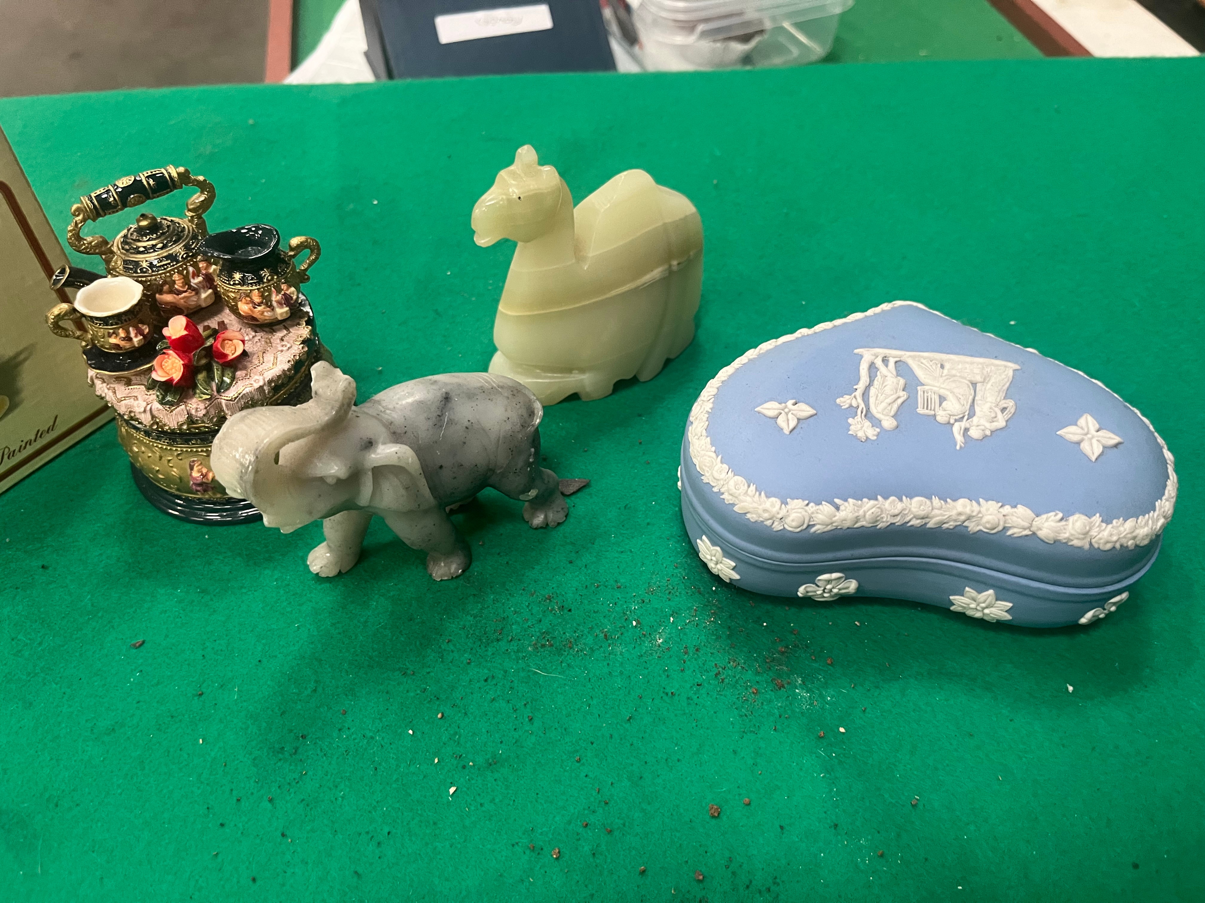 An assortment of decorative items including a heart-shaped Wedgwood Jasperware lidded trinket box. The box is finished in a pale blue dip with applied white bas-relief neoclassical figures to the lid and floral sprigging to the borders. The base is impressed with the marks WEDGWOOD, MADE IN ENGLAND, and the numeral 1950. The lot also contains a miniature tea service on an ornate circular stand, decorated in black and gold with vignettes of figures and red floral accents. Included are two carved stone figurines: an elephant with a raised trunk in a mottled grey mineral, and a seated camel in a translucent banded stone in shades of cream and pale green. The collection is rounded out by a complete original edition of the Daily Express newspaper dated 29 August 1956, featuring various period headlines.