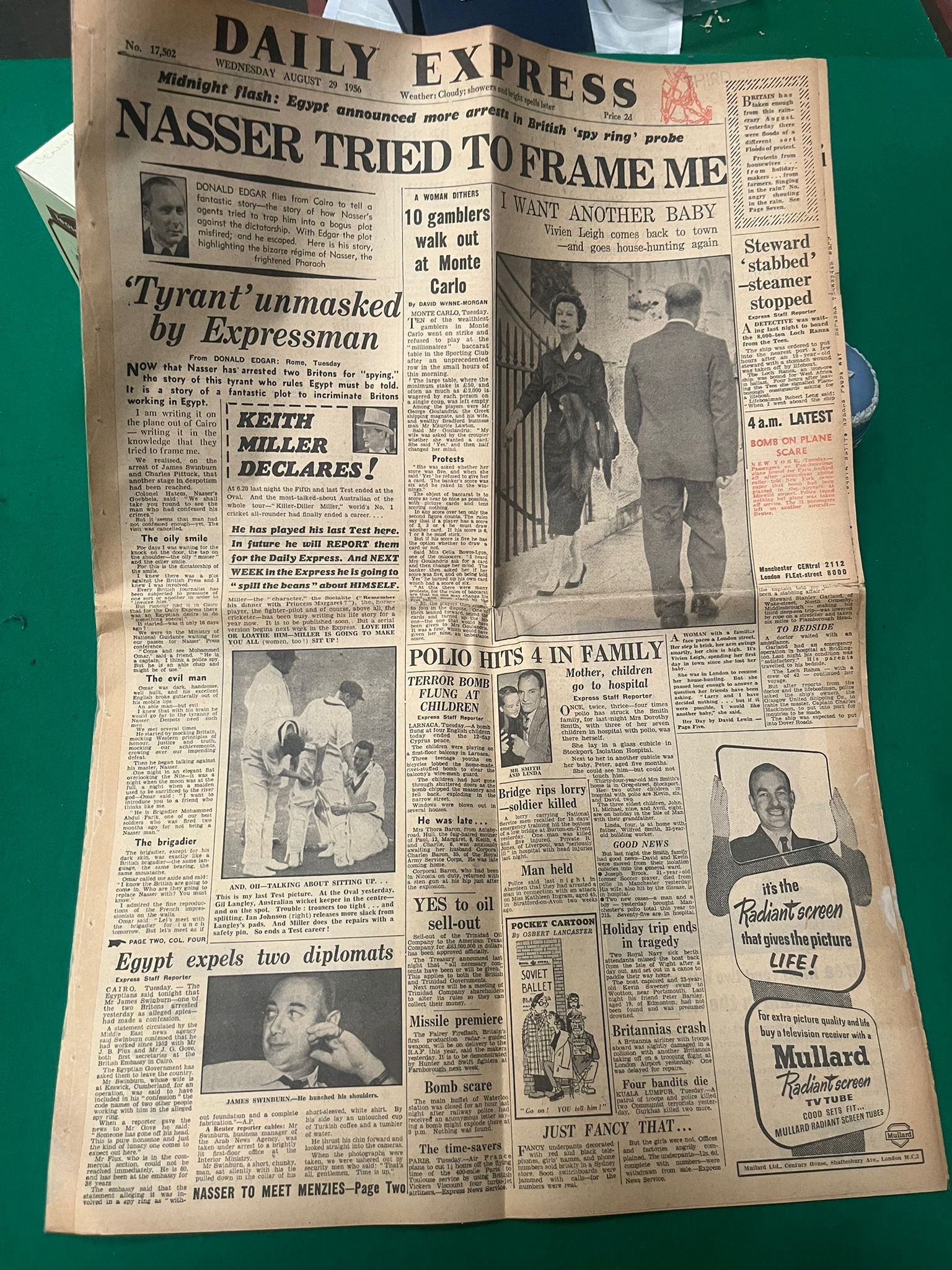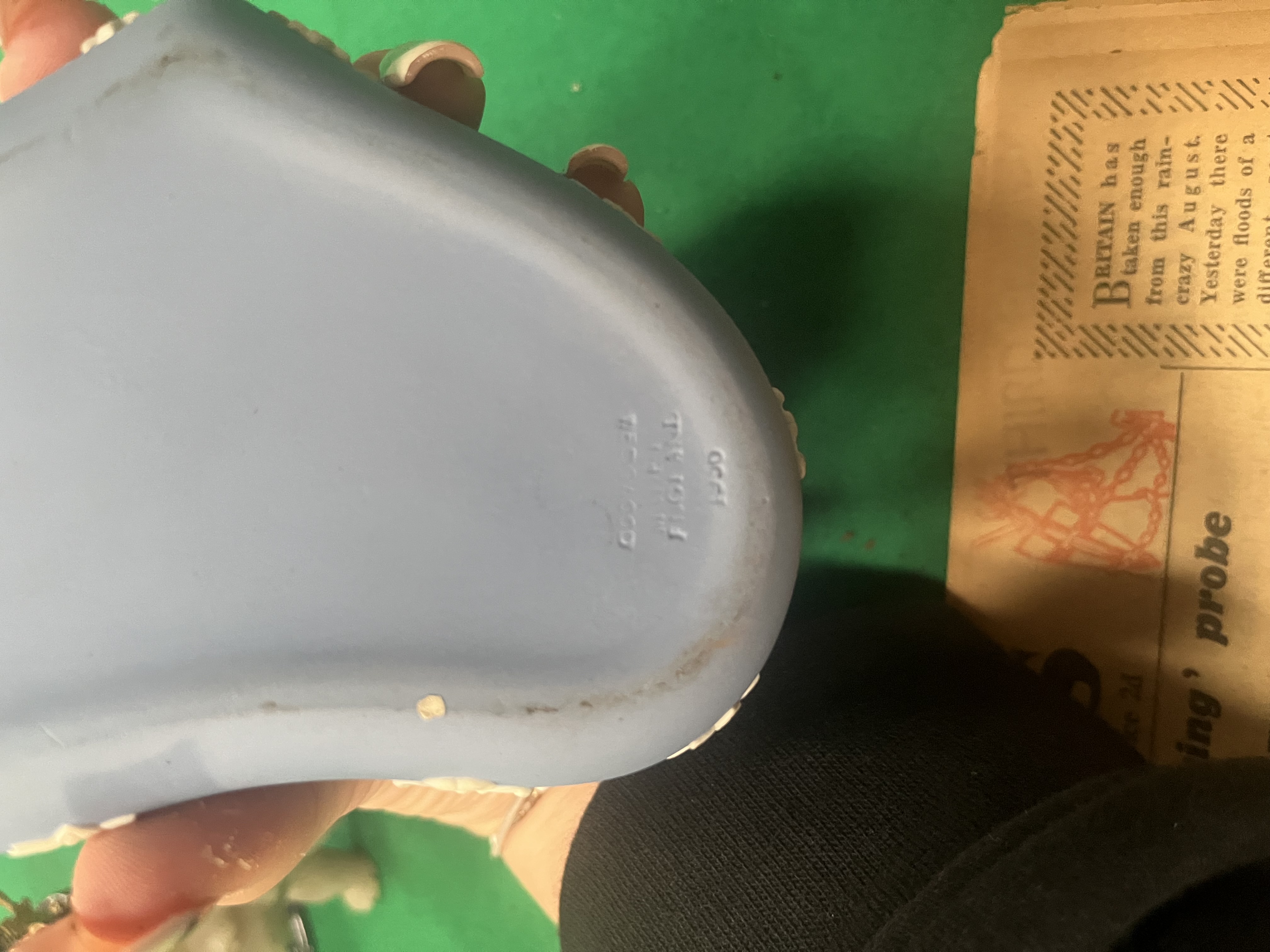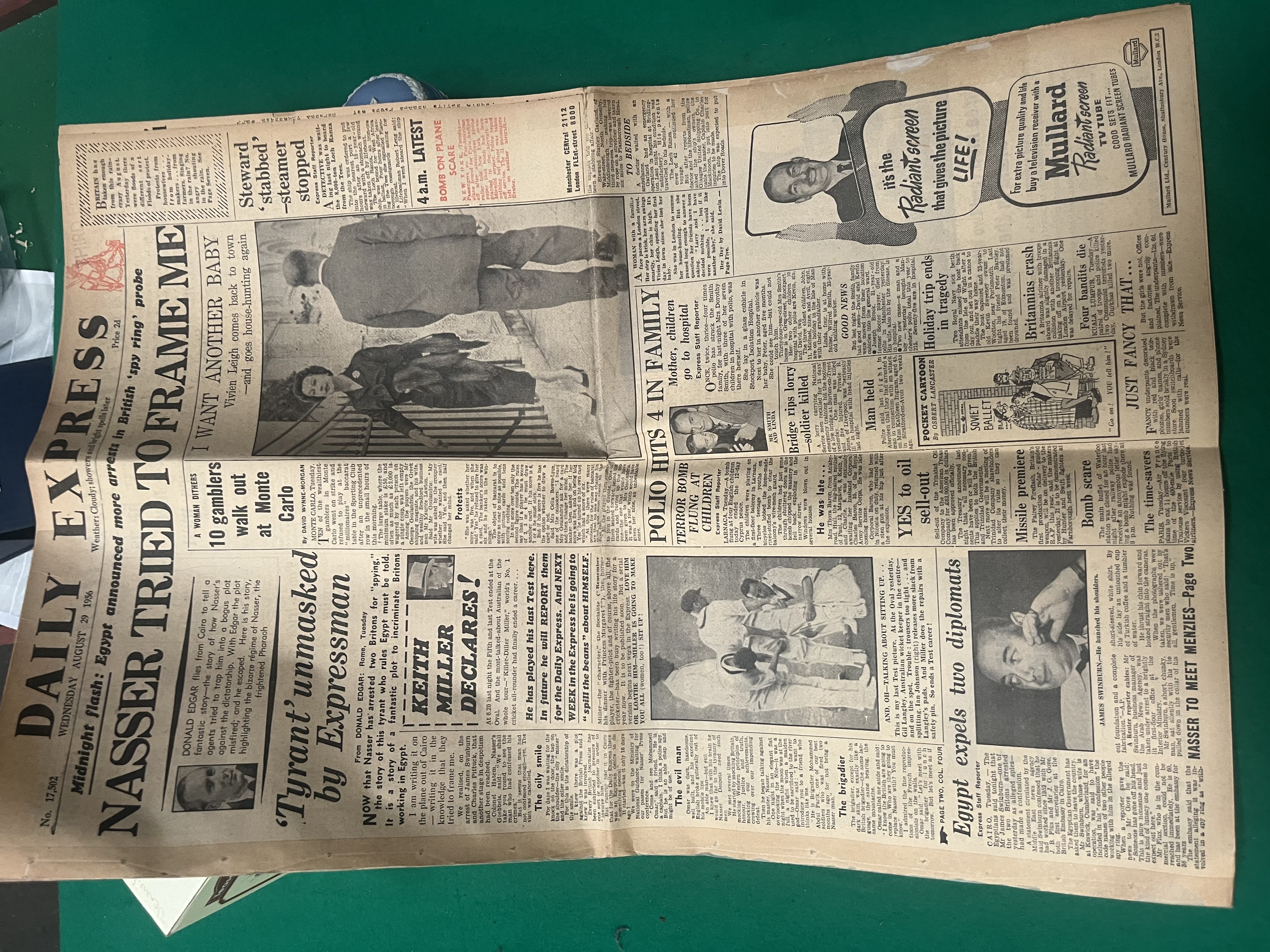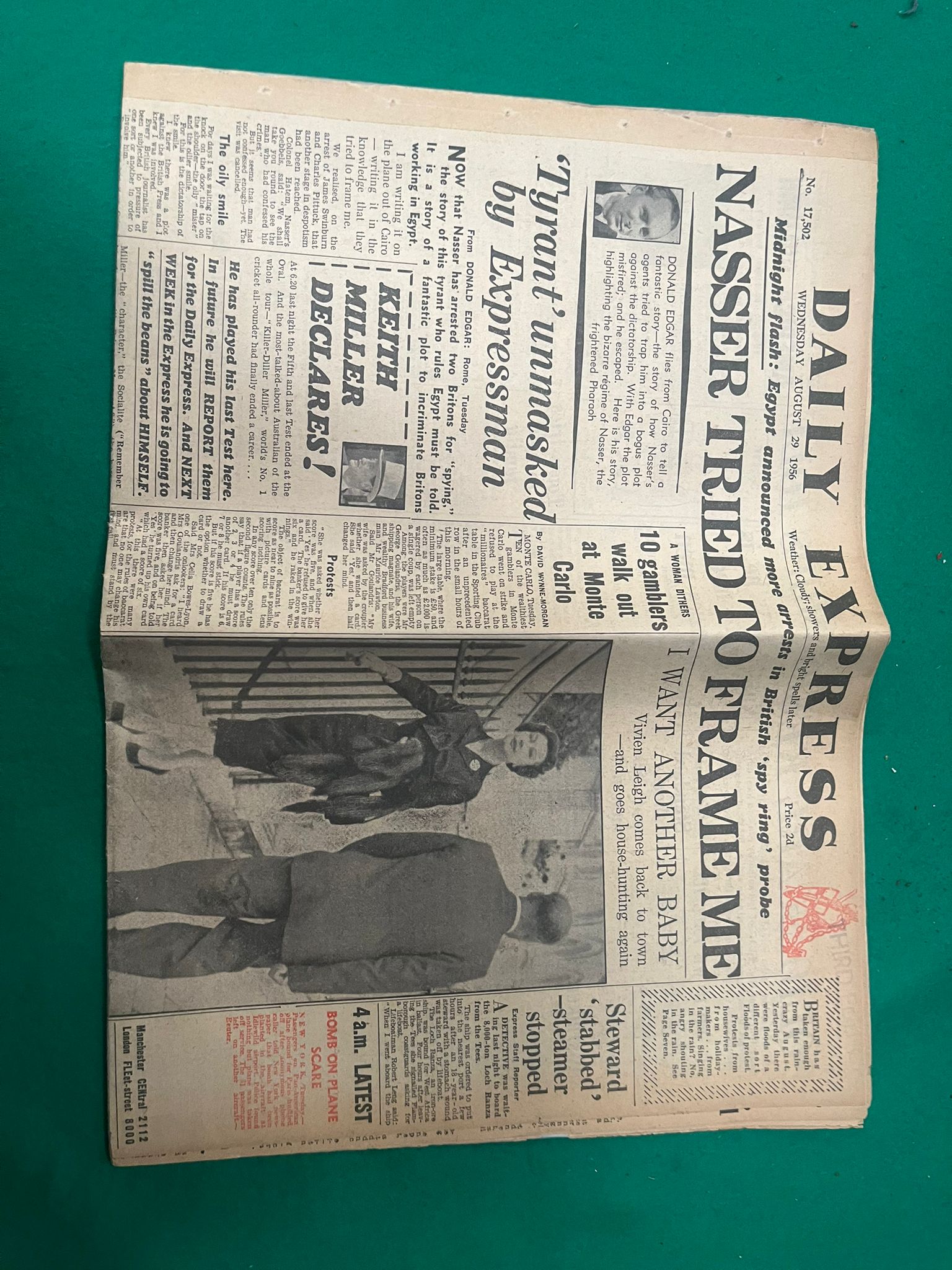 An assortment of decorative items including a heart-shaped Wedgwood Jasperware lidded trinket box. The box is finished in a pale blue dip with applied white bas-relief neoclassical figures to the lid and floral sprigging to the borders. The base is impressed with the marks WEDGWOOD, MADE IN ENGLAND, and the numeral 1950. The lot also contains a miniature tea service on an ornate circular stand, decorated in black and gold with vignettes of figures and red floral accents. Included are two carved stone figurines: an elephant with a raised trunk in a mottled grey mineral, and a seated camel in a translucent banded stone in shades of cream and pale green. The collection is rounded out by a complete original edition of the Daily Express newspaper dated 29 August 1956, featuring various period headlines.