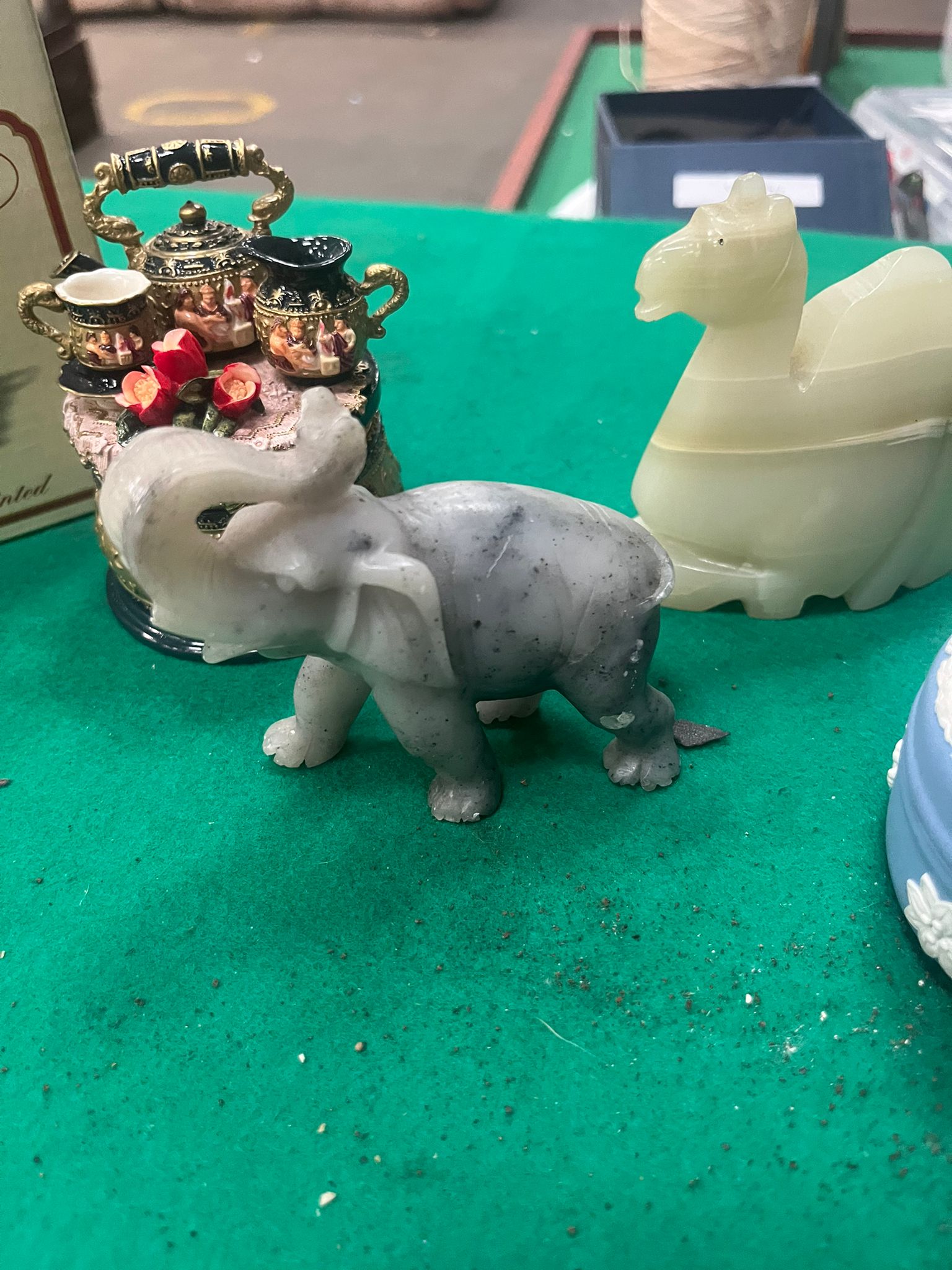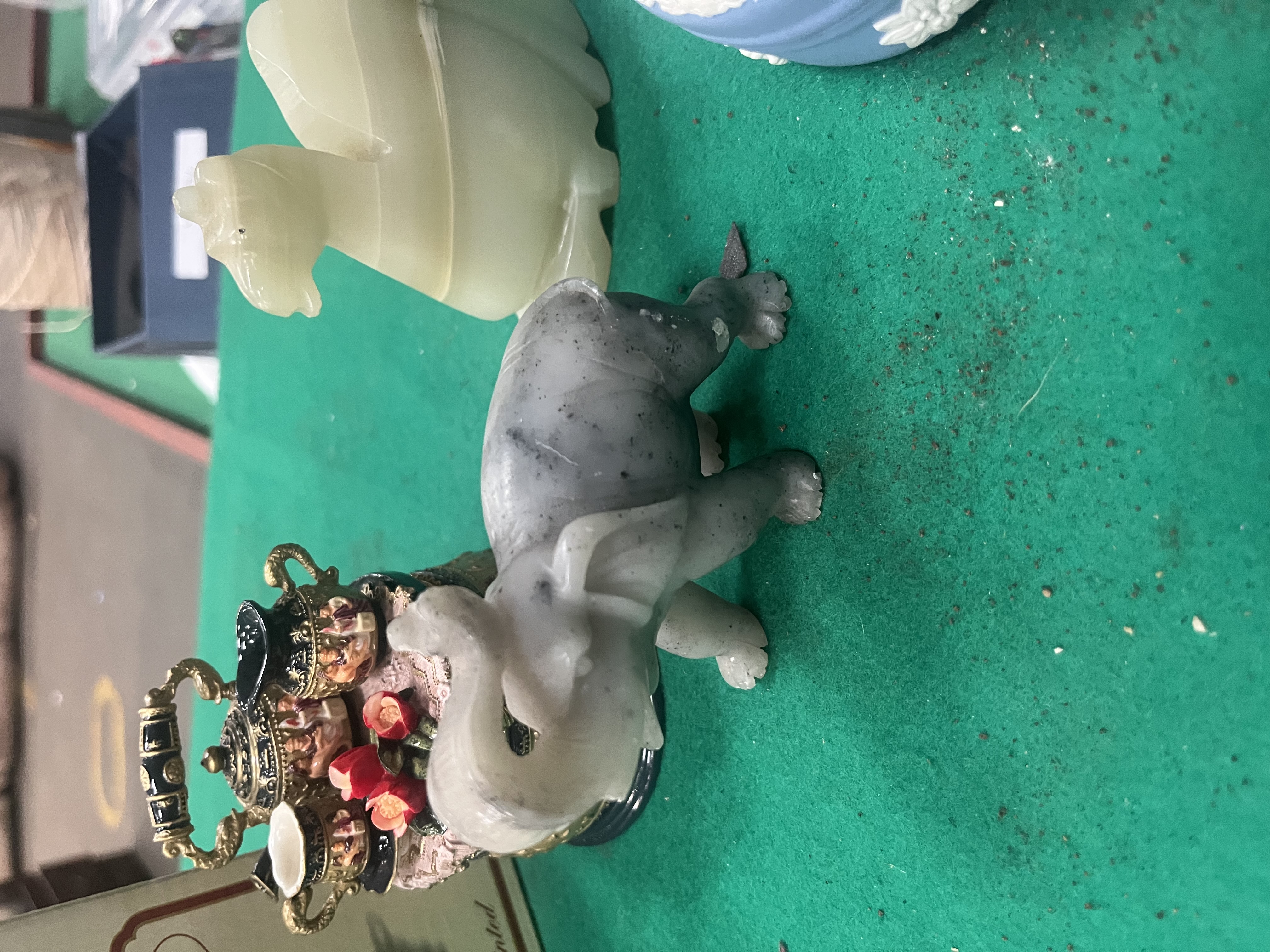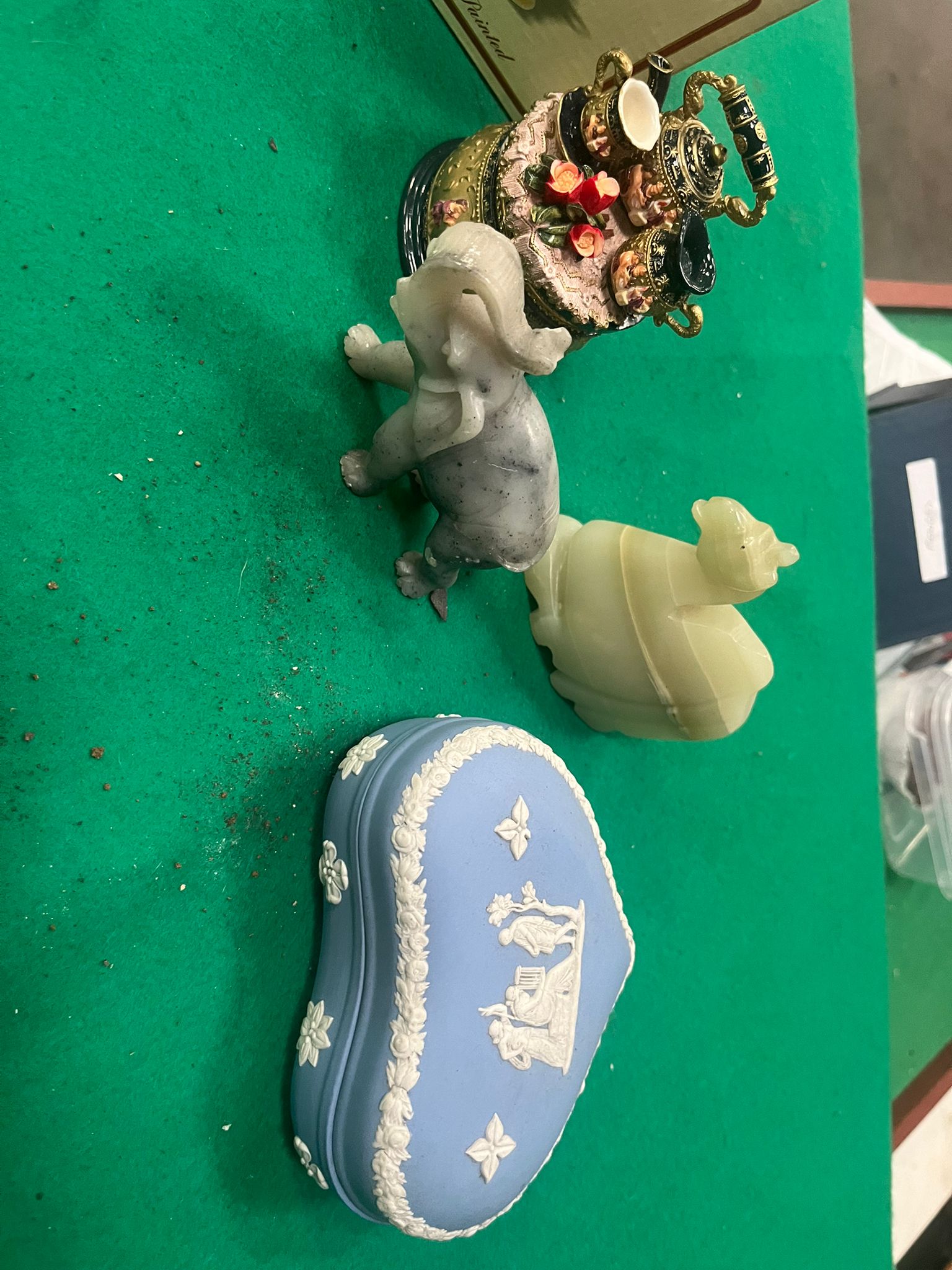 Lot 587: A Collection of Decorative Objects including a Wedgwood Jasperware Trinket Box, Carved Stone Figurines, and Vintage Ephemera