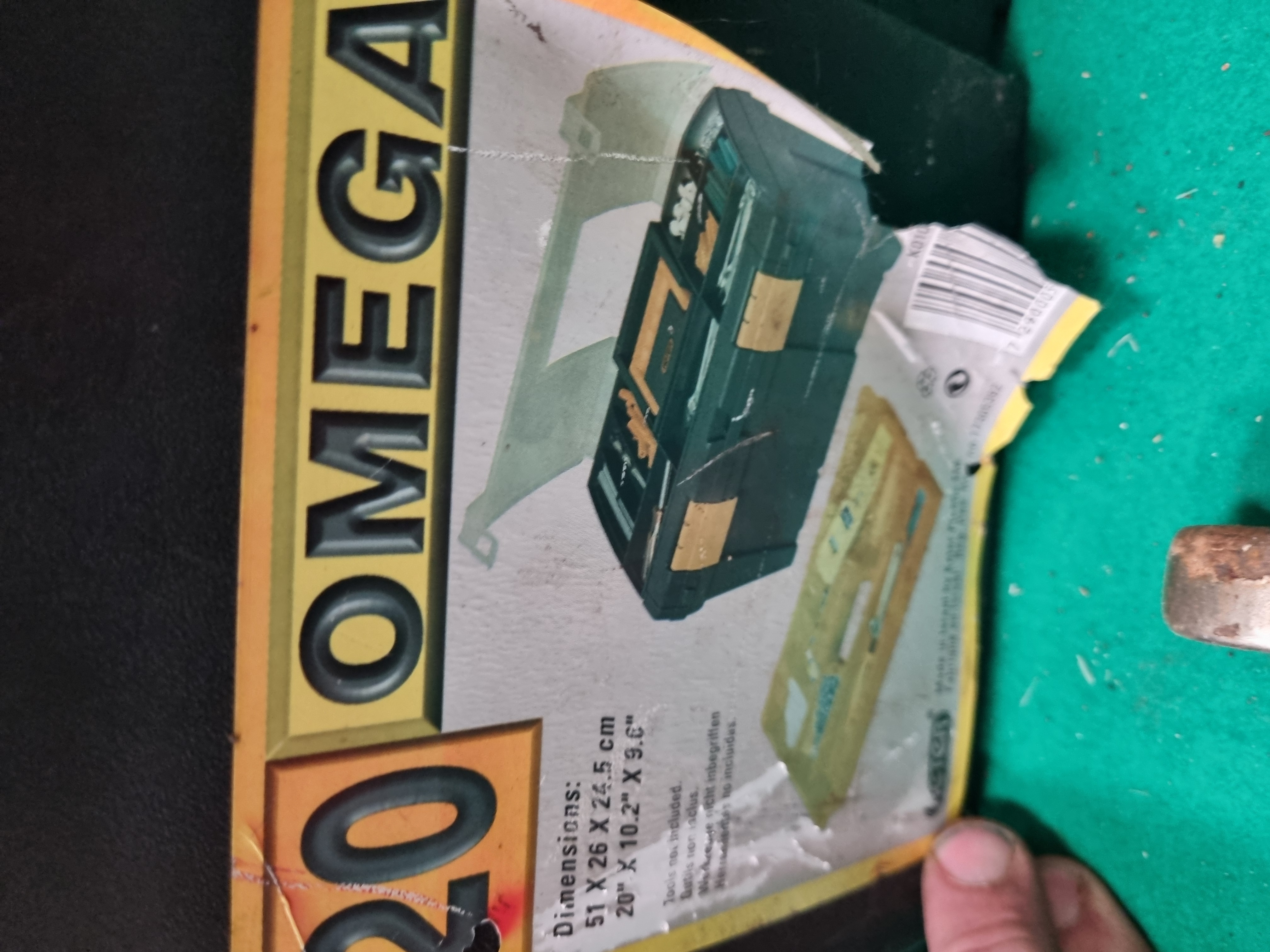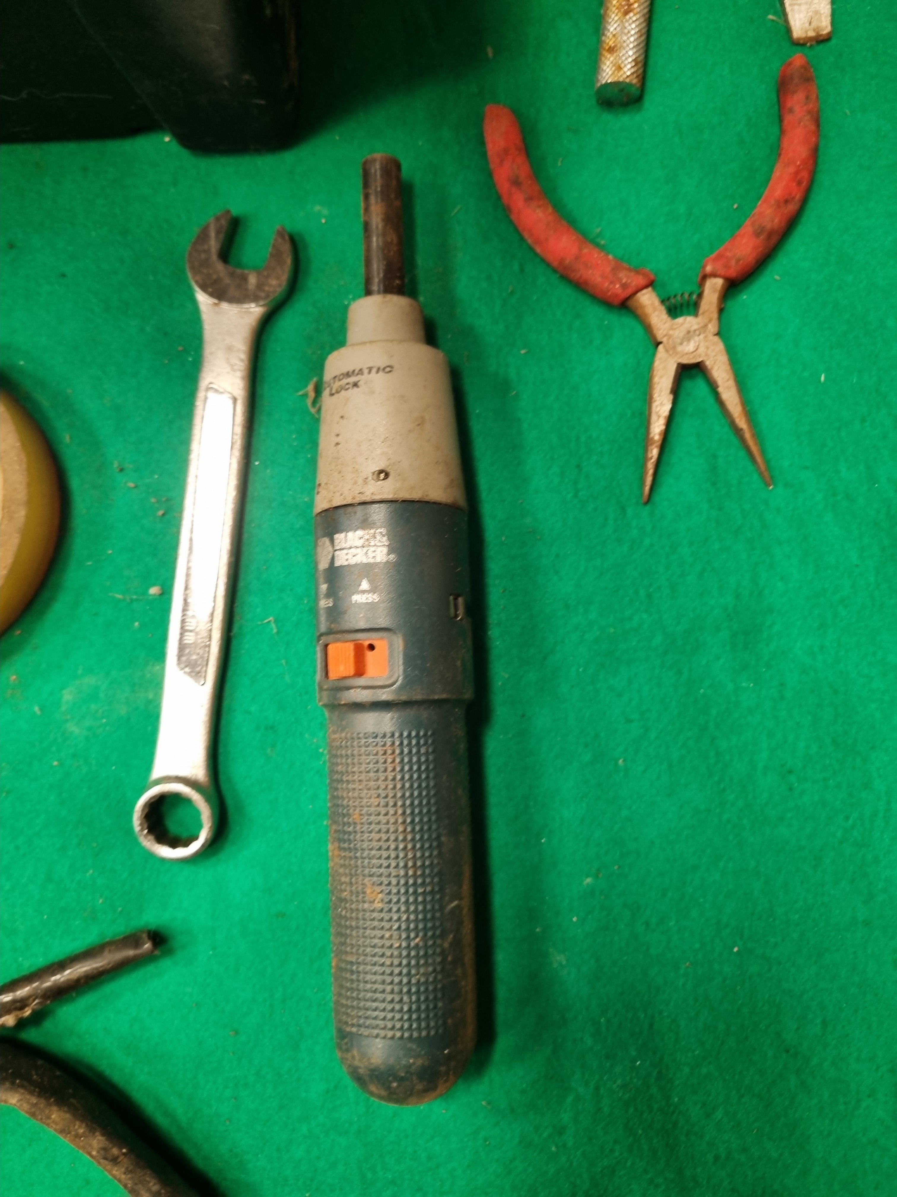 A collection of domestic hand tools and miscellaneous hardware housed in a portable plastic toolbox. The toolbox is a Keter Omega 20 model, manufactured from black plastic with orange latches and integrated small-part organisers in the lid. It features a red oval badge marked KETER and a front label specifying dimensions. The contents include a claw hammer with a tubular steel shaft and rubberised grip, a Black and Decker battery-powered screwdriver with an automatic lock feature, and various manual tools including combination and needle-nose pliers, a combination spanner, and an offset ring spanner. Also present are general-purpose scissors, manual screwdrivers, a roll of adhesive tape, and a quantity of loose hardware such as screws, springs, and cabinet hinges.