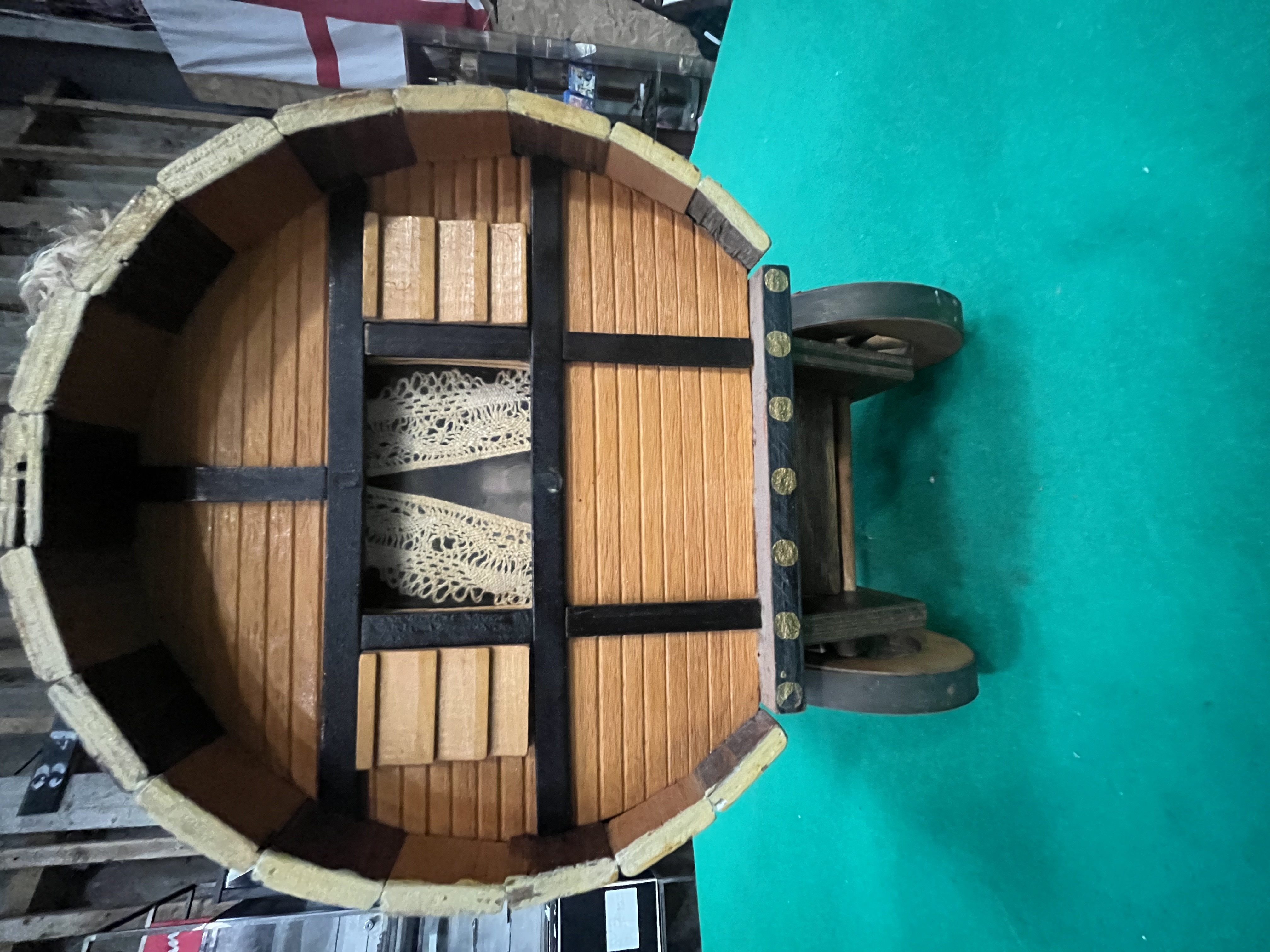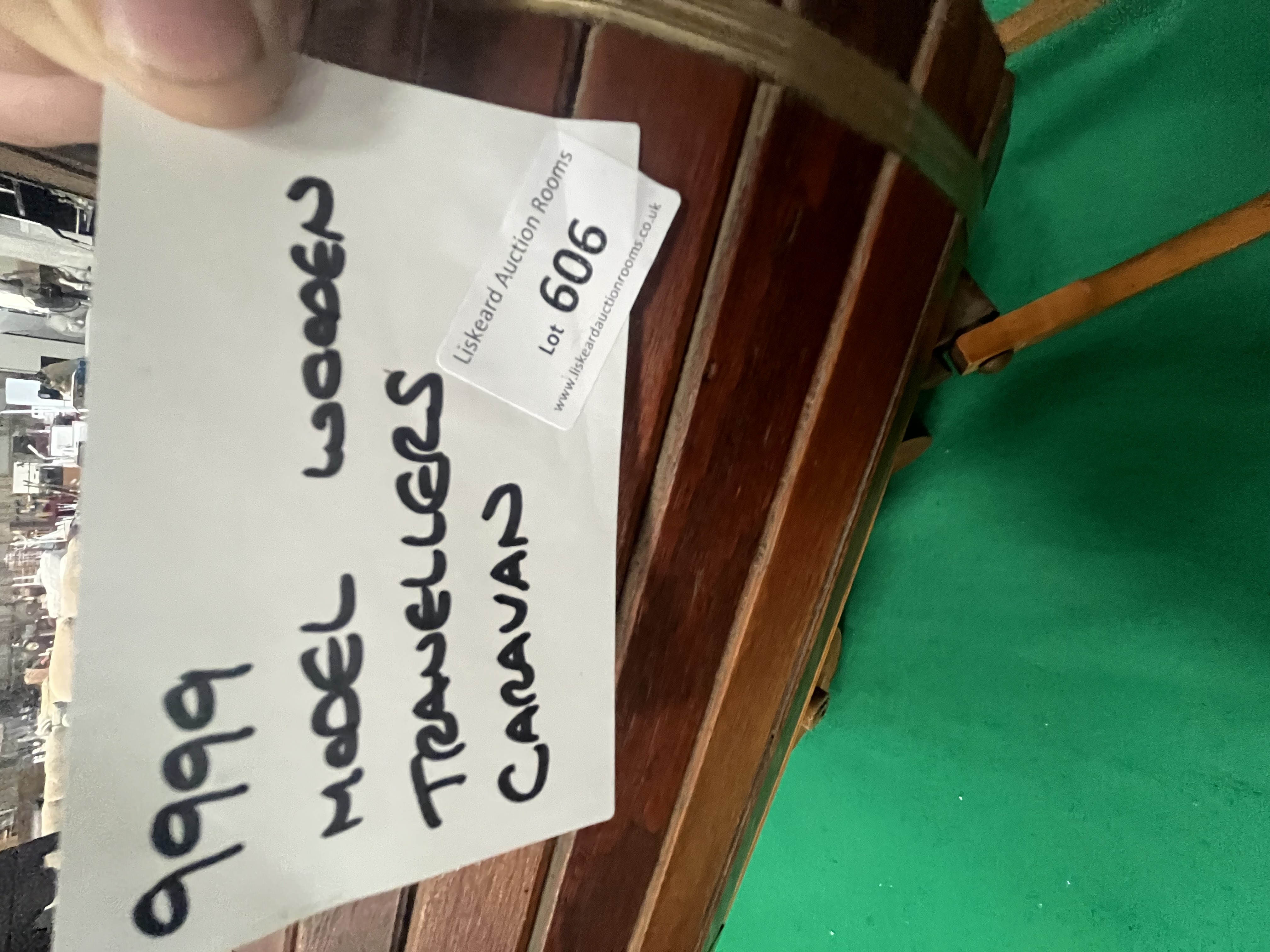 A wooden model of a Romani traveller’s caravan, specifically designed in a bow-top or barrel-top style. The body is constructed from stained horizontal wooden slats secured by two bands. The front facade features a small window with white lace curtains and a door positioned below. The front edges are decorated with a vertical row of gold-coloured metal studs. The caravan is mounted on a wooden four-wheel chassis with spoked wheels and black-painted rims. Two long wooden shafts extend from the front axle for a horse harness. A handwritten tag accompanies the item reading 9999 MODEL WOODEN TRAVELLERS CARAVAN, alongside an auction tag for Lot 606 from Liskeard Auction Rooms.