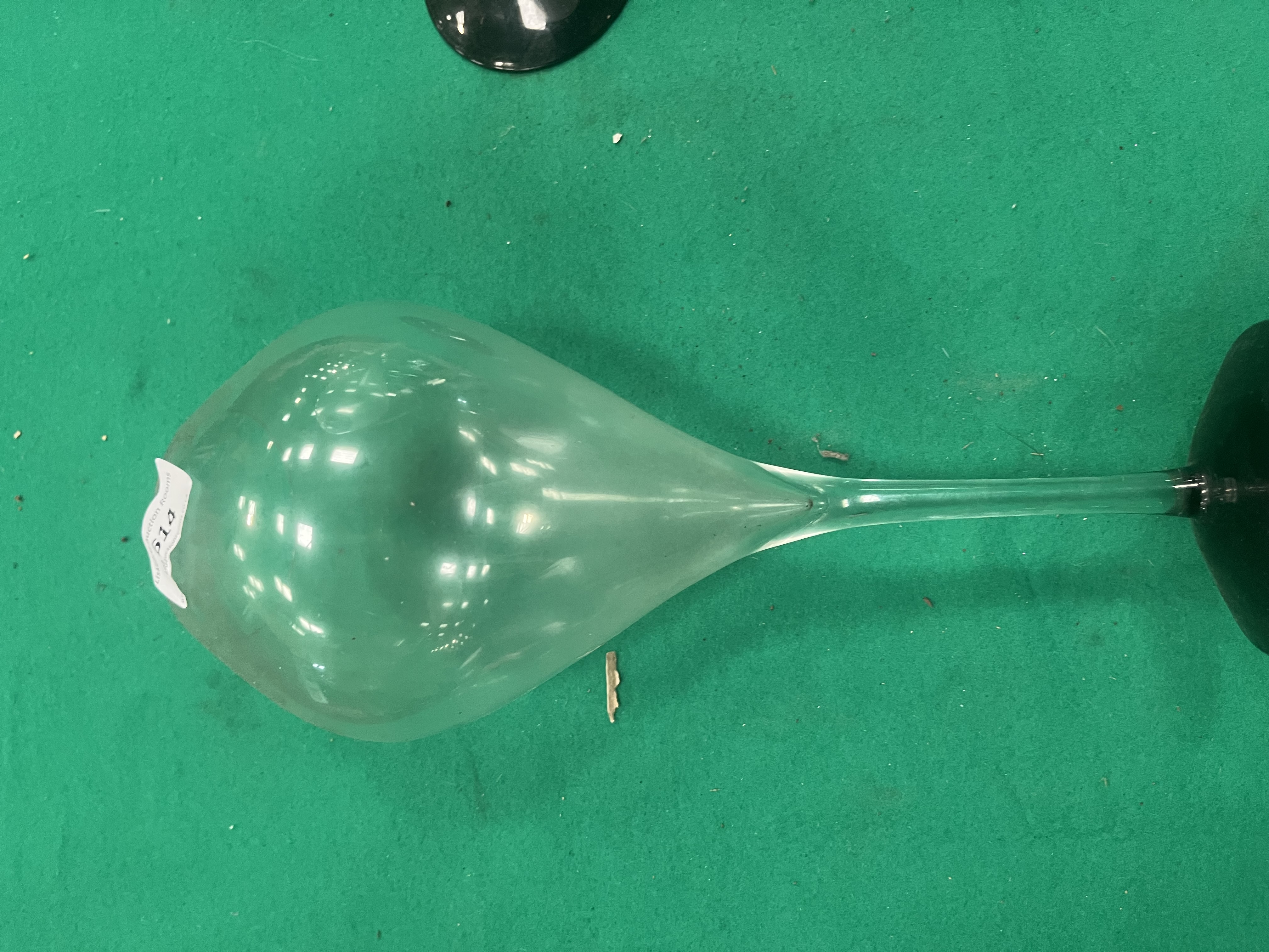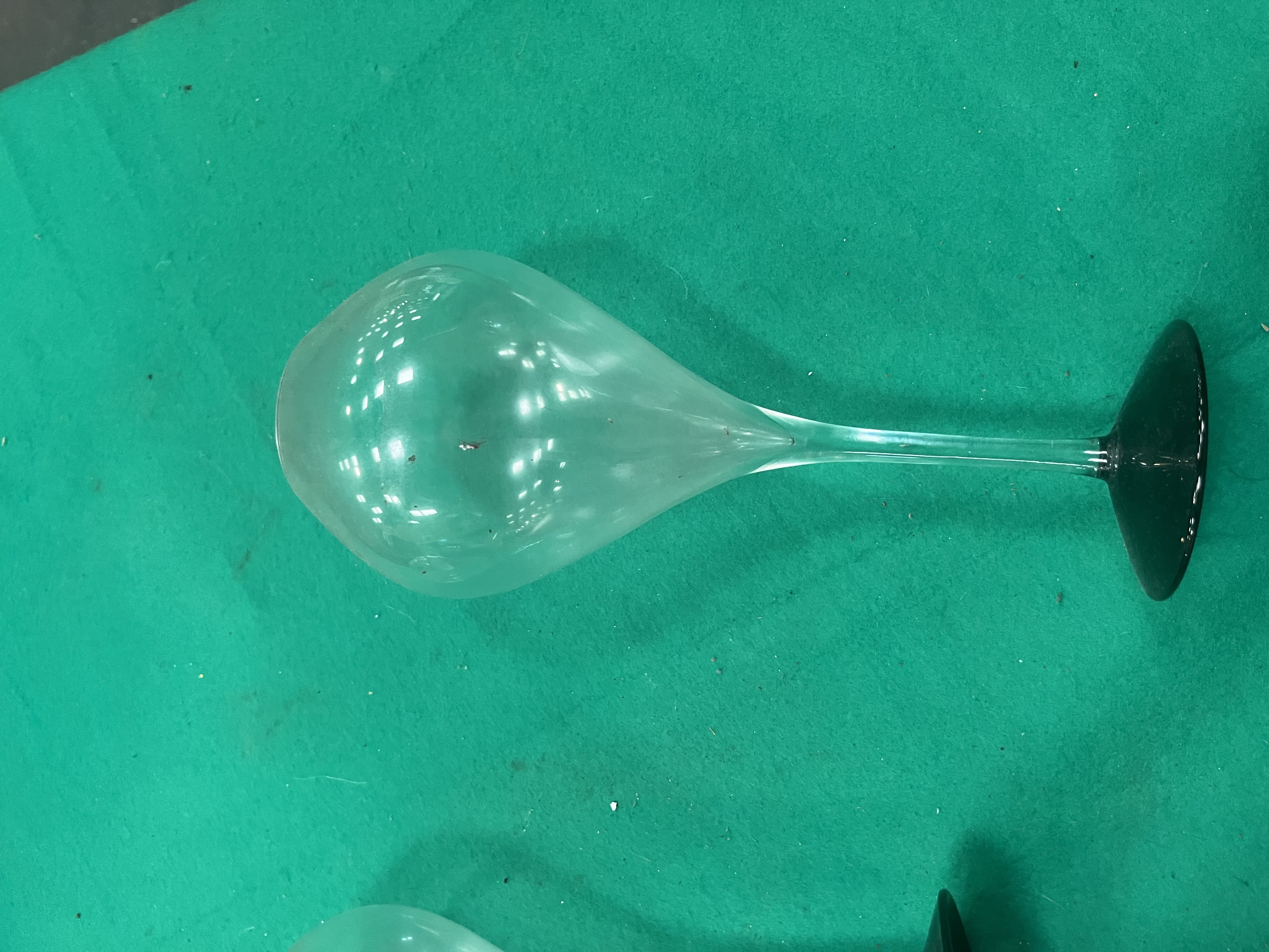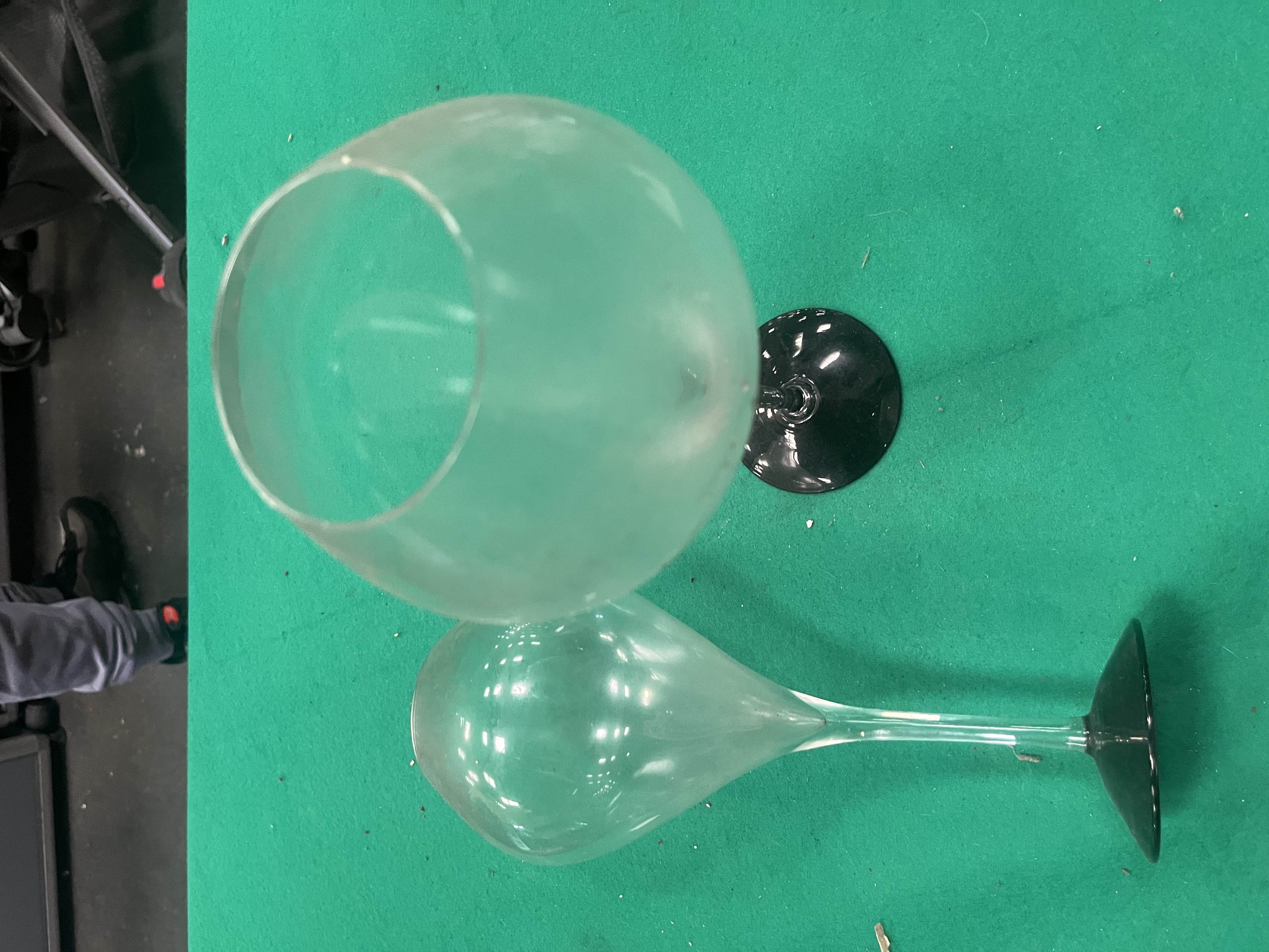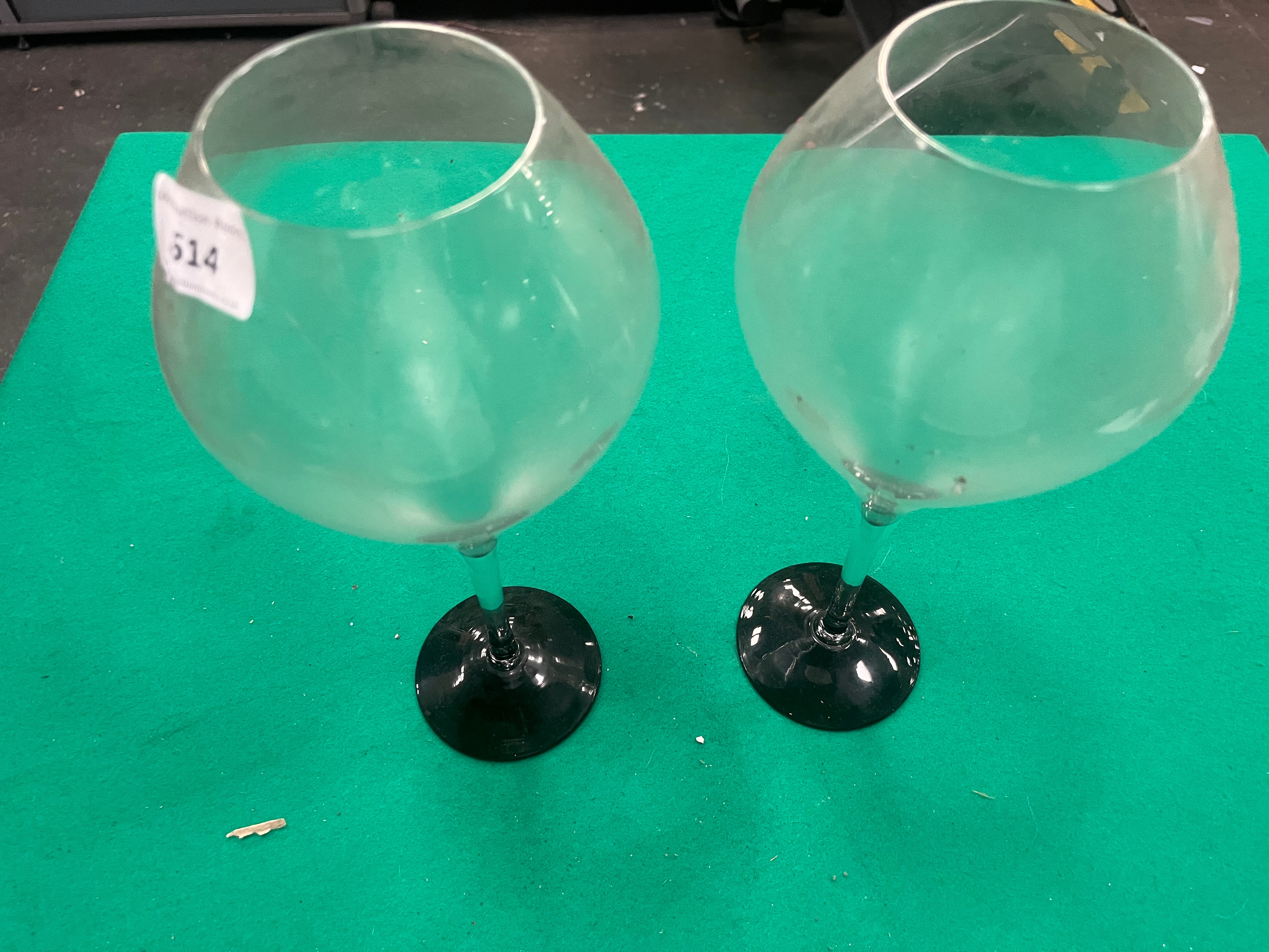 This pair of large balloon-style stemware glasses is designed with voluminous clear glass bowls in a distinctive tapered teardrop or onion shape. The clear bowls narrow at the base to meet slender clear glass stems, which are supported by contrasting opaque black glass circular feet. The underside of each foot features a circular indentation, but no maker marks are clearly legible. Both glasses are currently labelled with white adhesive lot stickers from Liskeard Auction Rooms. The thin-walled construction and bi-colour aesthetic are characteristic of contemporary European glassware.