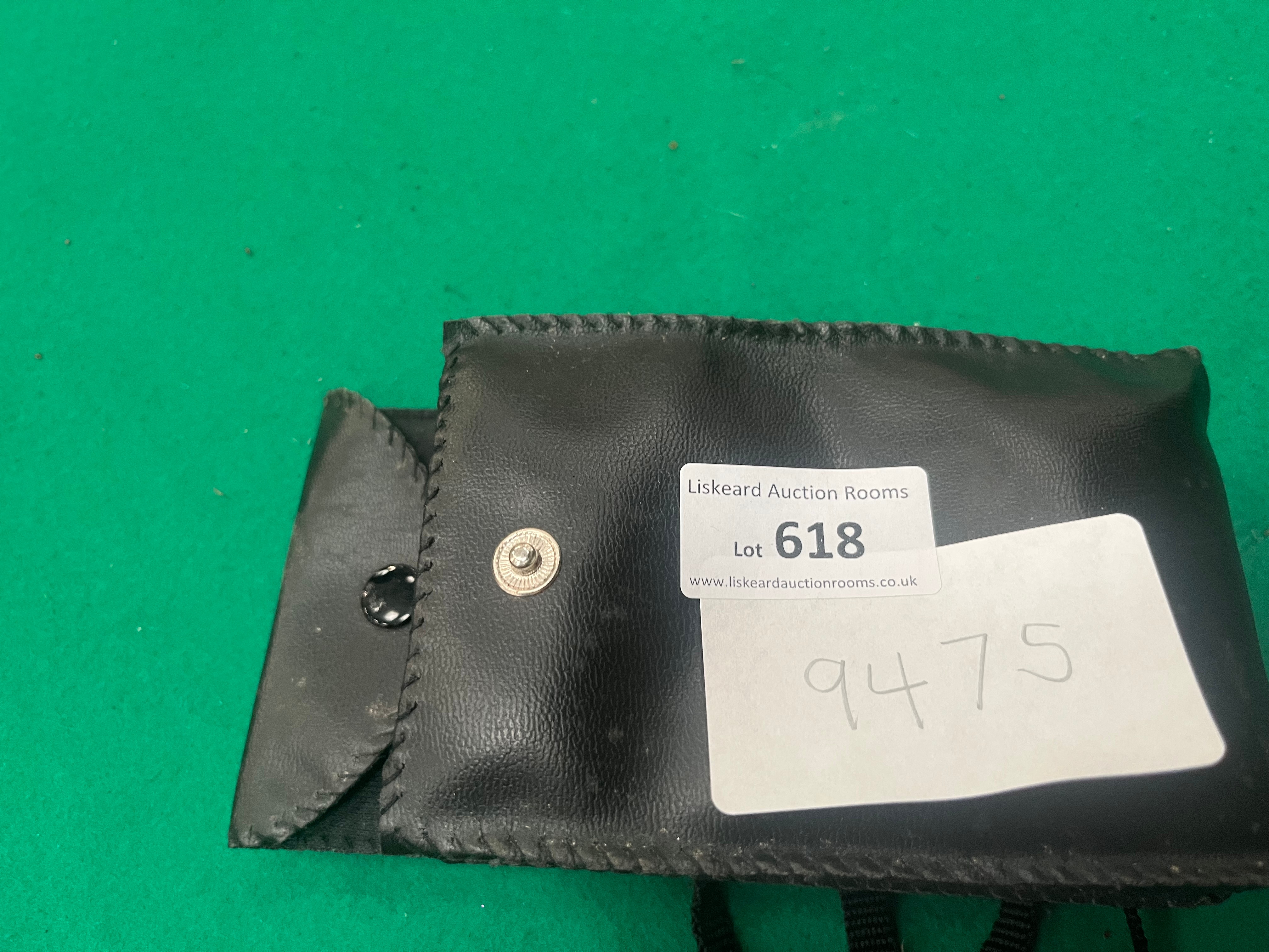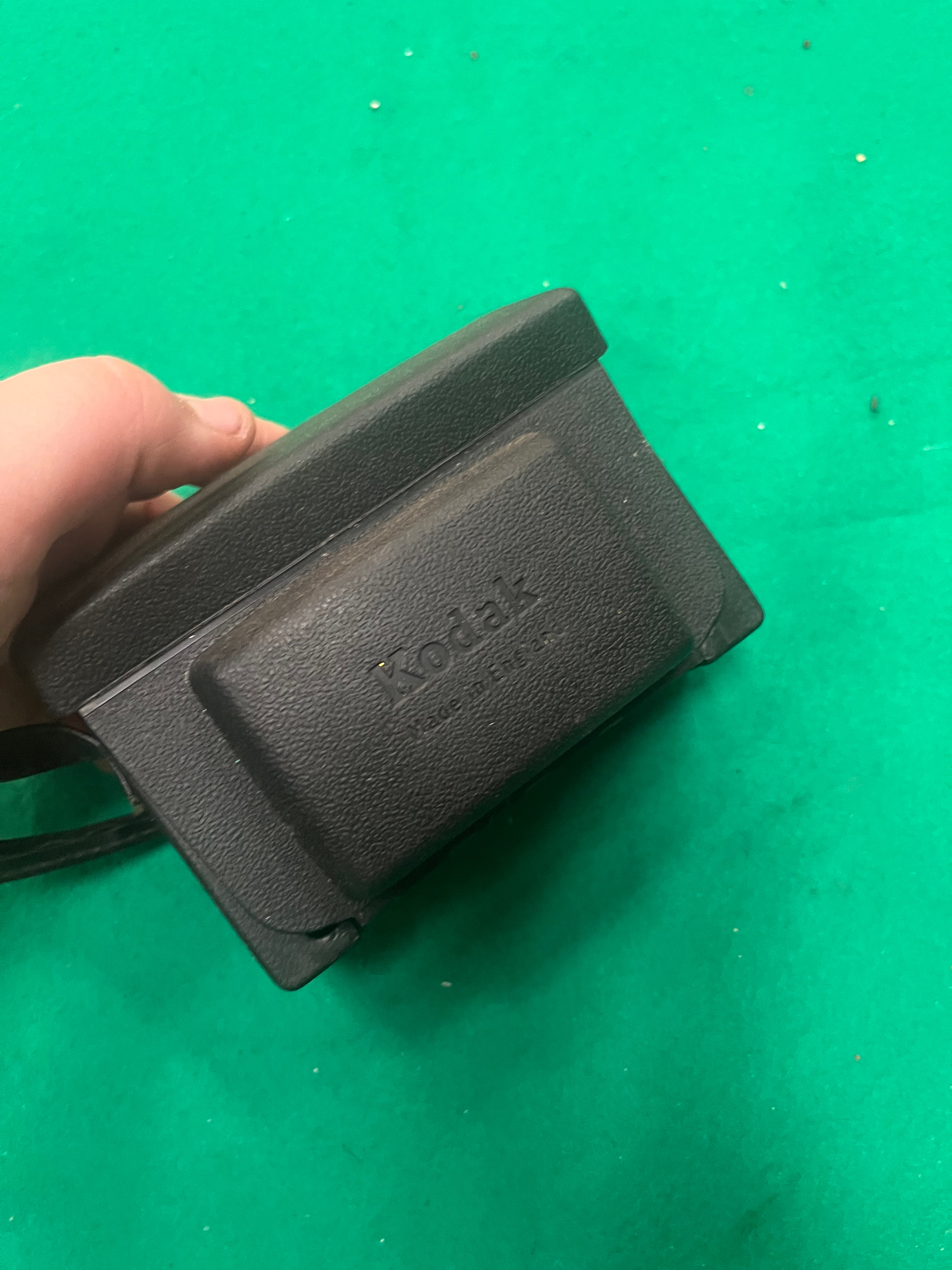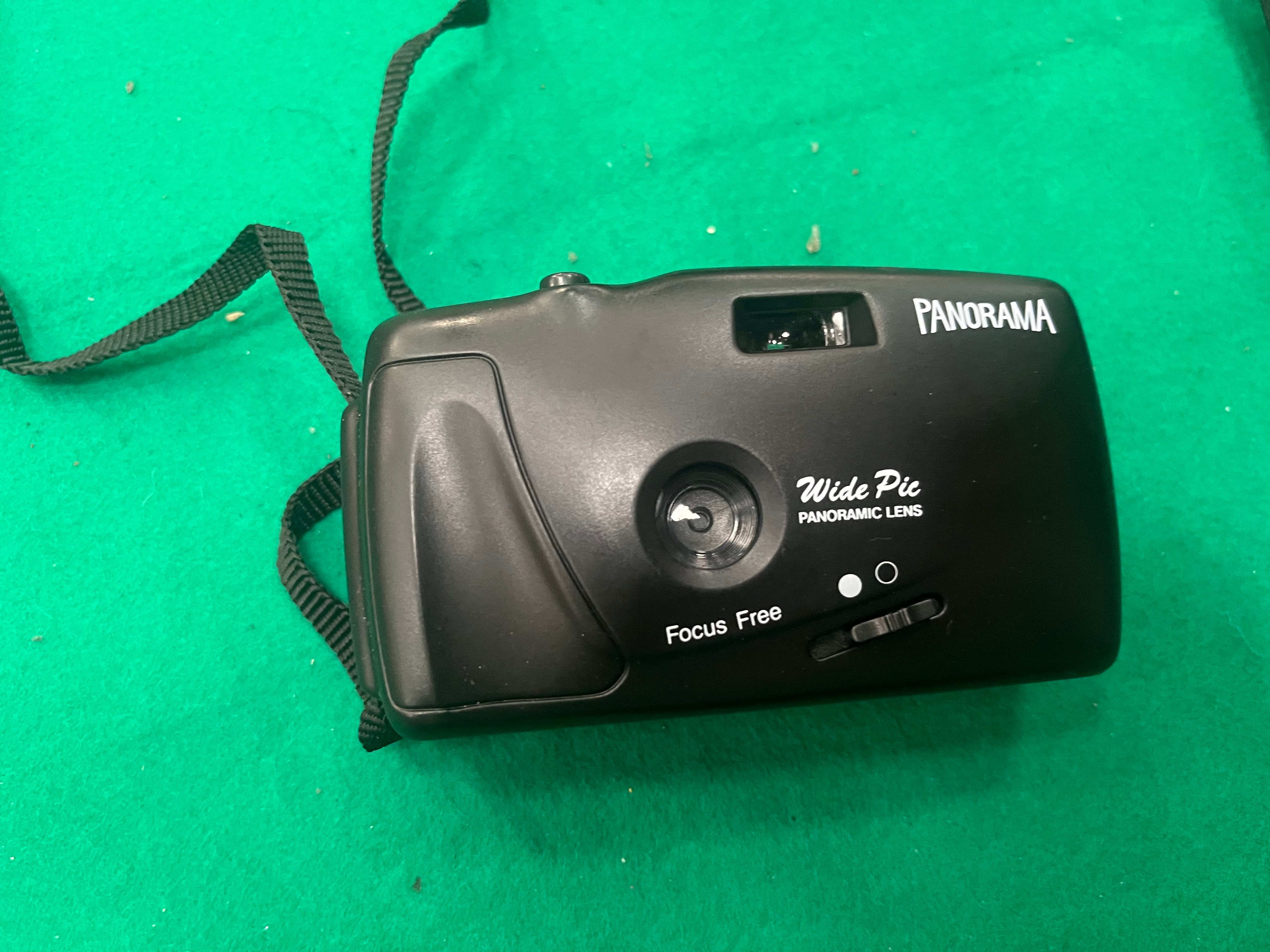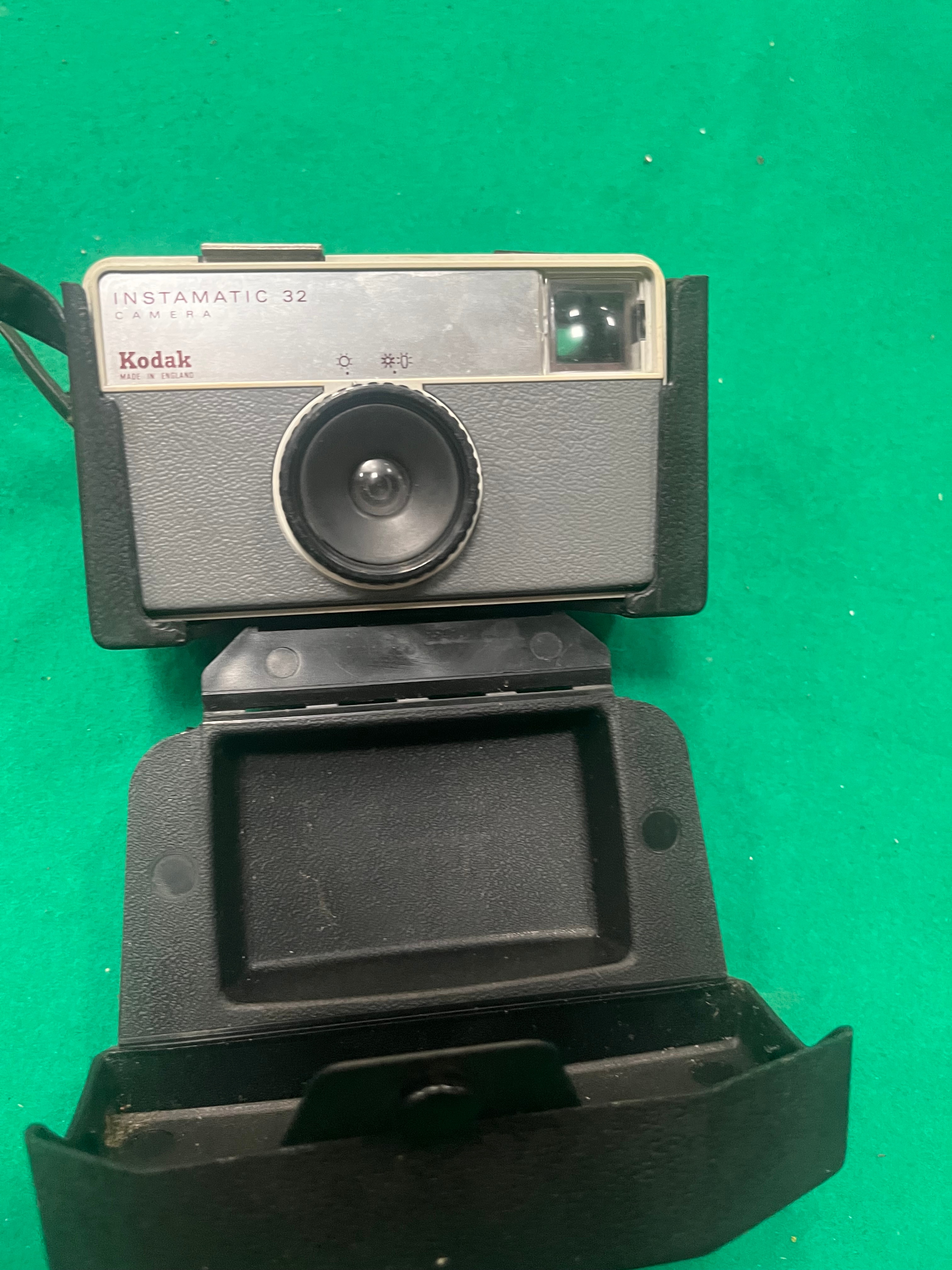 This lot contains two vintage film cameras of British and generic origin. The first is a Kodak Instamatic 32, manufactured in England, designed for 126 cartridge film. It features a fixed-focus lens with manual aperture adjustment controlled by weather-symbol icons on the faceplate. The camera body is constructed from grey and black plastic with a silver-toned front panel and bears the manufacturer markings Made in England. It is accompanied by its original black plastic Kodak-branded hard shell carry case and an attached plastic wrist strap. The second camera is a Wide Pic Panorama, a point-and-shoot model designed for 35mm film which utilises an internal mask for panoramic effects. The black contoured plastic body is marked Focus Free and Panoramic Lens. It includes an attached black braided nylon neck strap. Also included in the lot is a small black faux-leather accessory pouch with a metal snap-button closure. The items bear auction labels from Liskeard Auction Rooms for Lot 618.