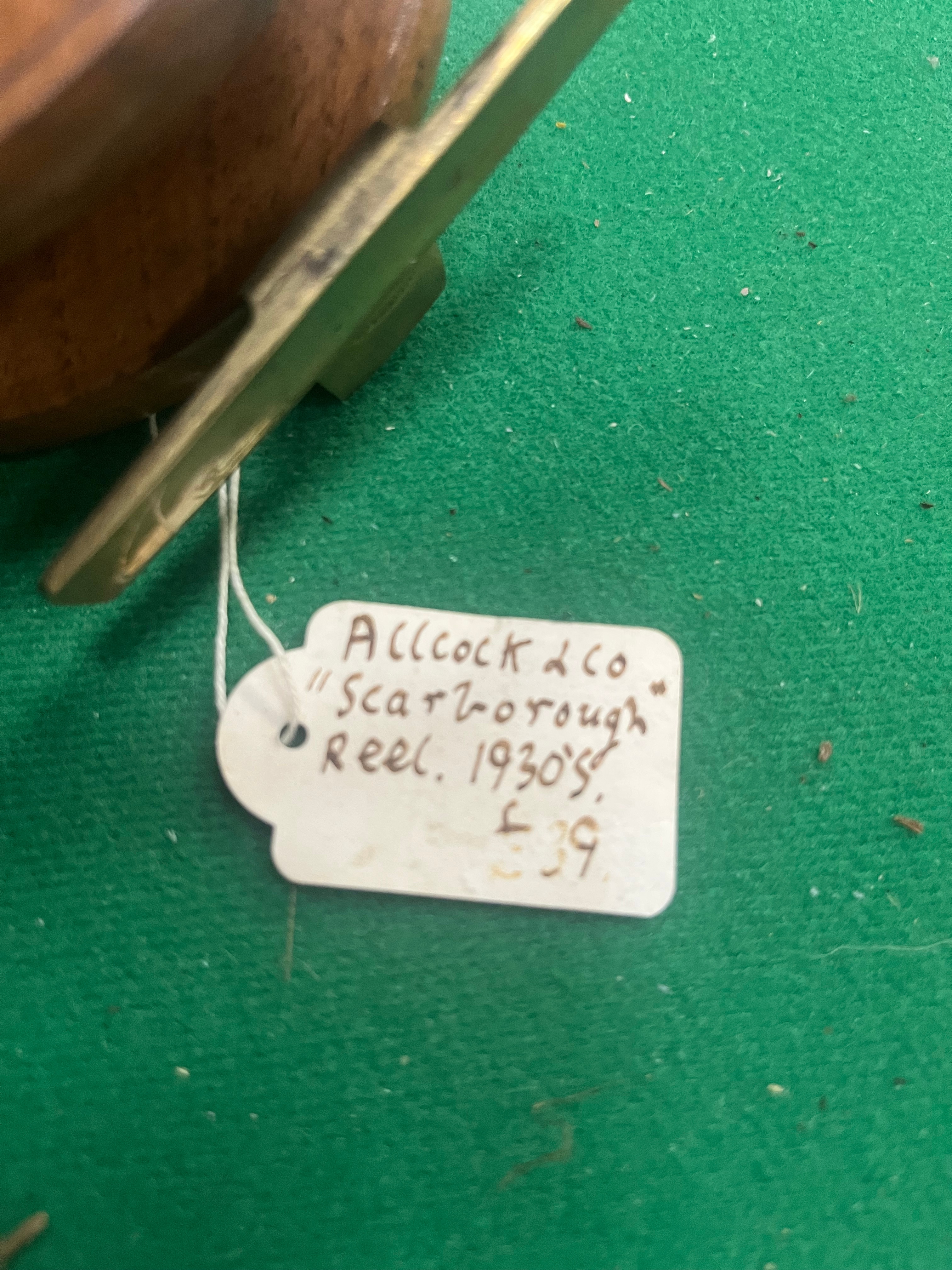 A collection of two vintage British centrepin fishing reels by S. Allcock and Co. Ltd. The first is a wooden Scarborough-style reel featuring a spool with four circular perforations, twin black handles mounted on brass plates, and a central brass wing nut. It is fitted with a large brass foot and retains a handwritten identification tag attributing the piece to the 1930s. The second item is an Allcock Aerialite reel constructed from a black composite material. The faceplate is moulded with the text Allcock Aerialite and Made in England. This reel features a single handle with a counterweight, a wire line guide, and contains a quantity of yellow fishing line.