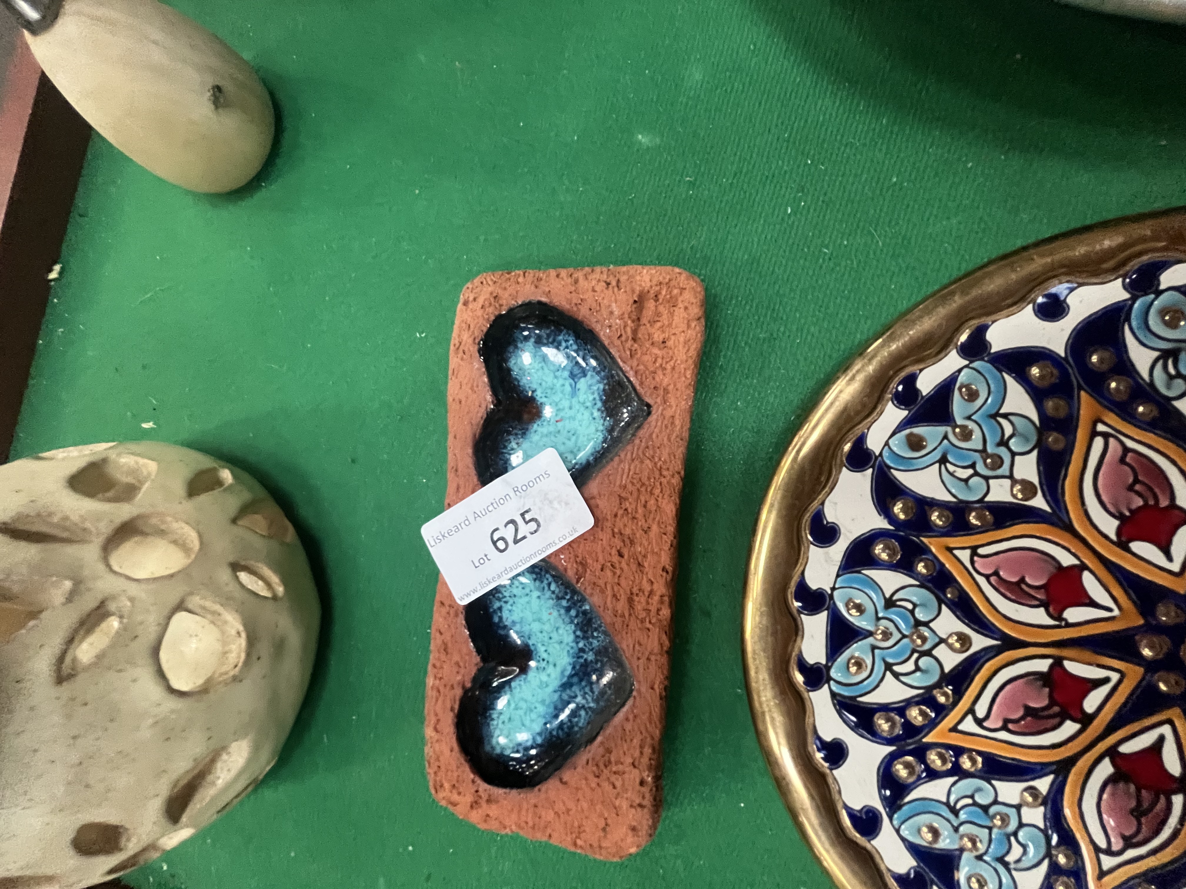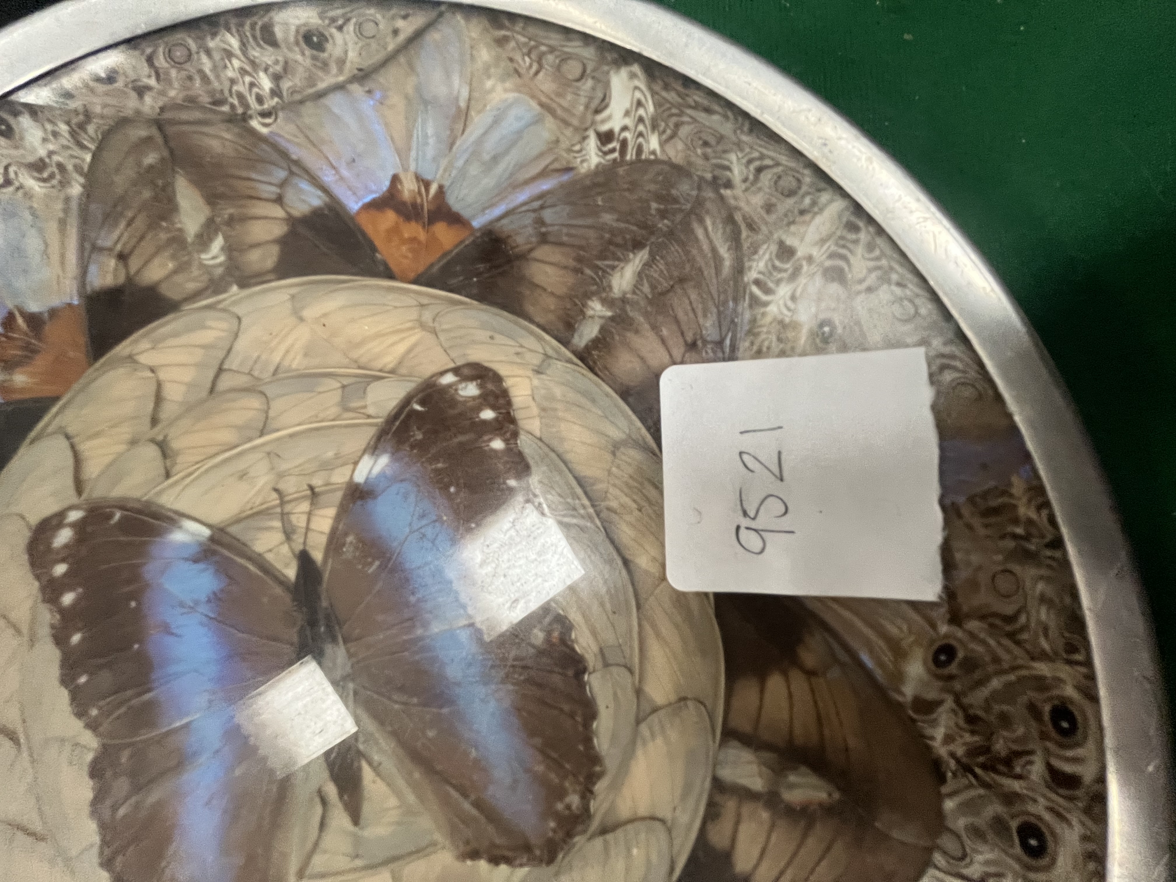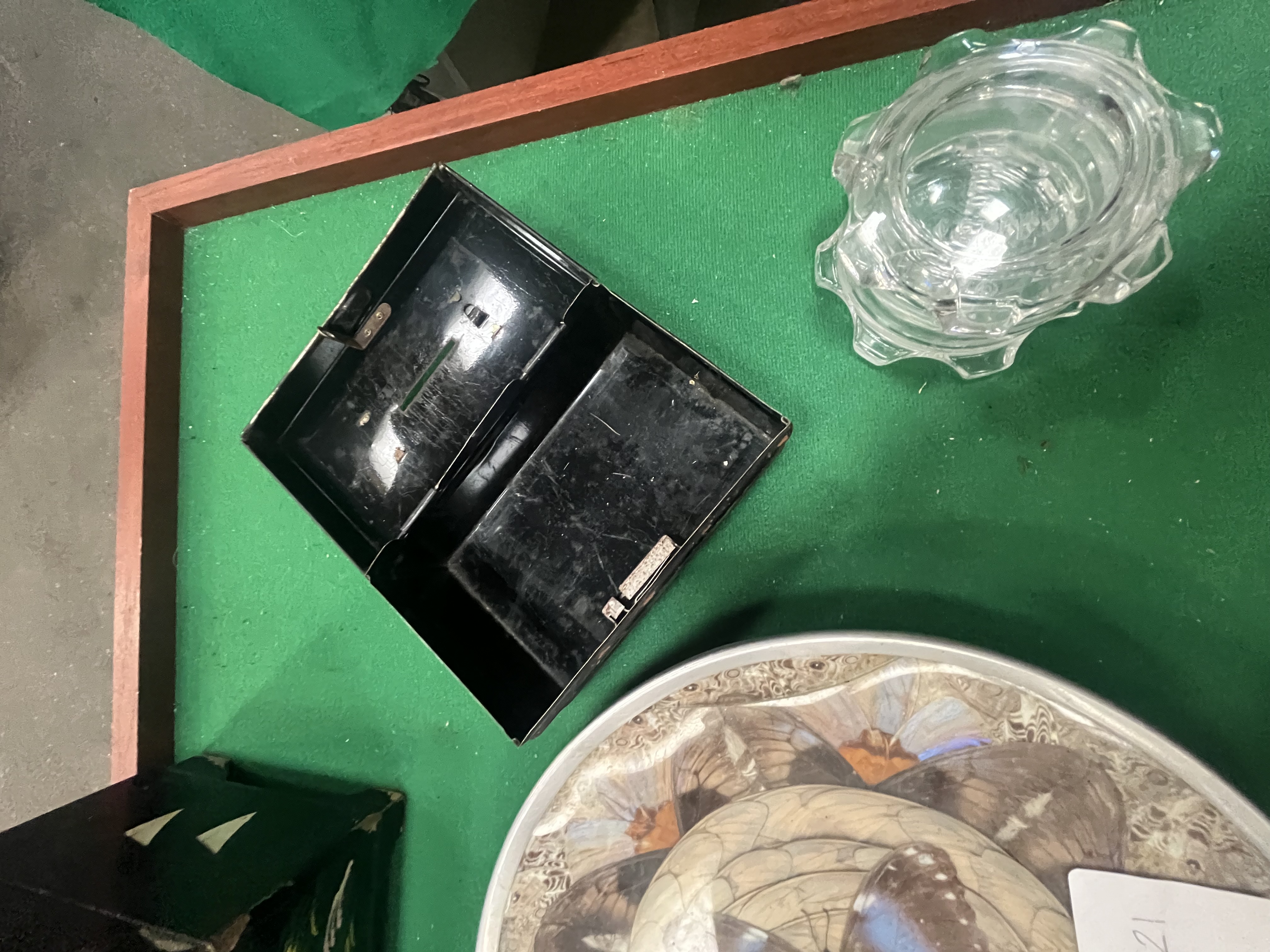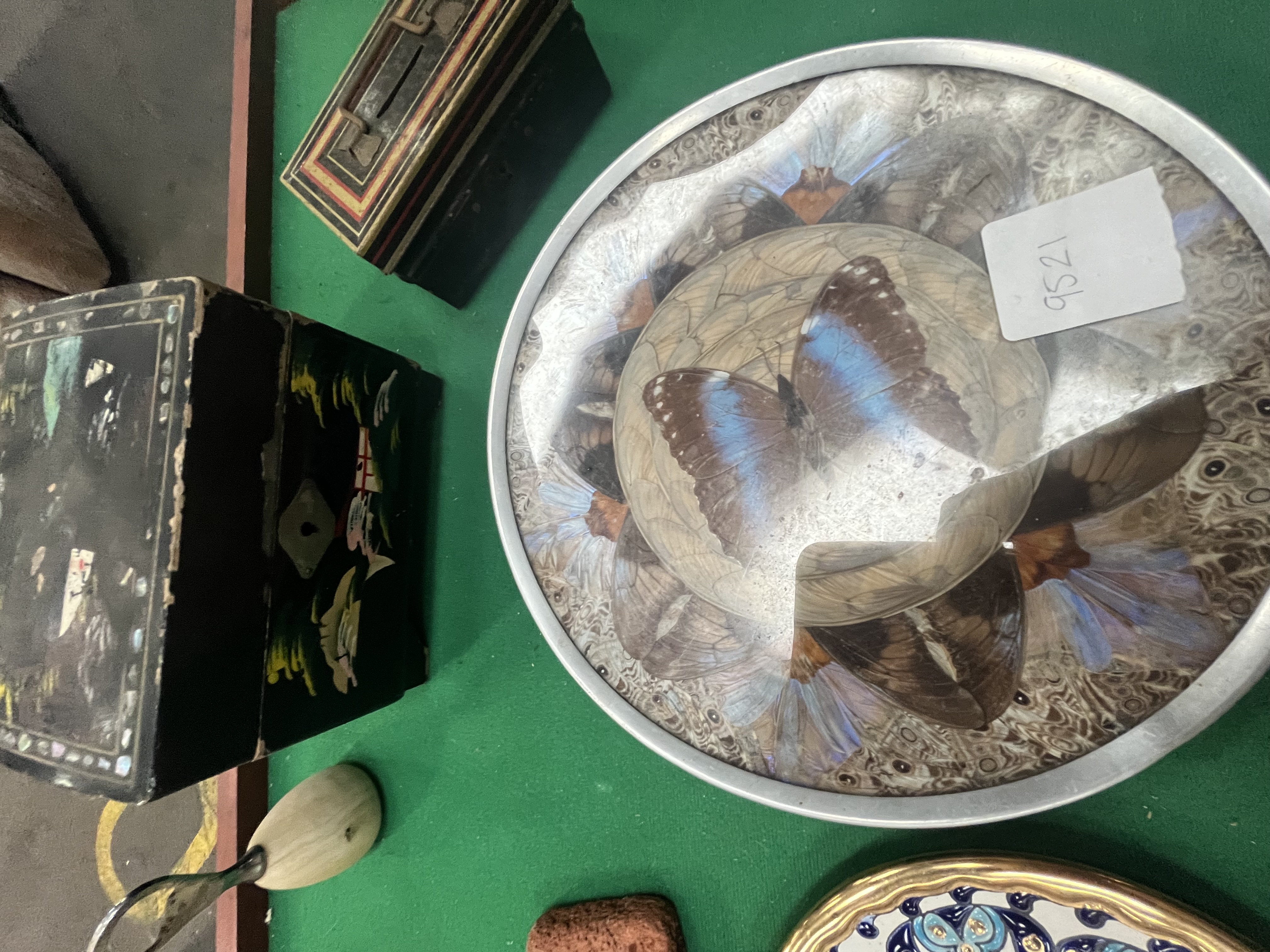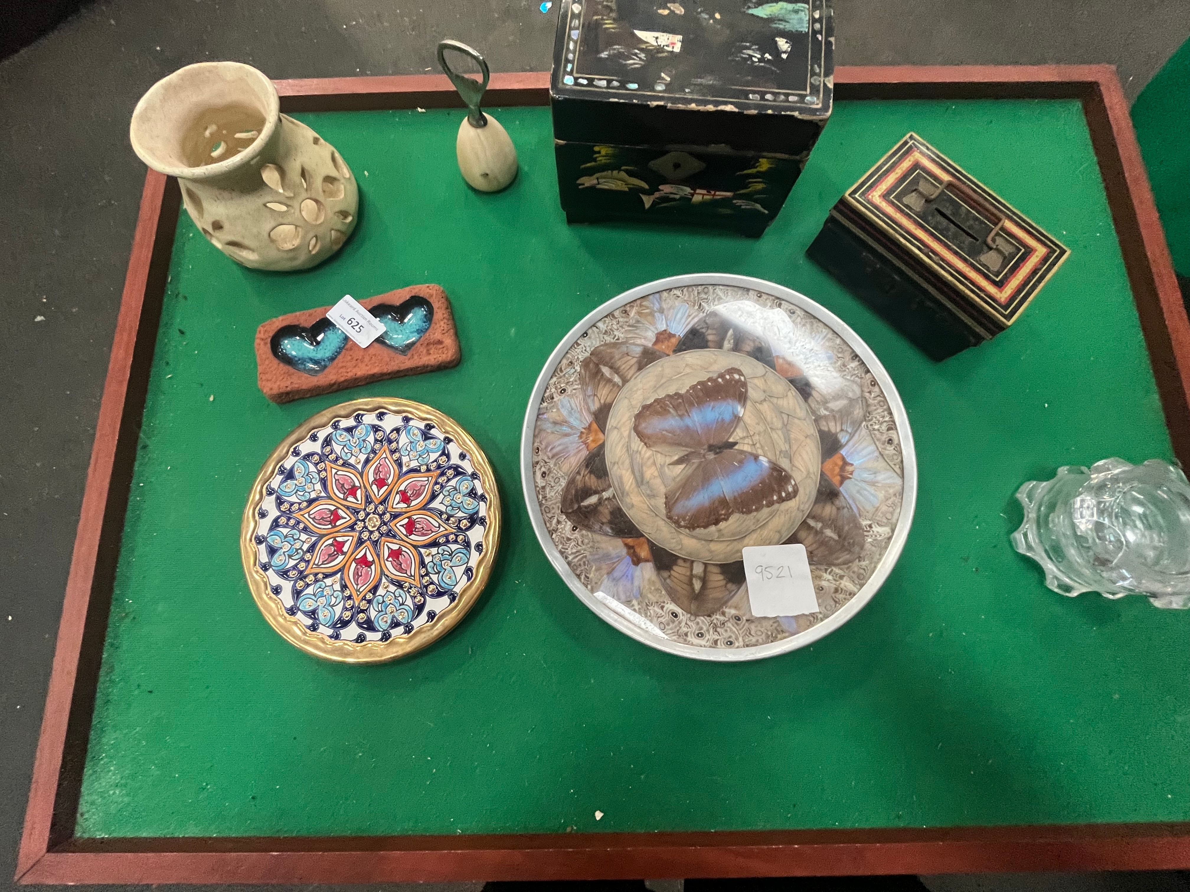 This collection of decorative items includes a variety of materials and artistic styles. A large rectangular black lacquered box features oriental scenes in mother-of-pearl or abalone shell inlay. A smaller wooden box is decorated with geometric marquetry in the Tunbridge ware style. Natural history is represented by a circular taxidermy display containing multiple butterfly specimens, including a central blue Morpho butterfly, mounted under glass with a metallic rim. Metalware consists of a black-painted metal cash box with internal compartments and a bottle opener with a turned handle. Glassware includes a small clear pressed glass dish with a scalloped rim. Ceramic items comprise a light-coloured earthenware vessel with pierced floral decoration, a circular hand-painted plate with polychrome geometric patterns and a gold-coloured rim, and a terracotta block featuring two heart-shaped depressions with a blue reactive glaze.