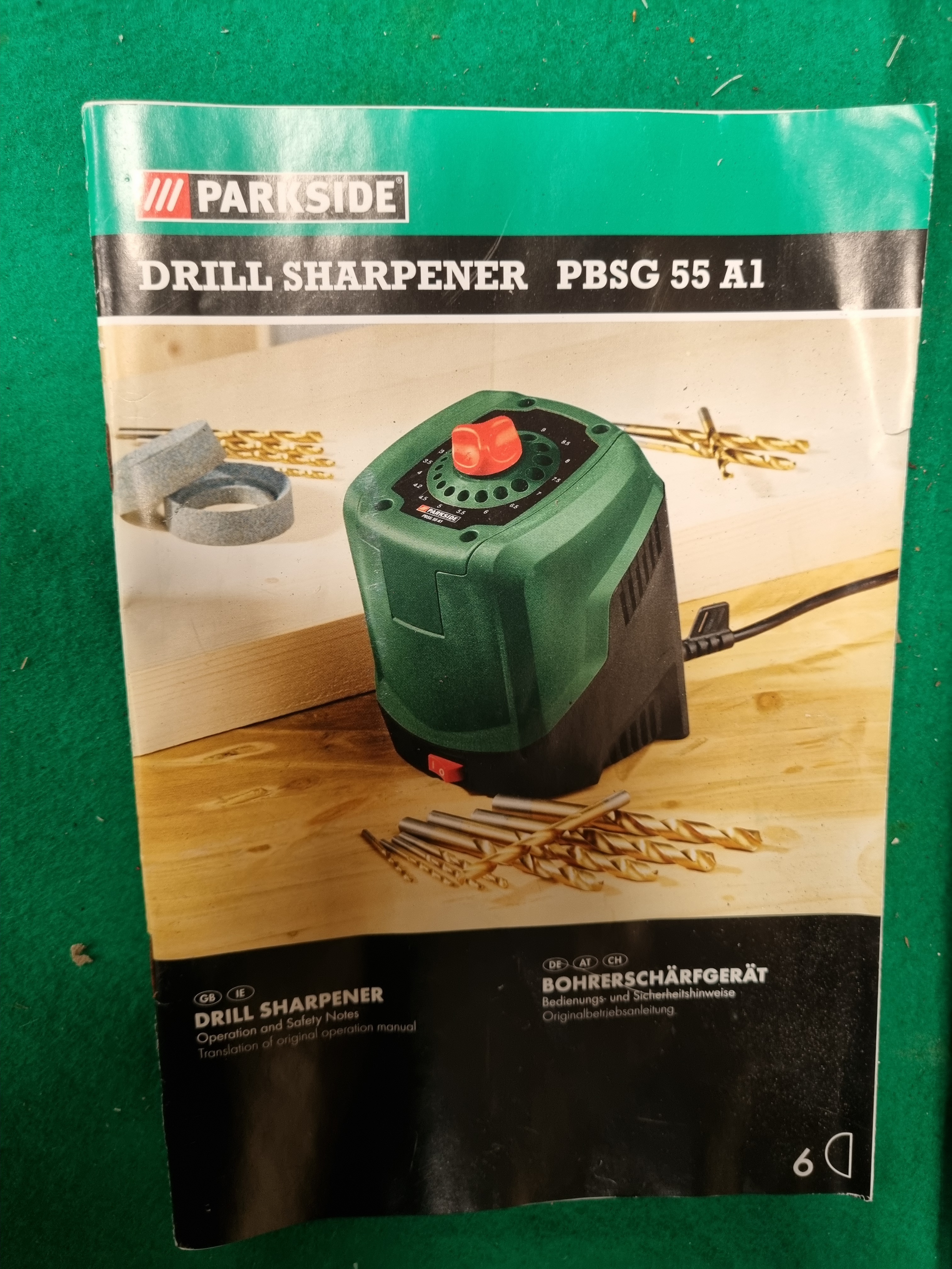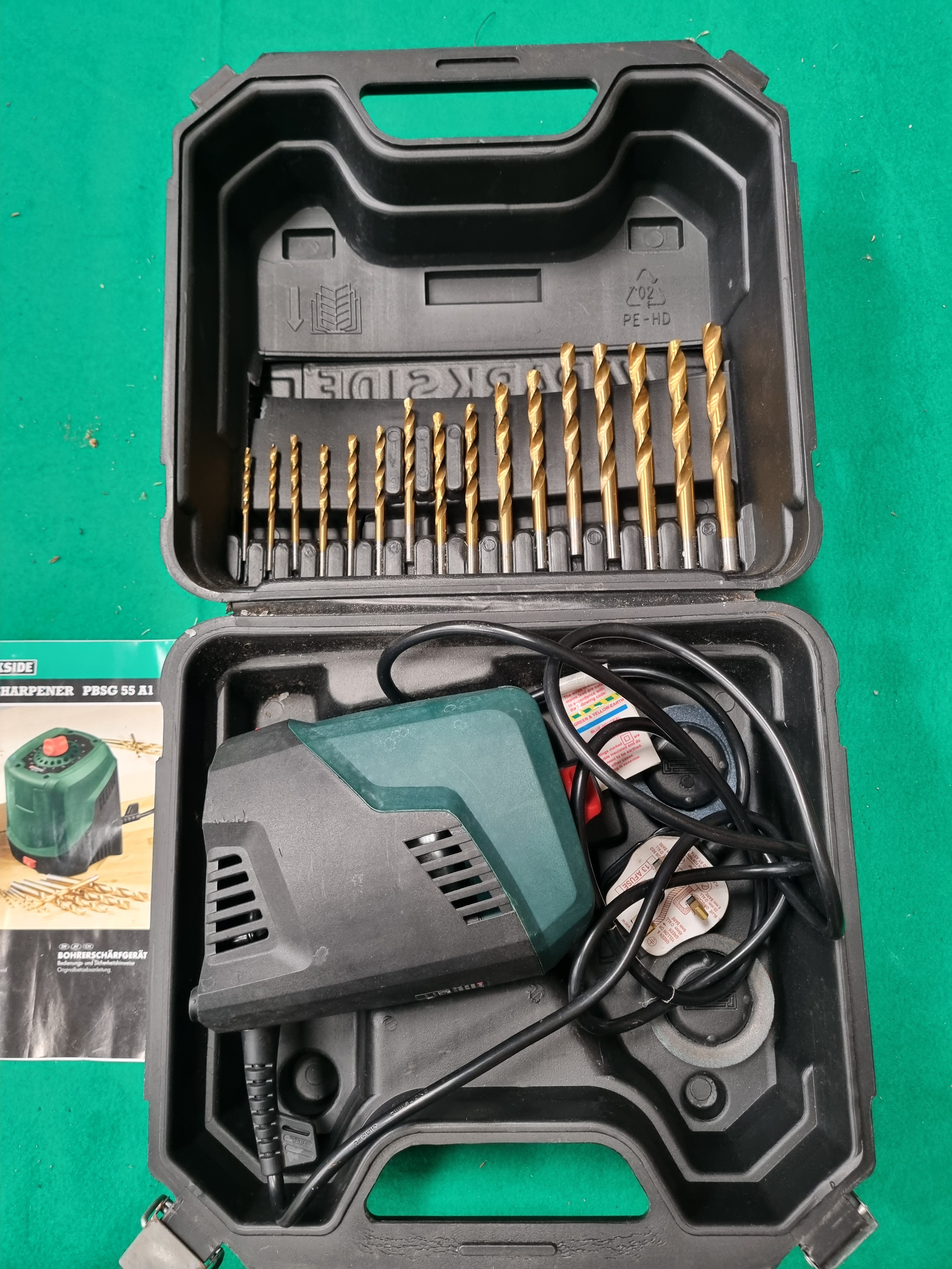 This lot comprises a Parkside model PBSG 55 A1 drill sharpener, a corded mains-powered tool featuring a UK 3-pin plug. The unit is housed in a green and black plastic casing with an integrated adjustment dial for drill bit diameters. The sharpener is contained within a moulded black plastic carrying case. The set includes a collection of gold-coloured drill bits ranging in size from 3mm to 10mm, stored in the lid of the case. Also present are two replacement grinding wheels and the original instruction manual. The Parkside brand name and model number PBSG 55 A1 are clearly visible on the unit and the documentation.