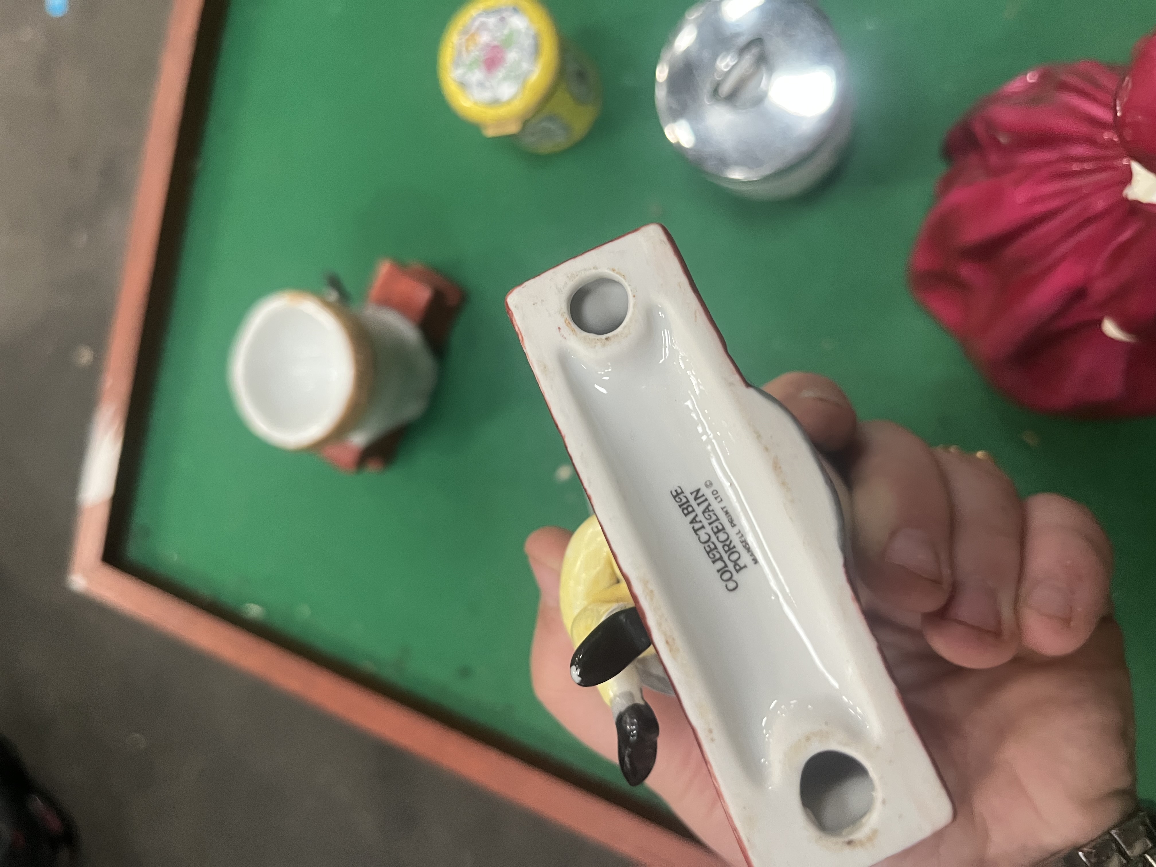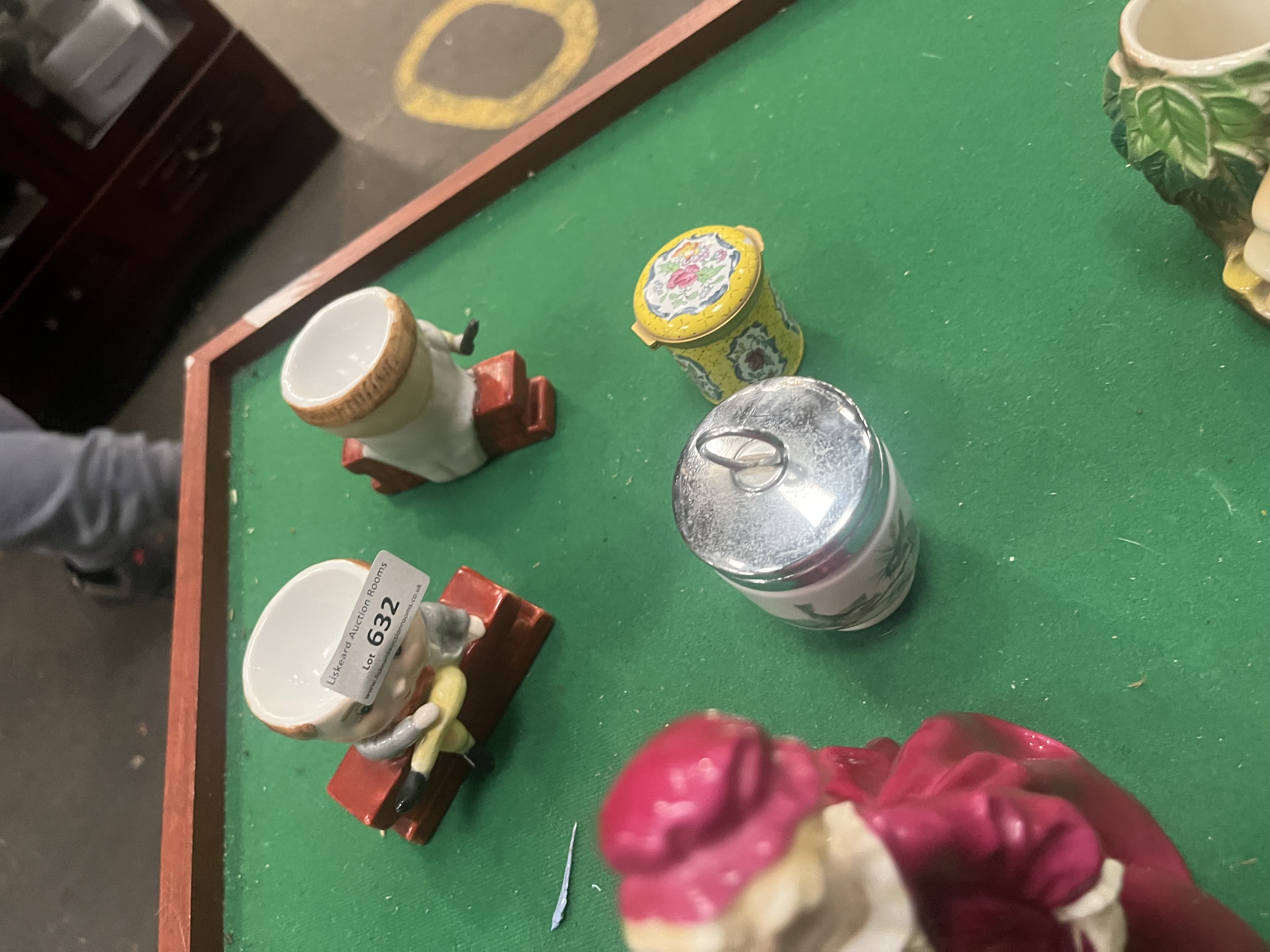 A collection of seven ceramic items, featuring a Royal Worcester fine bone china figurine titled Grandmothers Dress, model number 3081. This piece was modelled by F. G. Doughty and depicts a young woman in a tiered magenta dress with a white ruffled collar, cuffs, and matching bonnet. The collection also includes a pair of porcelain character egg cups modelled as young boys seated on red-brick bases, marked for Mansell Print Ltd. The group further comprises a larger figurine depicting a standing woman in rustic dress with a blue patterned apron and a lamb, a woodland-themed posy vase modelled as tree trunks with foliage and a rabbit at the base, a small yellow lidded jar with floral and scrollwork decoration, and a white ceramic preserve pot with a silver-toned metal lid and ring handle. The Royal Worcester figurine bears the factory mark, pattern name, and modeller’s name on the base. The egg cups are marked Collectable Porcelain Mansell Print Ltd on the underside.