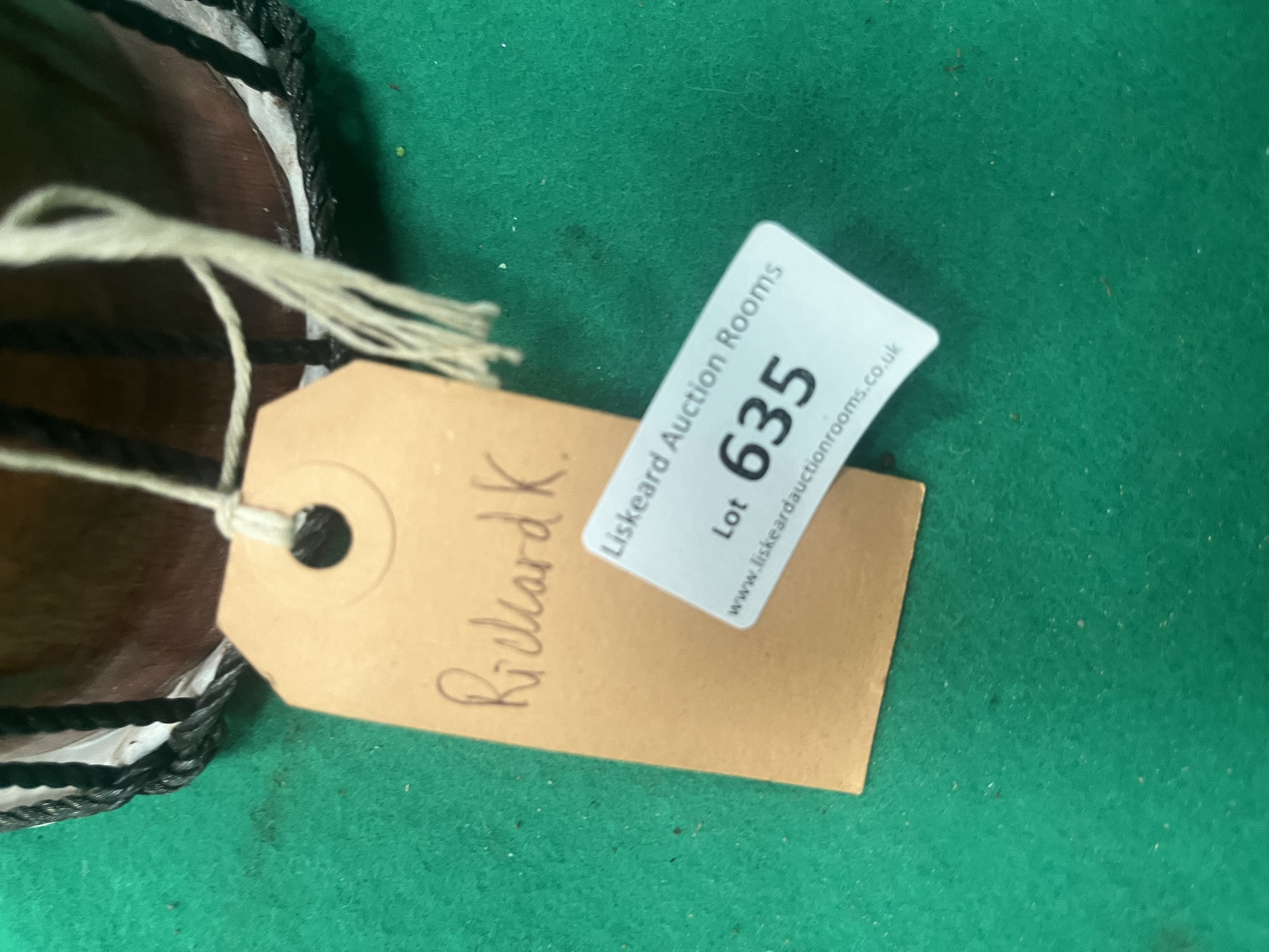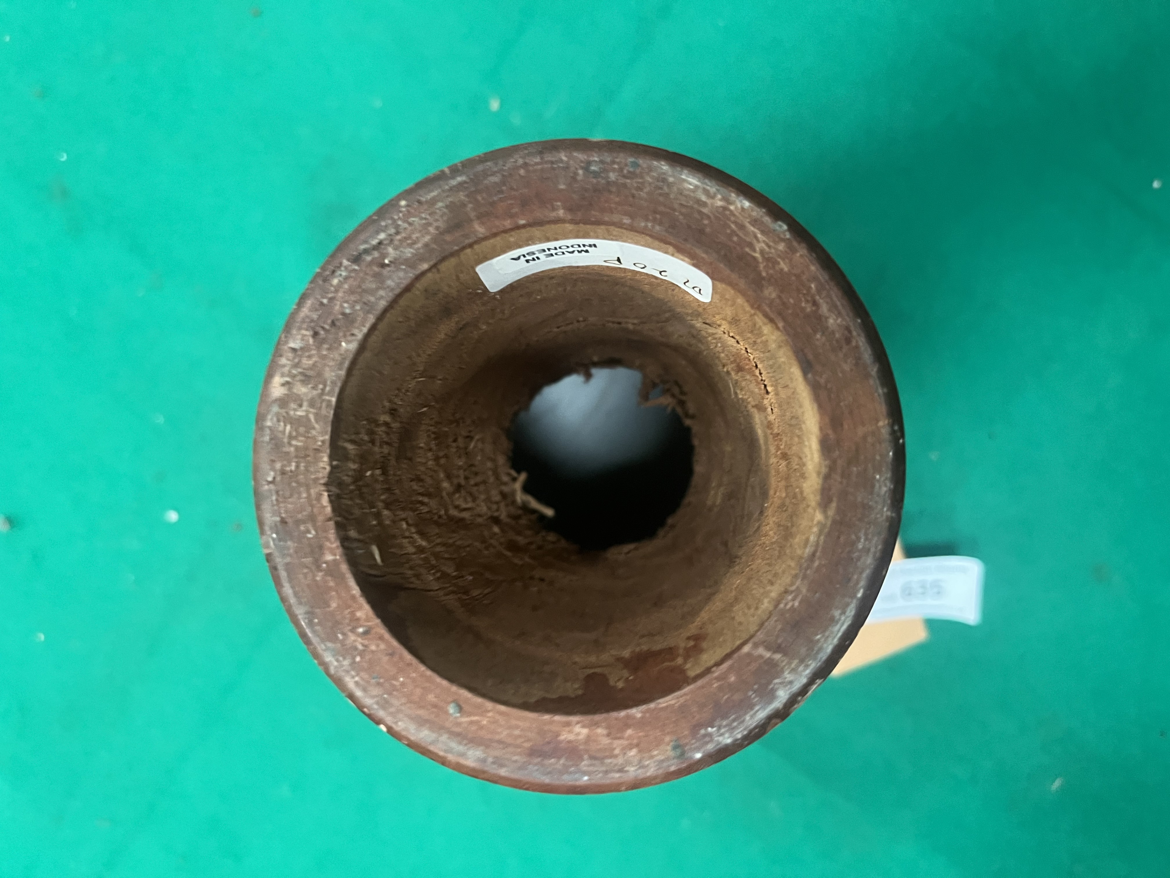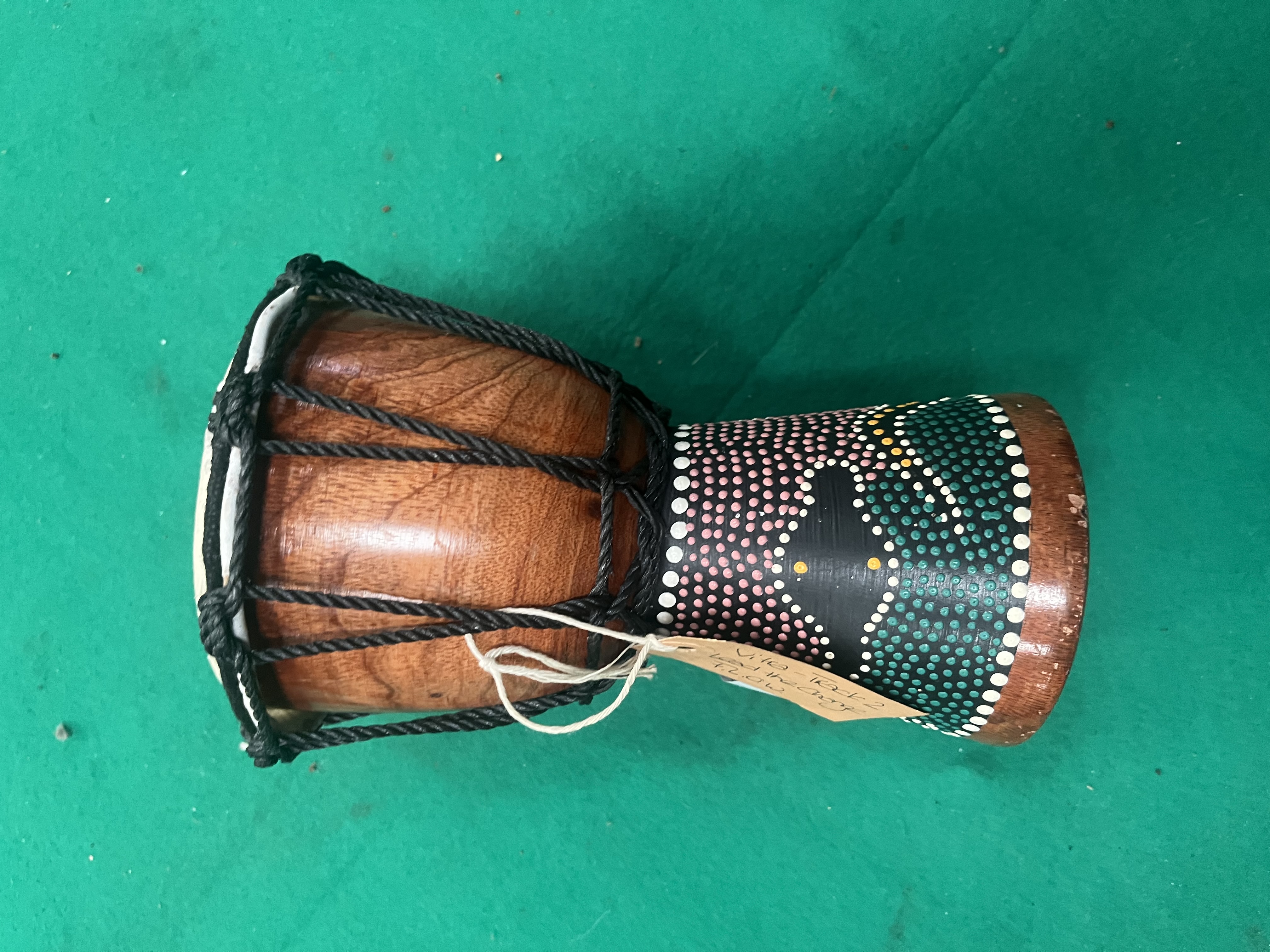 A miniature djembe drum of goblet form, manufactured in Indonesia. The body is hand-carved from wood, featuring a polished natural grain finish to the upper section and a black-painted base decorated with traditional dot-style motifs in shades of pink, white, green, and yellow. The drum head is constructed from natural animal skin, secured and tuned by a black synthetic rope tension system with knotted decorative loops. The interior of the base bears a white adhesive label printed with MADE IN INDONESIA and handwritten alphanumeric characters. Attached to the rope are various paper tags, including one for Liskeard Auction Rooms Lot 635, a handwritten tag for Richard K., and an event tag for Vita Track / Lead the Way / FLOW Camp.