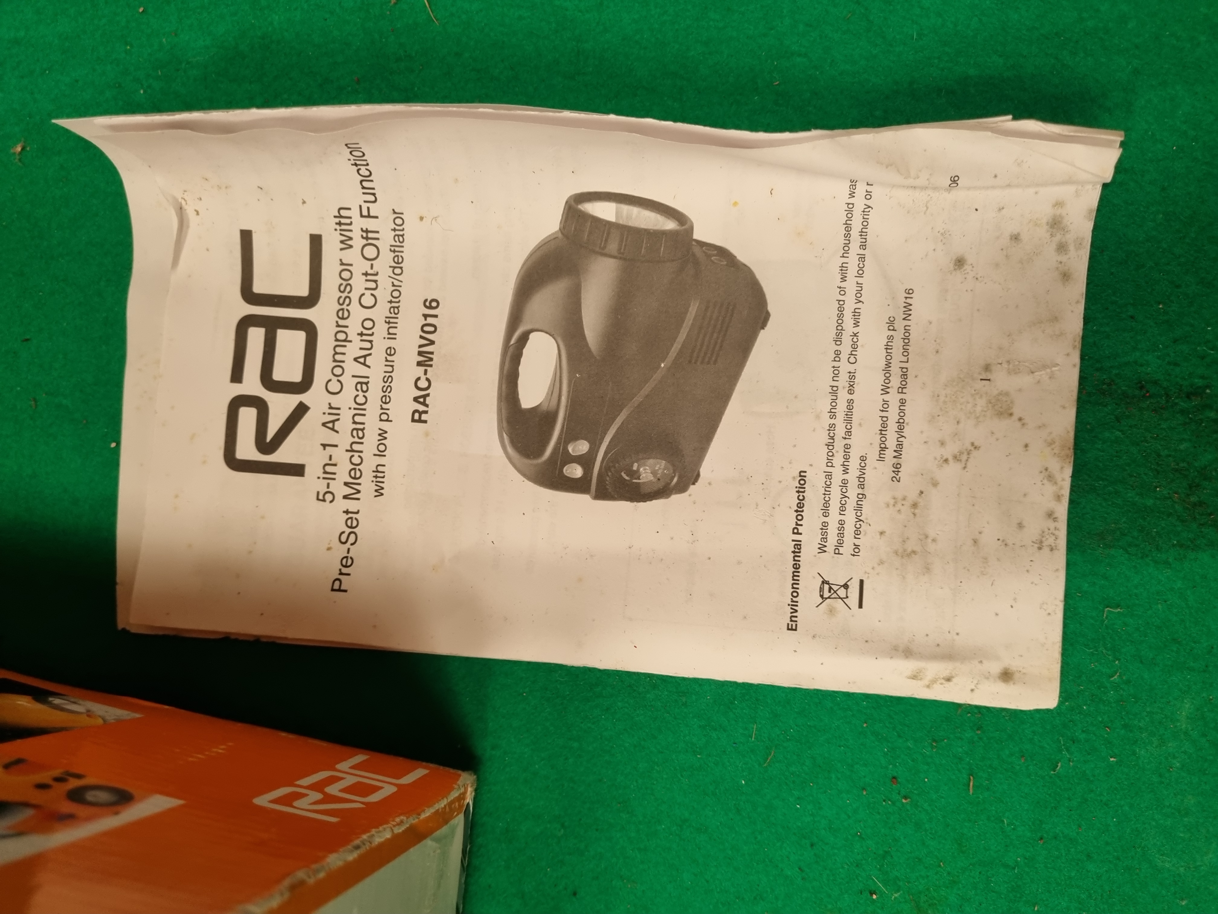 An RAC-branded model RAC-MV016 portable 5-in-1 air compressor. The unit is constructed with a moulded orange plastic housing and features an integrated carry handle. It is designed to be powered by a 12V DC vehicle accessory socket. Functional features include a pre-set mechanical auto cut-off system with an integrated pressure gauge, an onboard work light, and a low-pressure inflator/deflator function for items such as air mattresses or inflatable toys. The control panel includes two push-button switches for air and light operations. The product label specifies a maximum pressure of 100 PSI and bears the serial number 0808. The unit was imported for Woolworths plc and includes a UK contact address in Surrey, KT9 1EU.