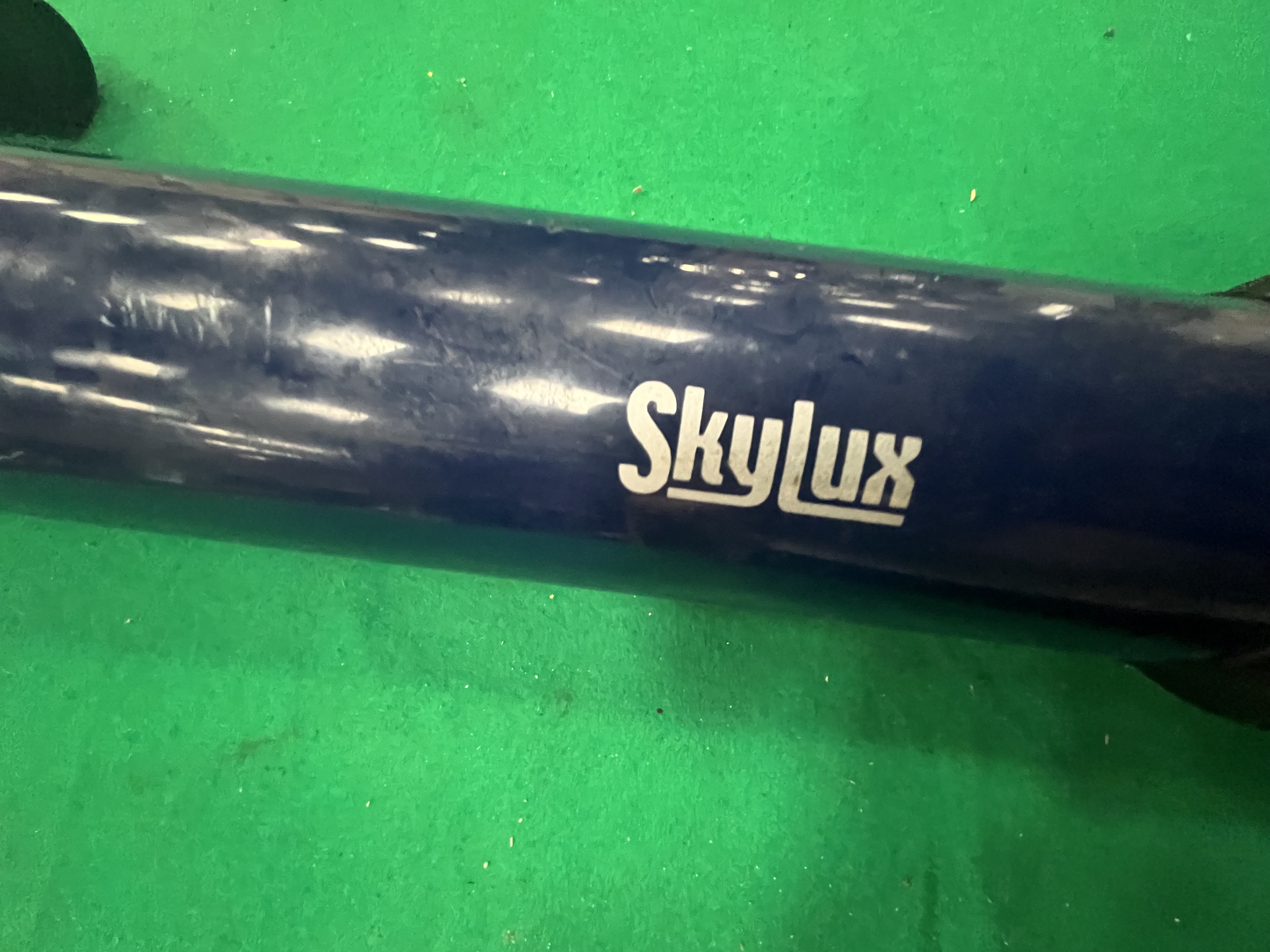 A SkyLux refractor telescope featuring a blue-finished metal main tube. The assembly is fitted with a mounted finder scope, a diagonal mirror, and a single brass-coloured eyepiece. A manufacturer label on the focuser assembly specifies an aperture diameter of 70mm and a focal length of 700mm. The SkyLux branding is present on the side of the tube. This lot consists of the optical tube assembly as shown and does not include a tripod or additional accessories.