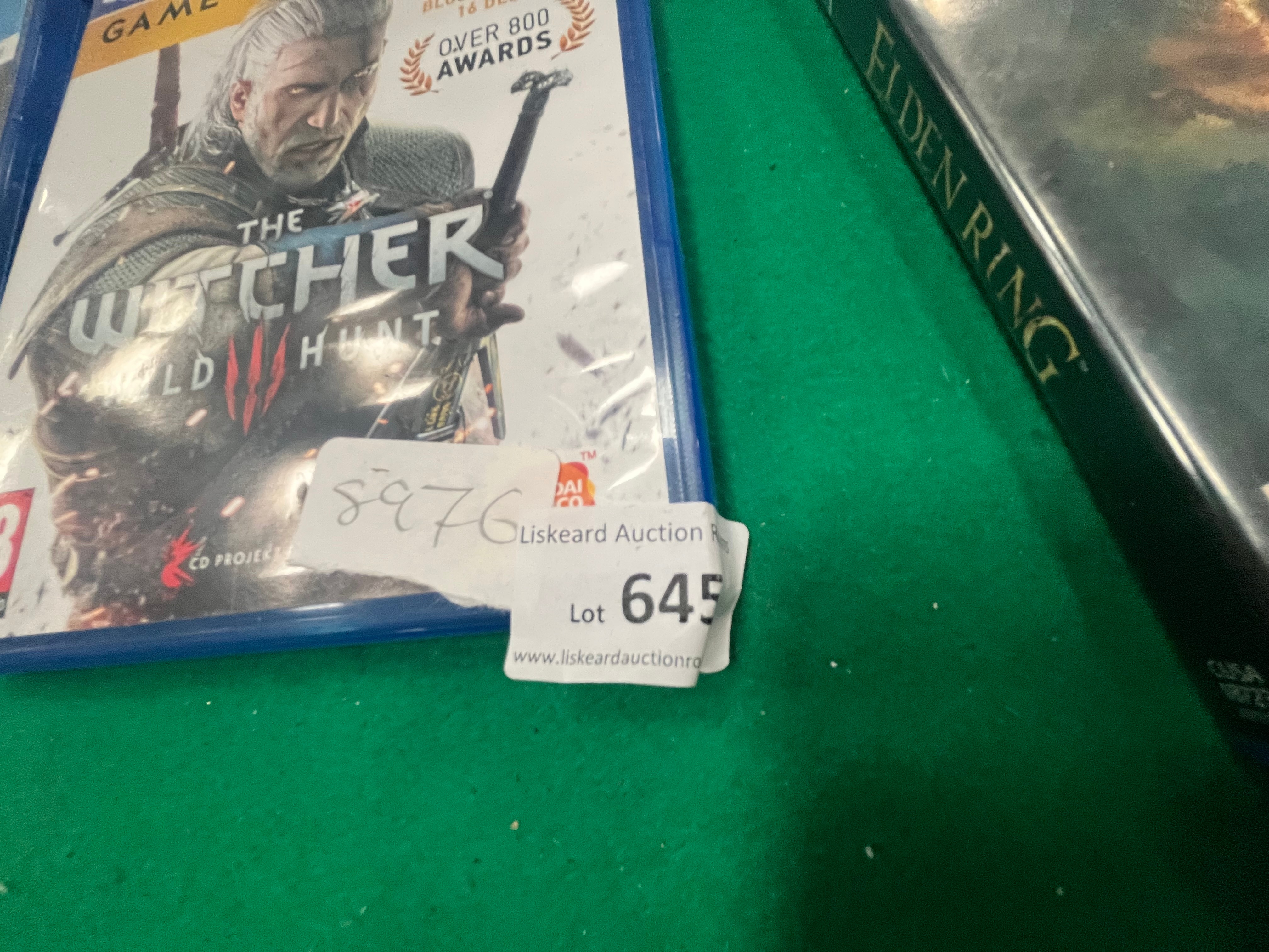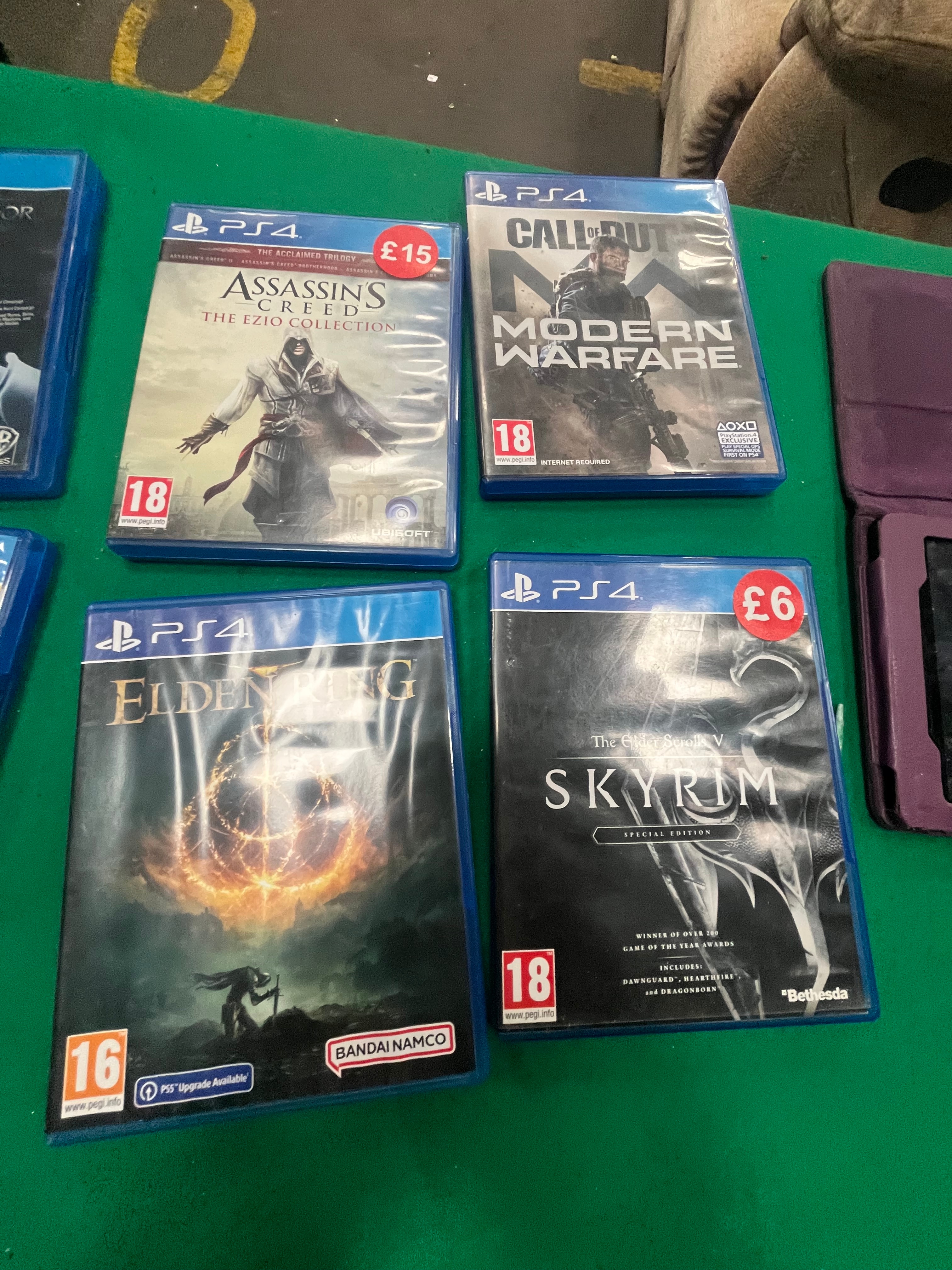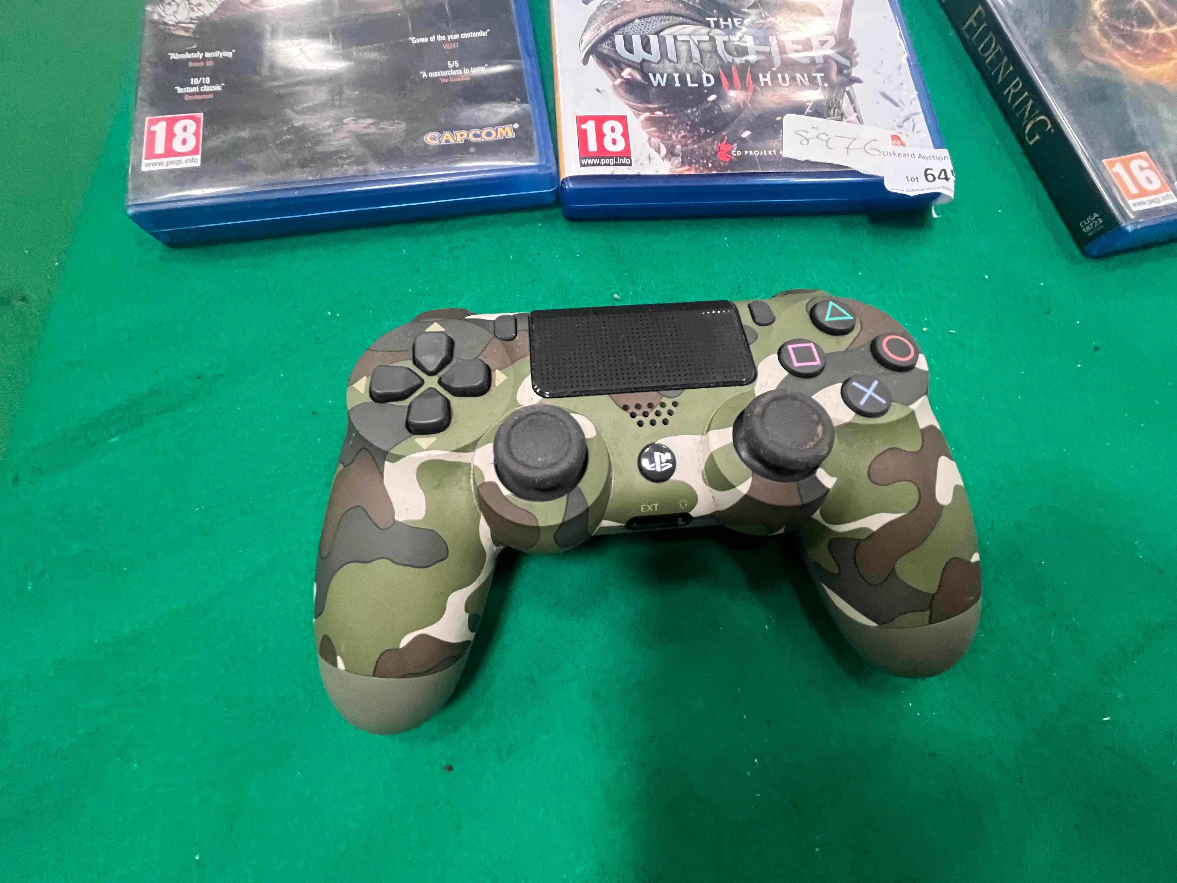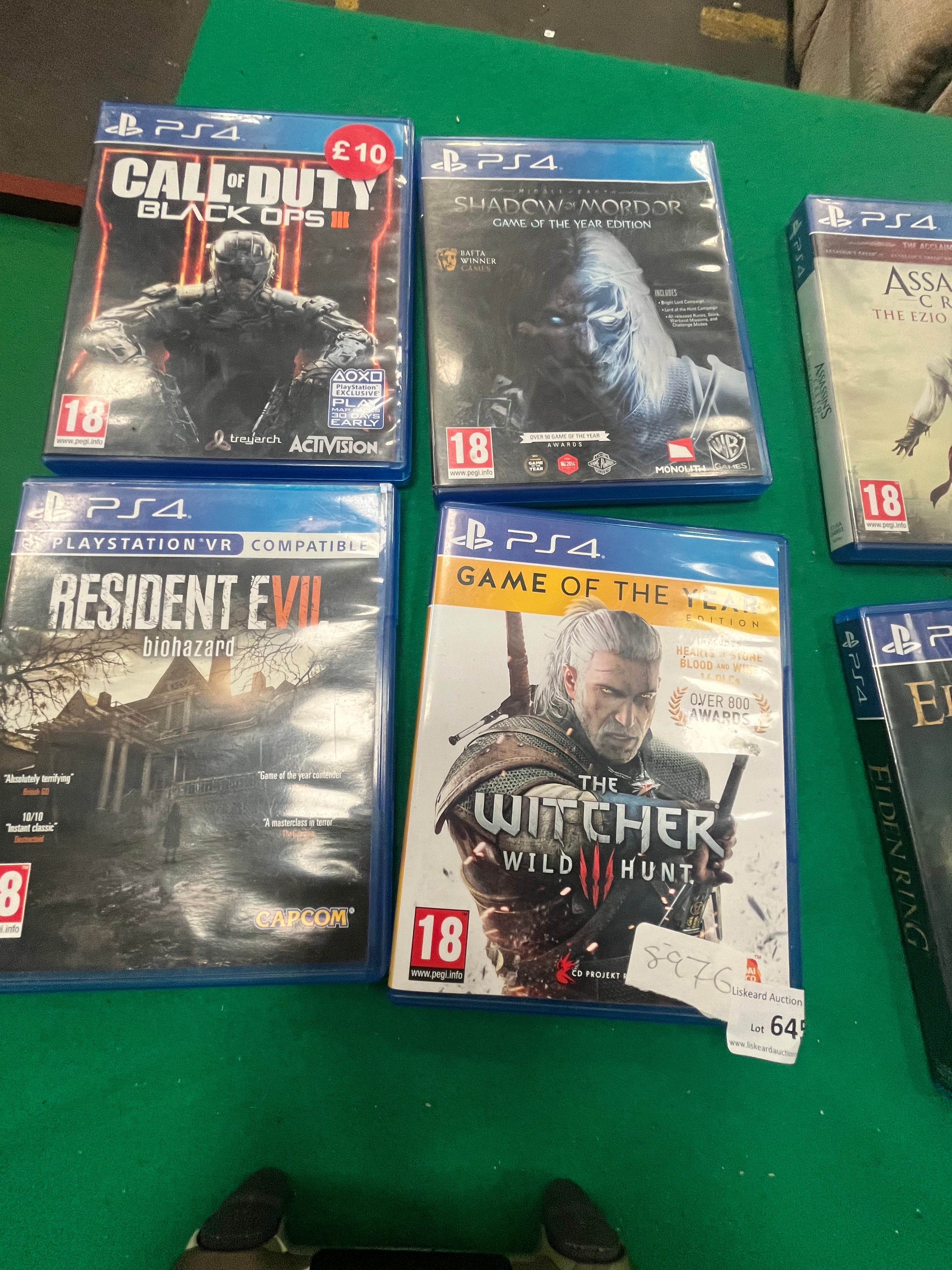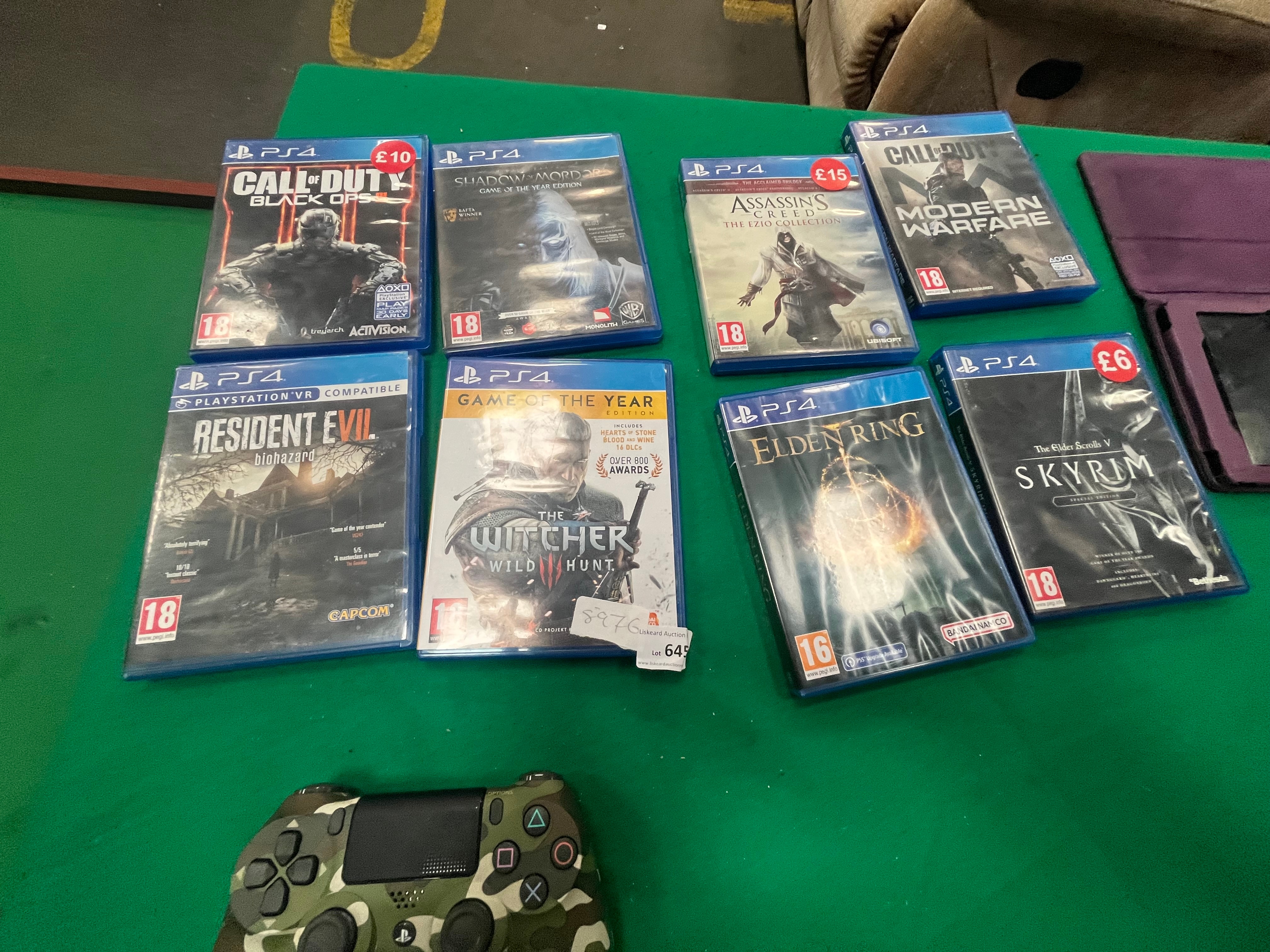 An assortment of eight PlayStation 4 video games and a Sony DualShock 4 wireless controller. The games included are Call of Duty: Black Ops III, Middle-earth: Shadow of Mordor Game of the Year Edition, Assassin’s Creed: The Ezio Collection, Call of Duty: Modern Warfare, Resident Evil 7: Biohazard (PlayStation VR compatible), The Witcher 3: Wild Hunt Game of the Year Edition, Elden Ring, and The Elder Scrolls V: Skyrim Special Edition. These titles are produced by various publishers including Activision, Warner Bros. Interactive Entertainment, Ubisoft, Capcom, CD Projekt Red, Bandai Namco Entertainment, and Bethesda Softworks. All cases feature European PEGI age ratings of 16 or 18. The official Sony DualShock 4 wireless controller is finished in a multi-tone green and brown camouflage pattern, featuring the standard button layout, central touchpad, and EXT port. Several cases retain retail price stickers in British Pounds and one case bears an auction lot label from Liskeard Auction Rooms for Lot 645.