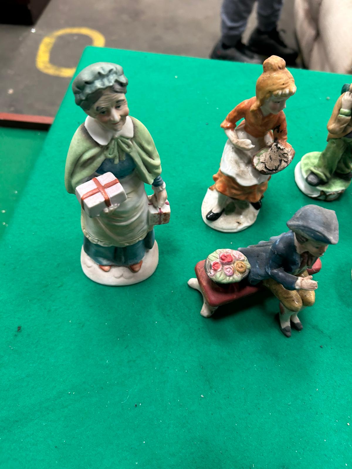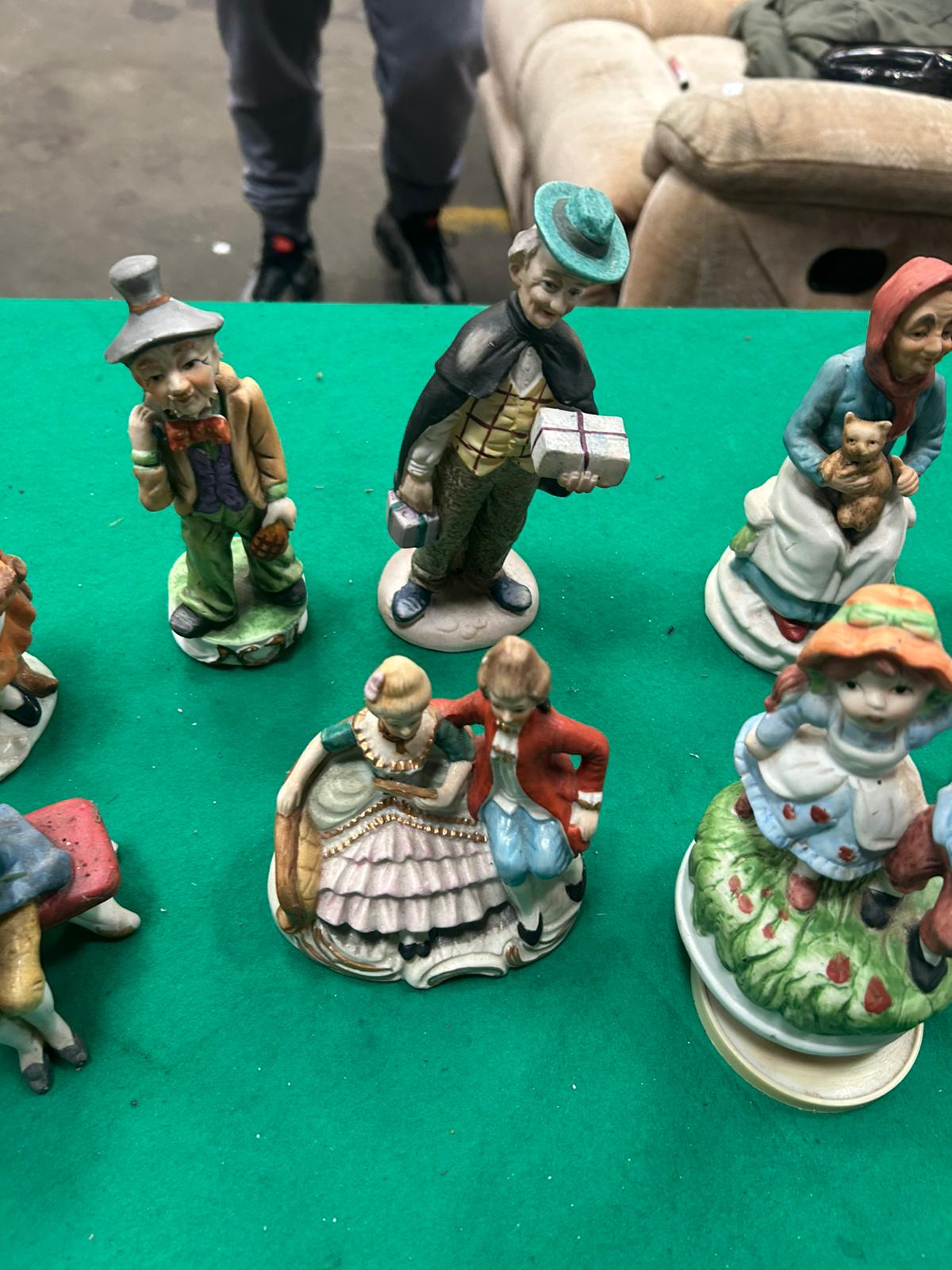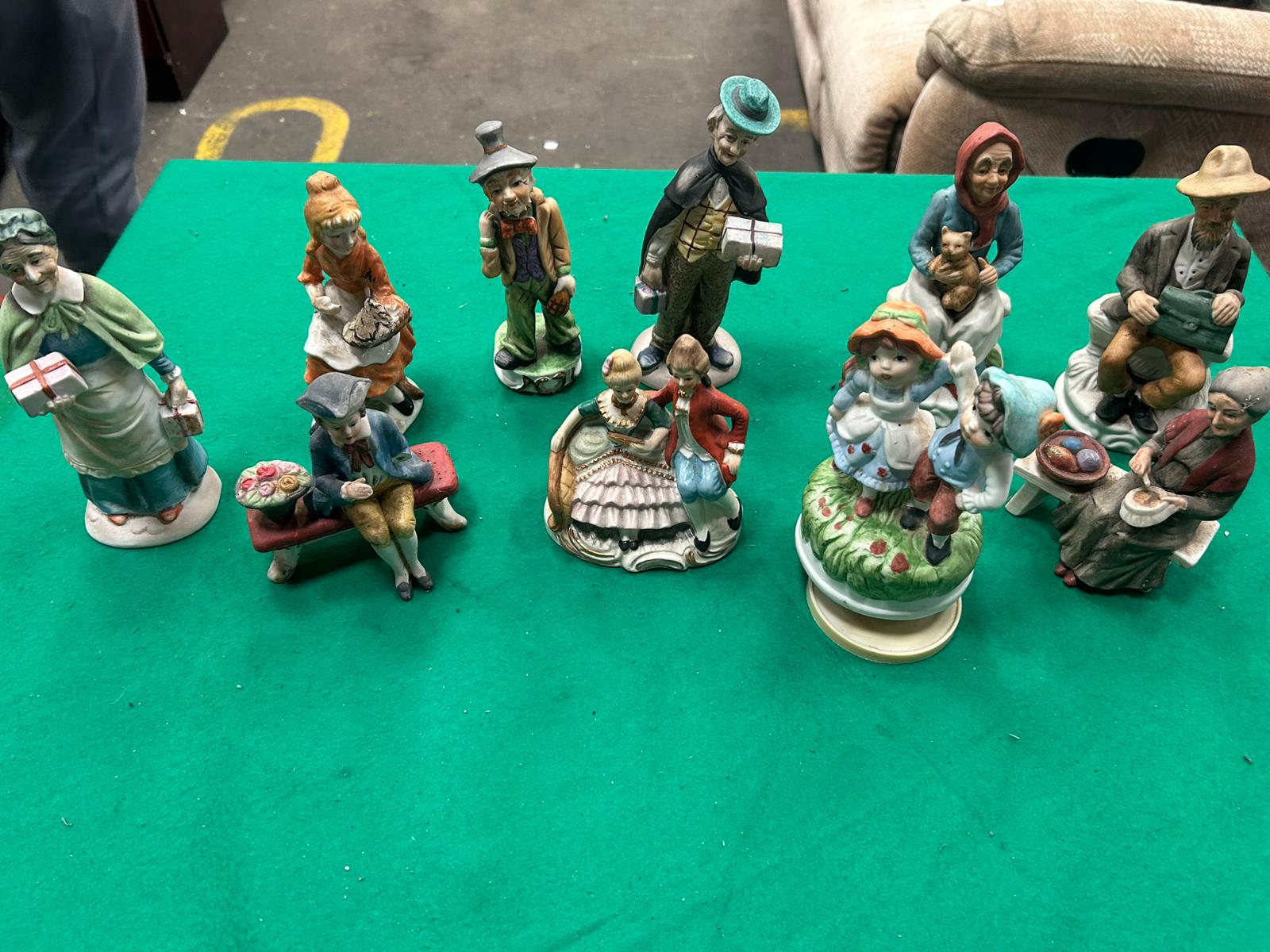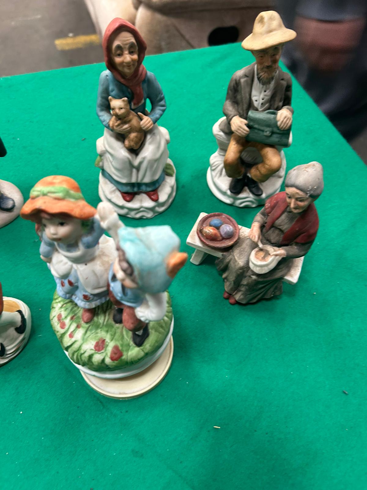 A collection of decorative bisque porcelain figurines and a musical figure, primarily featuring character studies in the style of Norman Rockwell. The assortment includes various elderly figures such as a woman holding gift parcels, a man in a top hat, a seated gentleman with a briefcase, and a woman cradling a cat. Other pieces within the group include a young woman with a basket, a boy seated on a bench next to flowers, and a courting couple in 18th-century style attire. The lot also features a circular revolving musical figurine depicting a young boy and girl on a grassy base with a plastic winding mechanism. Each piece is crafted with a matte finish and hand-painted in a muted colour palette. No manufacturer marks or factory stamps are visible on the bases.