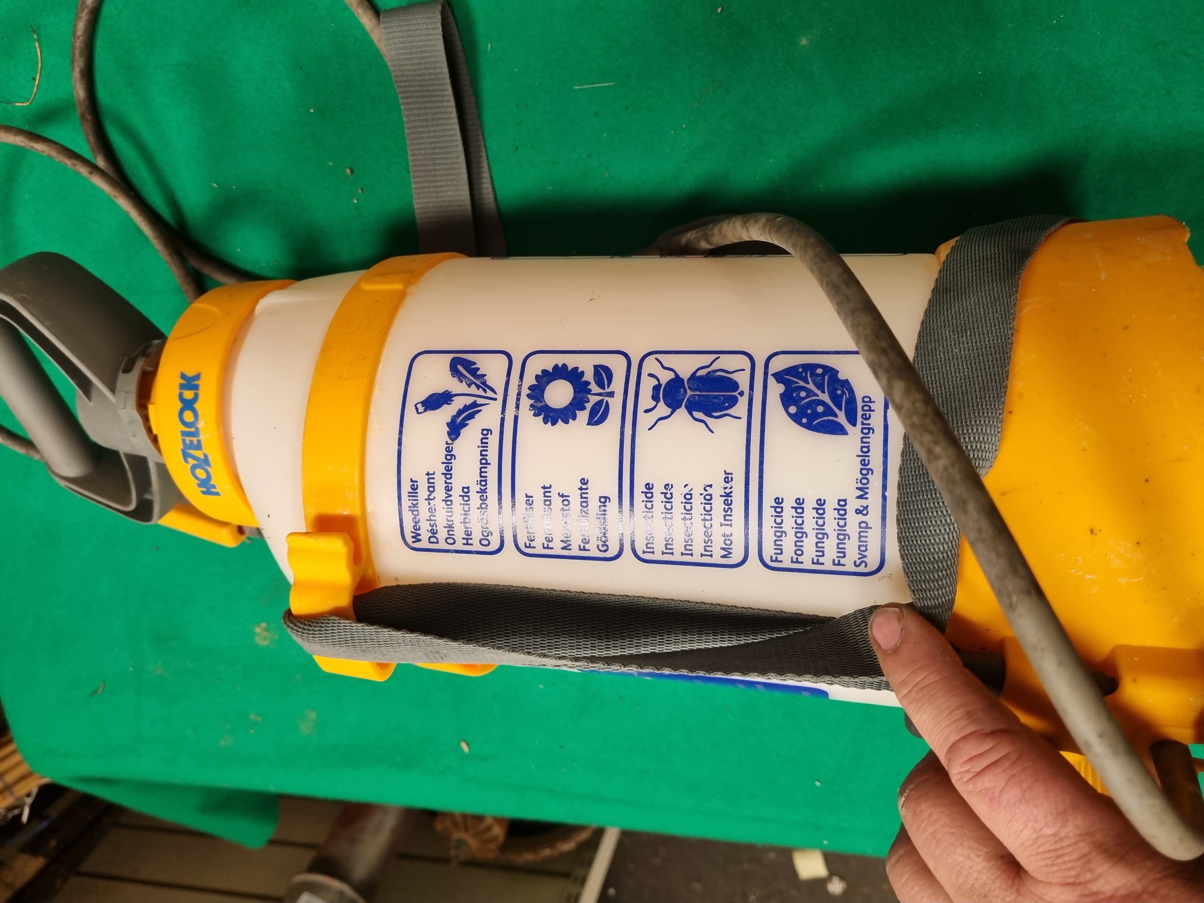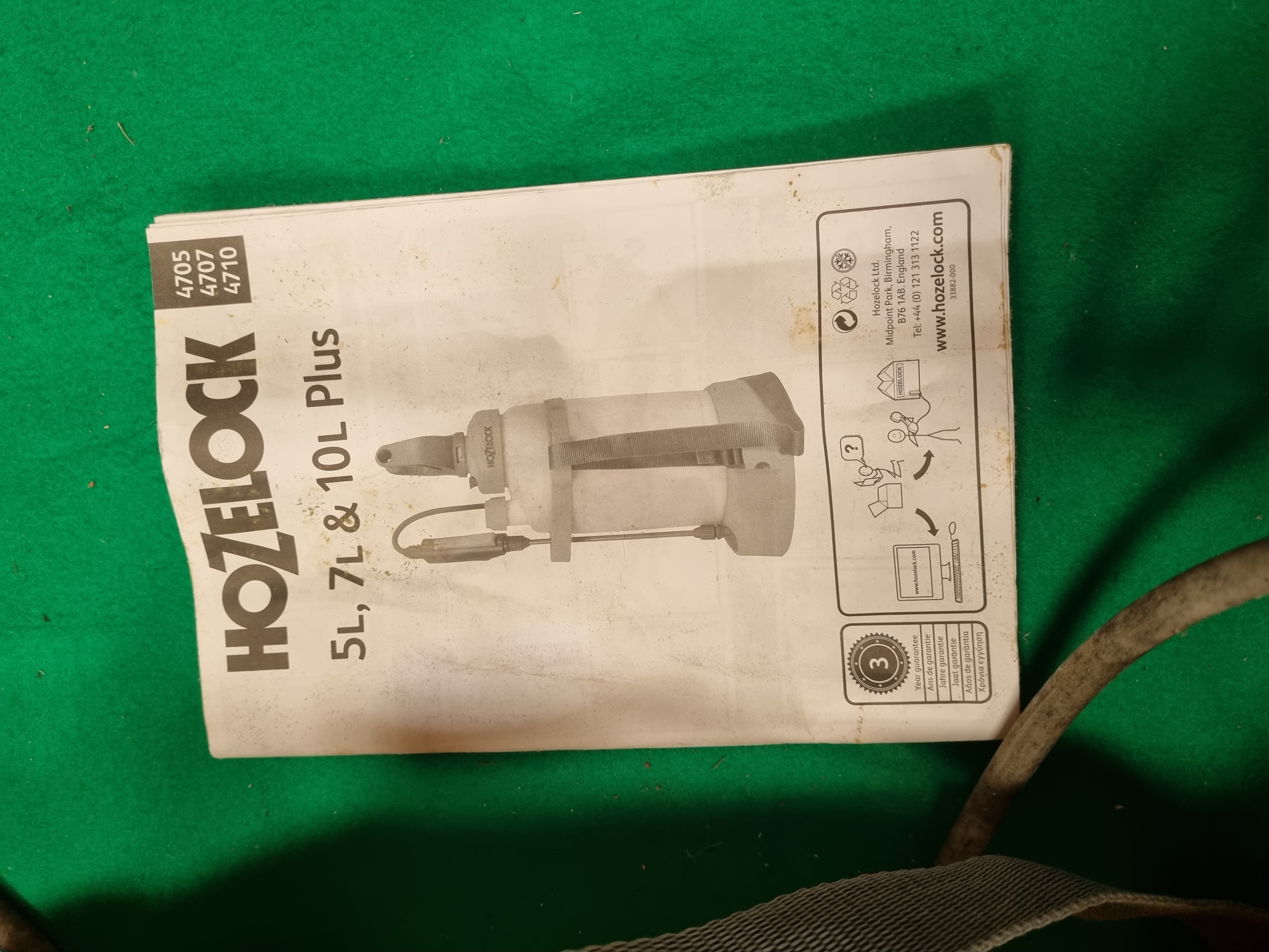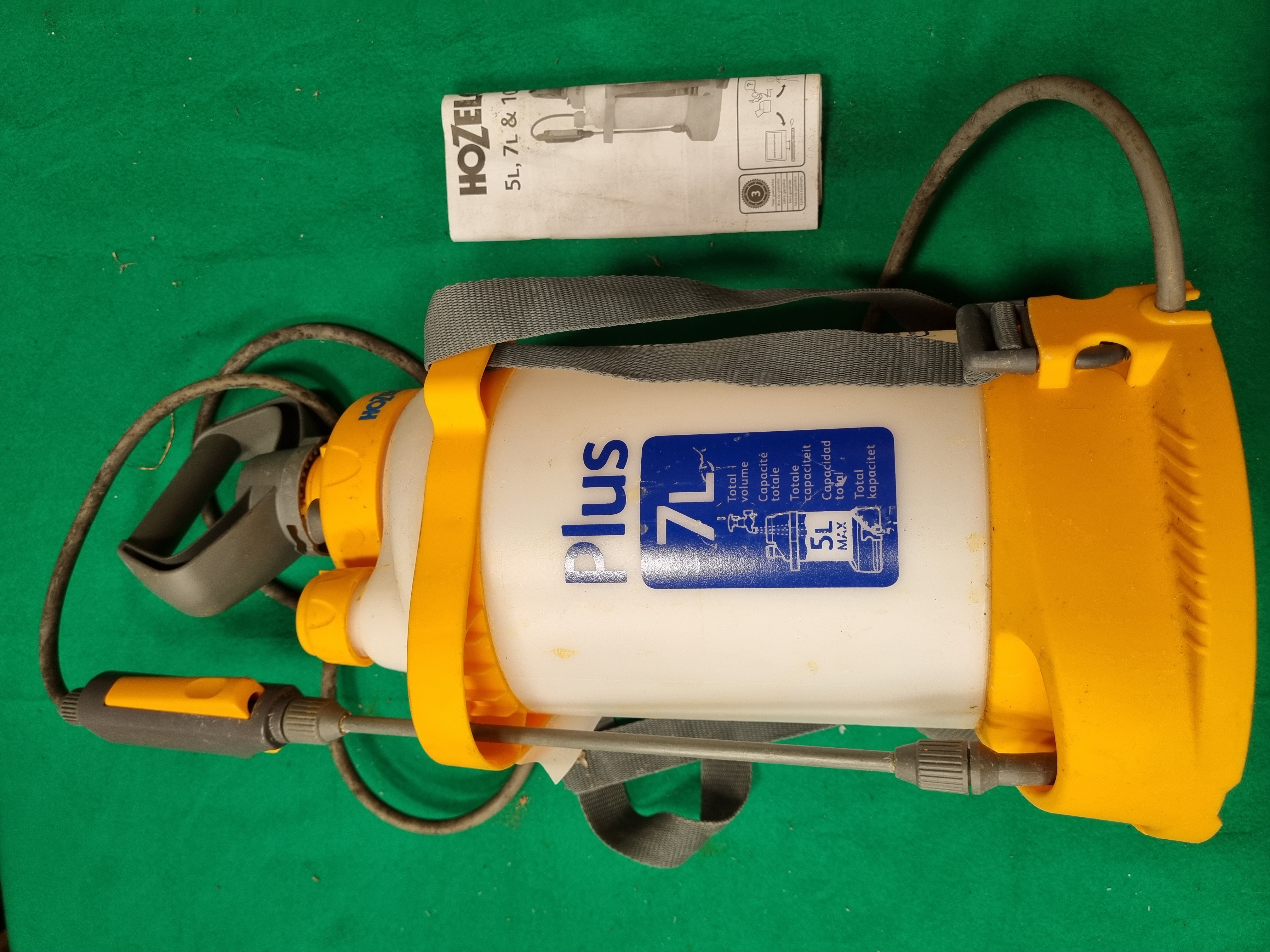 A Hozelock Plus 4707 pressurised garden sprayer. The unit features a translucent plastic tank with a total capacity of 7 litres and a maximum filling level of 5 litres for pressurisation. It is equipped with an integrated manual piston pump operated by a large grey handle. The sprayer includes a flexible hose and a hand-held spray lance with a yellow trigger handle and an adjustable nozzle. The tank is marked with graduations and icons for weedkiller, fertiliser, insecticide, and fungicide application. An adjustable grey woven shoulder strap is attached to the yellow plastic housing. The lot includes the original instruction manual covering models 4705, 4707, and 4710.