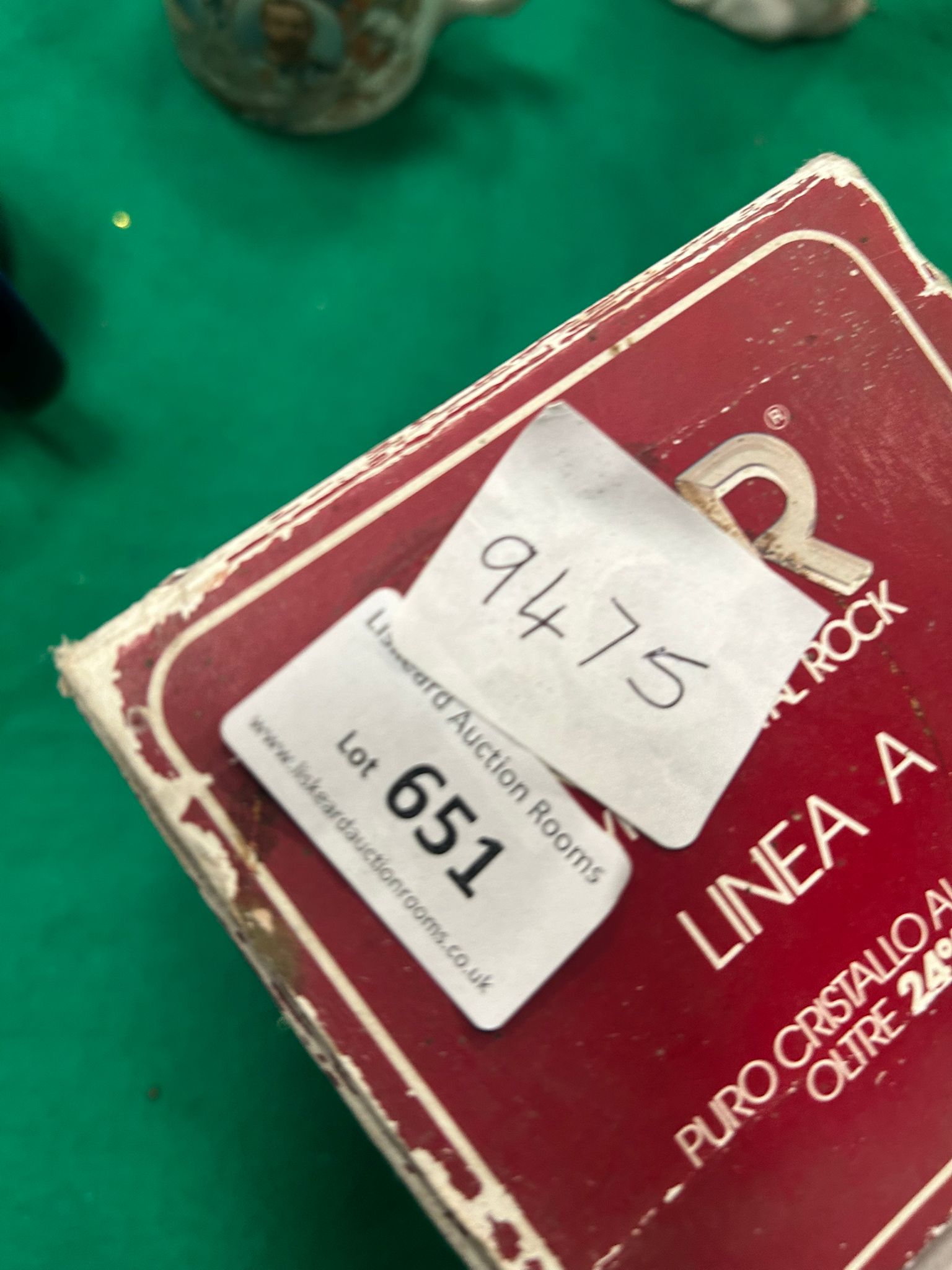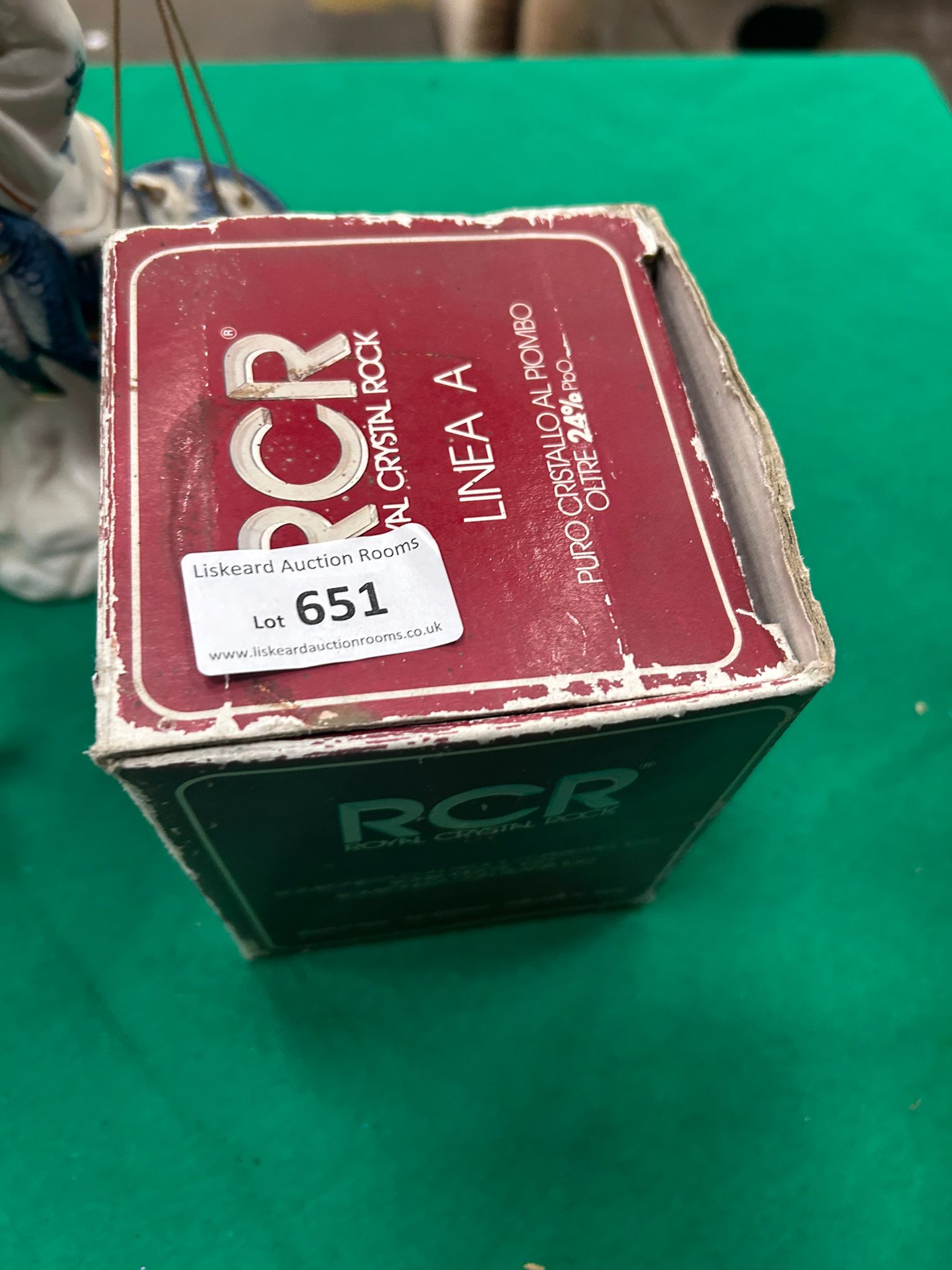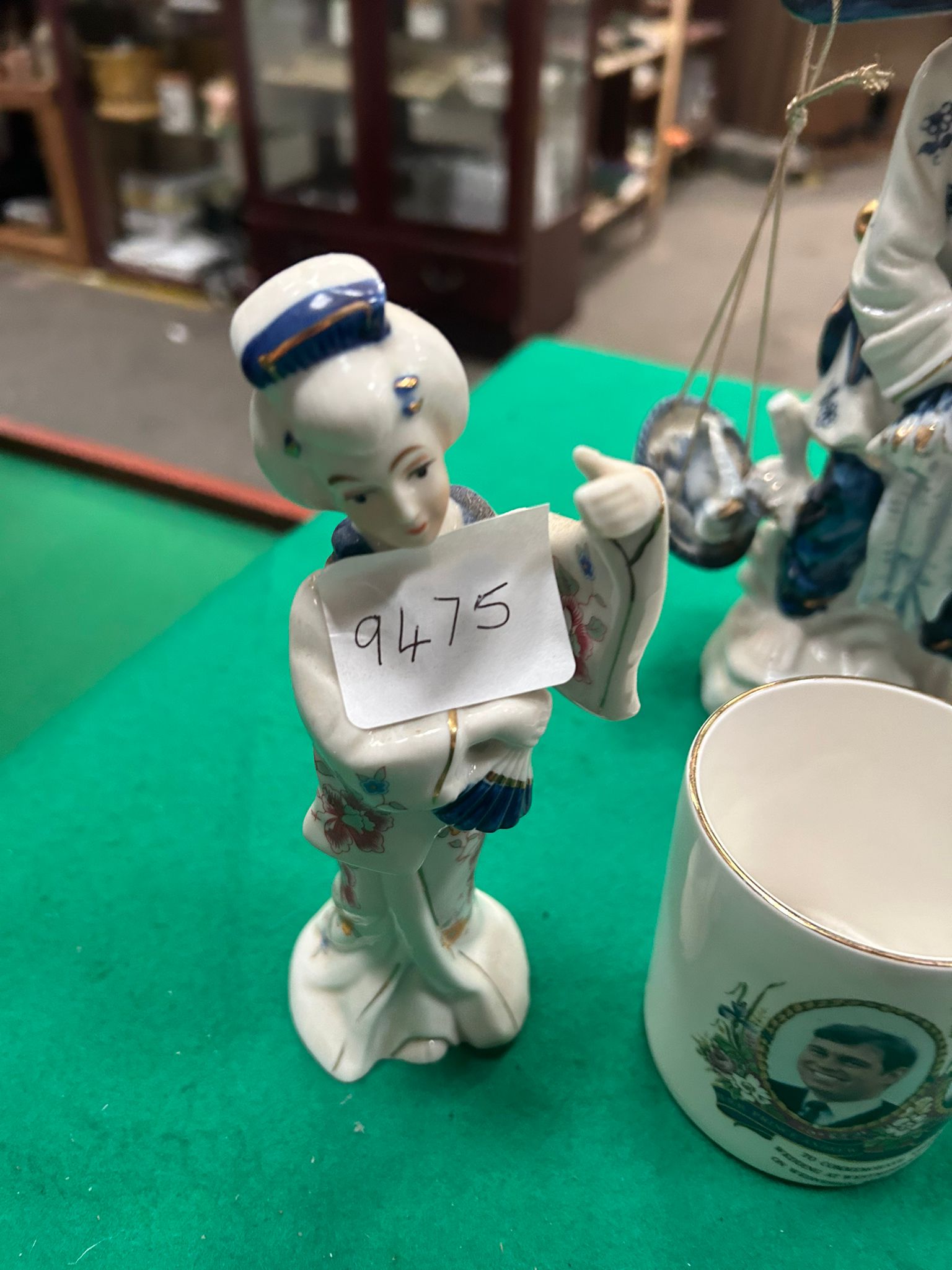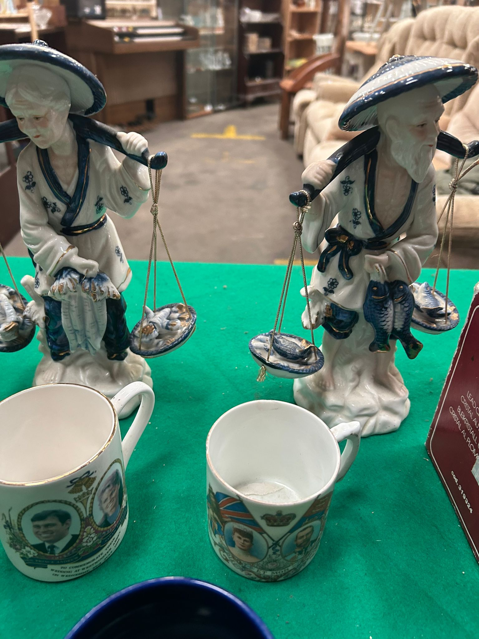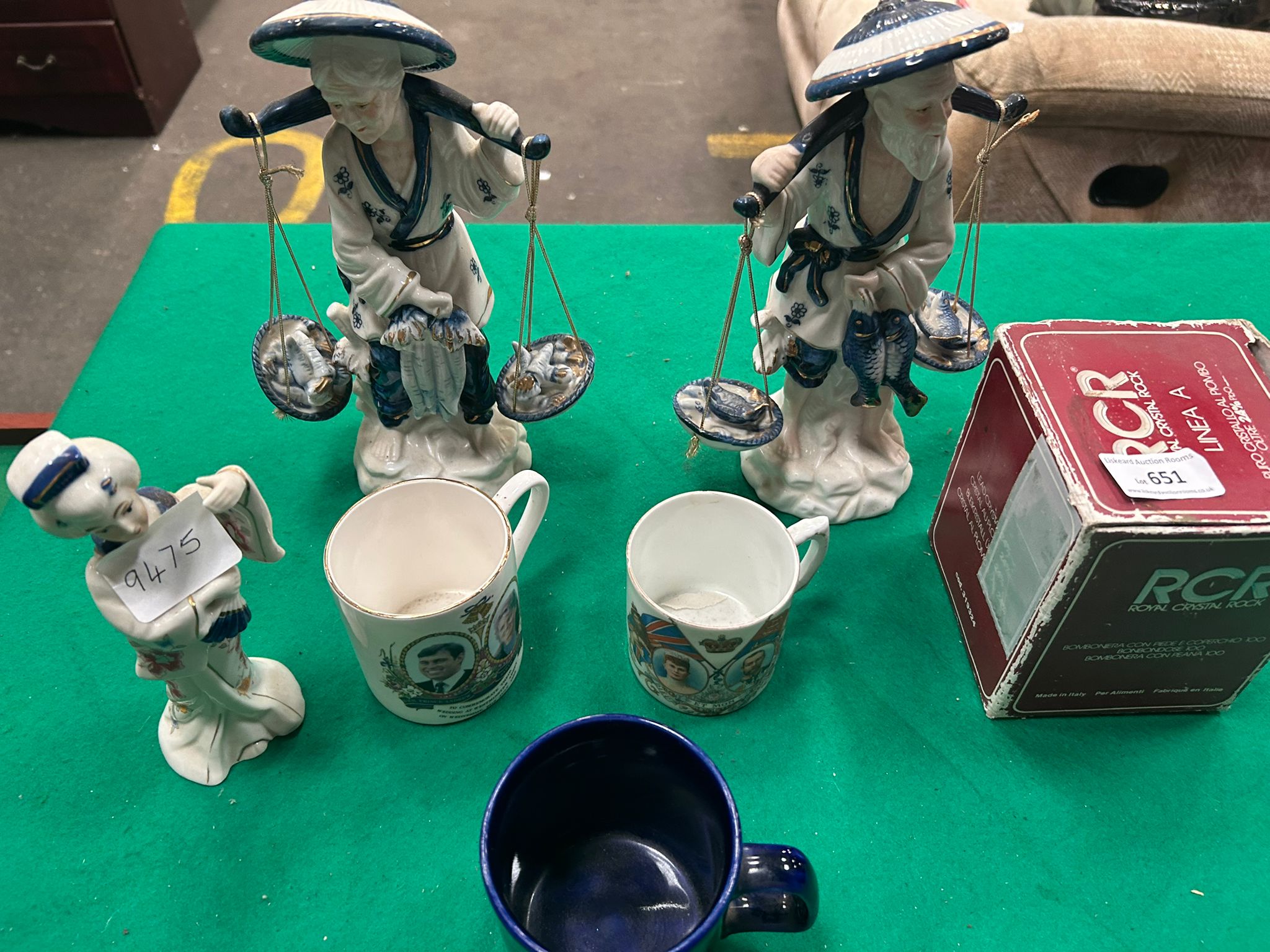 A collection of decorative household items and commemorative ceramics. The lot includes a pair of porcelain figurines by Uniart, decorated in a blue and white palette, depicting an East Asian man and woman in traditional dress carrying yokes with suspended baskets of fish. Also present is a smaller polychrome glazed porcelain figurine of a woman in a kimono holding a fan. The group includes three commemorative mugs: a white porcelain mug for the 1986 wedding of H.R.H. Prince Andrew and Miss Sarah Ferguson, a white porcelain mug with transfer-printed portraits of Queen Elizabeth II and Prince Philip, and a dark blue mug for the 1977 Silver Jubilee. The glassware comprises two pieces of 24% lead crystal by Royal Crystal Rock (RCR), Italy, from the Linea A series, featuring a shallow dish and a footed bowl with geometric diamond and fan-cut patterns, including an original red RCR box.