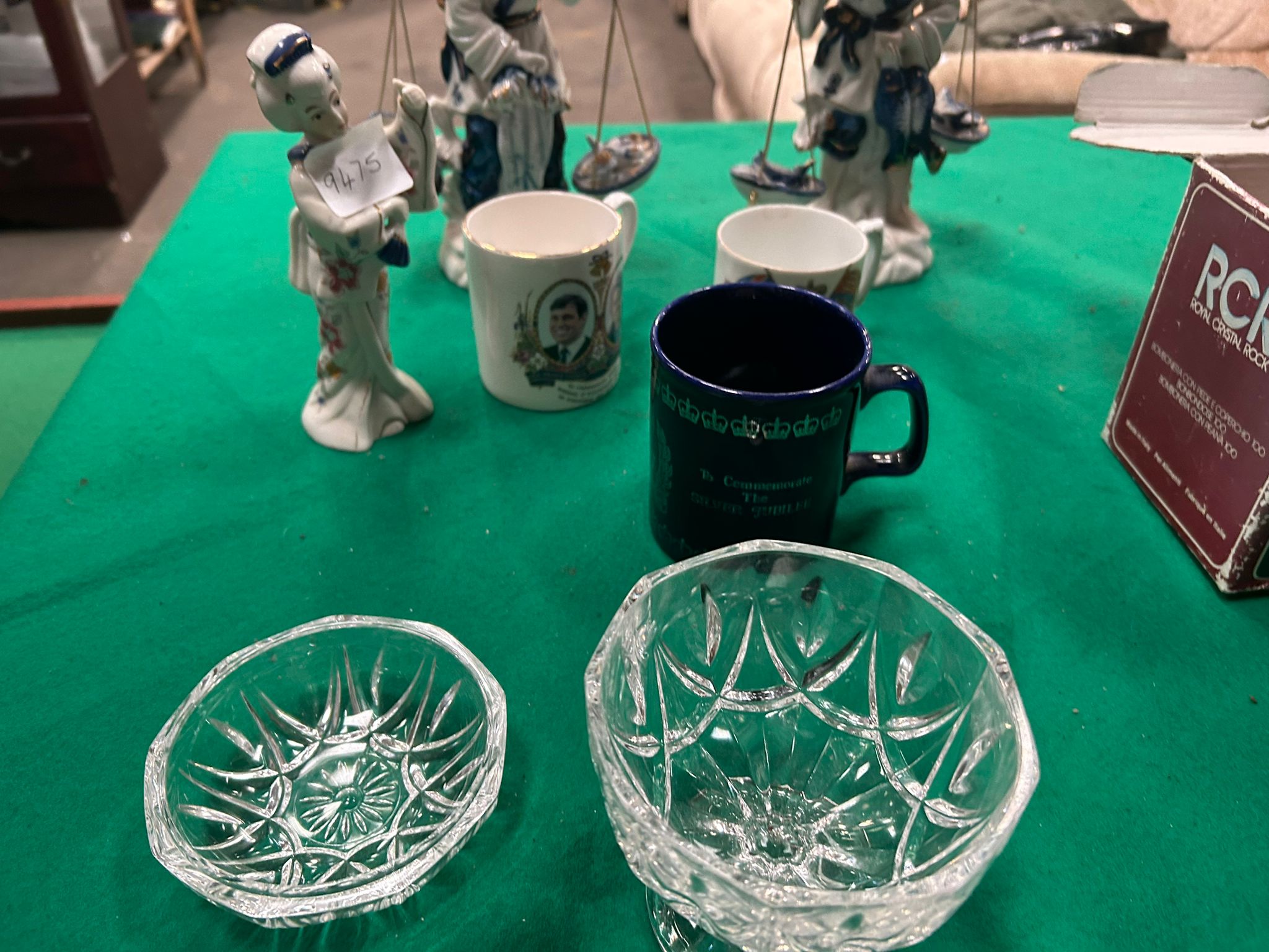 Lot 651: A Collection of Decorative Ceramic Figurines, Royal Commemorative Mugs, and Cut-Crystal Glassware