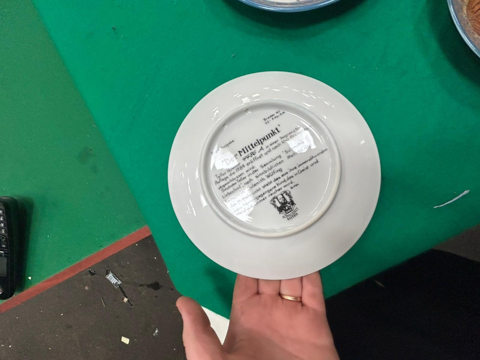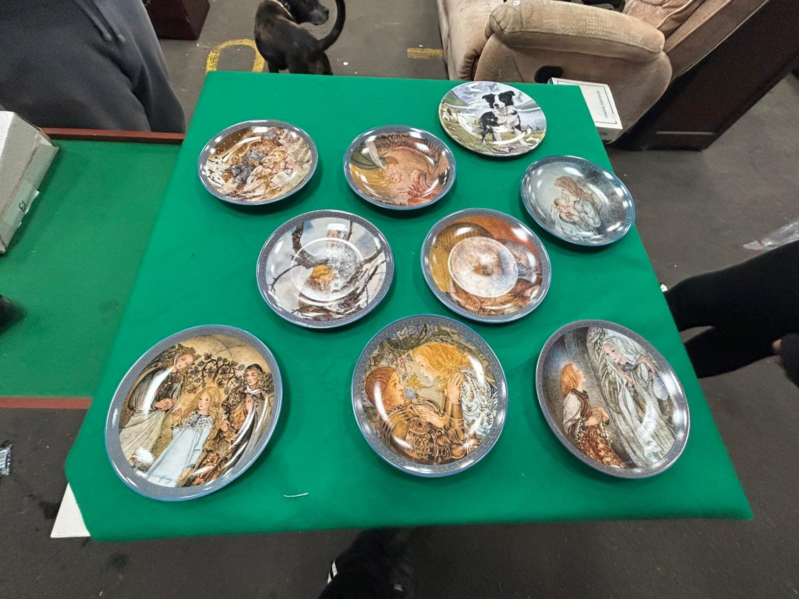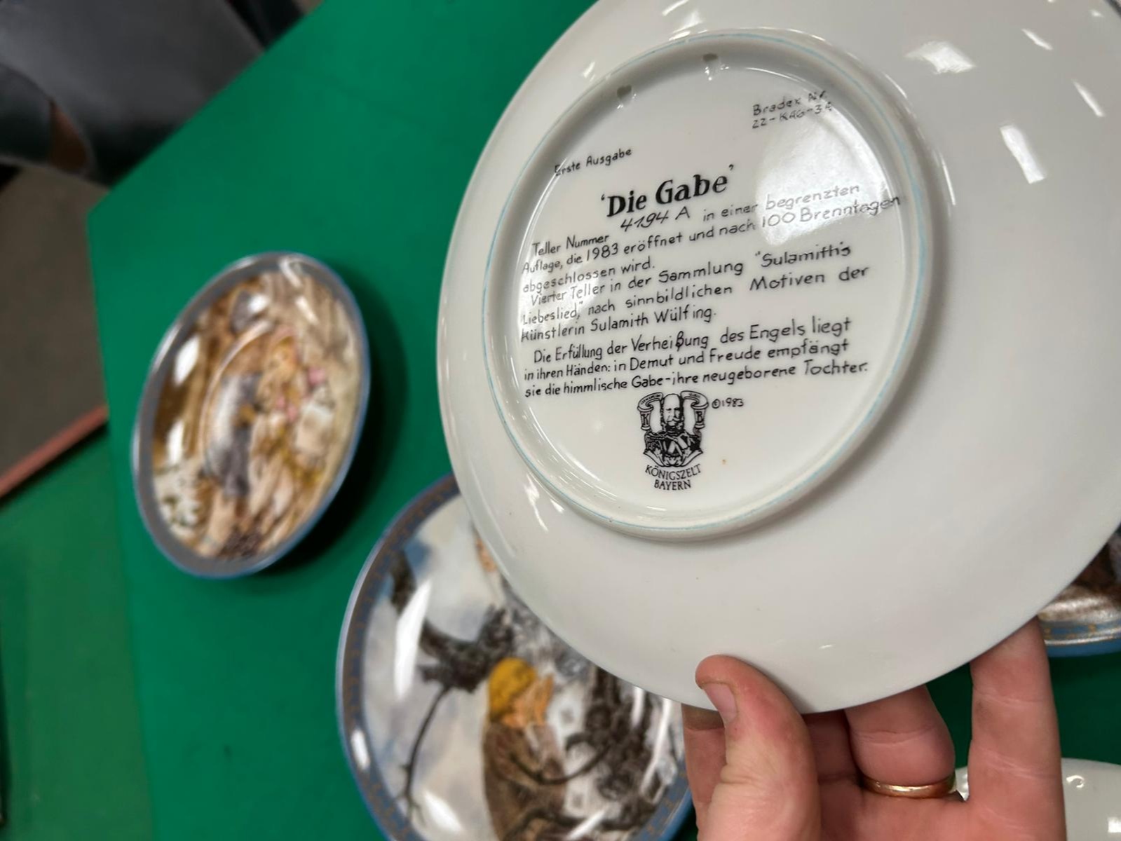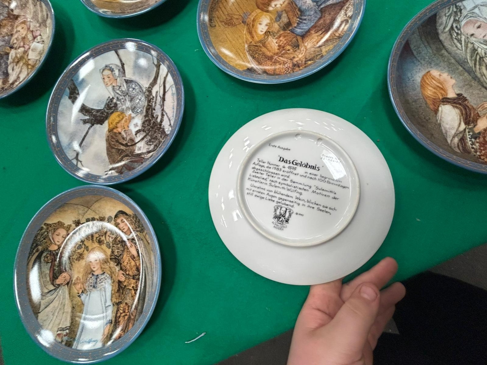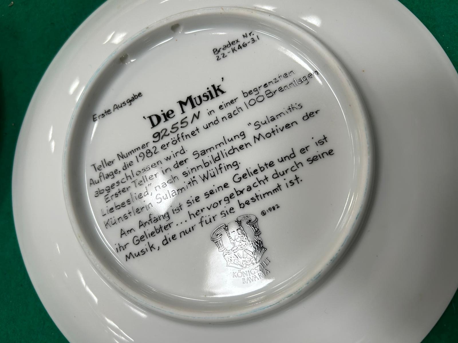 A collection of decorative porcelain collector plates, primarily from the series titled Sulamith’s Liebeslied (Sulamith’s Love Song) produced by the manufacturer Königszelt Bayern. The plates feature transfer-printed illustrations based on original artworks by the German artist Sulamith Wülfing, depicting ethereal and romantic scenes in soft, muted colours. Each Wülfing plate is finished with a decorative blue and gilt patterned border. The collection includes individual titles such as Die Musik, Das Gelöbnis, Die Gabe, and Der Mittelpunkt. One additional plate in the group features a naturalistic depiction of two Border Collies in a landscape setting. The reverse of the Sulamith Wülfing plates carries the Königszelt Bayern manufacturer’s mark, the series title, individual plate titles in German, and the designation Erste Ausgabe (First Issue). They are inscribed with individual limited edition numbers and Bradex identification numbers, including 22-K46-3.1, 22-K46-3.2, 22-K46-3.4, and 22-K46-3.6. Copyright dates ranging from 1982 to 1984 are present on the reverse.