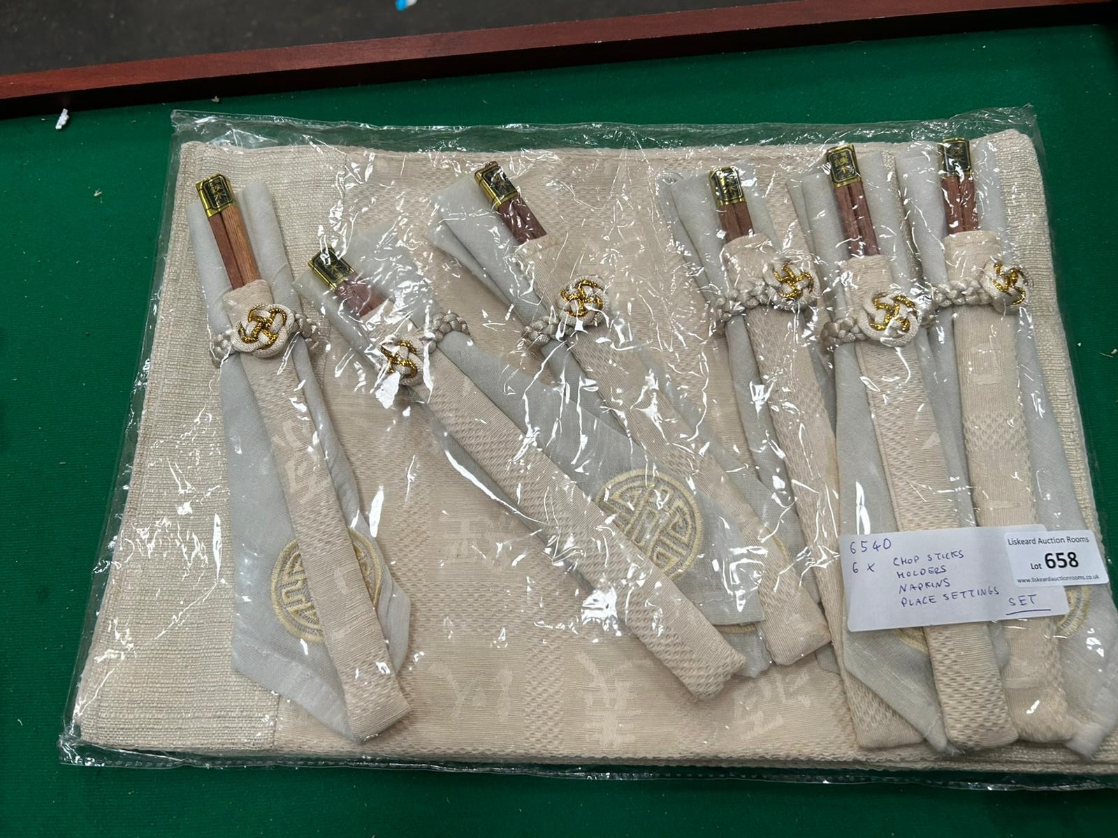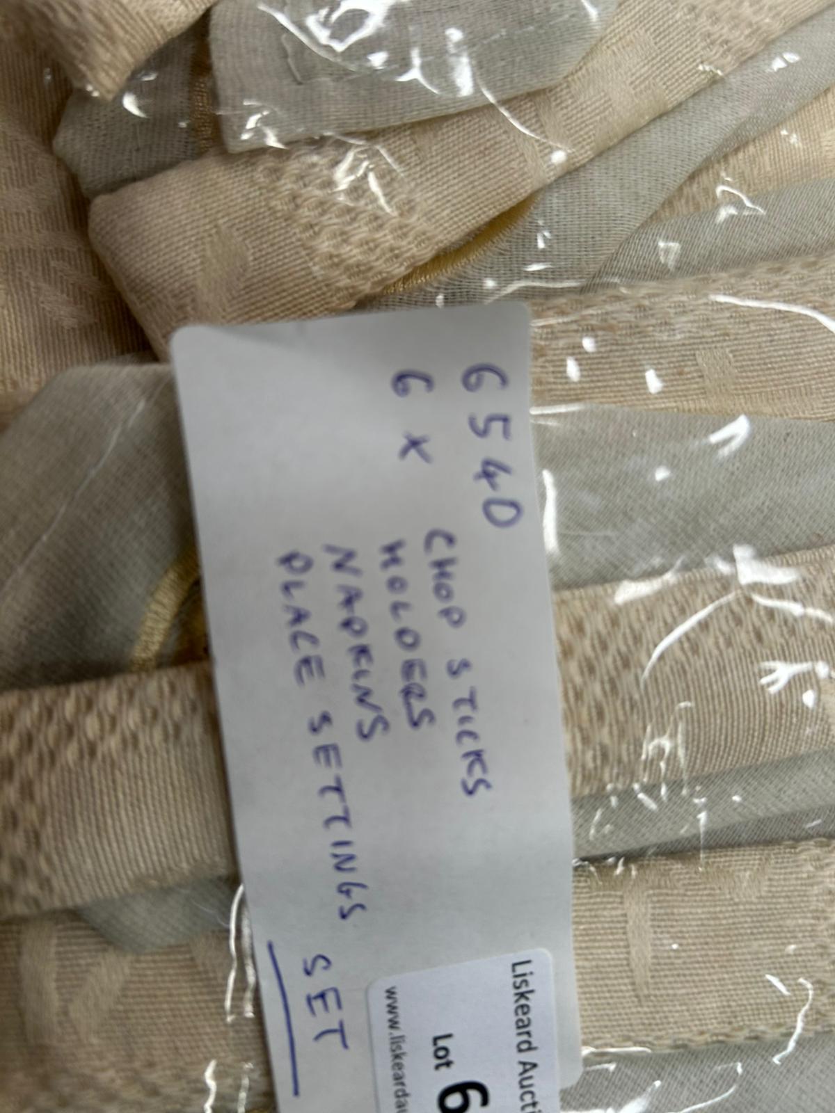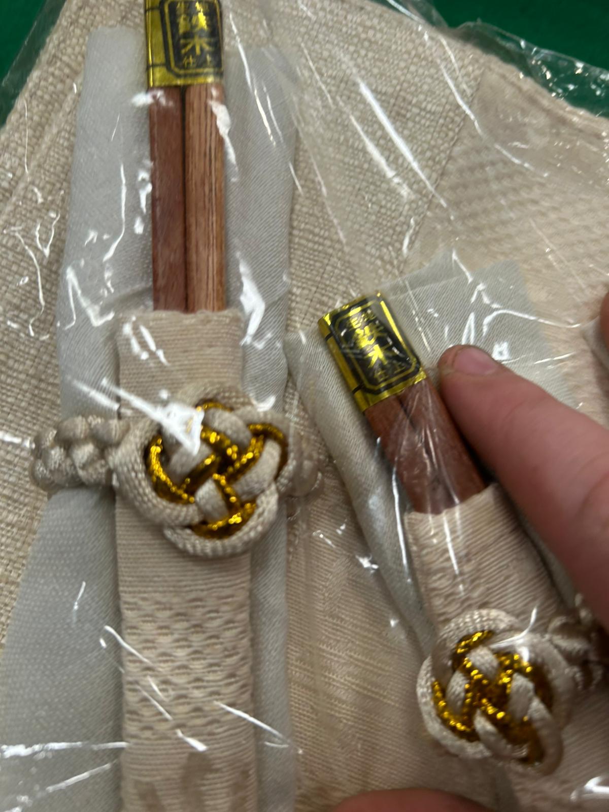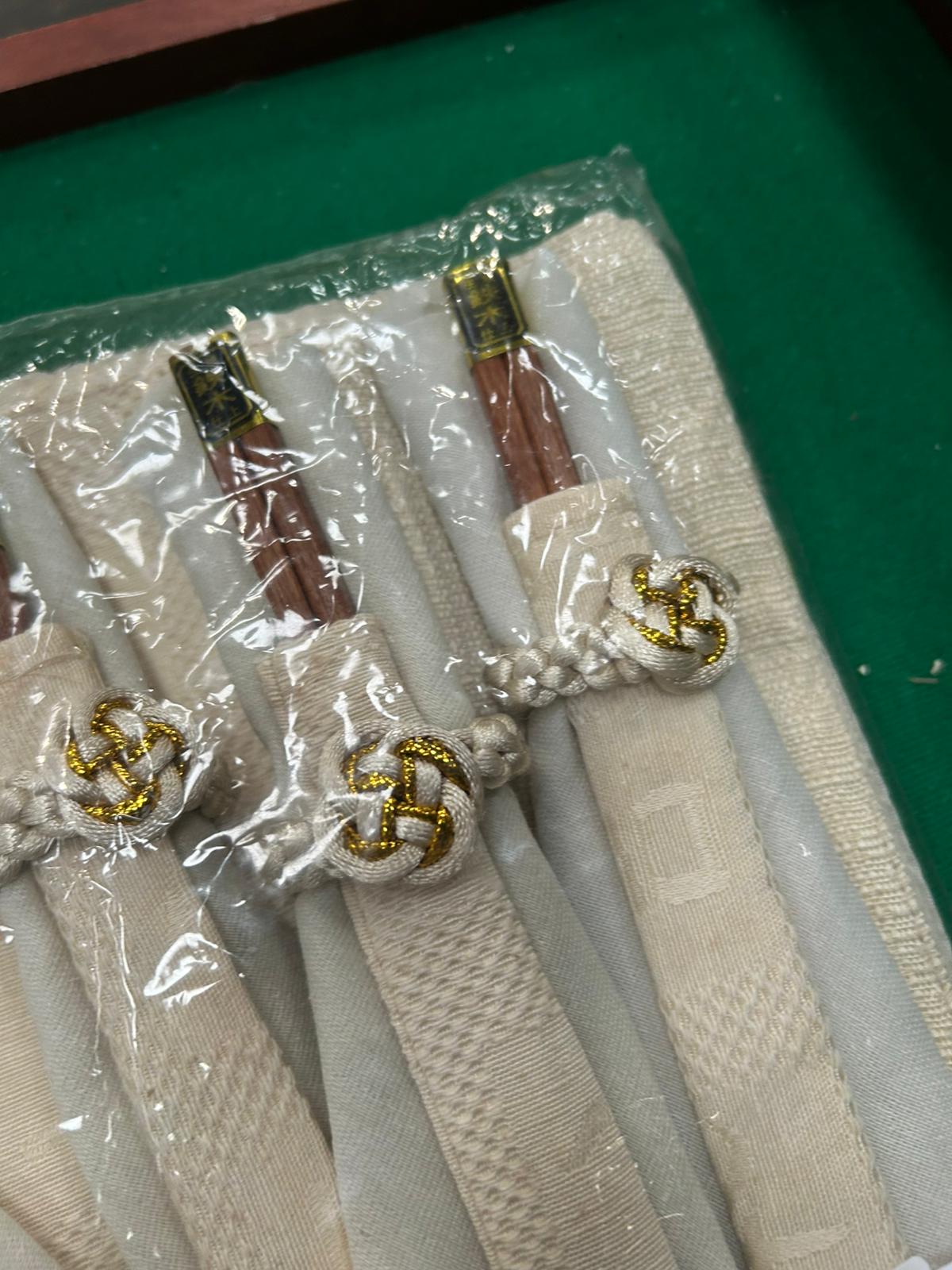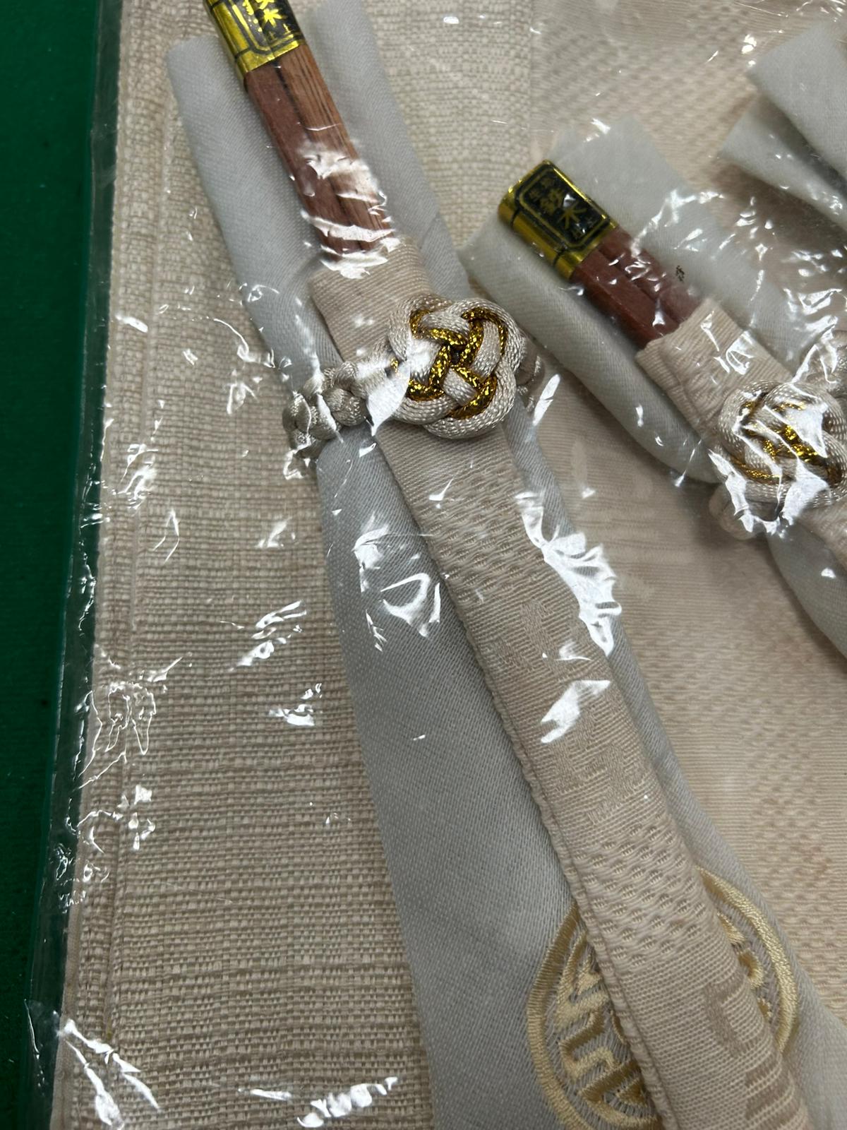 This set of six place settings is presented in its original clear plastic packaging. Each individual setting consists of a pair of wooden chopsticks, a matching fabric sleeve, and a cream-coloured textured fabric napkin or placemat. The chopsticks are finished with gold-coloured foil bands at the top, which are printed with the characters 鉄木仕上, translating to Ironwood Finish. The fabric components are made from a cream-coloured woven textile featuring a repeating pattern and a circular embroidered emblem. Each sleeve is further detailed with a cream and gold-toned cord tied in a decorative knot. The items are accompanied by a handwritten lot tag from Liskeard Auction Rooms.