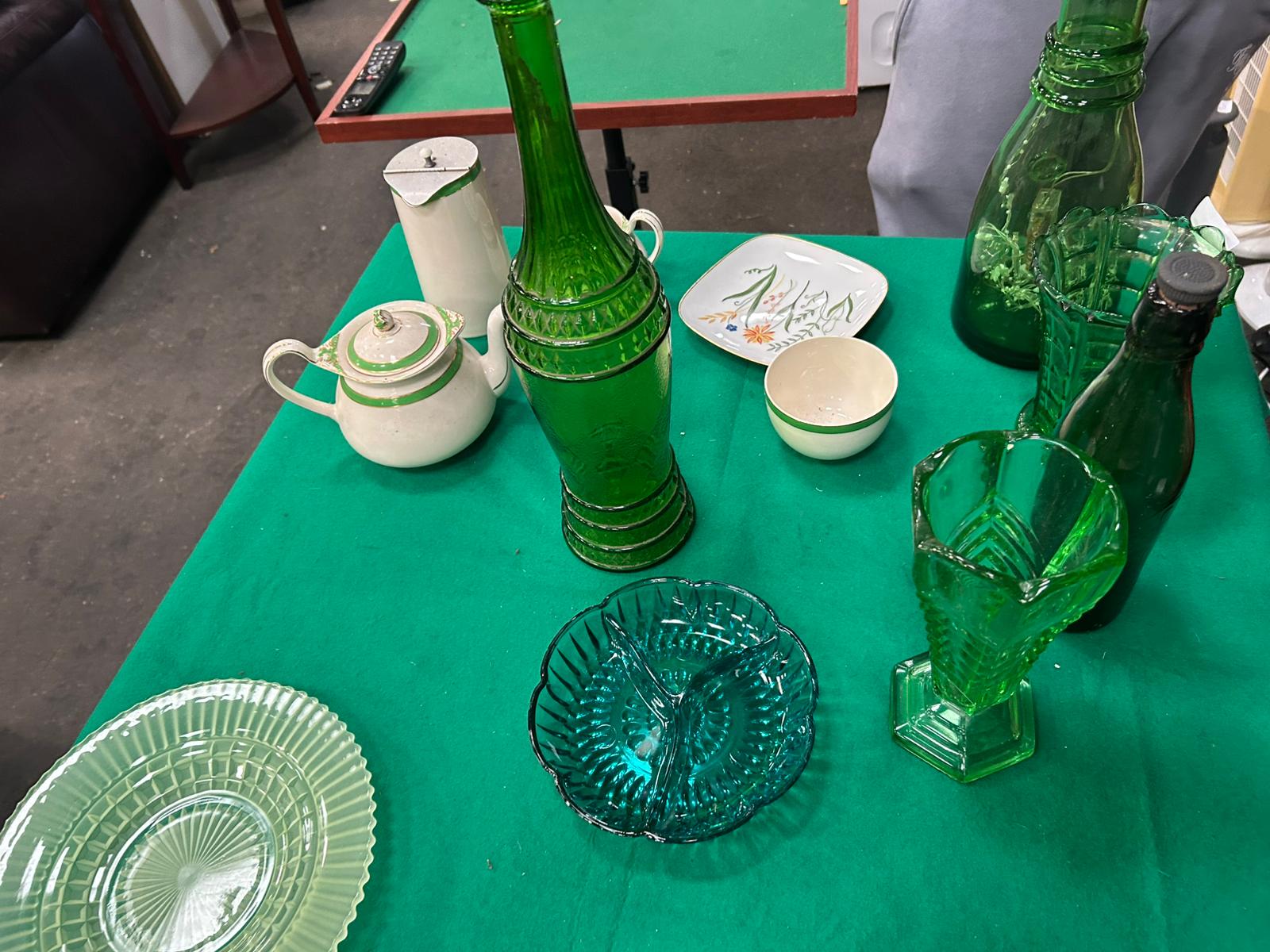 This collection comprises an assortment of vintage ceramics and decorative glassware. The ceramic items include pieces from the Soho Pottery Ltd Solian Ware range in the Queens Green pattern, manufactured in Cobridge, England. This group includes a teapot, a tall pitcher, a small creamer, and a bowl, all featuring a white body decorated with green banding and gilded accents. The base of the pitcher is marked with the Soho Pottery backstamp and the pattern name. Also included is a square porcelain plate by Schönwald, Germany, decorated with a hand-painted botanical design of various flowers and grasses. The underside of the plate is marked with the Schönwald crown and tree logo, the number 192, and hand-painted marks 1960 and BS. The glassware portion of the collection includes two green pressed glass vases, one featuring a fluted rim and a tiered hexagonal footed base. Further glass items consist of a teal-coloured three-section divided dish with a textured base and a pale green glass plate with a radiating ribbed pattern. Several green glass bottles and decanters are also present, including a tall green decanter with a diamond-patterned mid-section and a dark green glass bottle complete with its stopper.