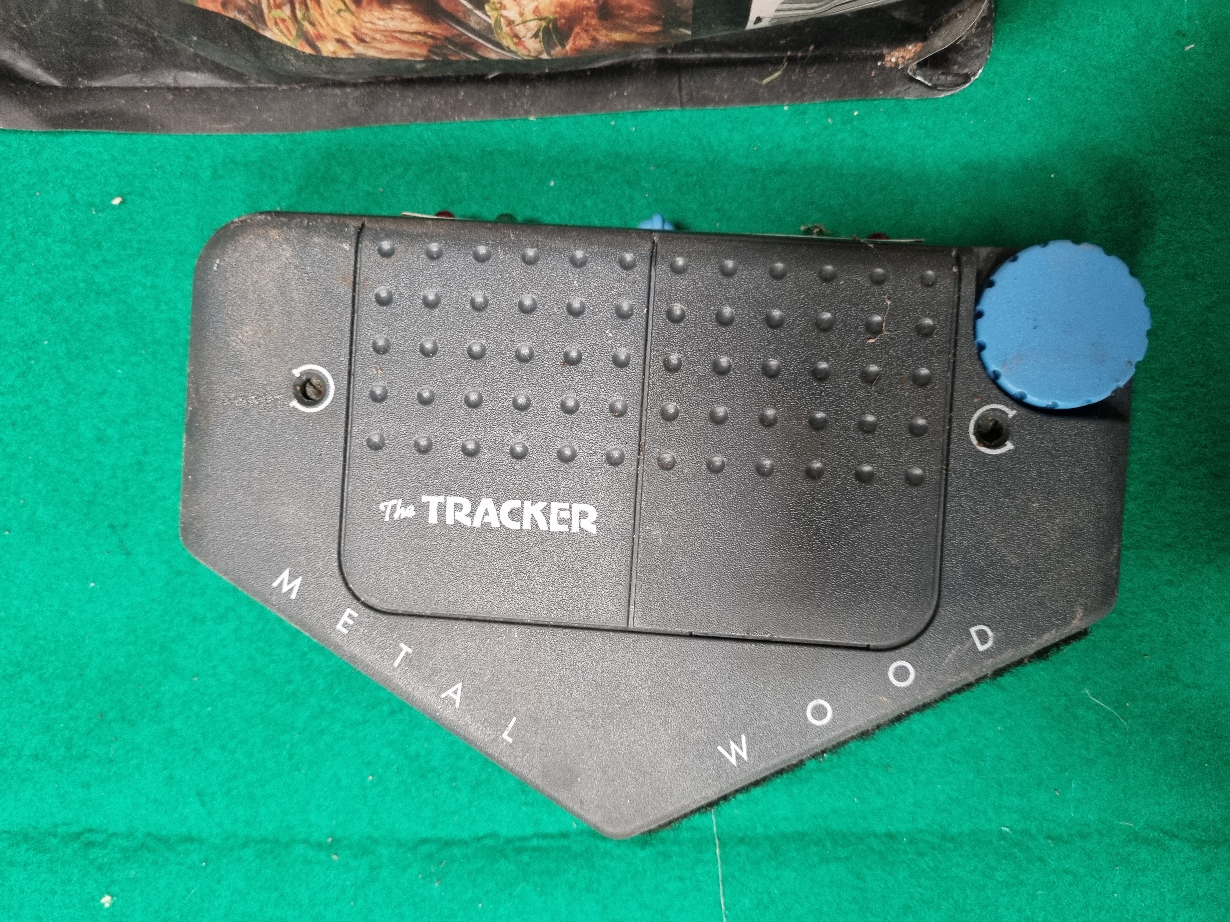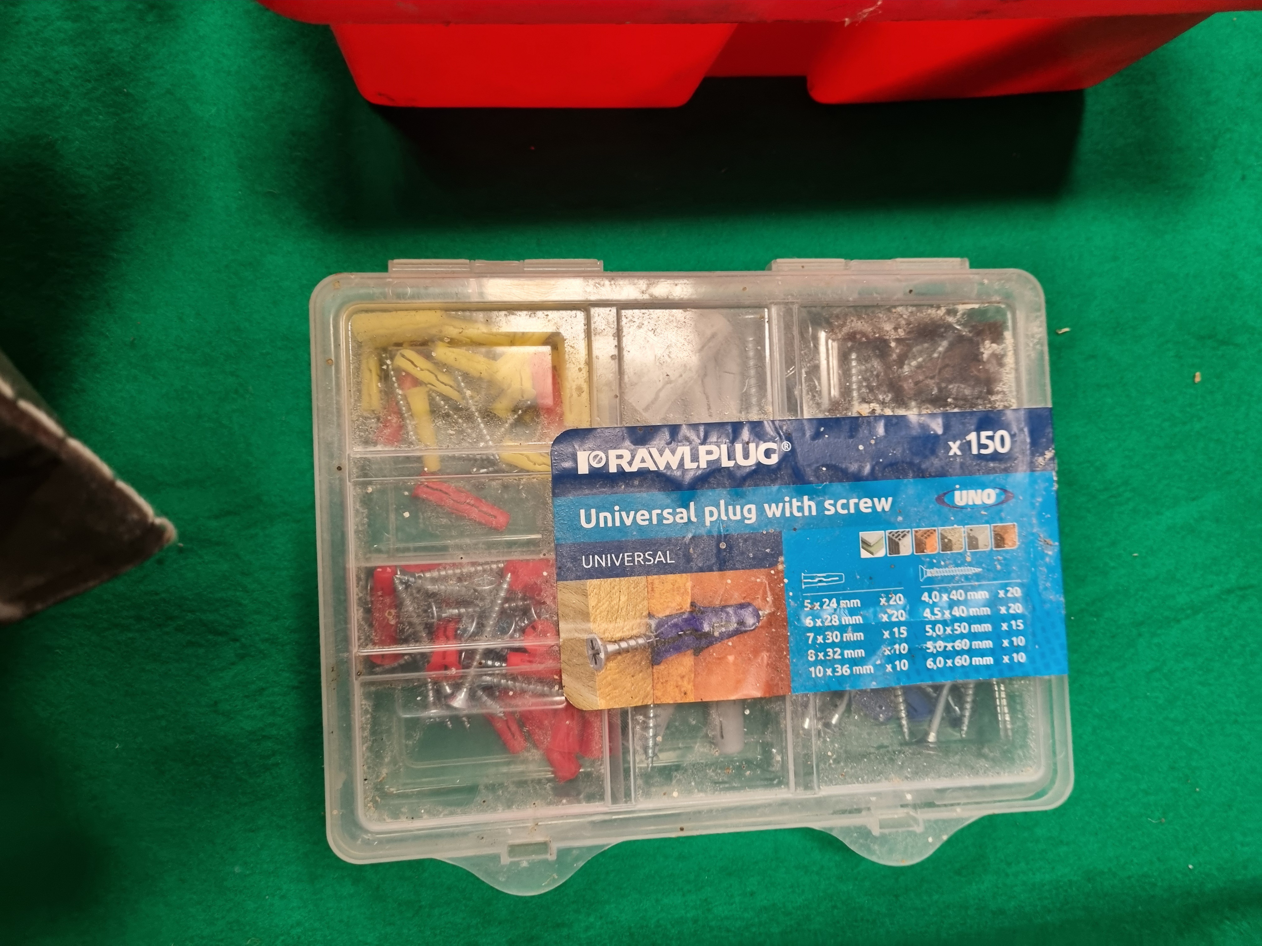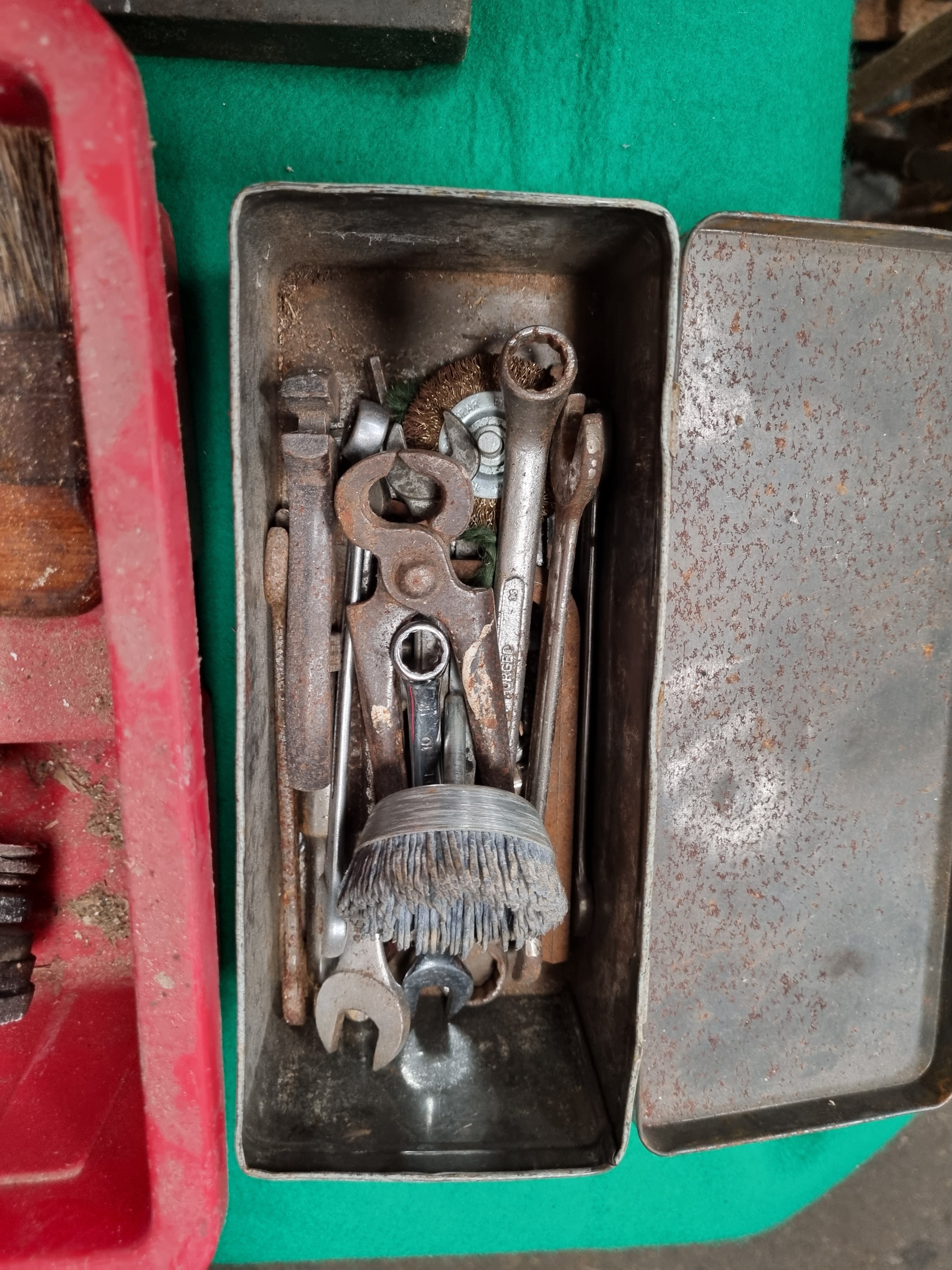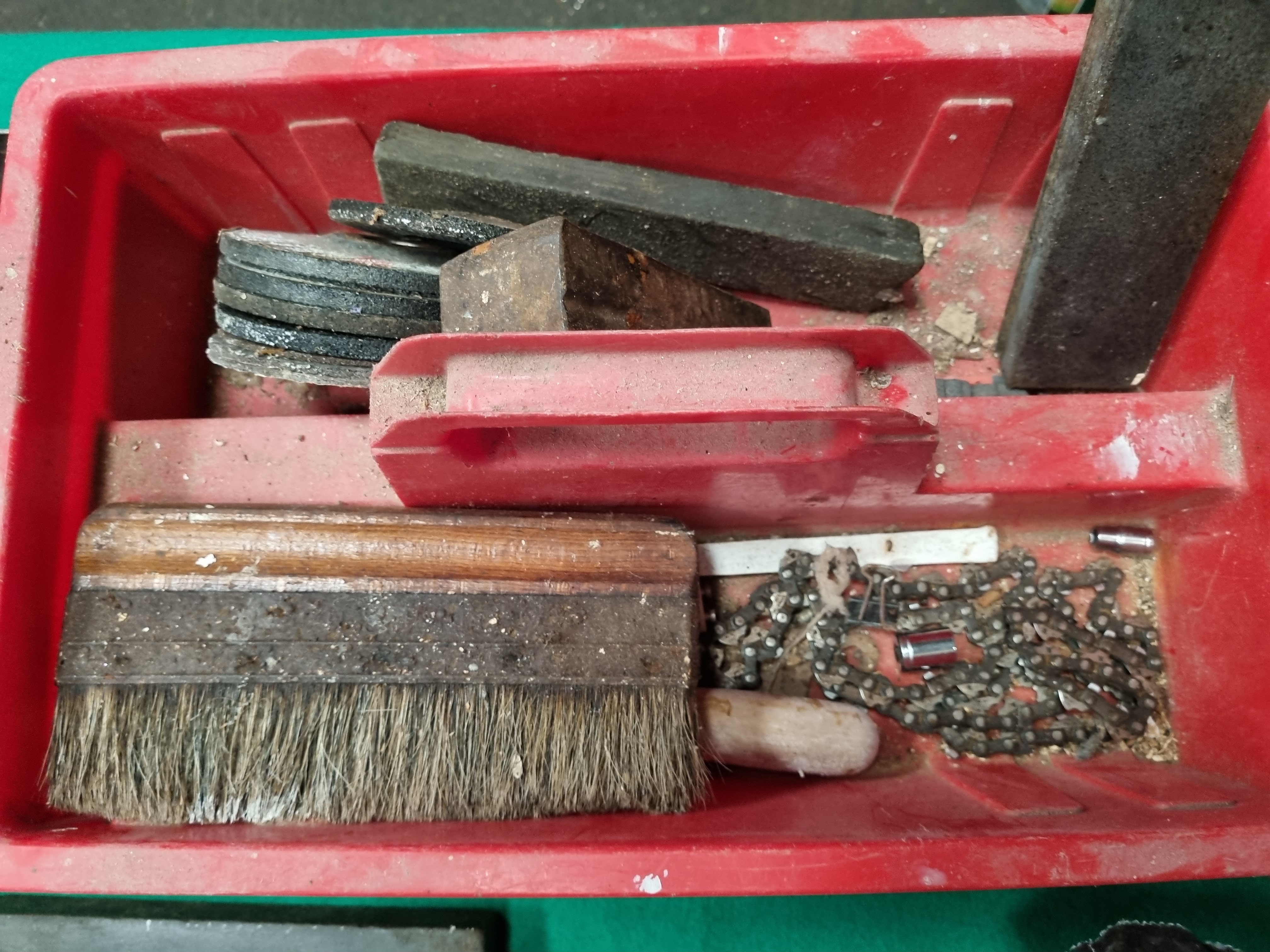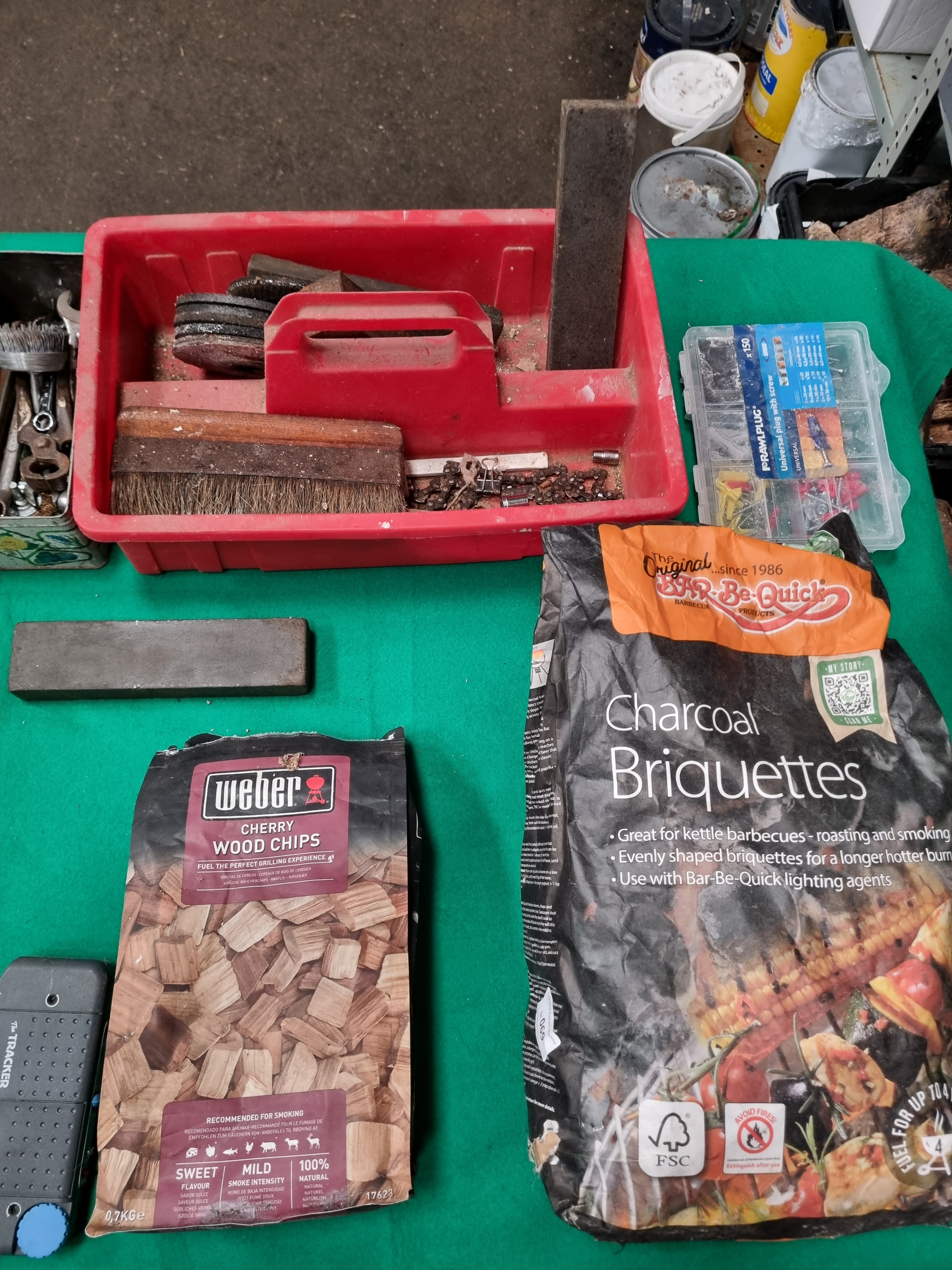 This collection of household and workshop items includes barbecue maintenance supplies and various hardware. The lot features a 0.7kg unopened bag of Weber Cherry Wood Chips and a bag of Bar-Be-Quick Charcoal Briquettes. Tools include a weathered metal tin containing several rusted open-ended and ring spanners, a pair of pincers, and a circular wire brush. A red plastic tool caddy is included, containing a wooden-handled bench brush, a length of chainsaw chain, multiple grinding discs, and several rectangular sharpening stones. Additionally, there is a Rawlplug universal fixing set in a multi-compartment plastic organiser and a handheld electronic material detector finished in black plastic, labelled The TRACKER, designed for locating wood and metal.