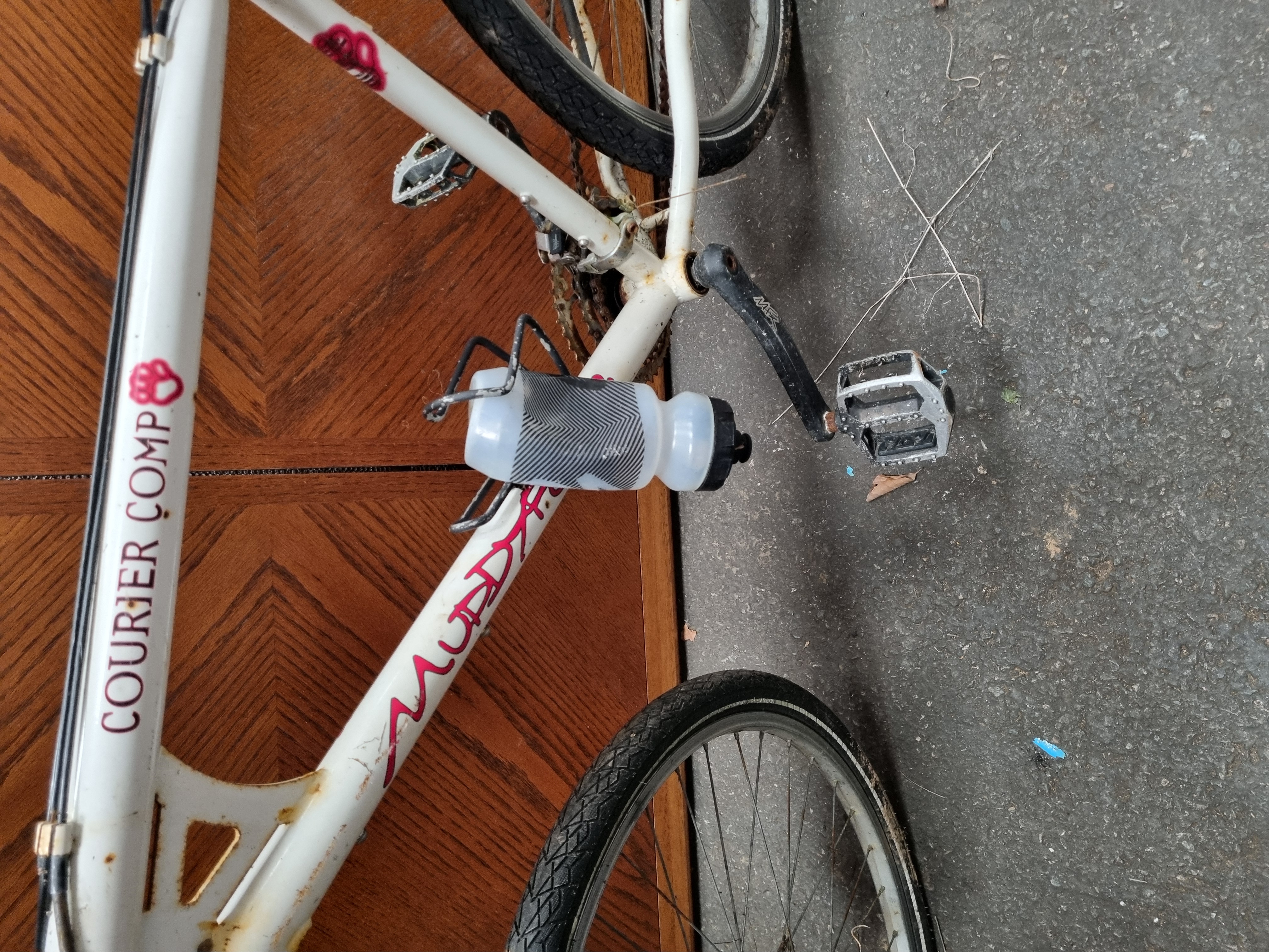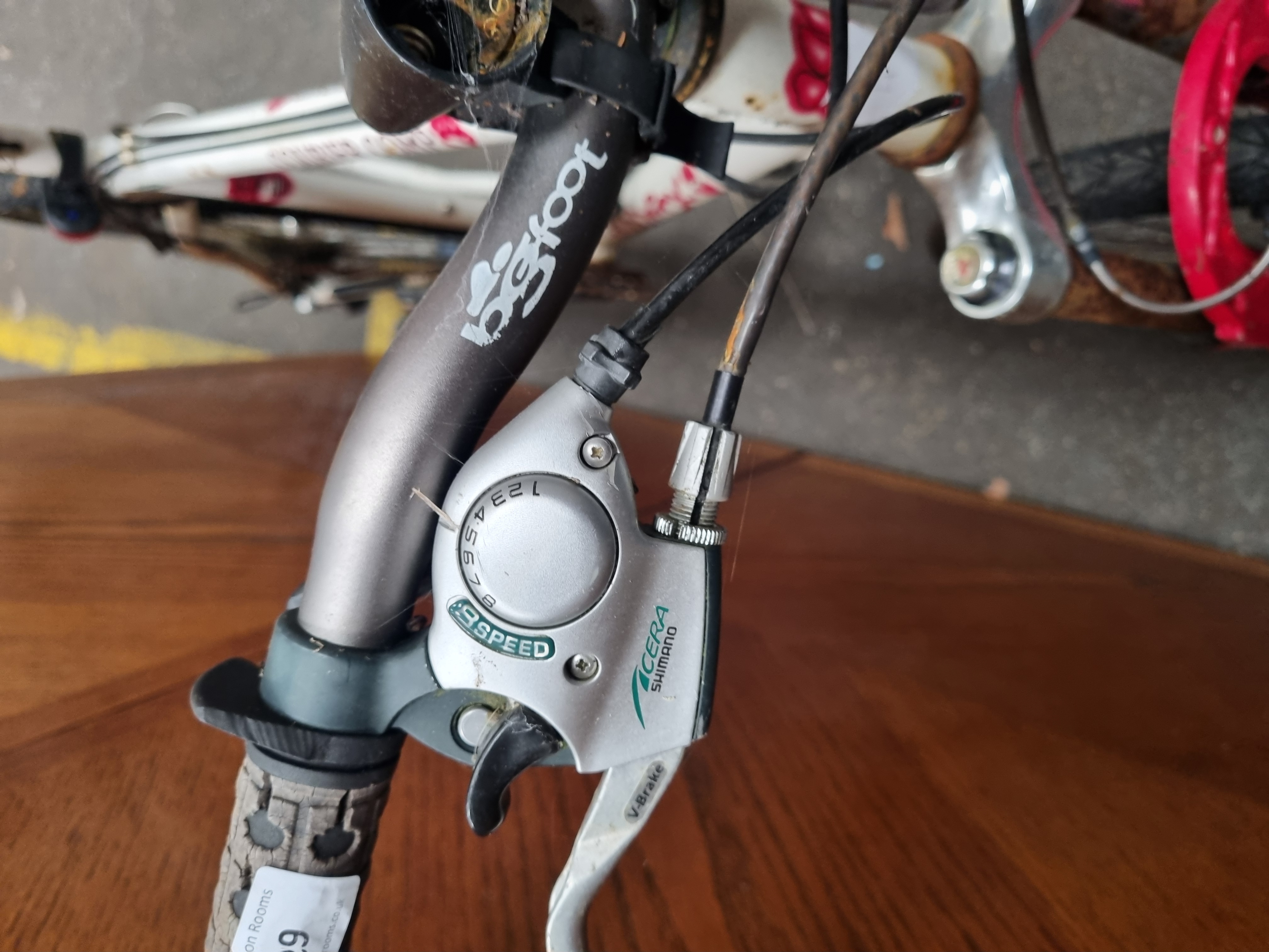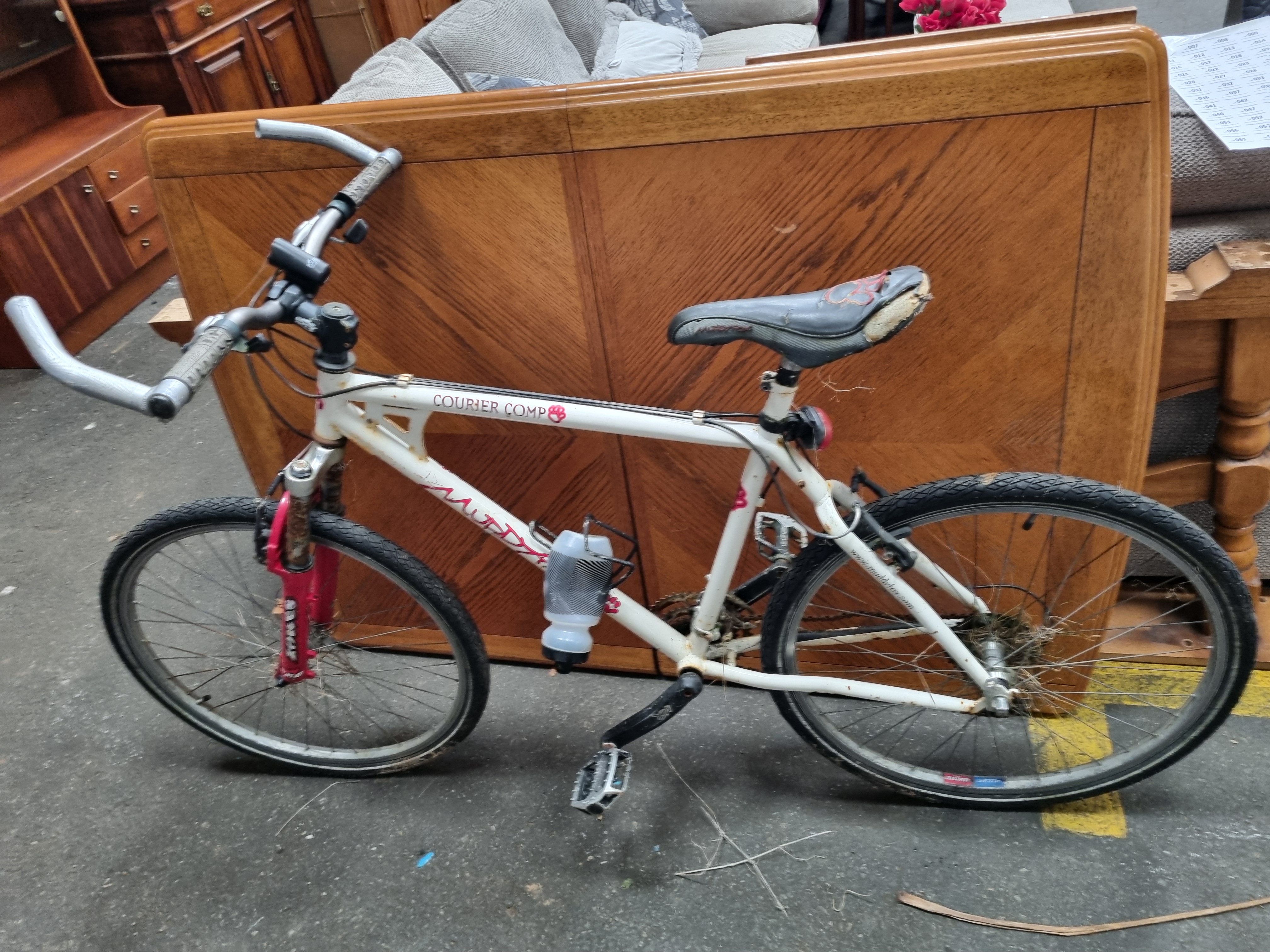 A Muddy Fox Courier Comp mountain bike featuring a white finished frame with red stylized graphics and characteristic paw print logos. The frame construction includes a reinforced gusset at the head tube. It is equipped with a front suspension fork and Bigfoot AL6061T6 heat-treated aluminium handlebars. The mechanical group set includes Shimano Acera 8-speed shifters with integrated V-Brake levers. The bicycle retains a Muddy Fox branded saddle and is fitted with a down tube mounted water bottle cage and plastic bottle.