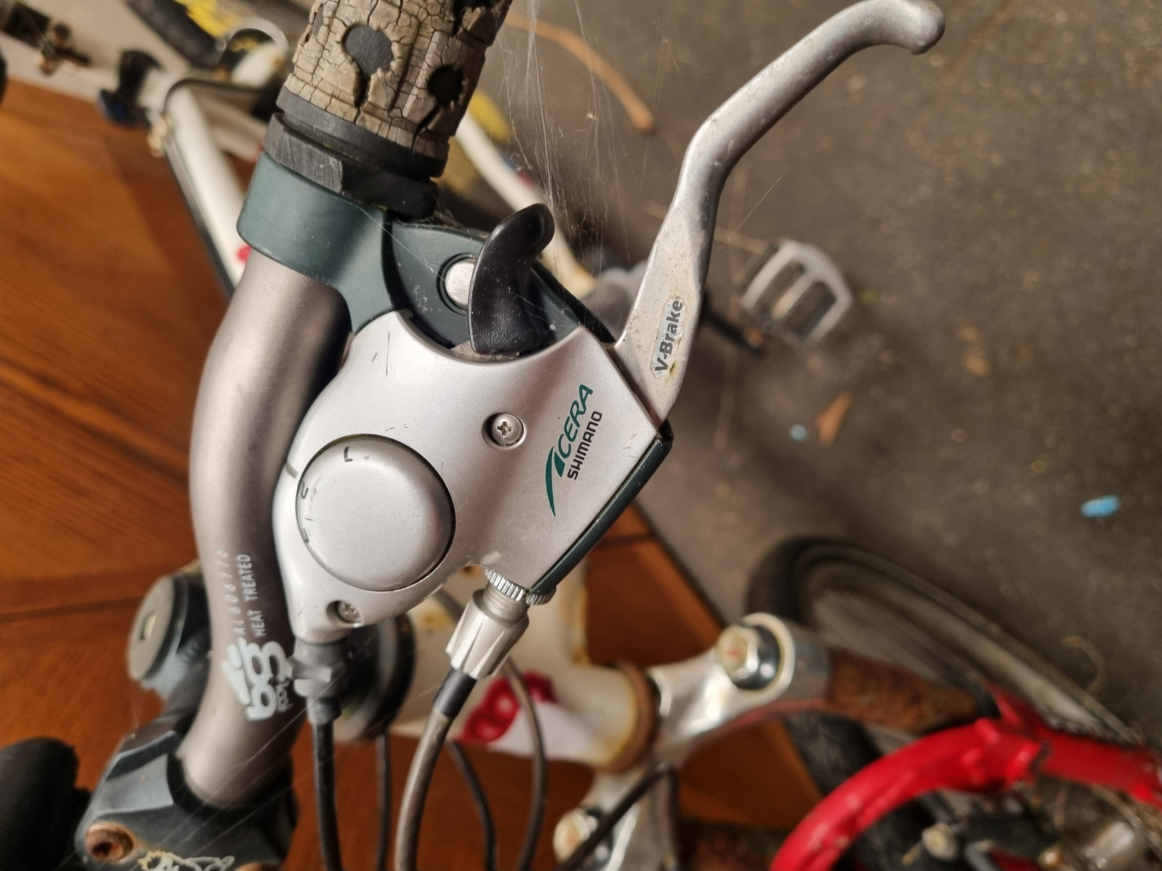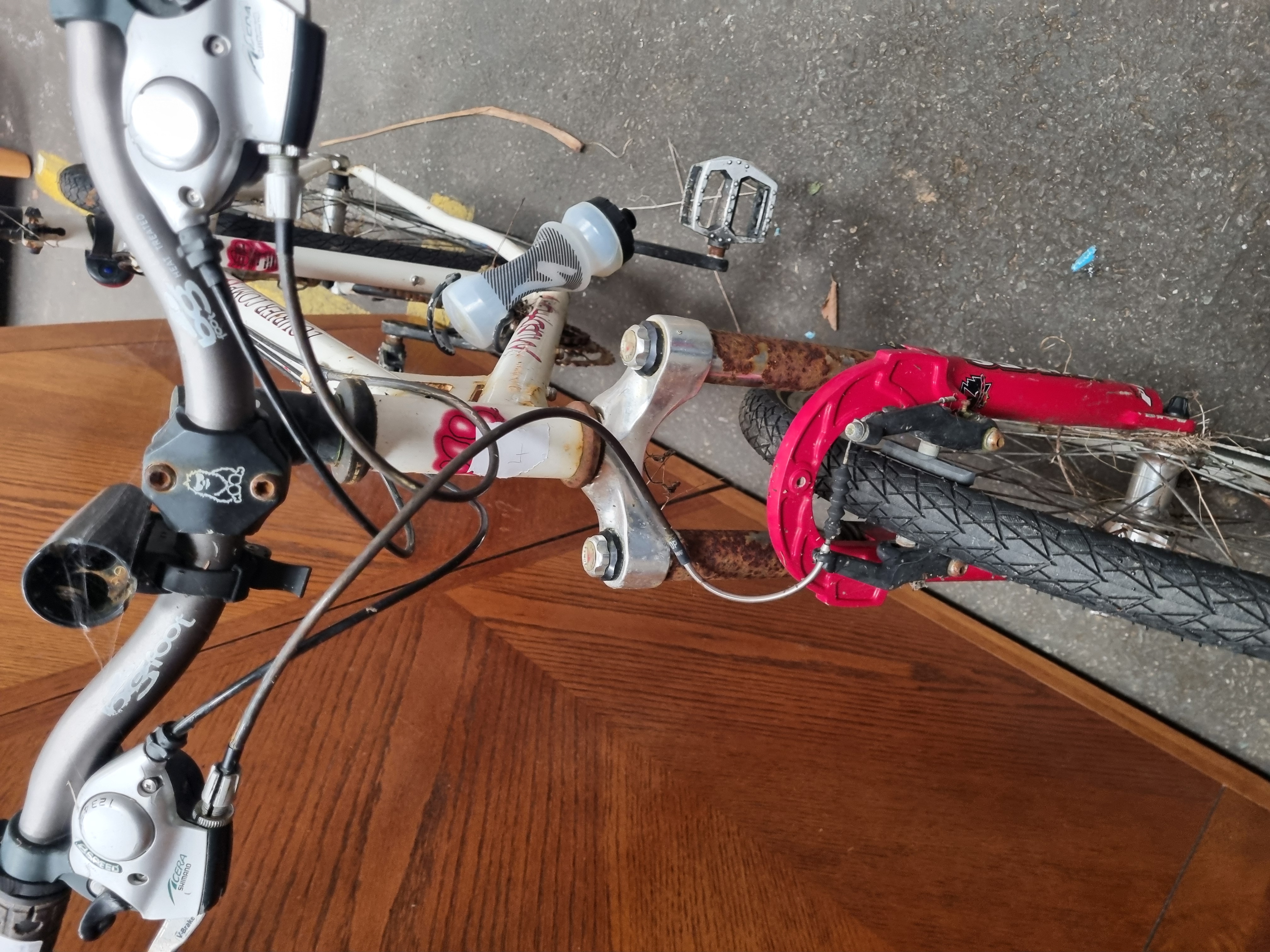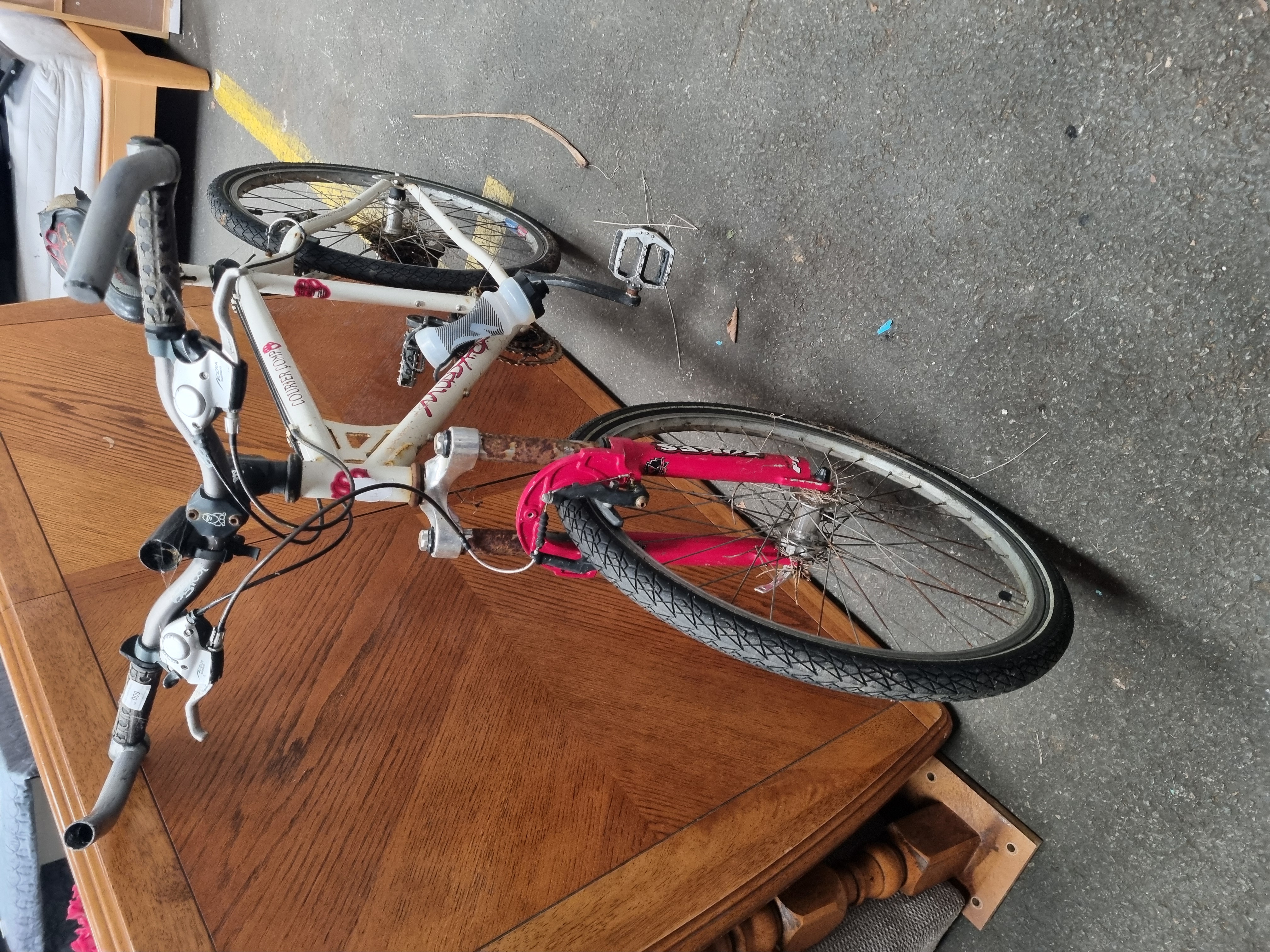 A Muddy Fox Courier Comp mountain bike featuring a white finished frame with red stylized graphics and characteristic paw print logos. The frame construction includes a reinforced gusset at the head tube. It is equipped with a front suspension fork and Bigfoot AL6061T6 heat-treated aluminium handlebars. The mechanical group set includes Shimano Acera 8-speed shifters with integrated V-Brake levers. The bicycle retains a Muddy Fox branded saddle and is fitted with a down tube mounted water bottle cage and plastic bottle.