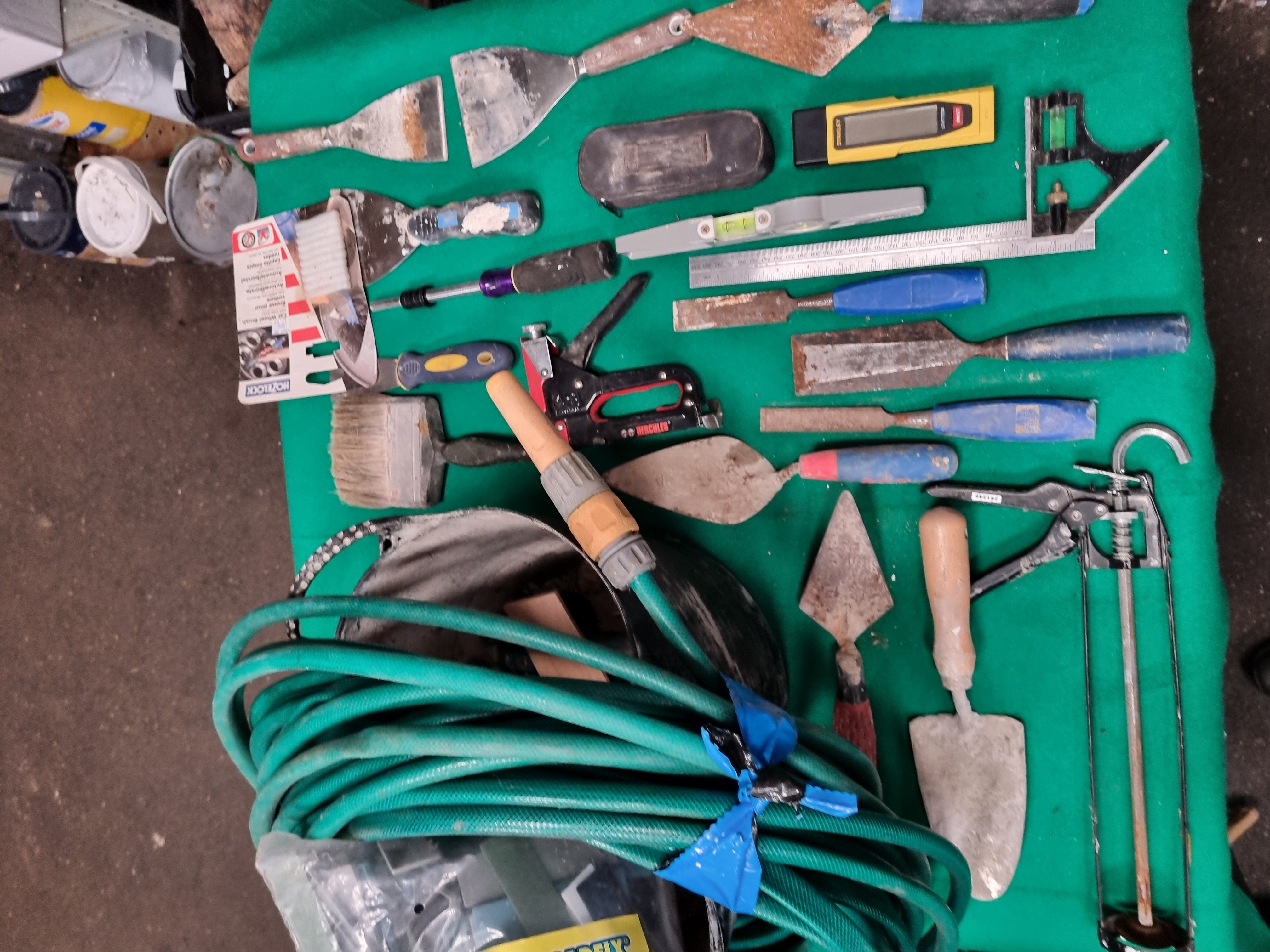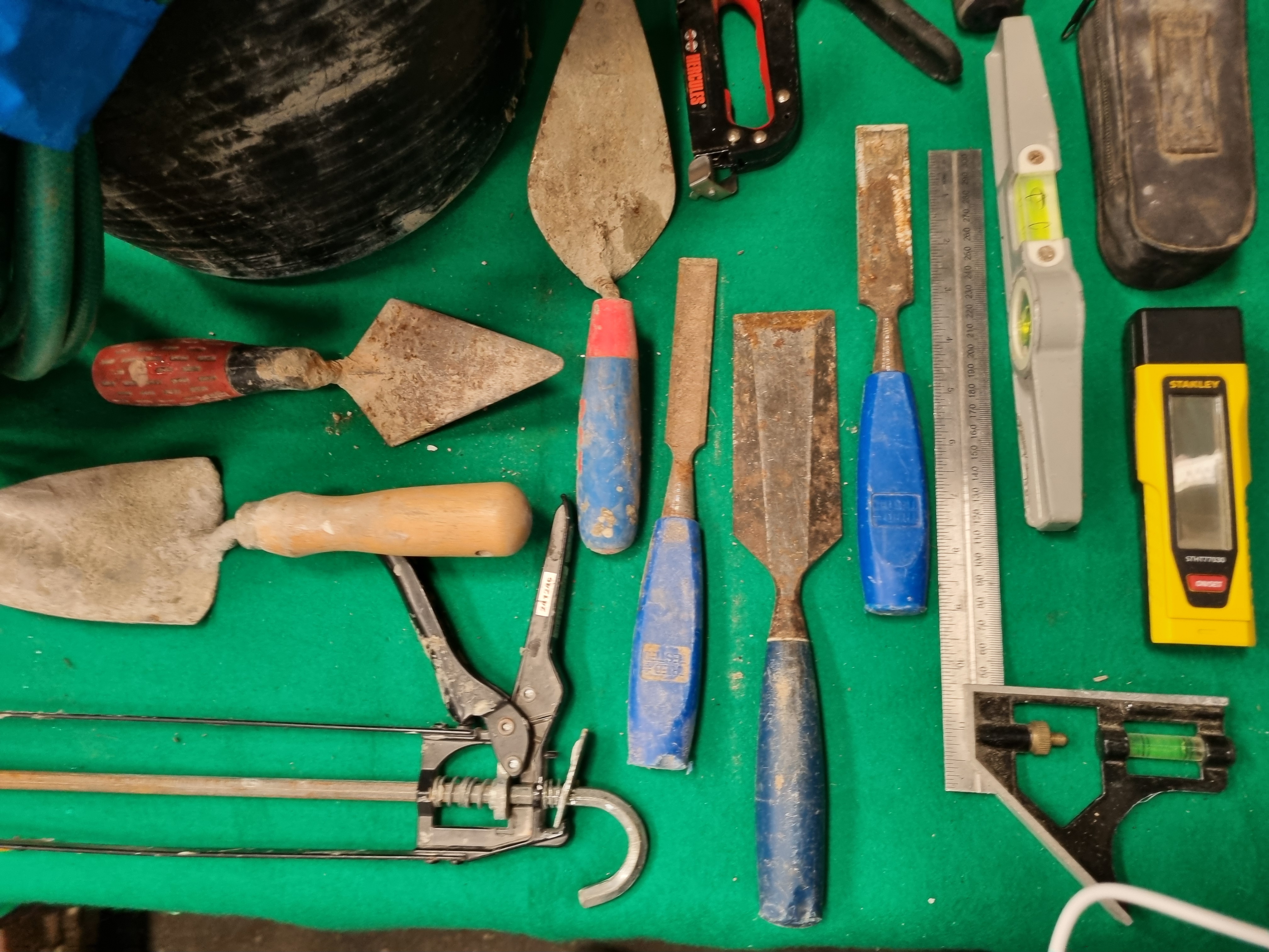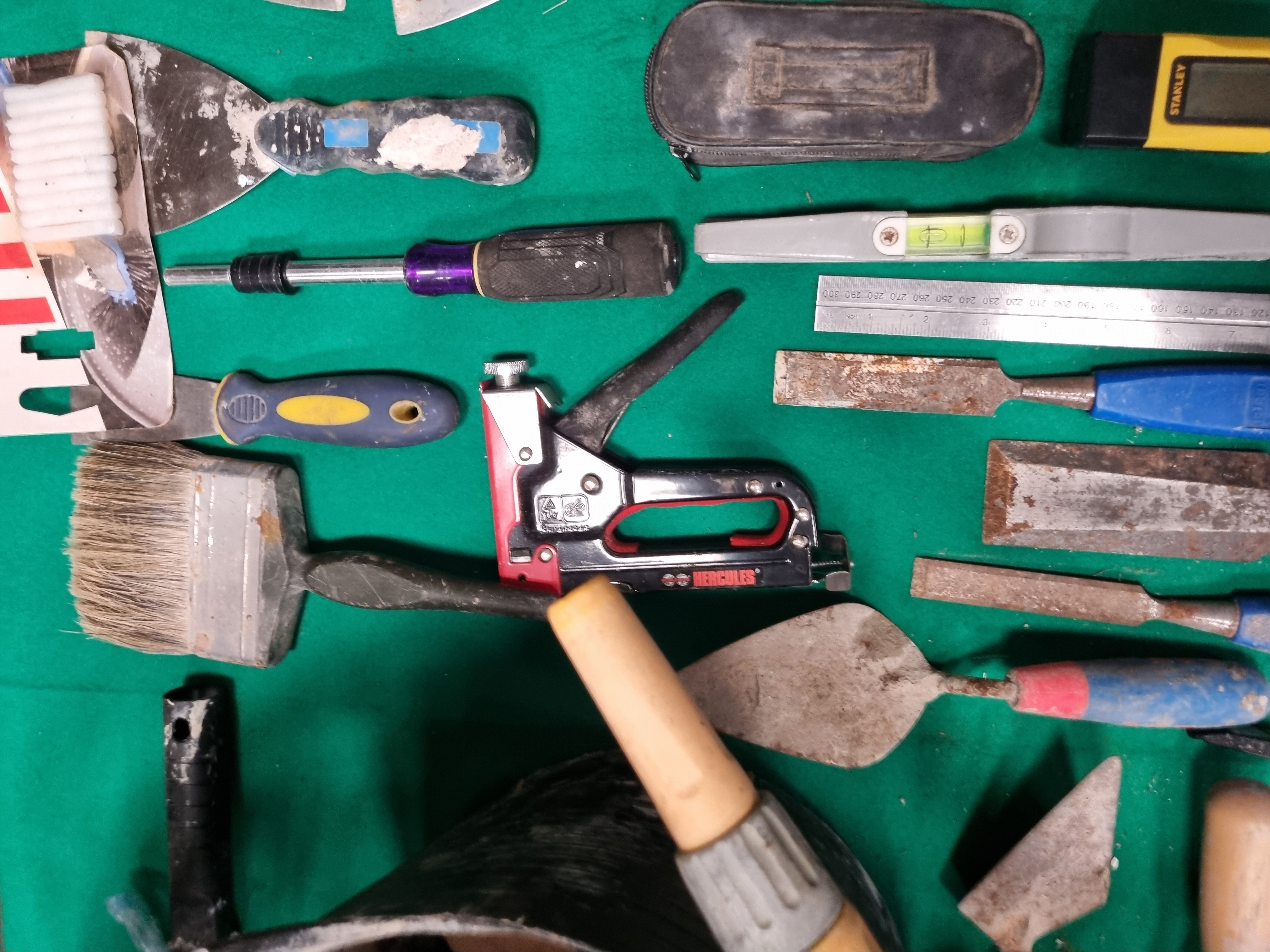 This collection of assorted hand tools and building supplies comprises various items for masonry, decorating, woodworking, and general maintenance. Notable branded items include a Stanley STHT77030 digital electronic sensor, a Stanley 99E utility knife, a Hercules heavy-duty manual staple gun, and a Hozelock car wheel brush in its original packaging. The lot also includes a partially used pack of Broadfix assorted mixed glazing shims. Masonry and decorating tools consist of several pointing trowels, a gauging trowel, metal scrapers, filling knives, and a large masonry brush. Woodworking tools include three chisels with blue plastic handles marked Tried & Tested. Measuring and levelling equipment includes a steel ruler, a combination square with an integrated spirit level, and a plastic torpedo level. Additional items include a skeleton-frame sealant gun, a multi-bit screwdriver with a purple and black handle, a length of green reinforced garden hose with a spray nozzle, a black flexible rubber trug, and a small zippered soft case. The items are constructed from tool-grade steel, various plastics, rubber, and wood.