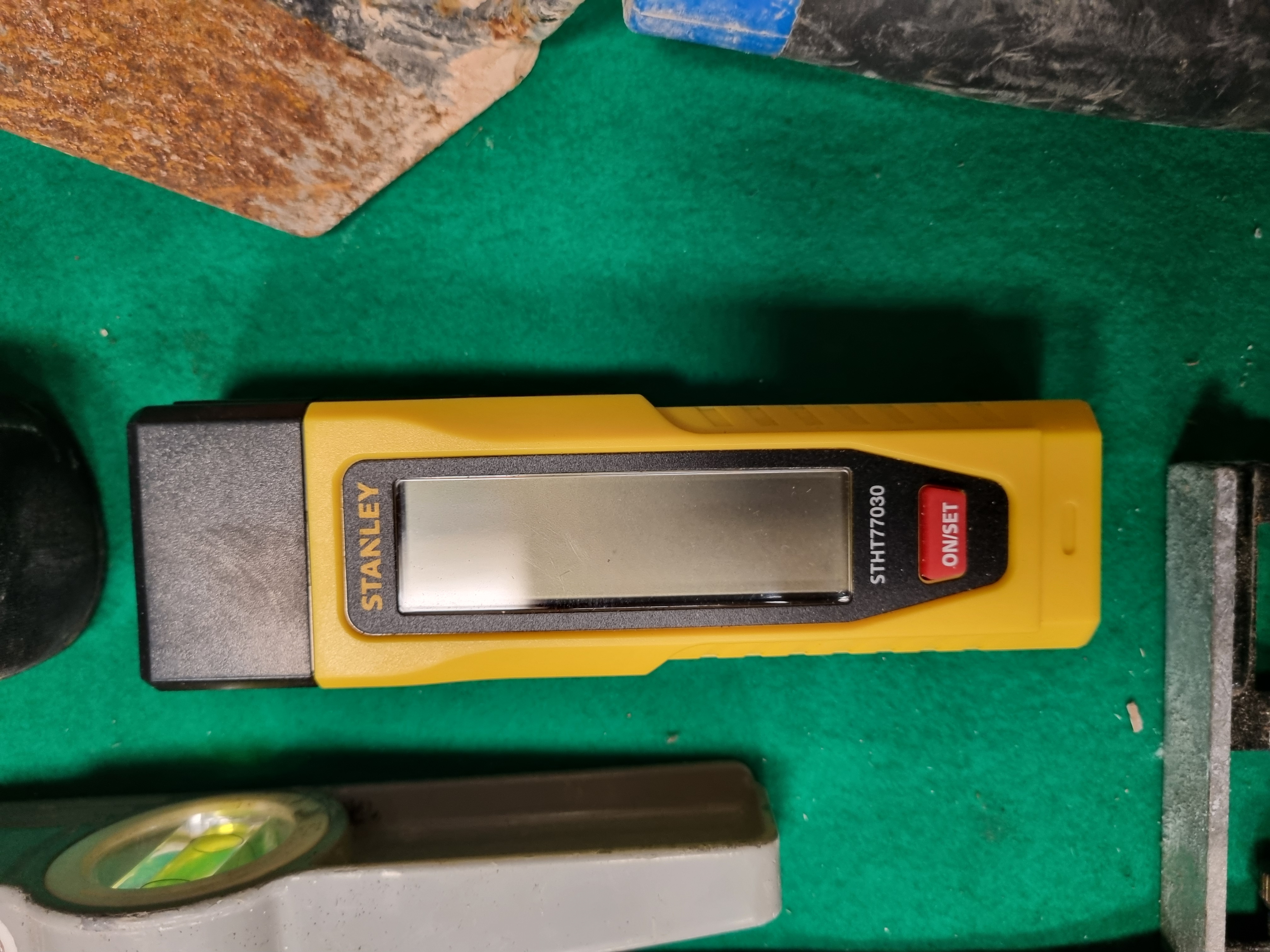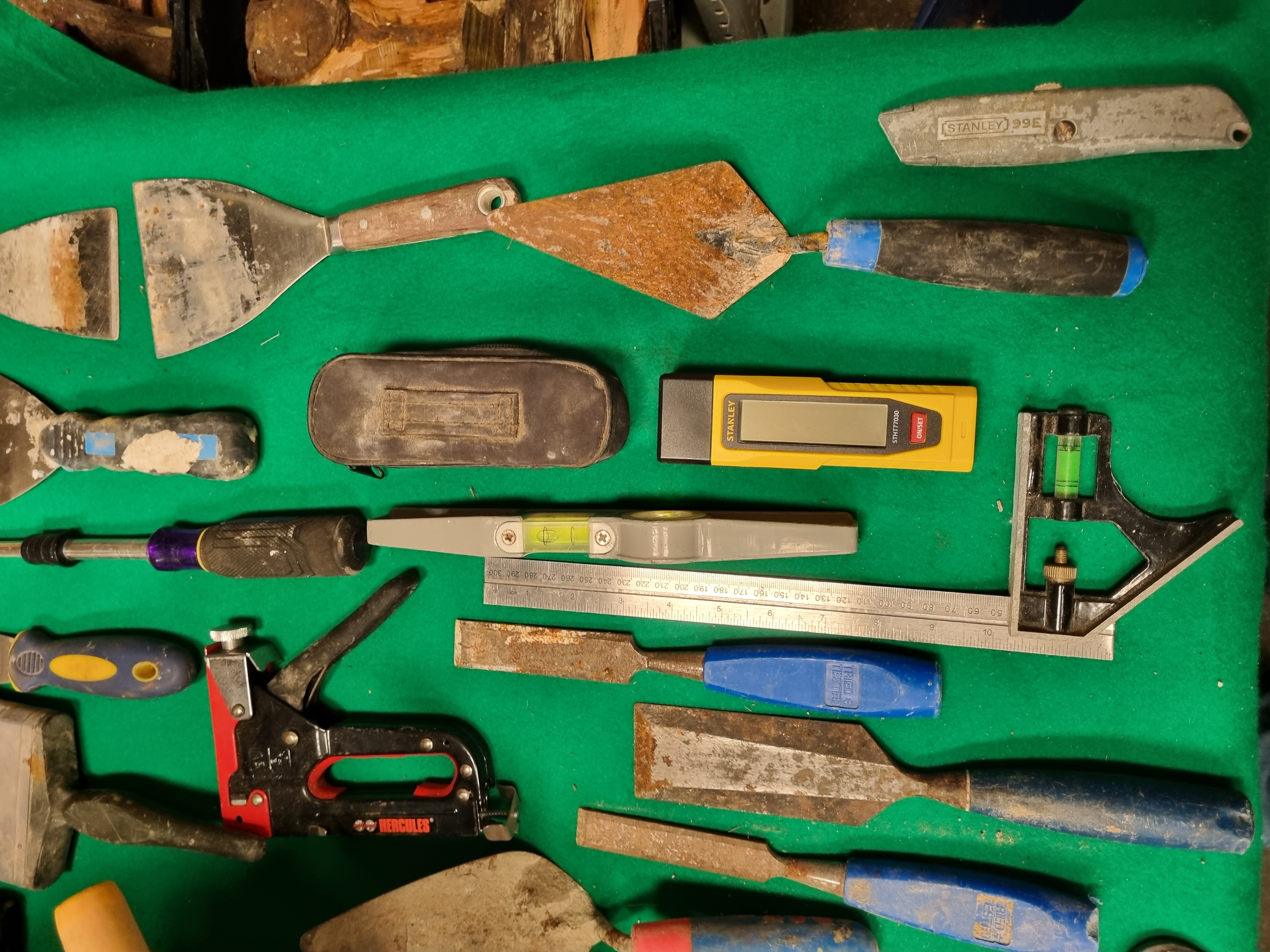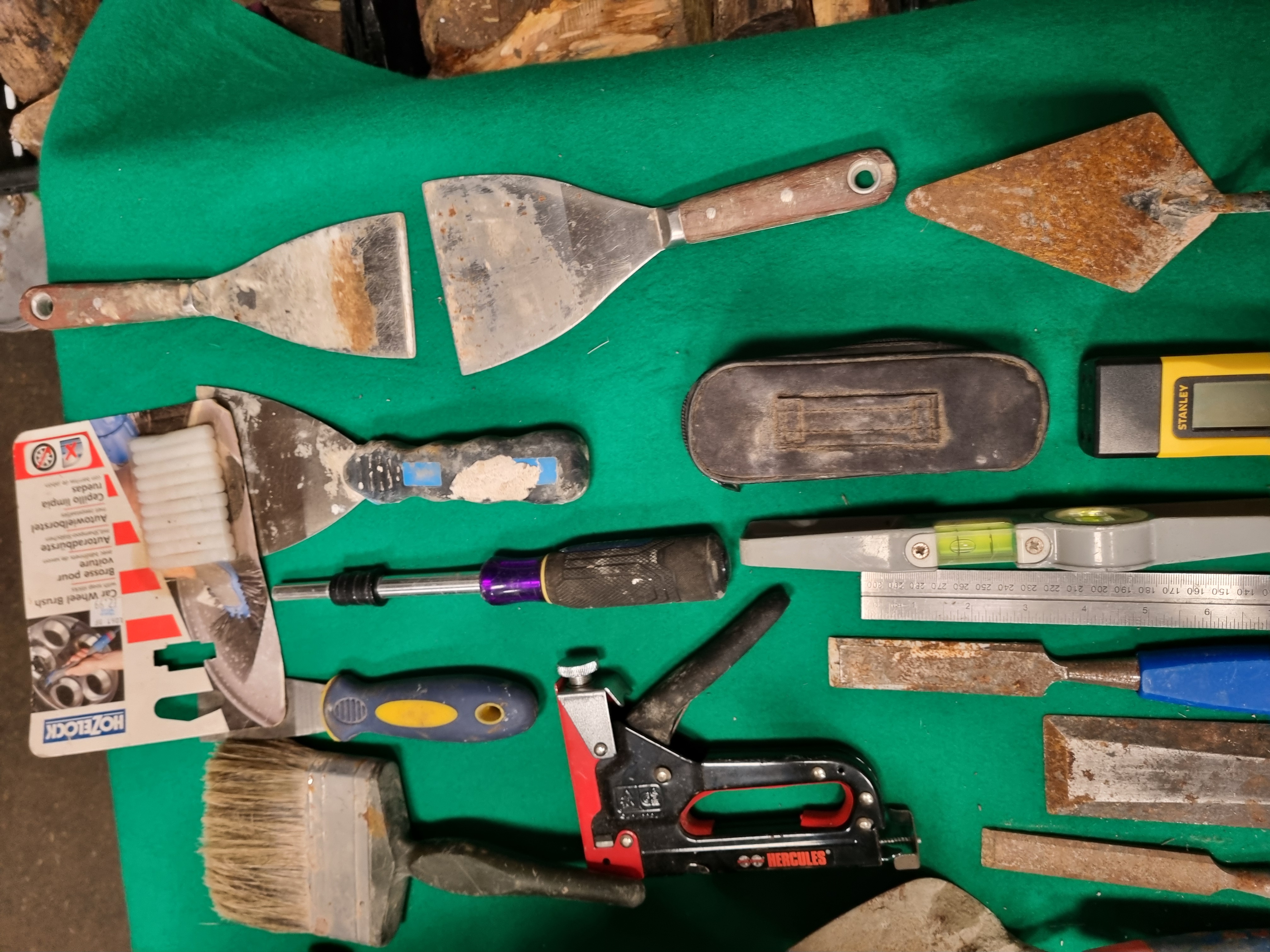 This collection of assorted hand tools and building supplies comprises various items for masonry, decorating, woodworking, and general maintenance. Notable branded items include a Stanley STHT77030 digital electronic sensor, a Stanley 99E utility knife, a Hercules heavy-duty manual staple gun, and a Hozelock car wheel brush in its original packaging. The lot also includes a partially used pack of Broadfix assorted mixed glazing shims. Masonry and decorating tools consist of several pointing trowels, a gauging trowel, metal scrapers, filling knives, and a large masonry brush. Woodworking tools include three chisels with blue plastic handles marked Tried & Tested. Measuring and levelling equipment includes a steel ruler, a combination square with an integrated spirit level, and a plastic torpedo level. Additional items include a skeleton-frame sealant gun, a multi-bit screwdriver with a purple and black handle, a length of green reinforced garden hose with a spray nozzle, a black flexible rubber trug, and a small zippered soft case. The items are constructed from tool-grade steel, various plastics, rubber, and wood.