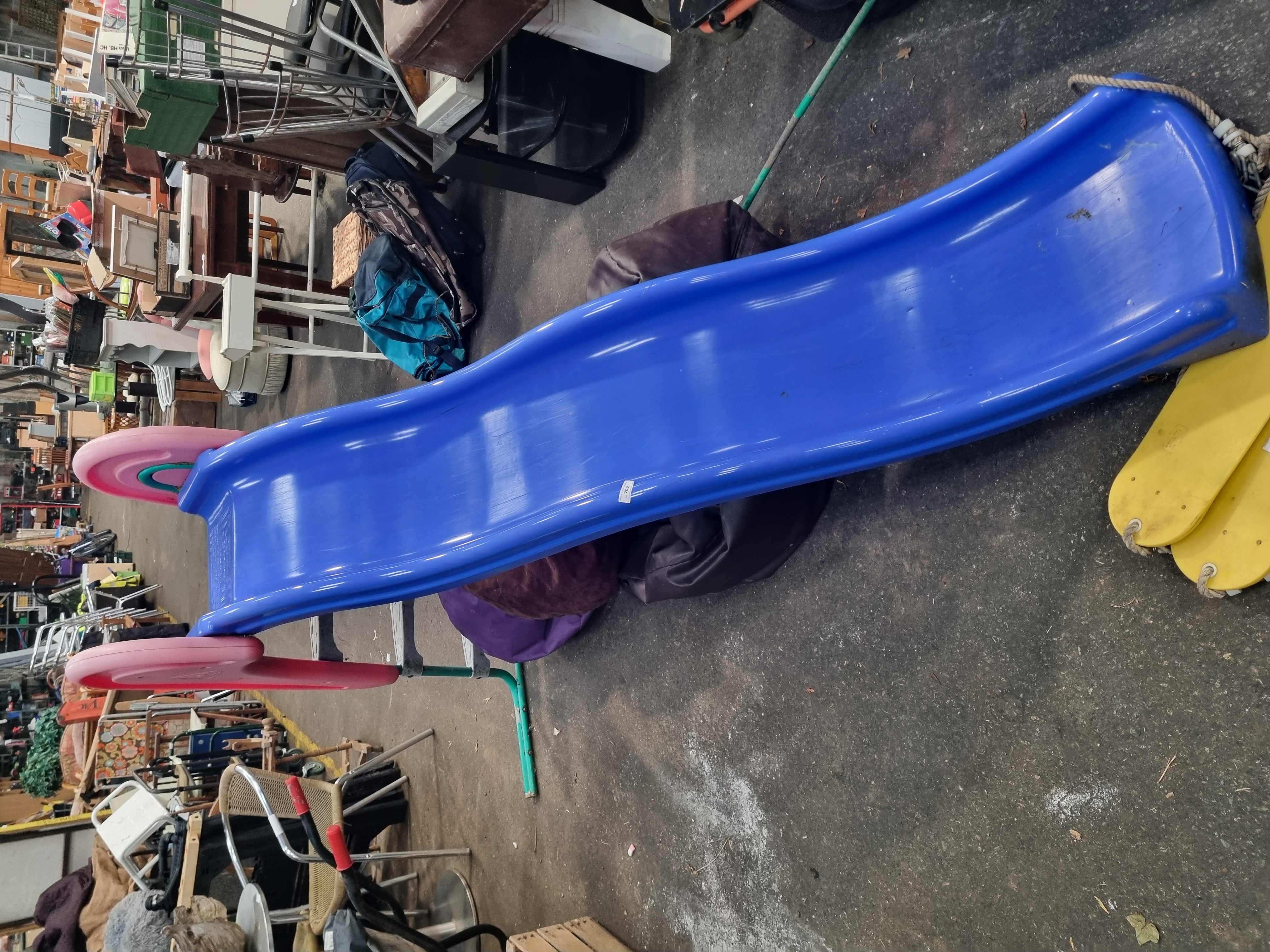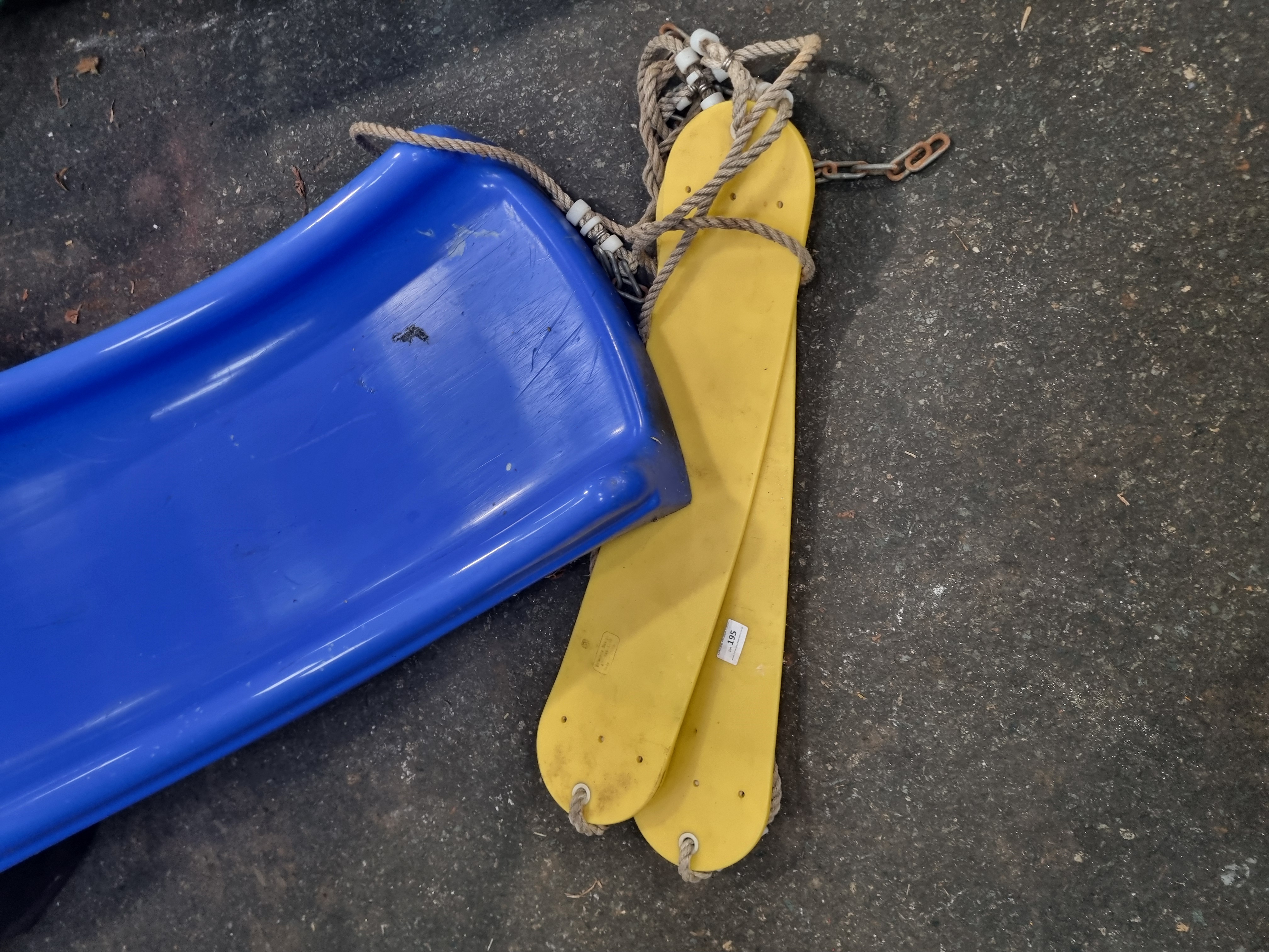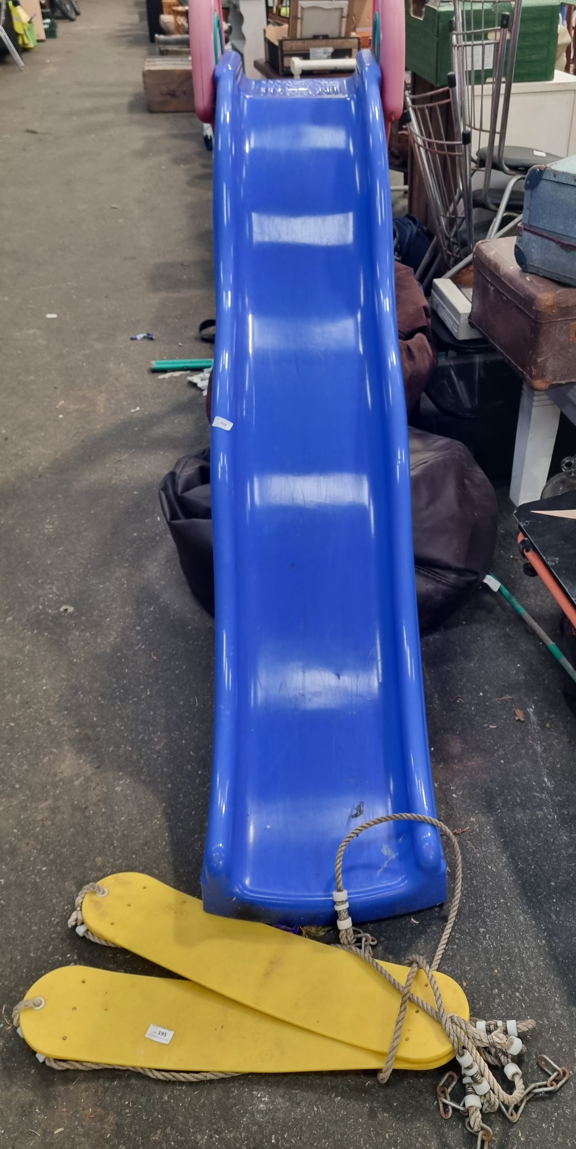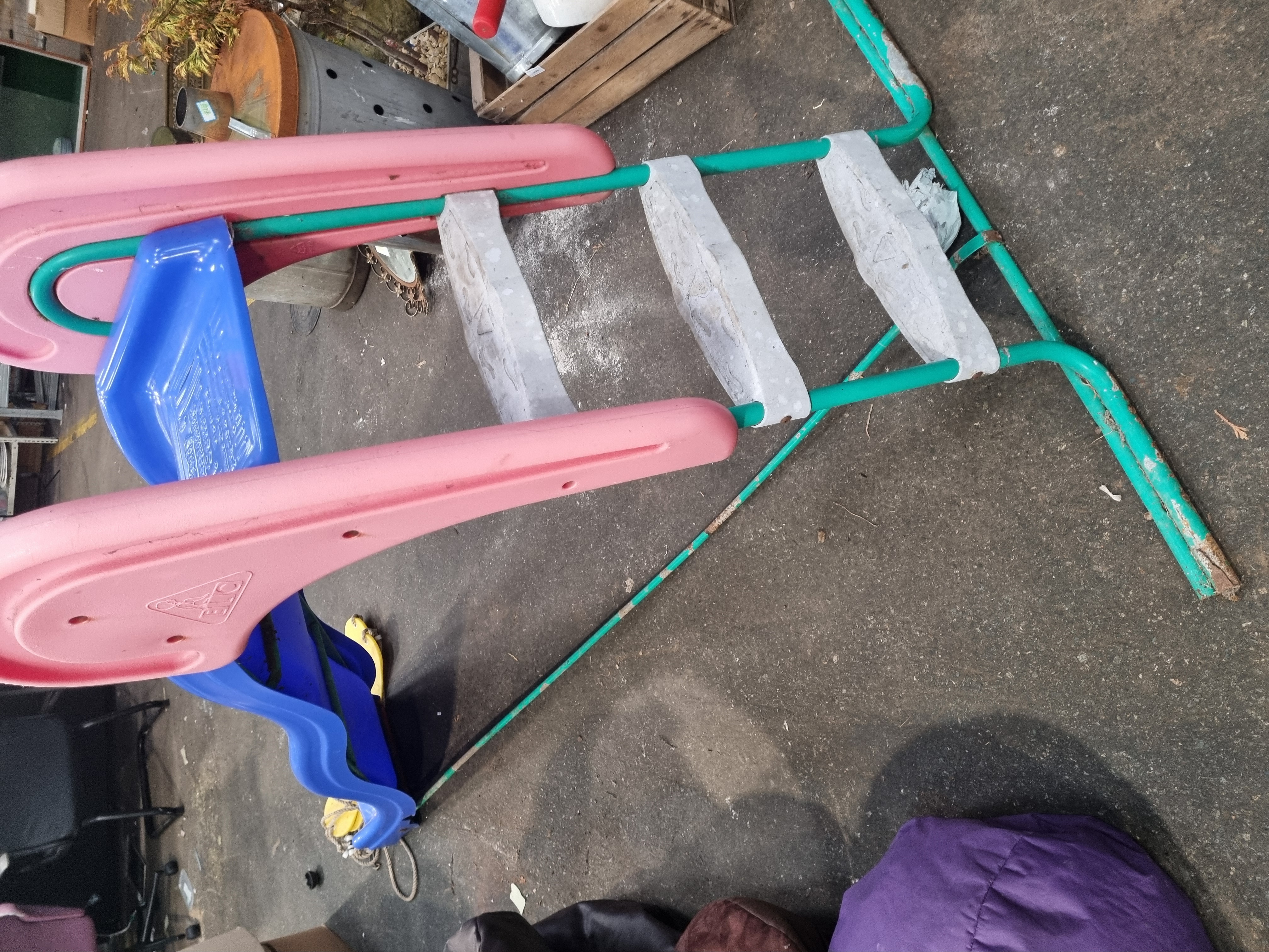 Manufactured by the Early Learning Centre (ELC), this lot comprises a wavy blue plastic slide and two yellow plastic swing seats. The slide unit is designed with pink plastic side safety handles and is supported by a green-painted metal ladder frame featuring three textured grey plastic steps. The two yellow plastic swing seats are equipped with white ropes, plastic height adjusters, and metal attachment links. A moulded triangular manufacturer logo containing the letters ELC is visible on the pink side handles.