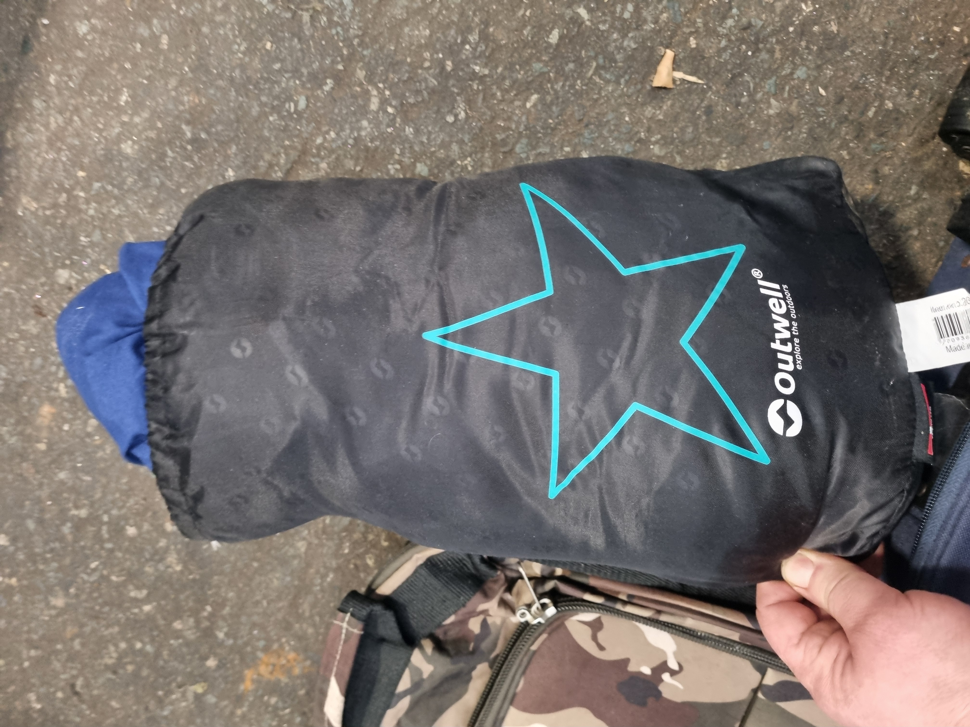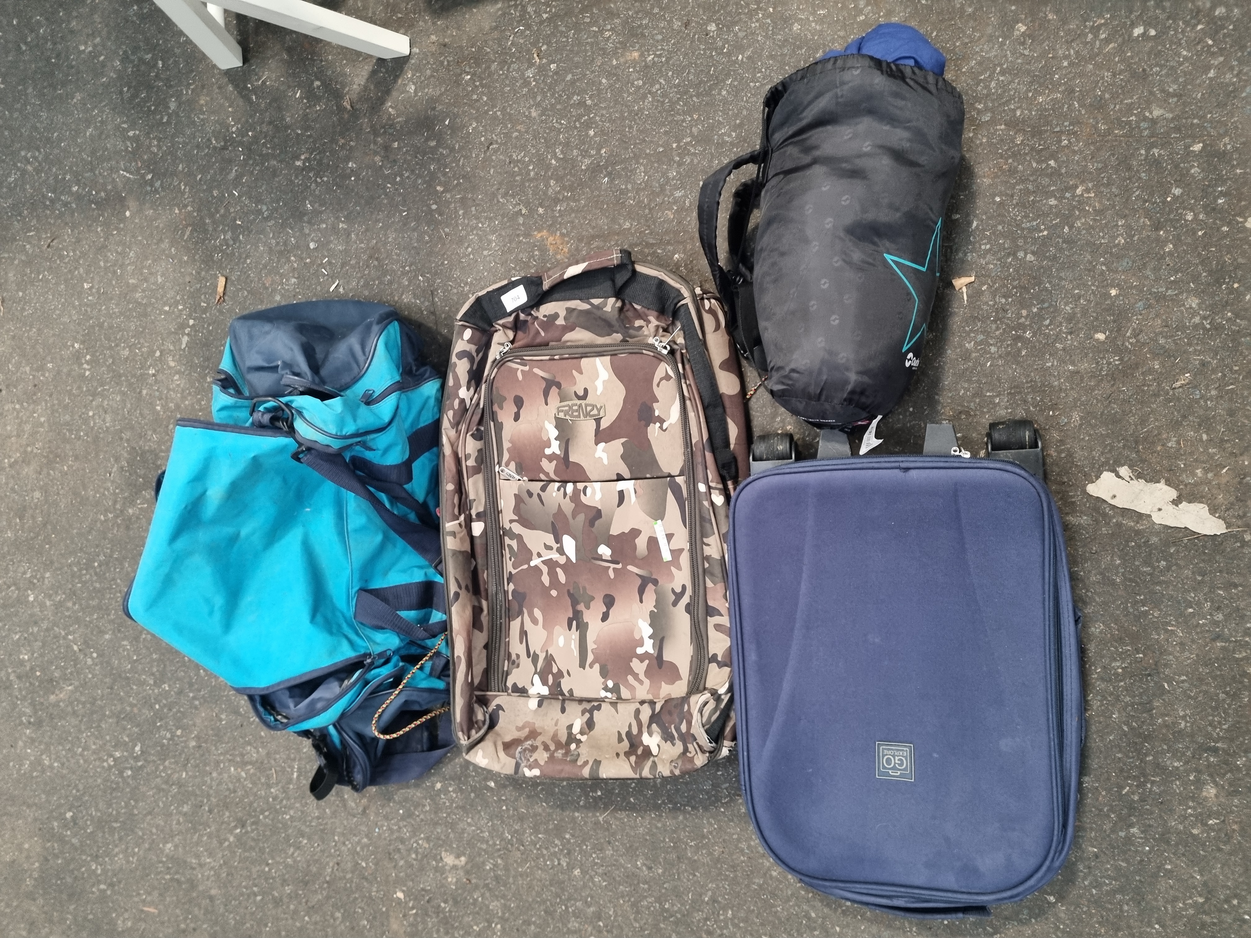 This collection comprises an assortment of synthetic fabric travel and outdoor equipment. It includes a navy blue soft-shell suitcase by GO Explore, featuring a telescopic handle, two rear wheels, and zippered front pockets. The brand name is displayed on a square rubberised patch. Also present is a large multi-compartment rucksack in a woodland-style camouflage pattern of brown, tan, and black, featuring Frenzy branding on the central patch and metal zipper pulls. This bag carries a paper auction lot sticker from Liskeard Auction Rooms numbered 704. The group includes a large teal blue and navy blue duffle bag with webbing carry handles and an adjustable shoulder strap. Additionally, there is a synthetic Outwell sleeping bag housed within a black compression stuff sack featuring a blue star graphic and the brand logo with the slogan explore the outdoors.