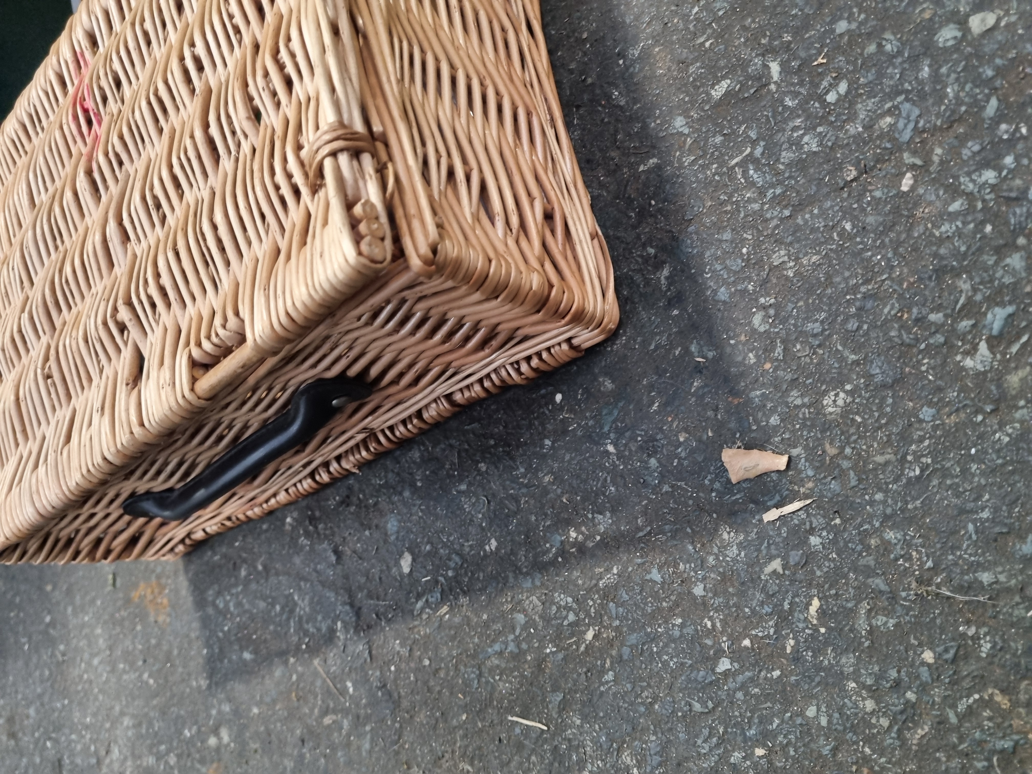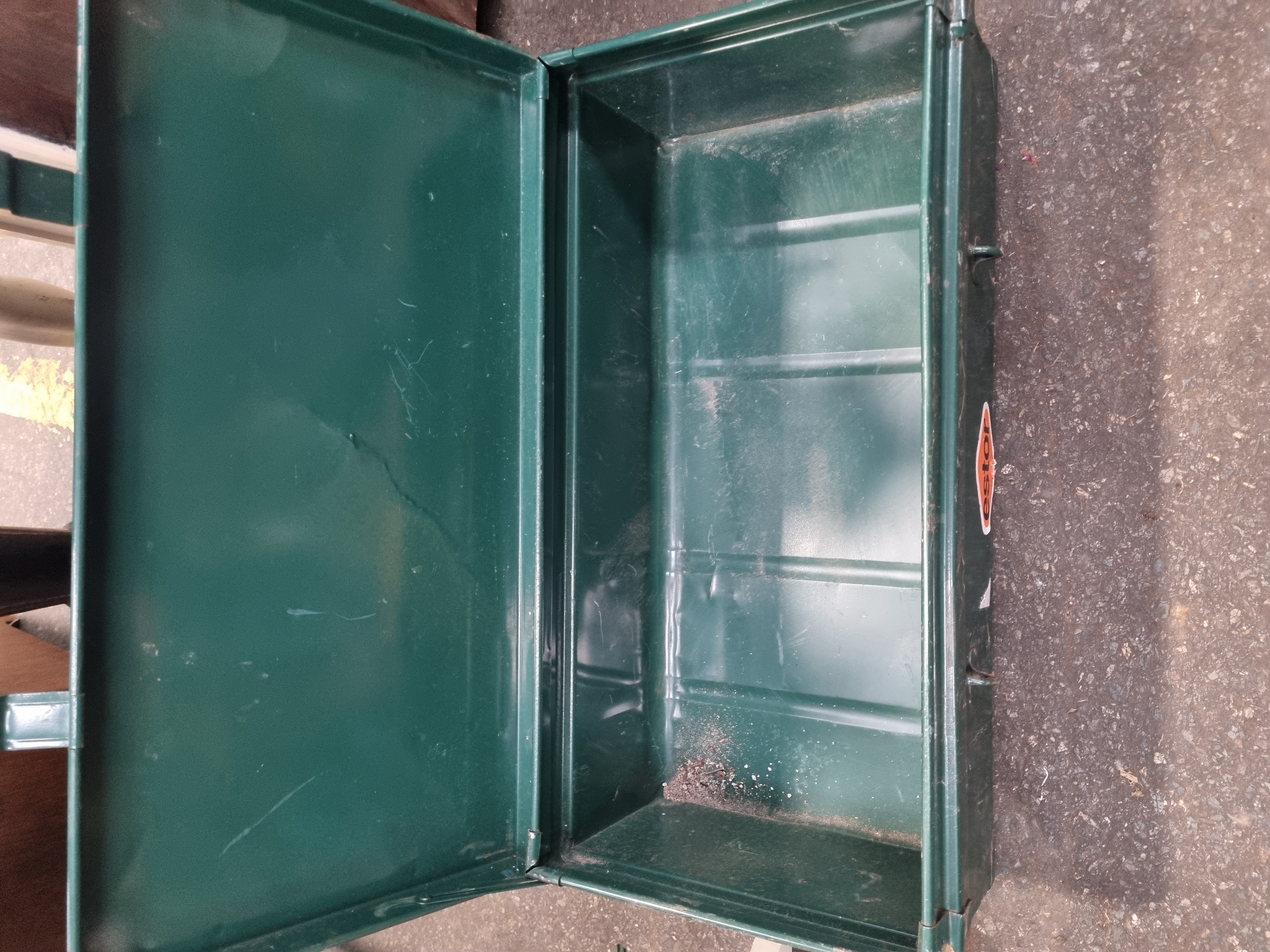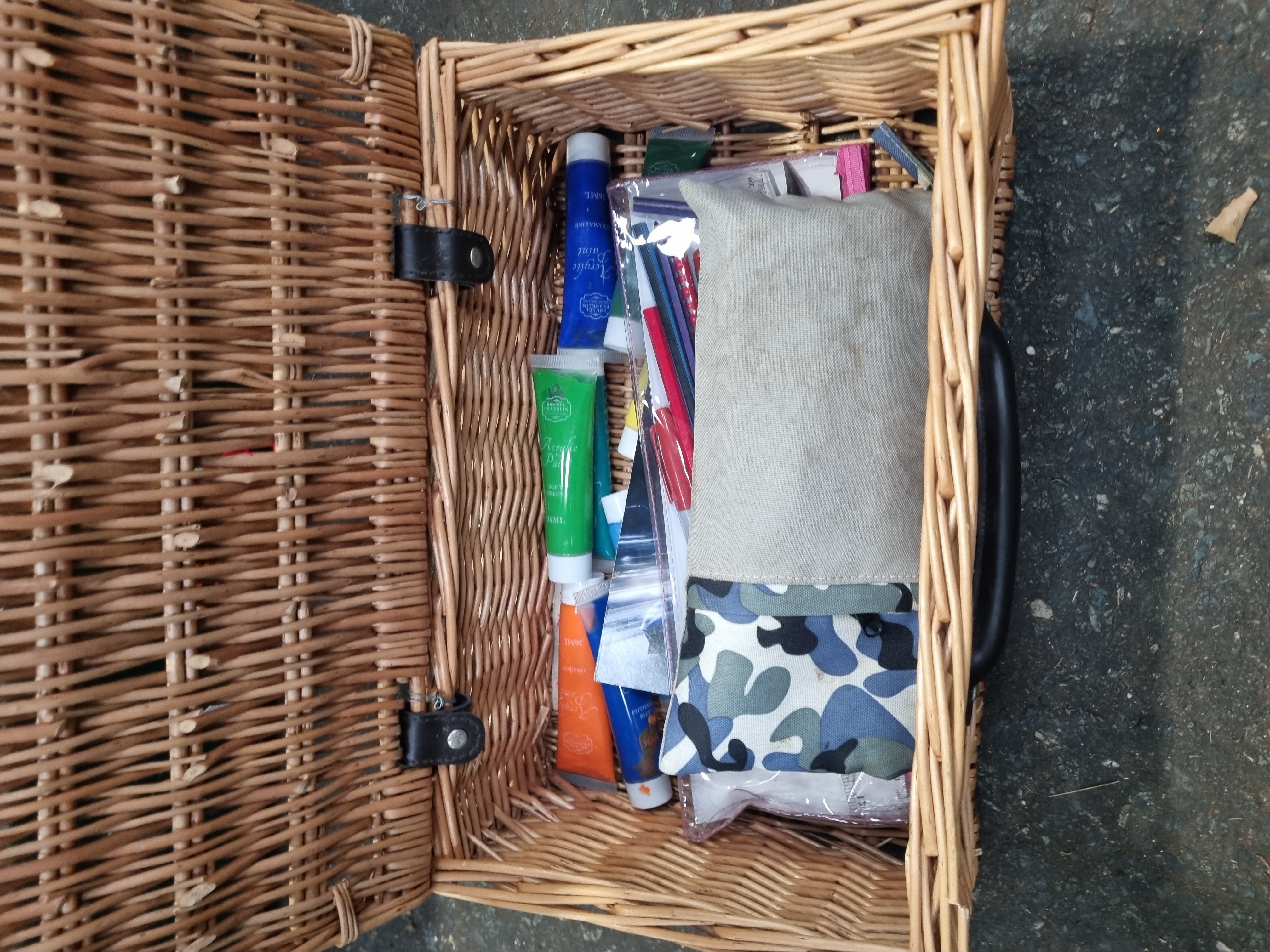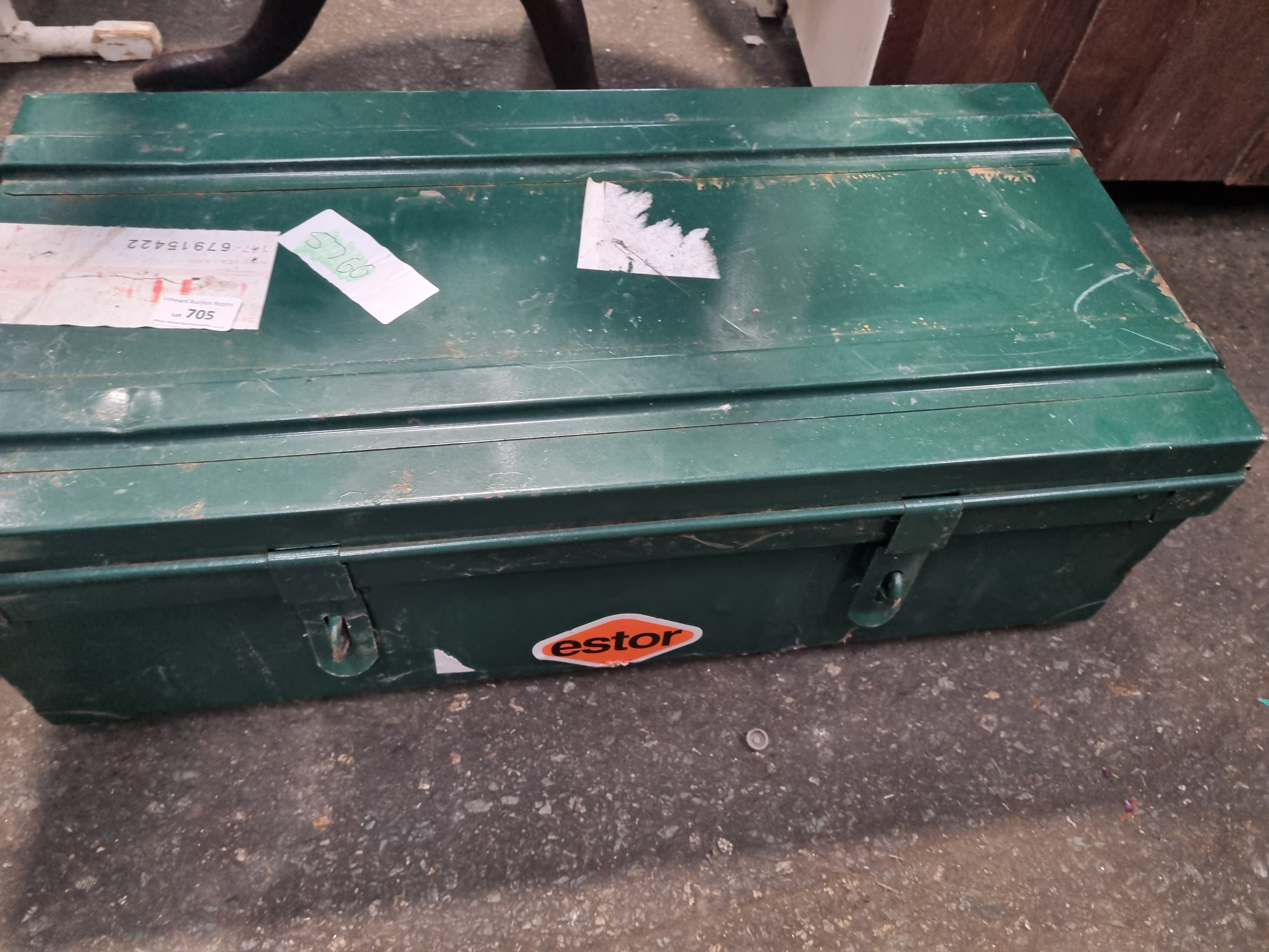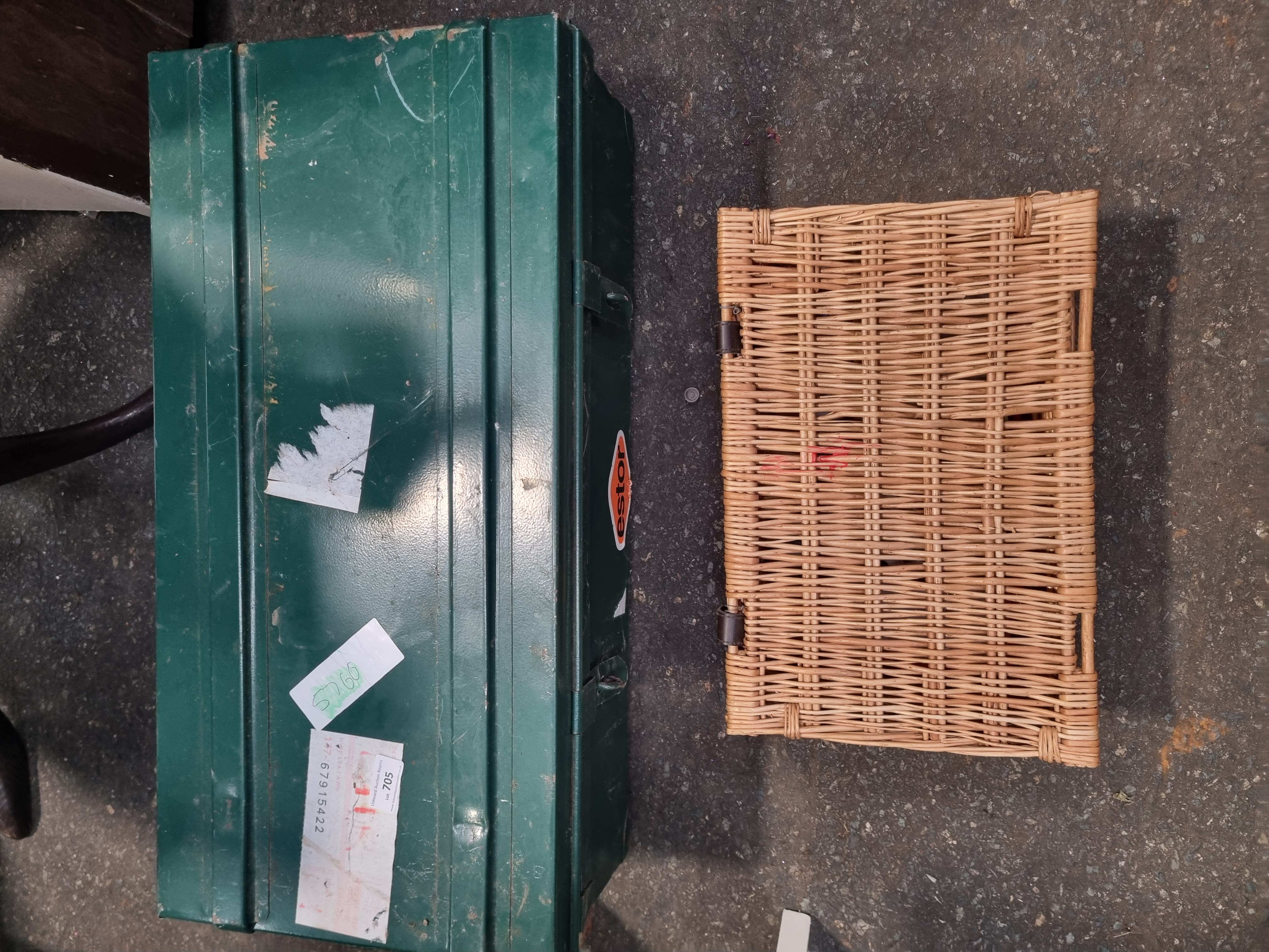 This lot comprises two storage containers. The first is a rectangular utility trunk constructed from green-painted metal. It features a hinged lid secured by two front latch clasps and bears a central oval decal for the brand Estor. The trunk is marked with several adhesive labels, including a Liskeard Auction Rooms tag for lot 705. The interior of the trunk is empty. The second item is a rectangular woven wicker basket with a black plastic carry handle and leather-style hinges. It contains an assortment of artist materials, including various tubes of acrylic paint, a tan canvas pouch, a camouflage-patterned zippered case, and a selection of pens and pencils.