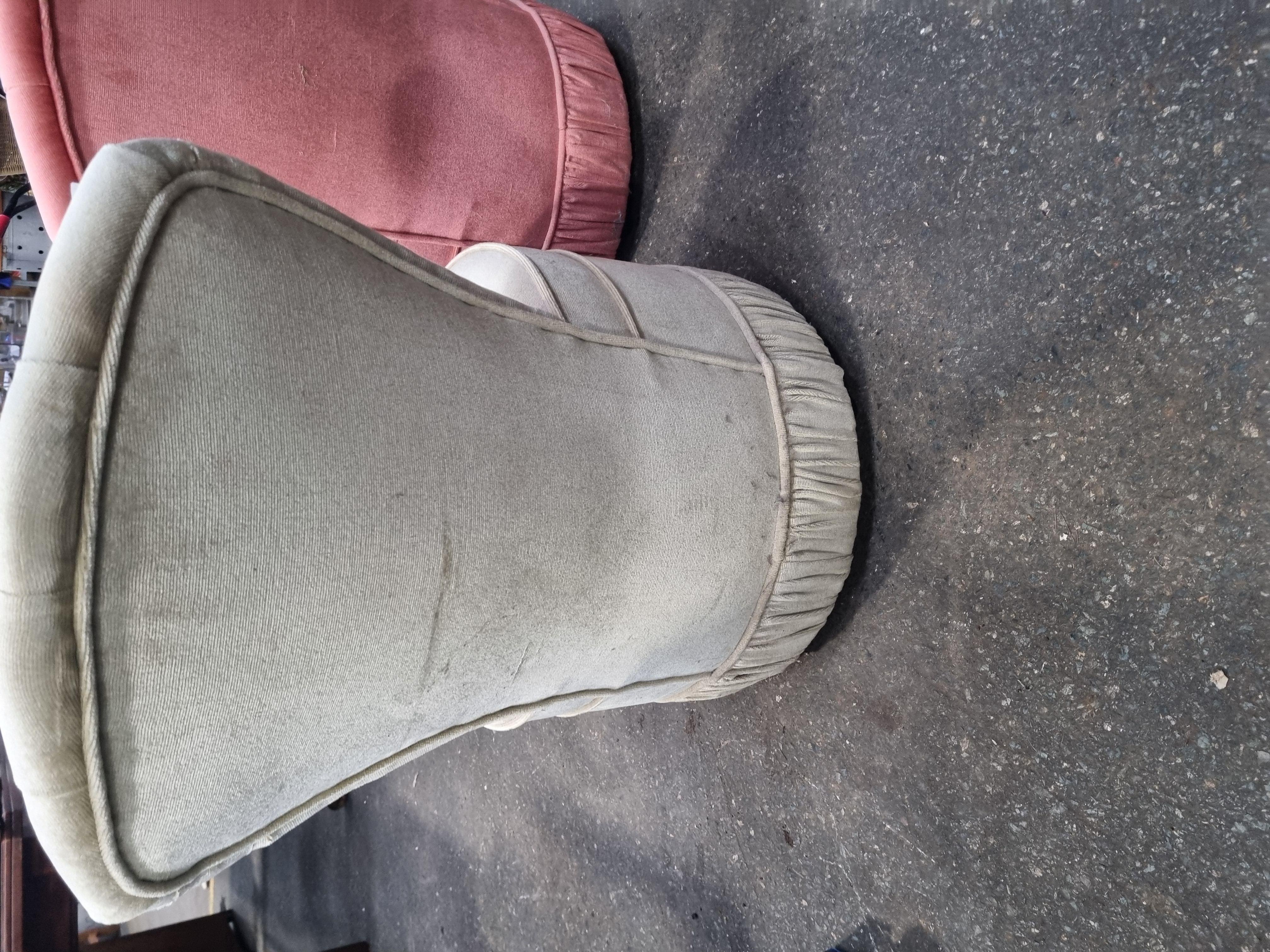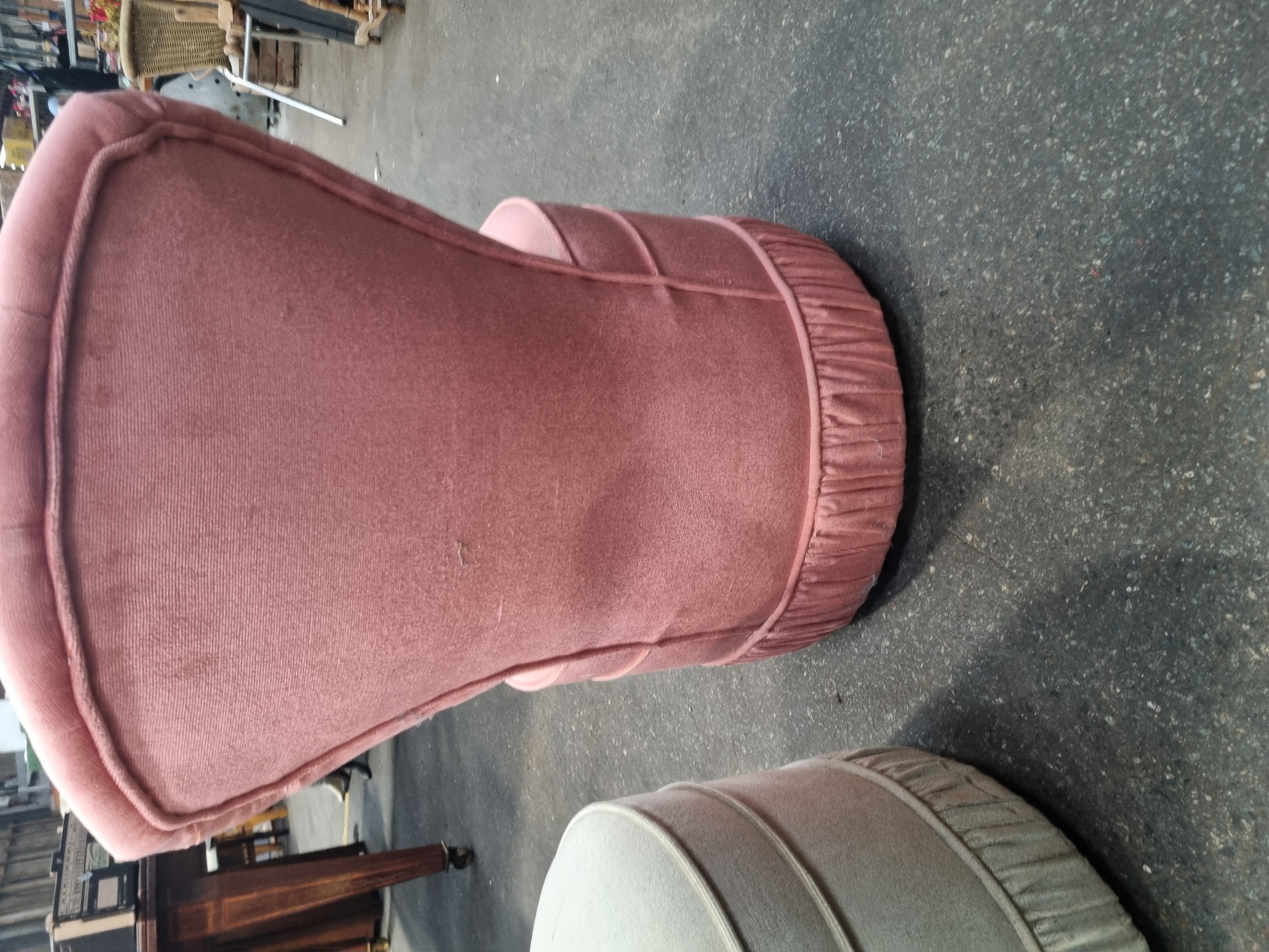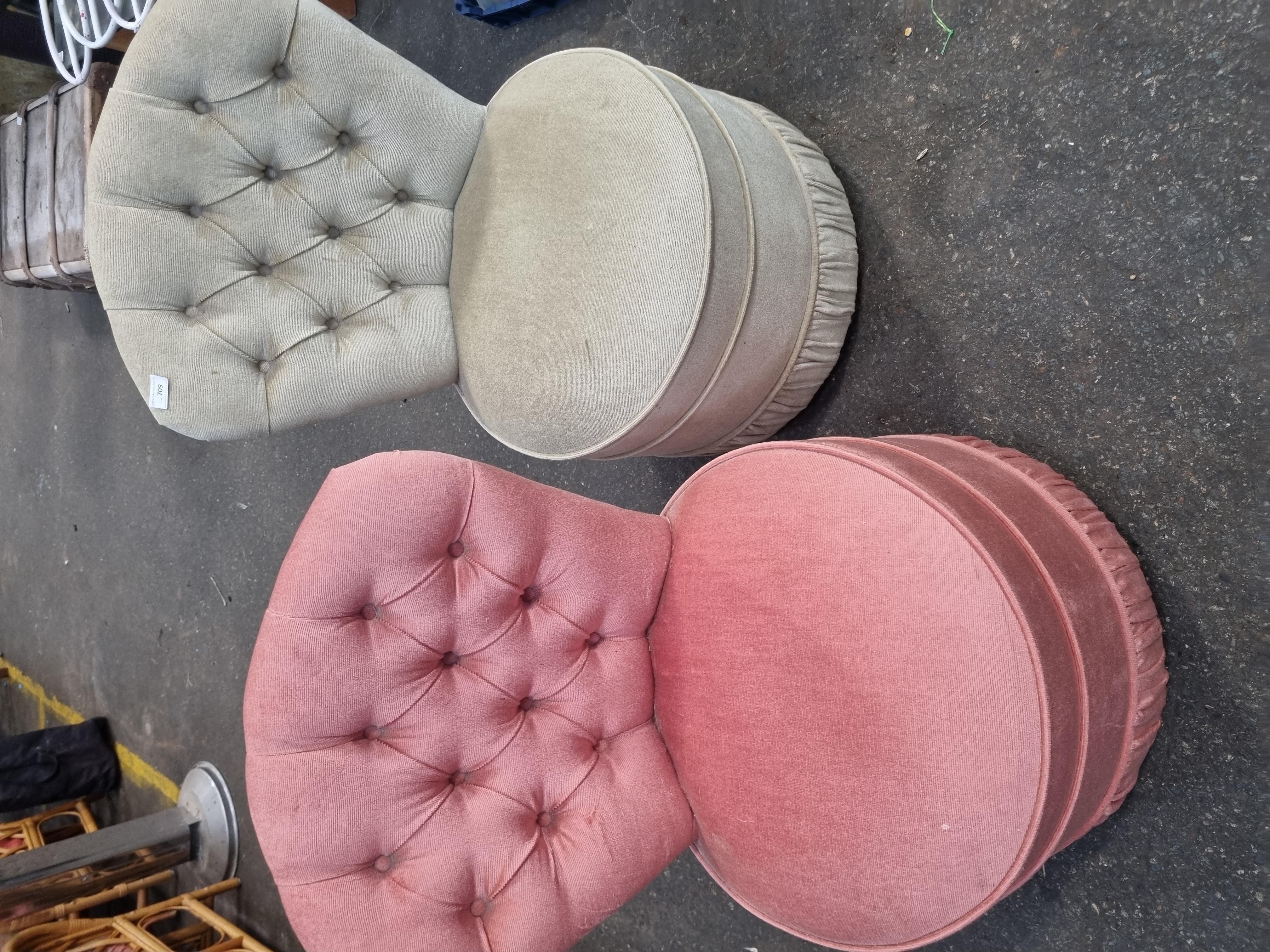A pair of low-seated, armless boudoir or slipper chairs dating from the mid-20th century. Both chairs feature a circular seat design and flared backrests decorated with deep button-tufting. One chair is upholstered in a pale sage green corded fabric, while the other is finished in a rose pink velvet. The bases of both chairs are concealed by a gathered, pleated skirt. The construction consists of fully upholstered frames with no visible wood species.