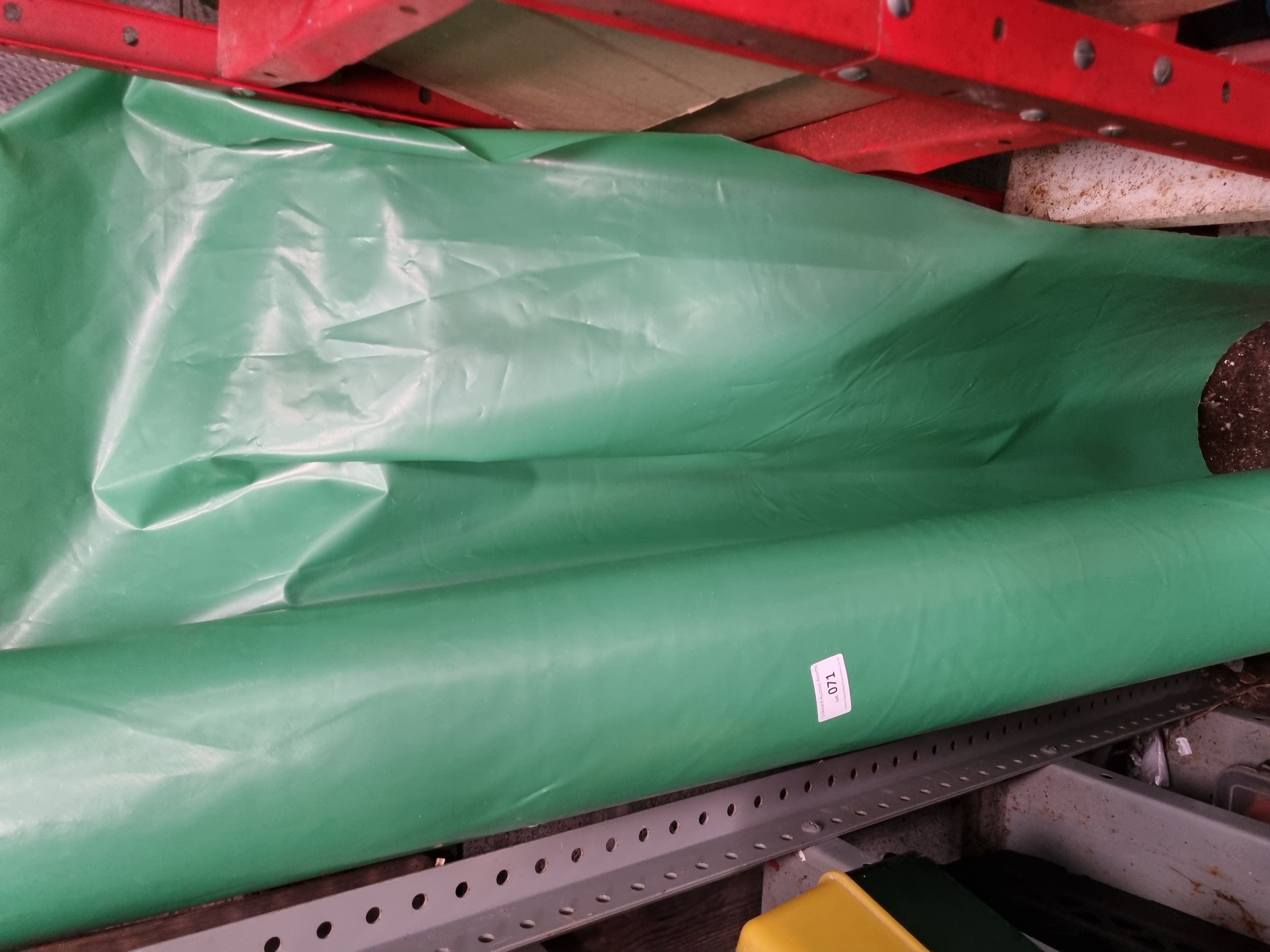 A roll of green 125mu vapour control layer, manufactured from heavy-duty polythene sheeting. This material is designed for use in construction and industrial applications as a moisture barrier. The item is a partially used remnant and does not feature any visible manufacturer branding or original packaging. A small white adhesive sticker is present on the body of the roll with the text Izzard Auction Rooms Lot 071.