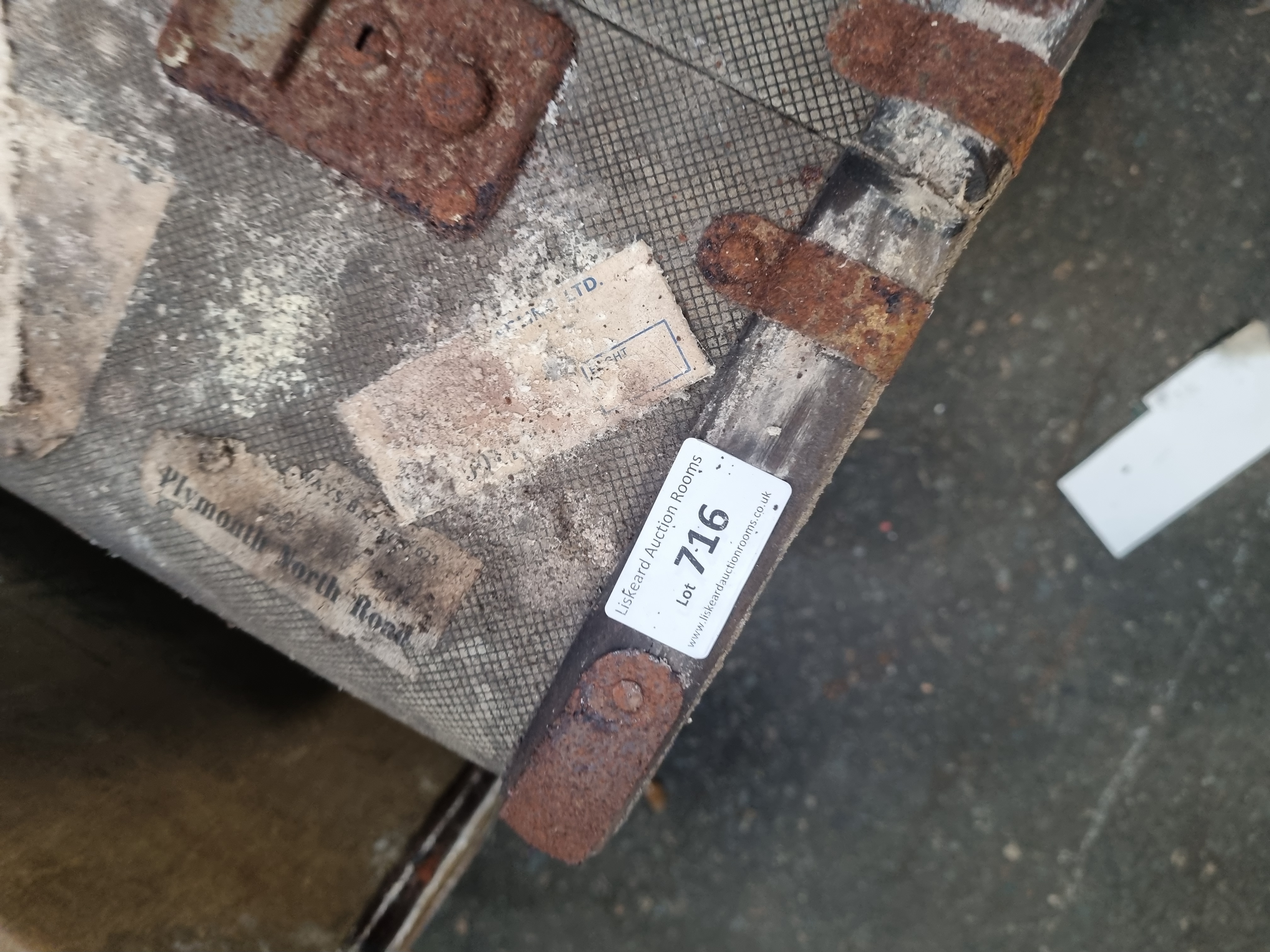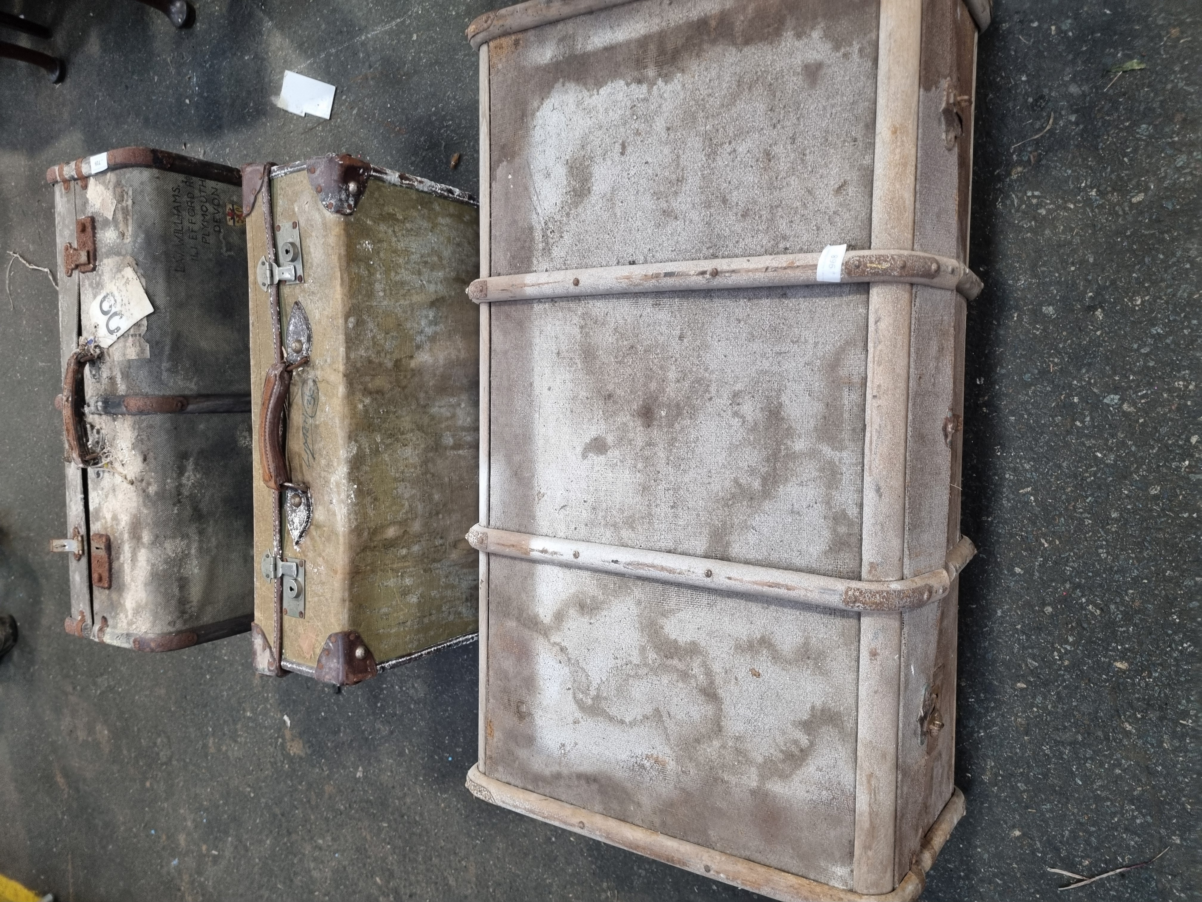 A collection of vintage travel luggage including a large steamer trunk and two suitcases of varying sizes. The steamer trunk is constructed with a canvas-covered body, reinforced with longitudinal wooden slats and metal hardware including latches and corner brackets. One suitcase features a hard-sided exterior with a leather carry handle and twin metal flip-locks. The second suitcase is a travel case with heavy metal corner reinforcements and a textured surface. Notable markings include a stencilled name and address reading W. WILLIAMS 110 EFFORD RD PLYMOUTH DEVON, a handwritten inscription LYNCH (26), and a partial paper railway label for Plymouth North Road station. A contemporary auction label for Liskeard Auction Rooms Lot 716 is also present.