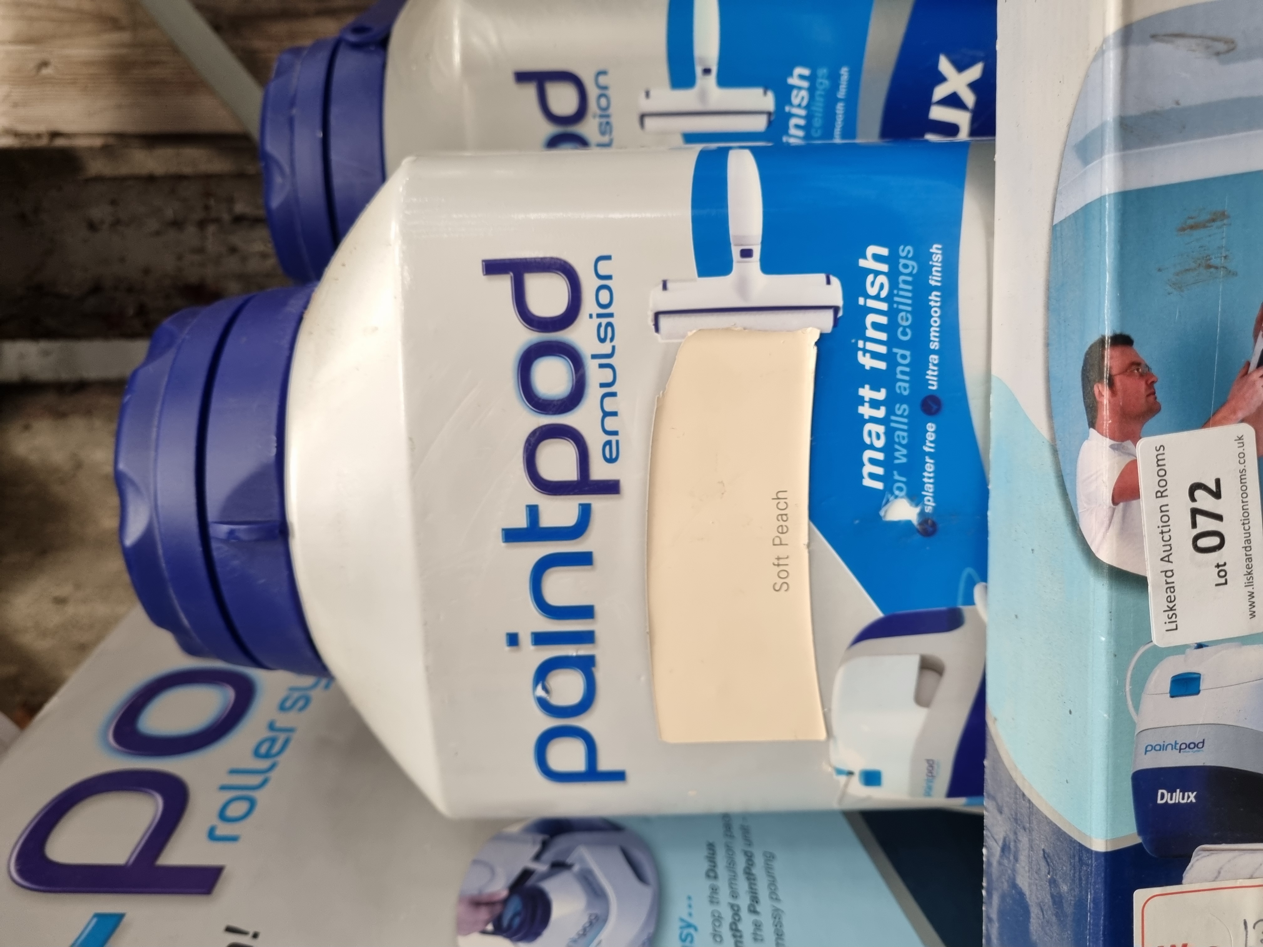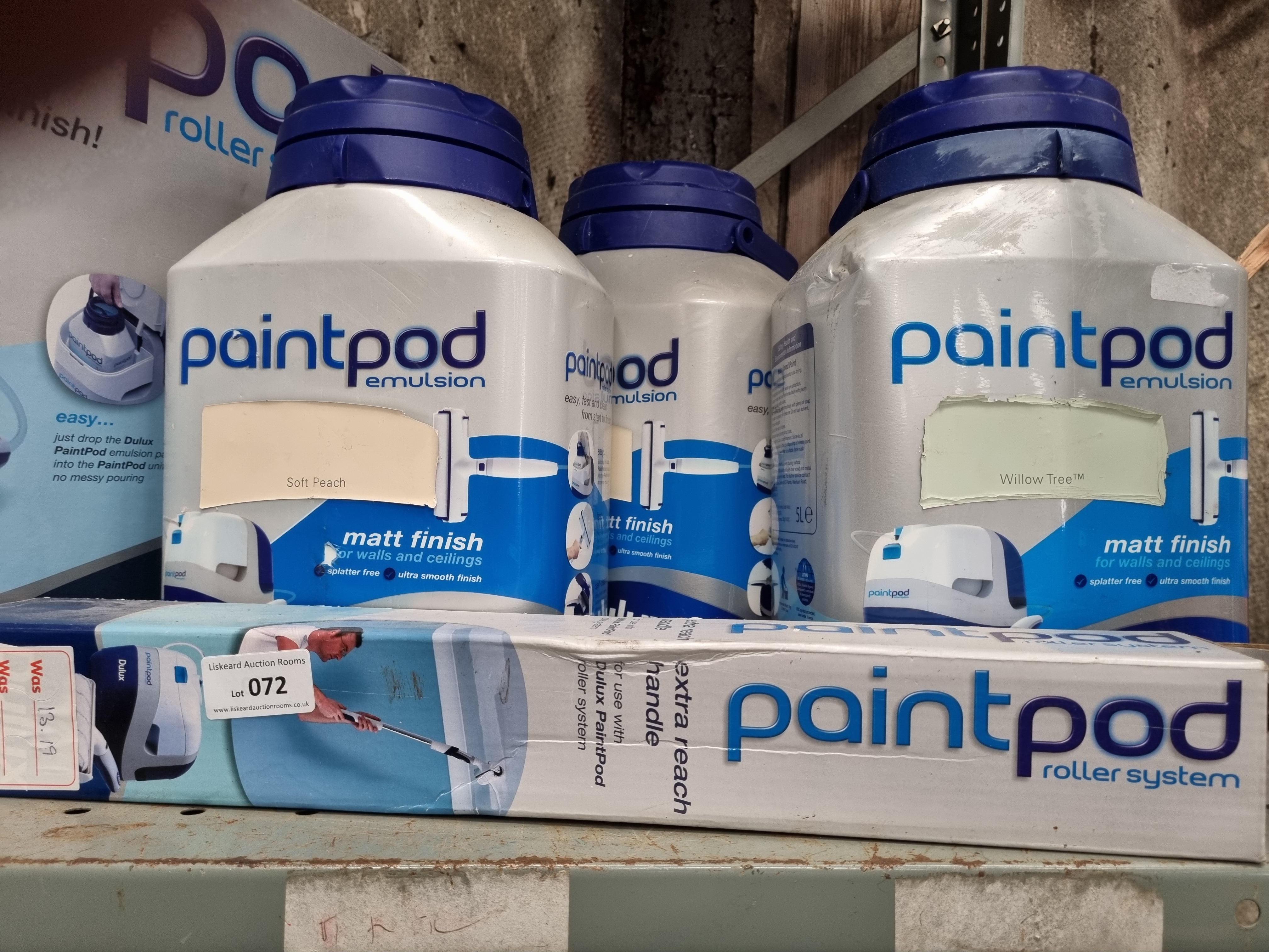 This lot features a collection of Dulux PaintPod decorating products. The assortment includes a Dulux PaintPod roller system in its original box, a PaintPod extra reach handle in original packaging, and several 5L containers of Dulux PaintPod emulsion. The paint is a matt finish designed for walls and ceilings, with identified colours including Soft Peach and Willow Tree. The extra reach handle box displays a Liskeard Auction Rooms sticker for Lot 072 and handwritten price stickers showing a reduction from 13.19 to 6.59. The main roller system box specifies that paint is not included within that unit. The containers are constructed from plastic with integrated handles and screw-top lids.