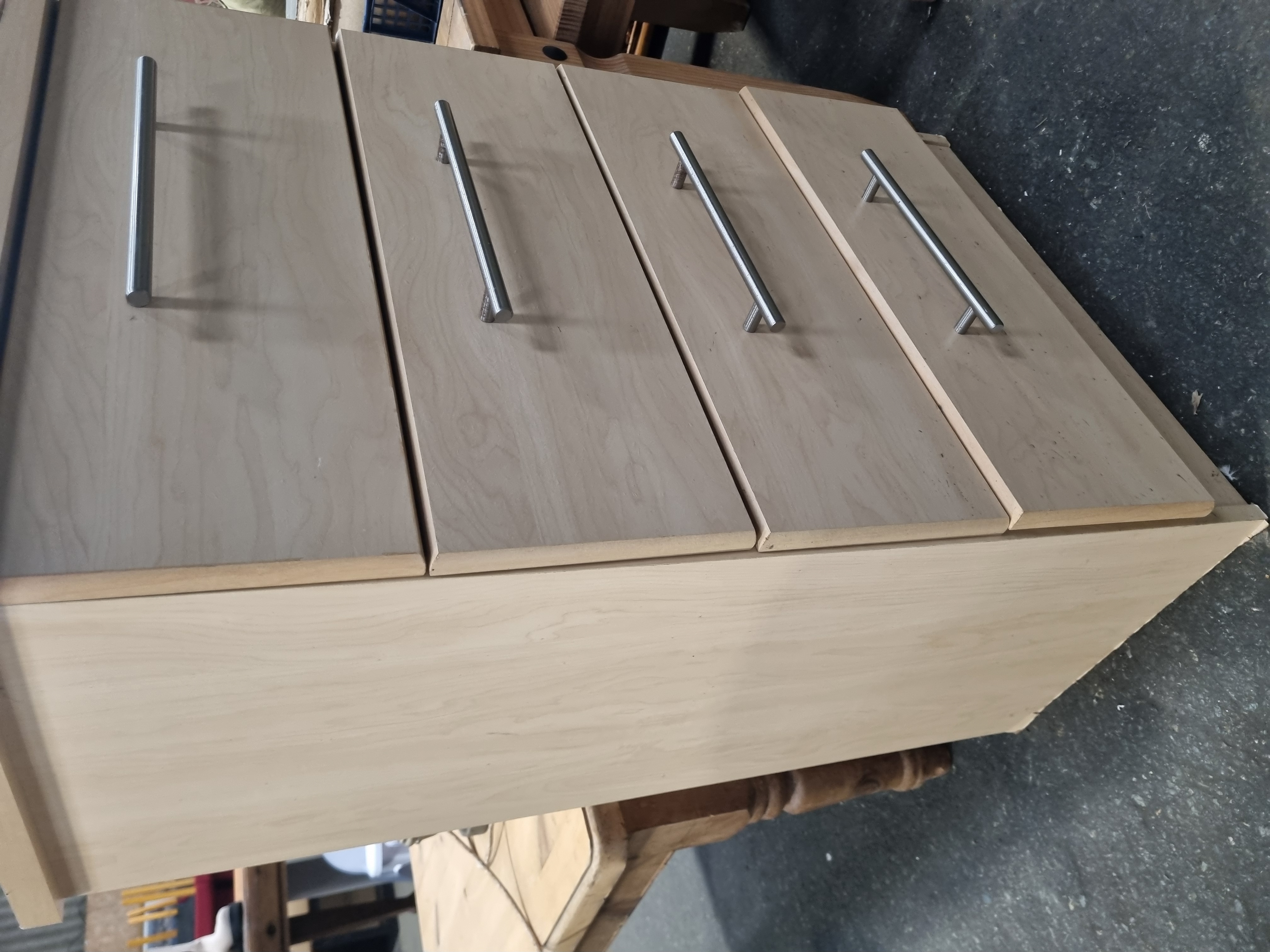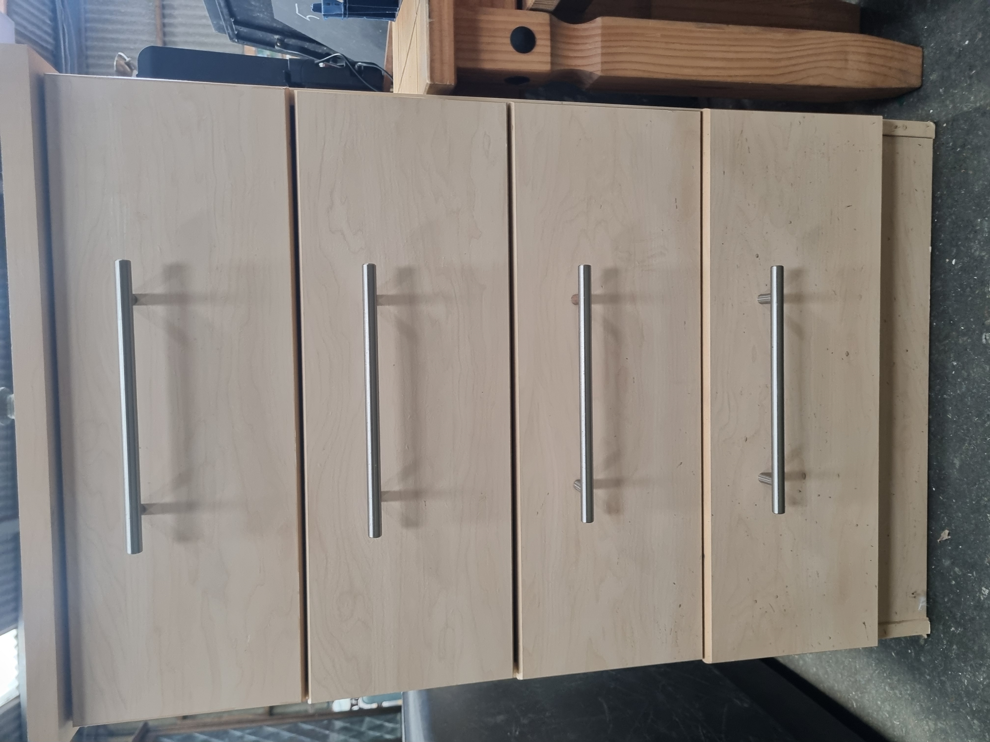 A contemporary four-drawer chest of drawers featuring a light-toned wood-effect laminate finish over a composite board substrate. The piece is designed with minimalist lines and stands on a recessed plinth base. Each of the four drawers is equipped with a long, cylindrical bar handle in a brushed-metal finish. The internal construction of the drawers is not visible.