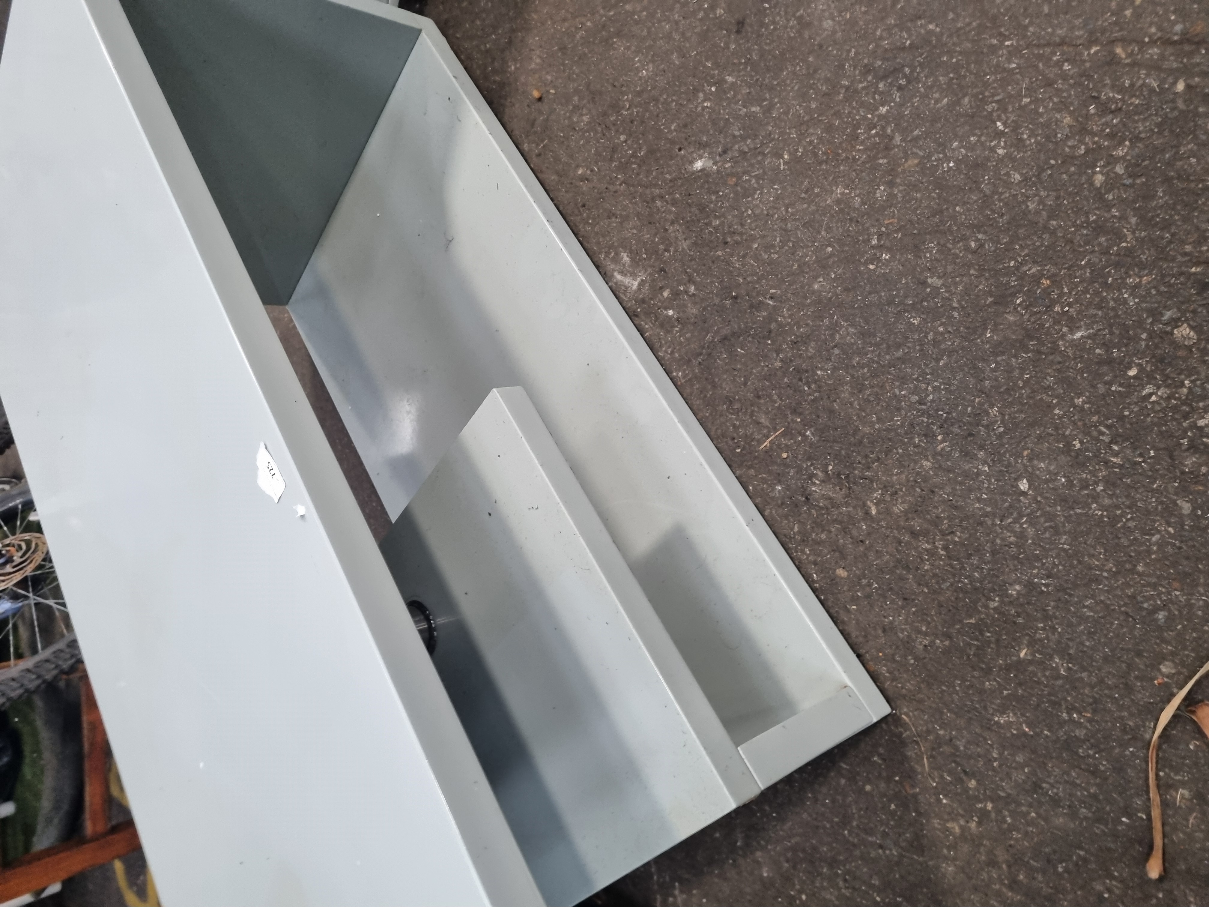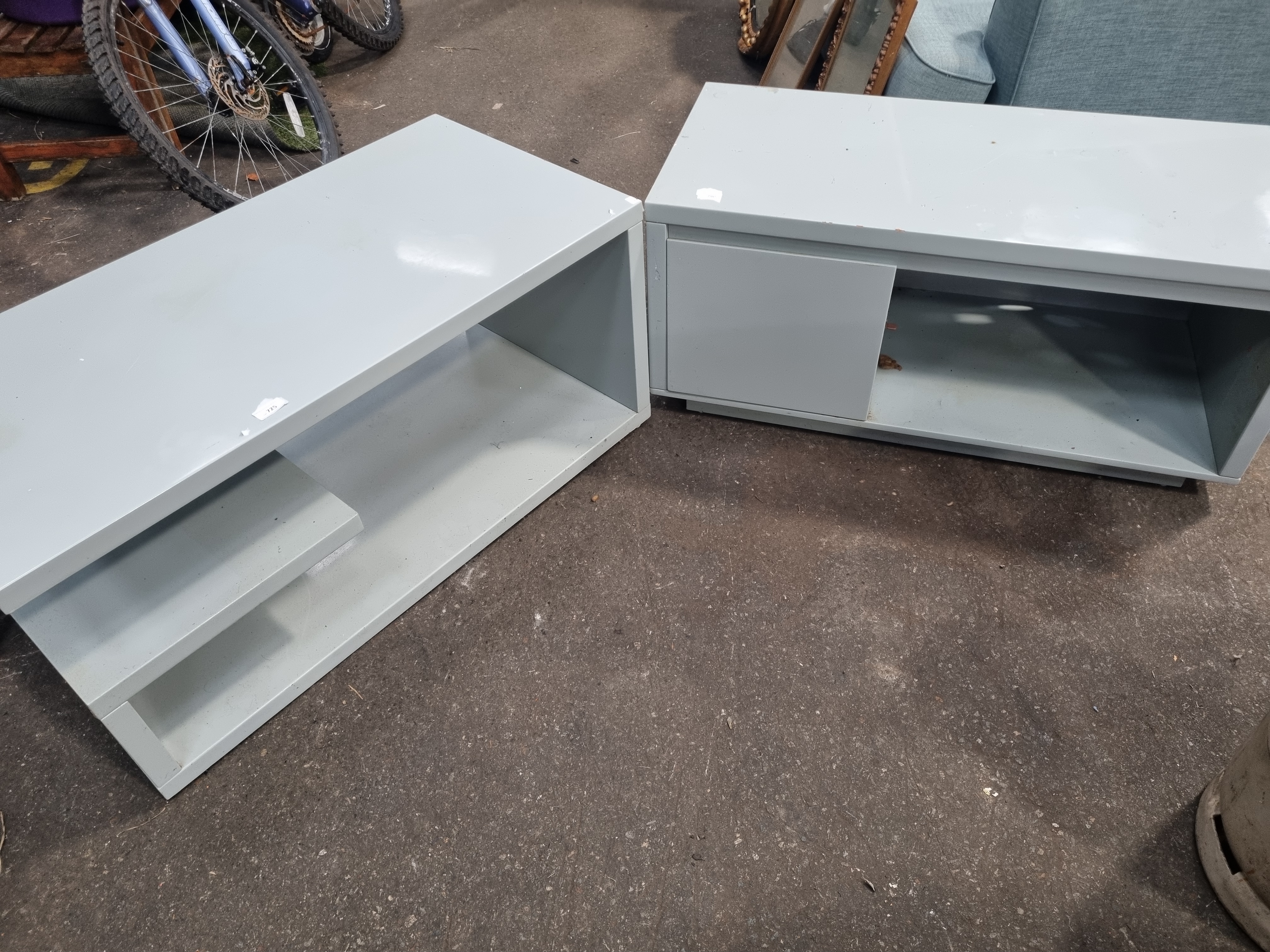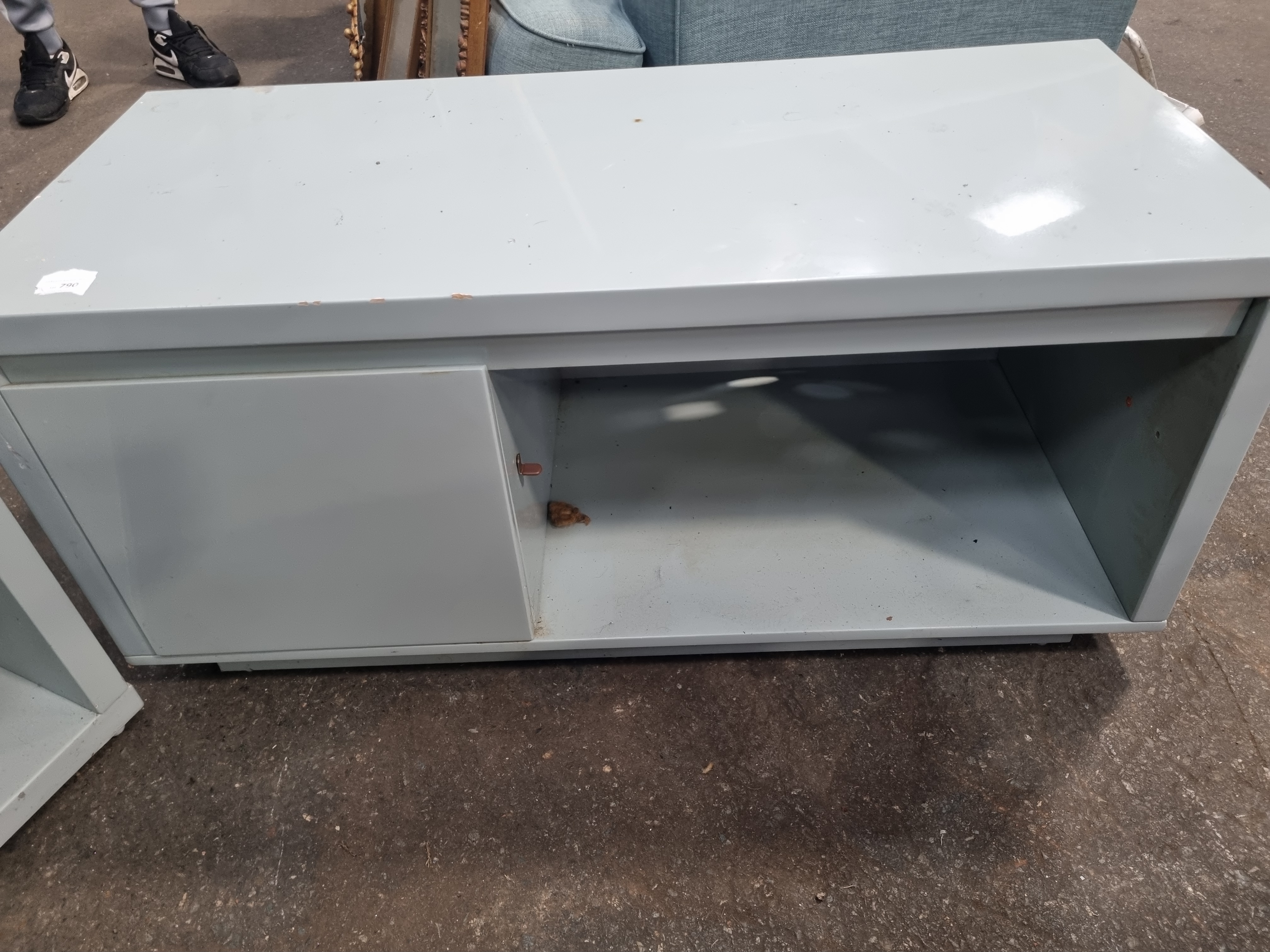A pair of contemporary industrial-style low tables or media units constructed from sheet metal with a light grey powder-coated finish. One unit features an open box frame design with a single integrated internal shelf. The second unit is configured with a cupboard on the left side, featuring a hinged door and a lock with key present, adjacent to an open storage compartment. Both pieces are set on recessed plinth bases. Small white inventory stickers numbered 725 and 790 are present on the top surfaces. No maker’s marks or factory stamps are visible.