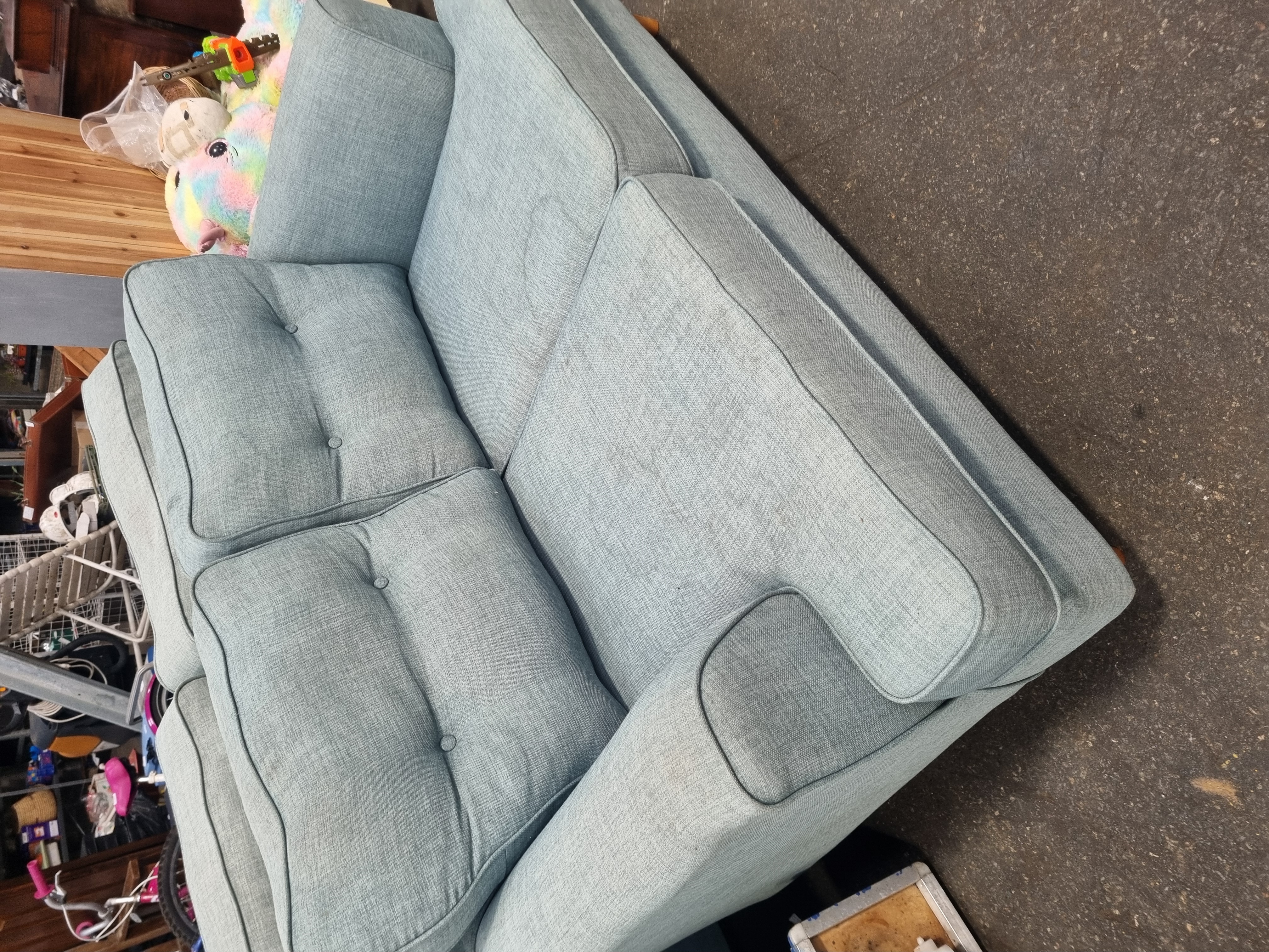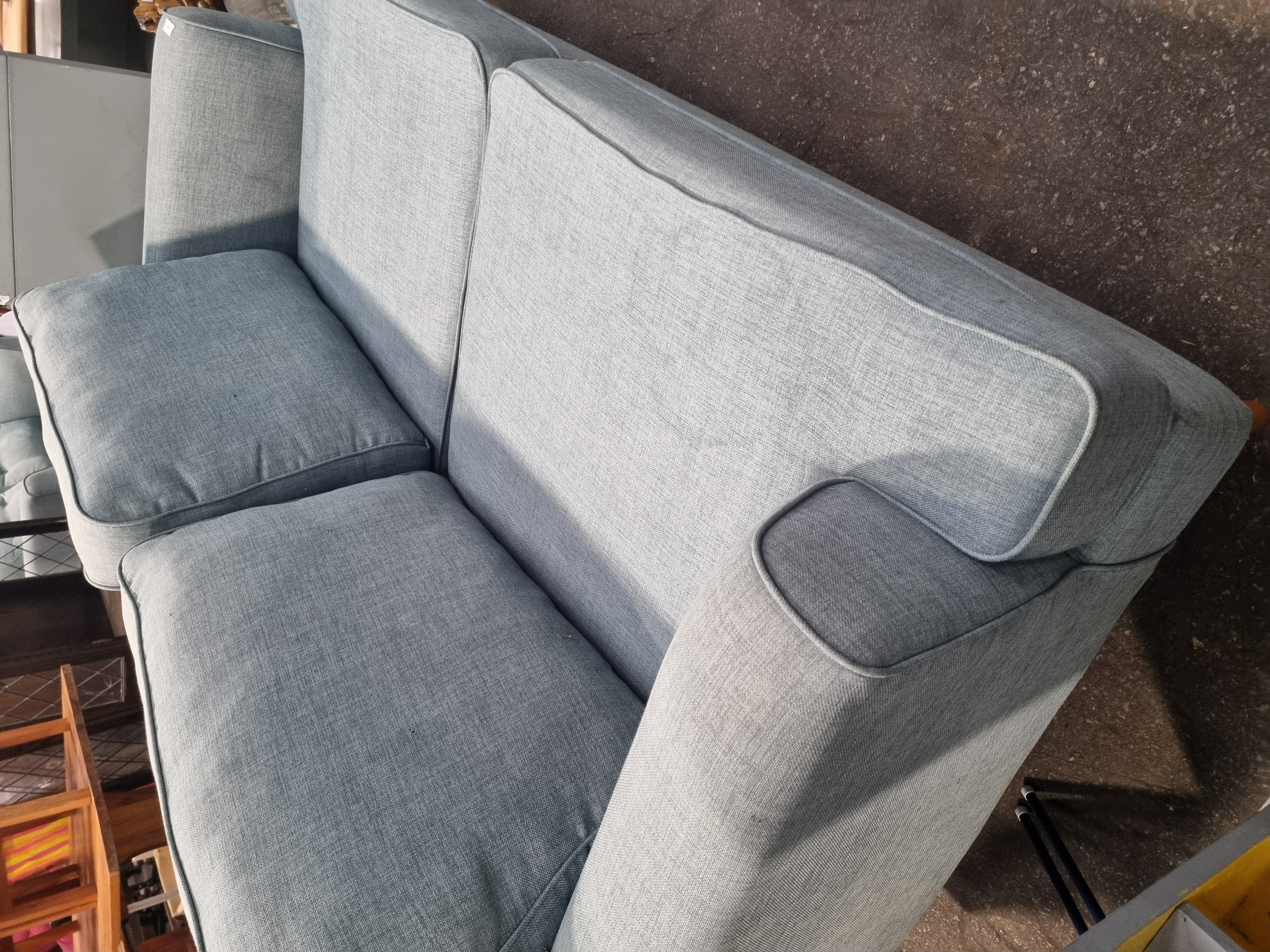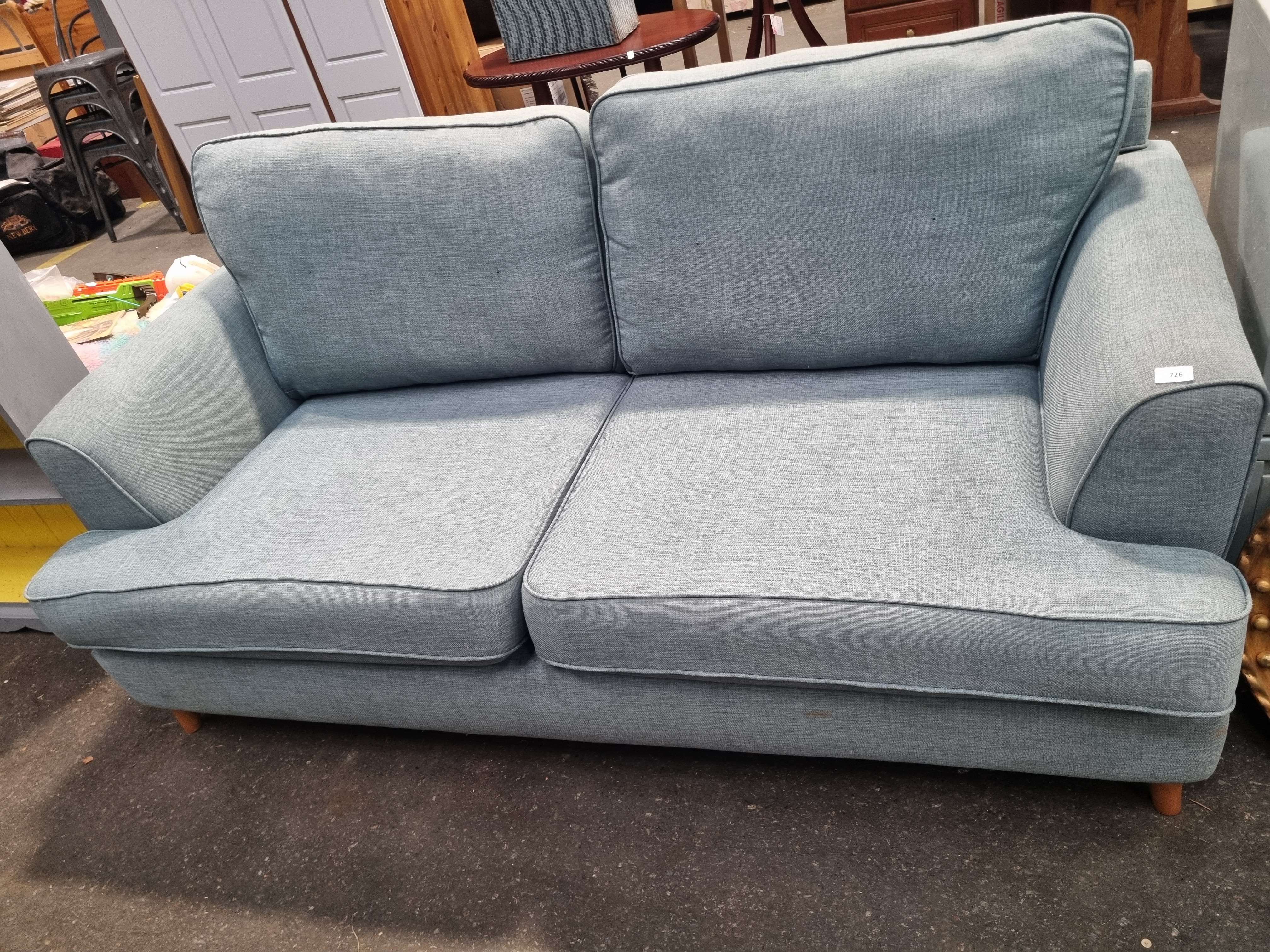 This is an Azlyn two-seater loveseat, a contemporary furniture piece influenced by mid-century modern design. The sofa is upholstered in a light blue-grey textured woven fabric, featuring piped edging along the seams of the arms and cushions. It is elevated on four tapered, round wooden legs with a light natural finish. The unit includes two removable seat cushions and two reversible back cushions, allowing for a choice between a plain surface or a button-tufted appearance with two buttons per cushion. A small white rectangular adhesive label marked with the lot number 726 is present on the outer right arm. No other manufacturer marks or labels are visible.