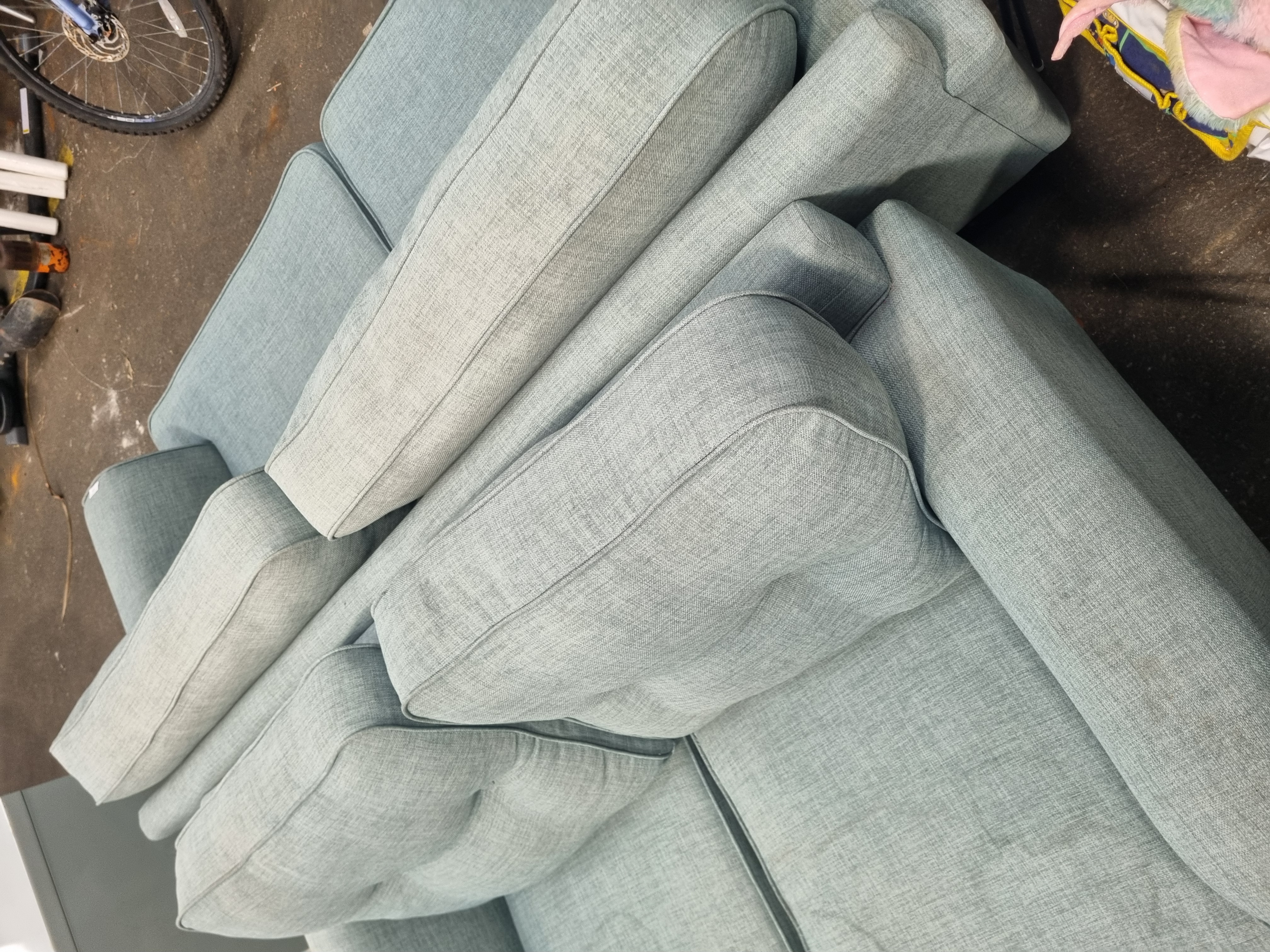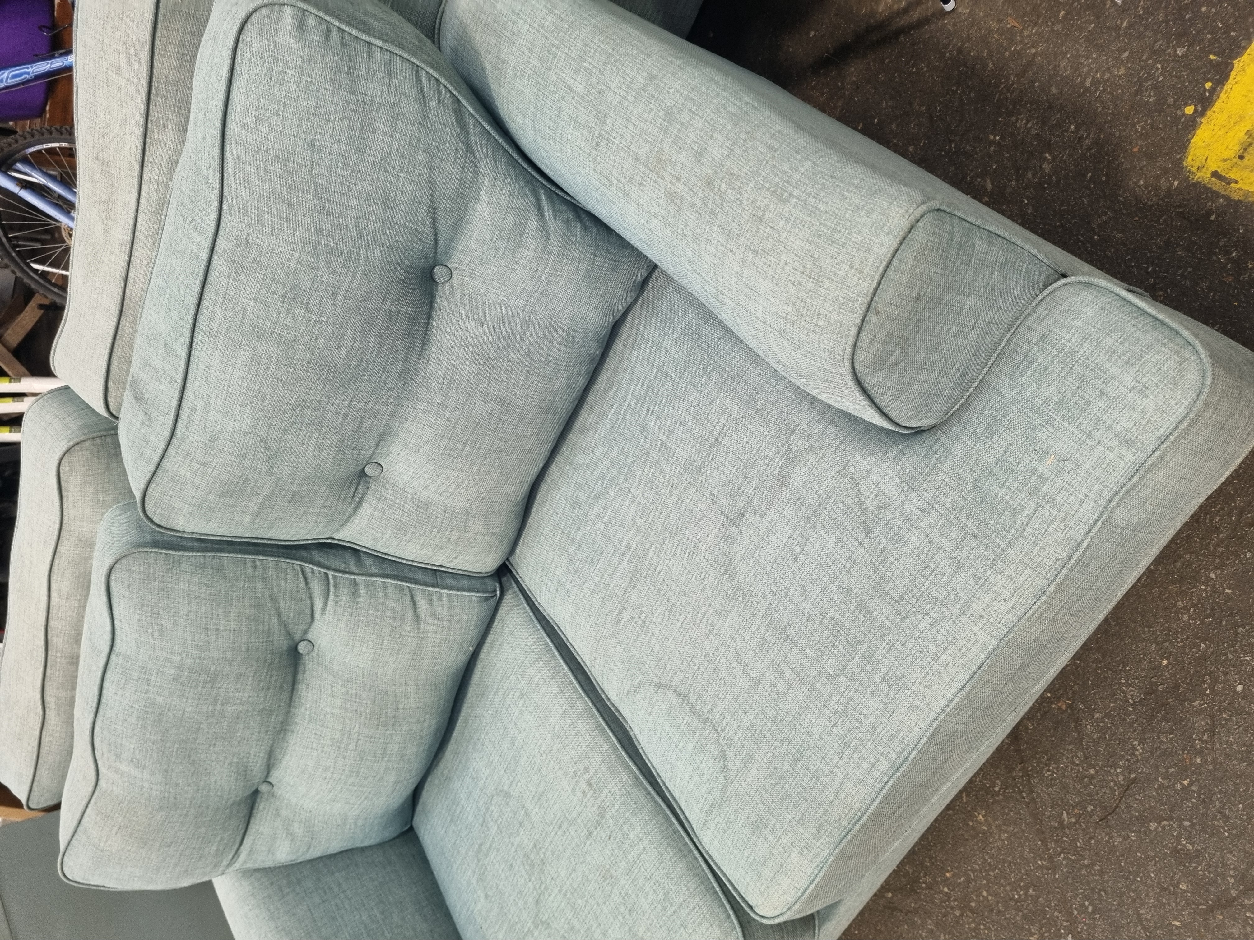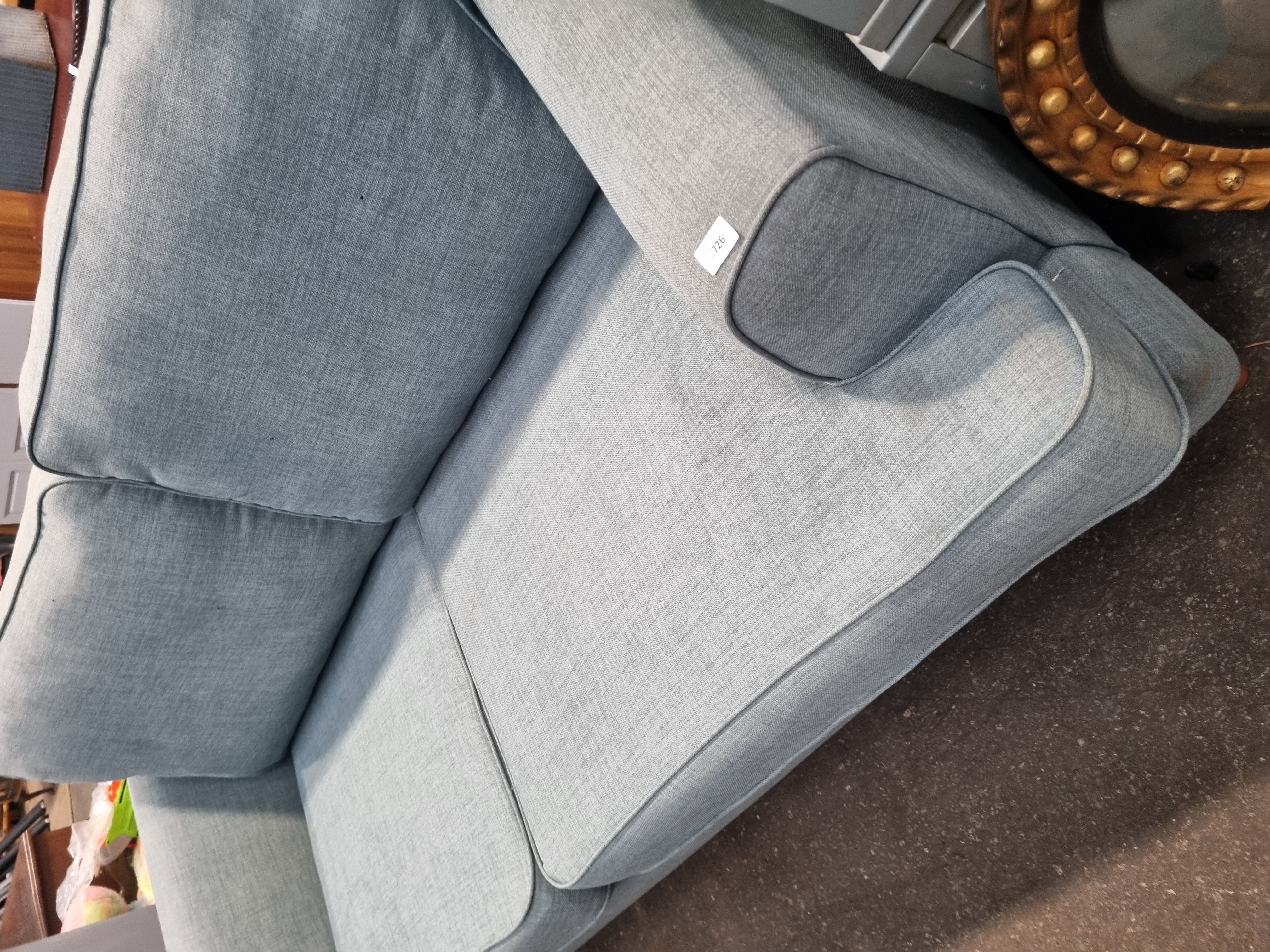This is an Azlyn two-seater loveseat, a contemporary furniture piece influenced by mid-century modern design. The sofa is upholstered in a light blue-grey textured woven fabric, featuring piped edging along the seams of the arms and cushions. It is elevated on four tapered, round wooden legs with a light natural finish. The unit includes two removable seat cushions and two reversible back cushions, allowing for a choice between a plain surface or a button-tufted appearance with two buttons per cushion. A small white rectangular adhesive label marked with the lot number 726 is present on the outer right arm. No other manufacturer marks or labels are visible.