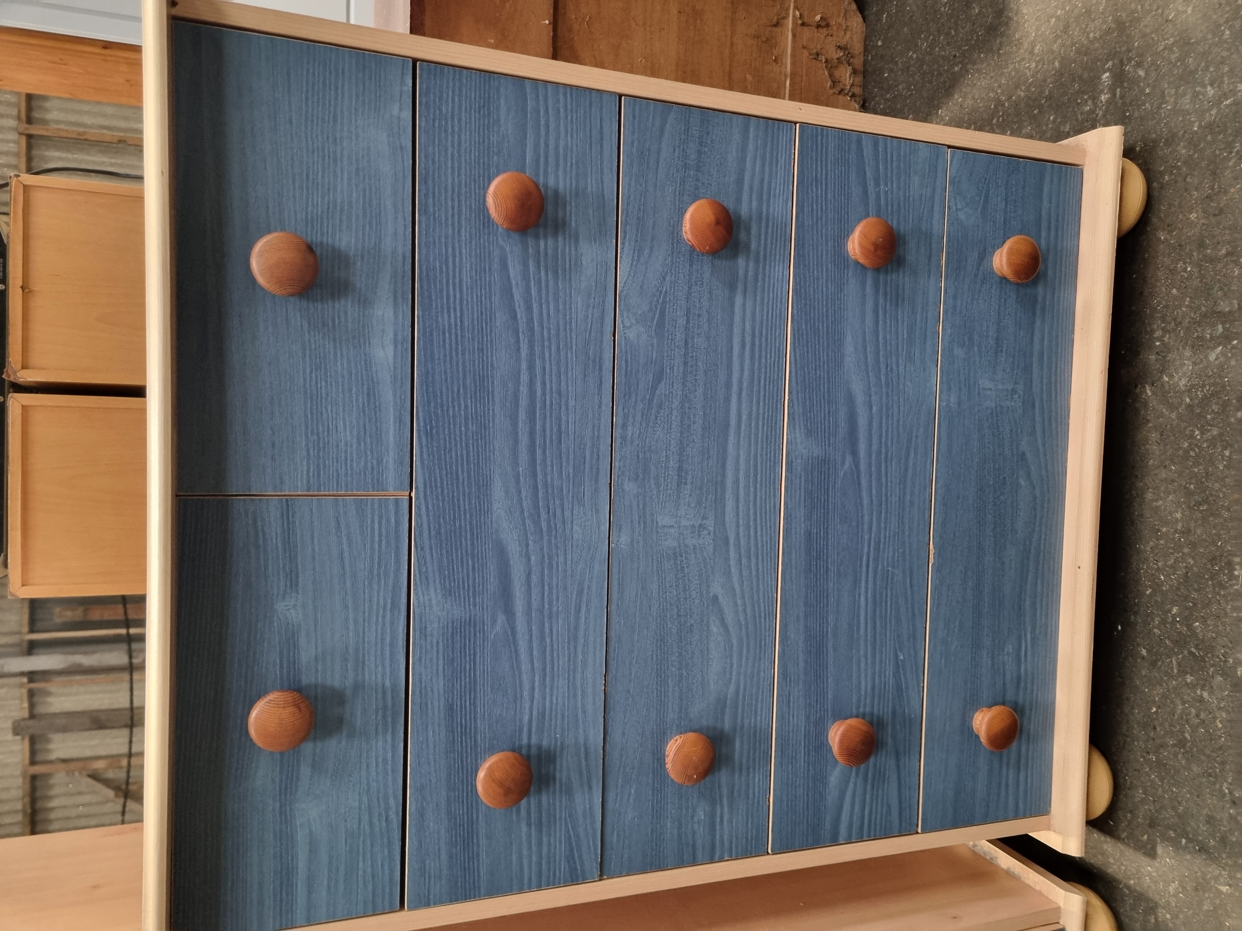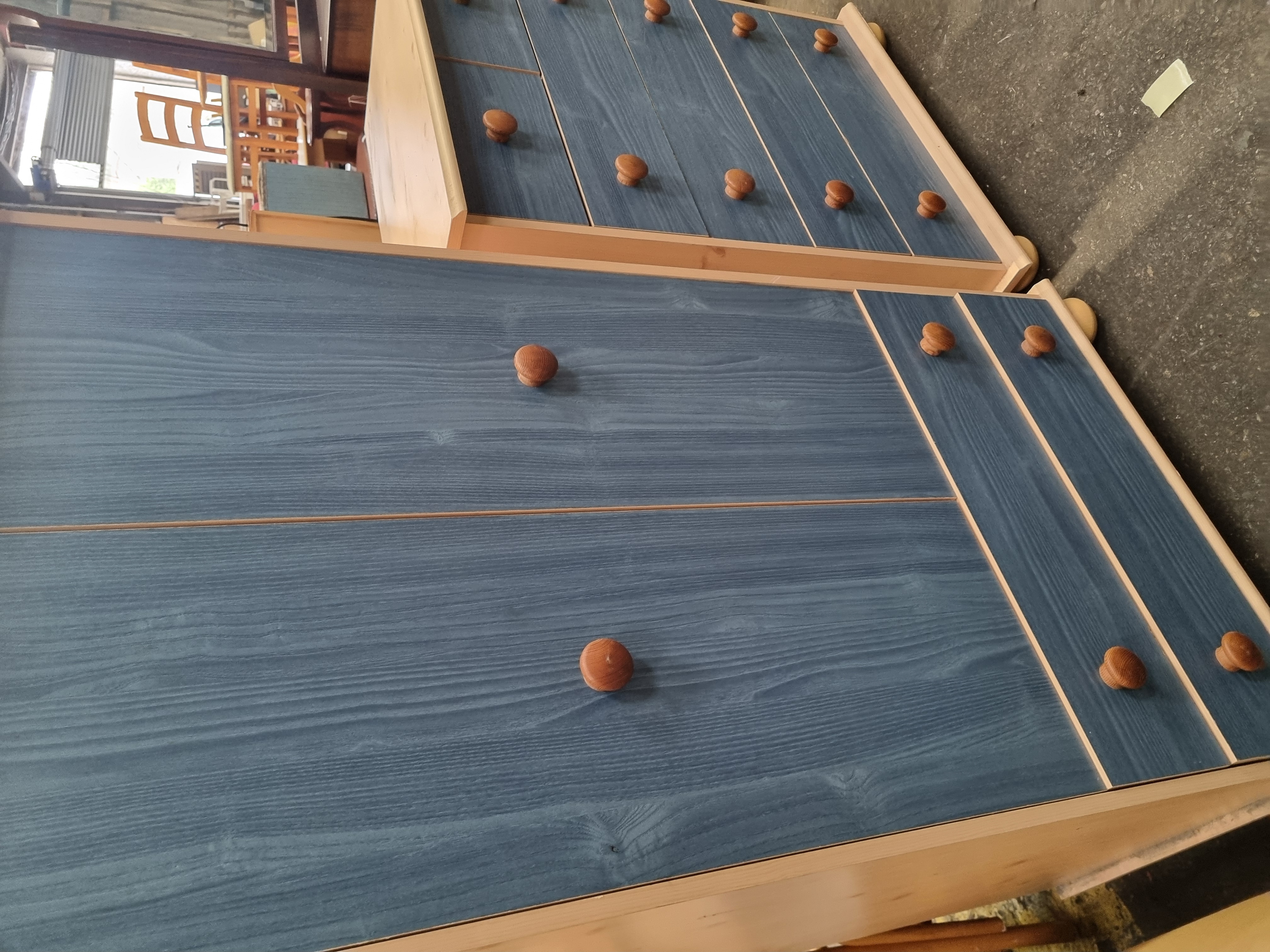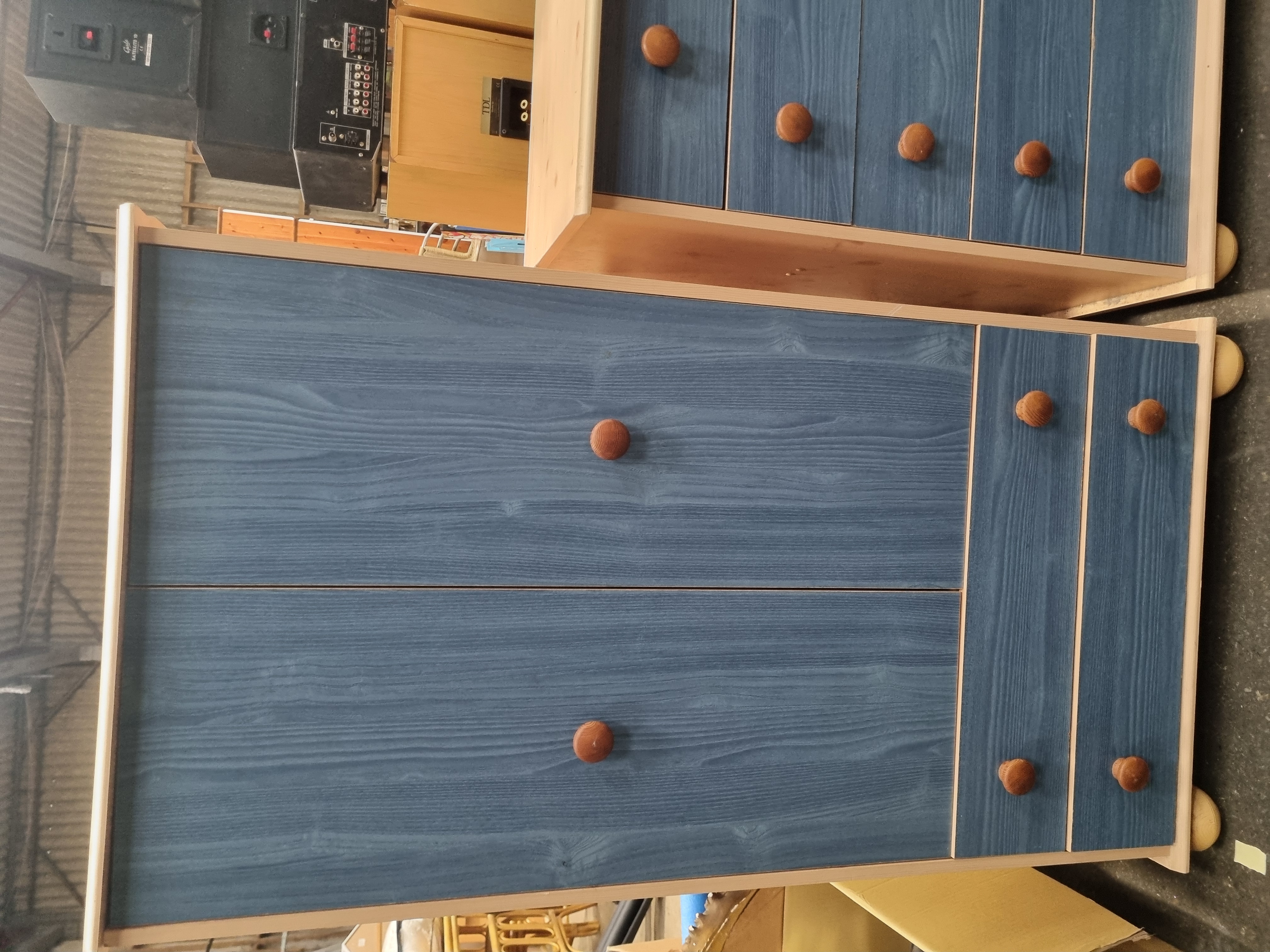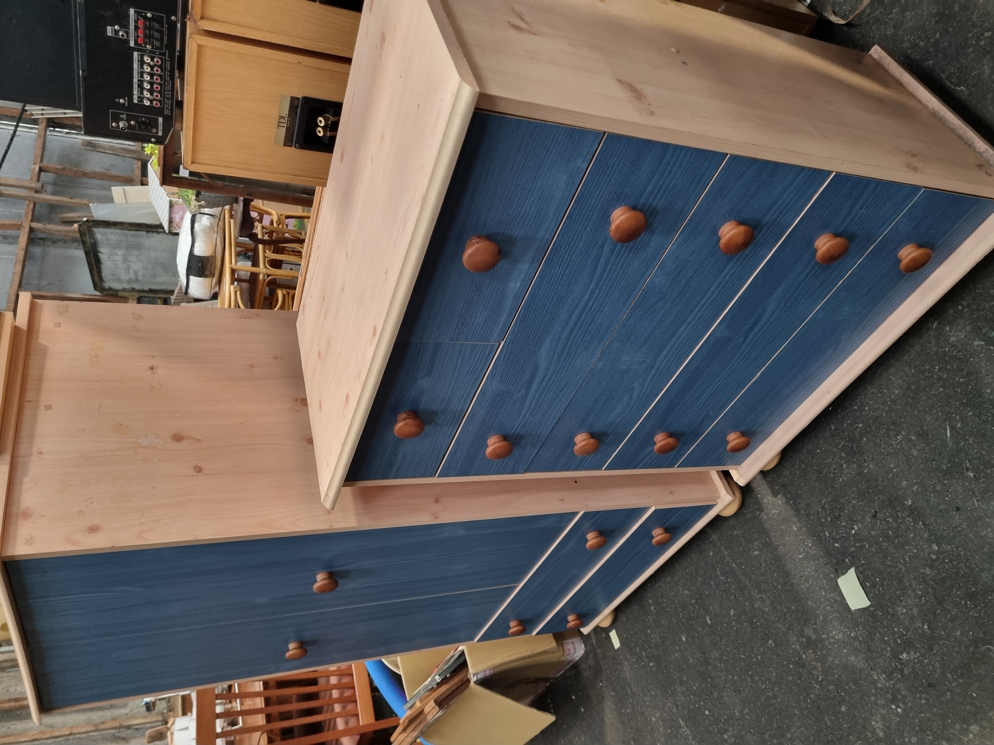 This lot comprises two matching pieces of contemporary bedroom furniture constructed from solid pine. The first item is a six-drawer chest in a two-over-four configuration. The second item is a tall combination storage unit featuring two cupboard doors on the left side and a vertical stack of four drawers on the right. Both units feature a natural finish pine carcass with decorative blue-washed stain applied to the drawer and door fronts, allowing the wood grain to remain visible. The furniture is fitted with turned wooden pull knobs in a matching natural finish and is supported on turned wooden bun feet. The construction utilize modern machine-made joinery techniques consistent with late 20th-century mass-market production.