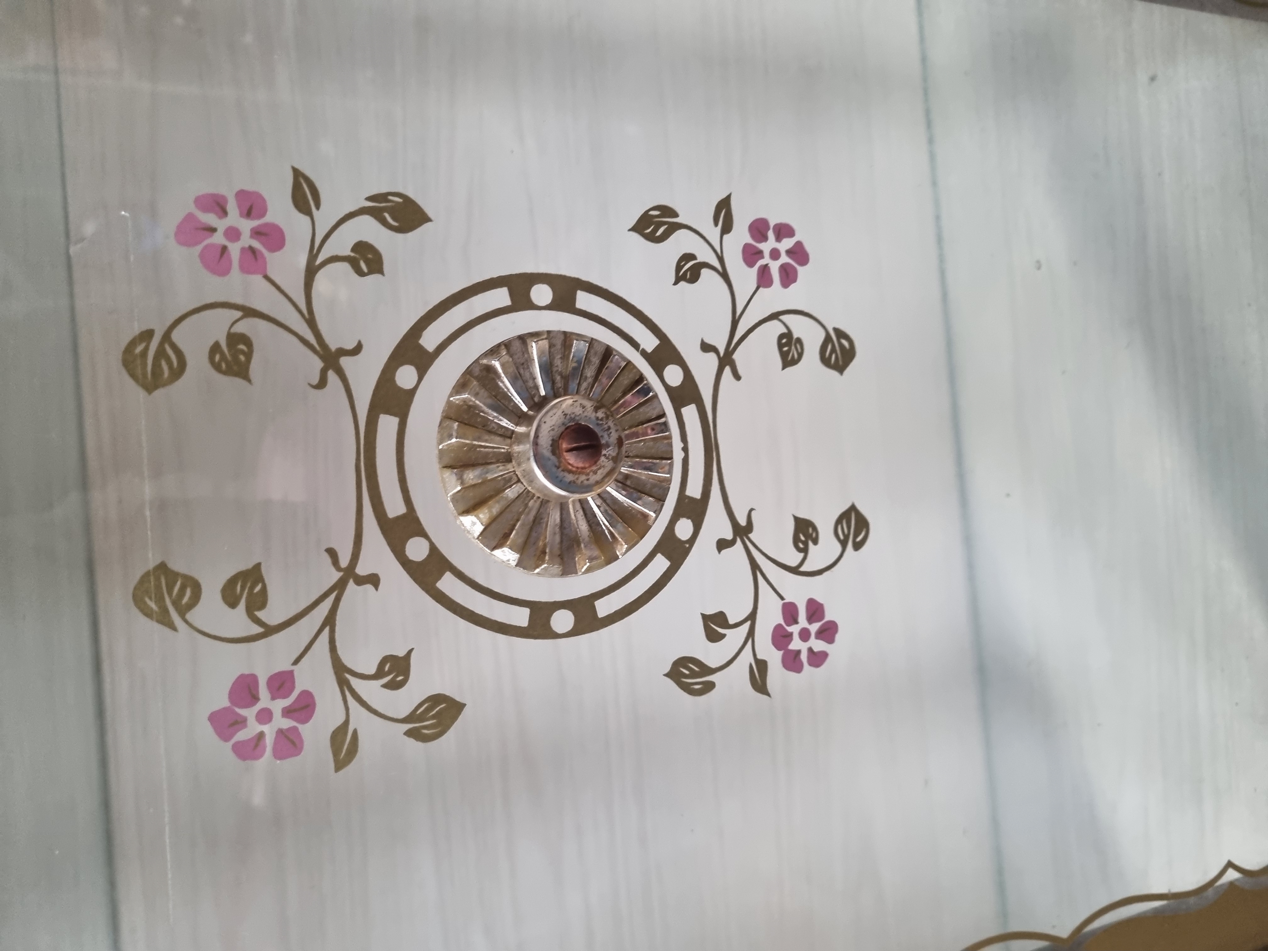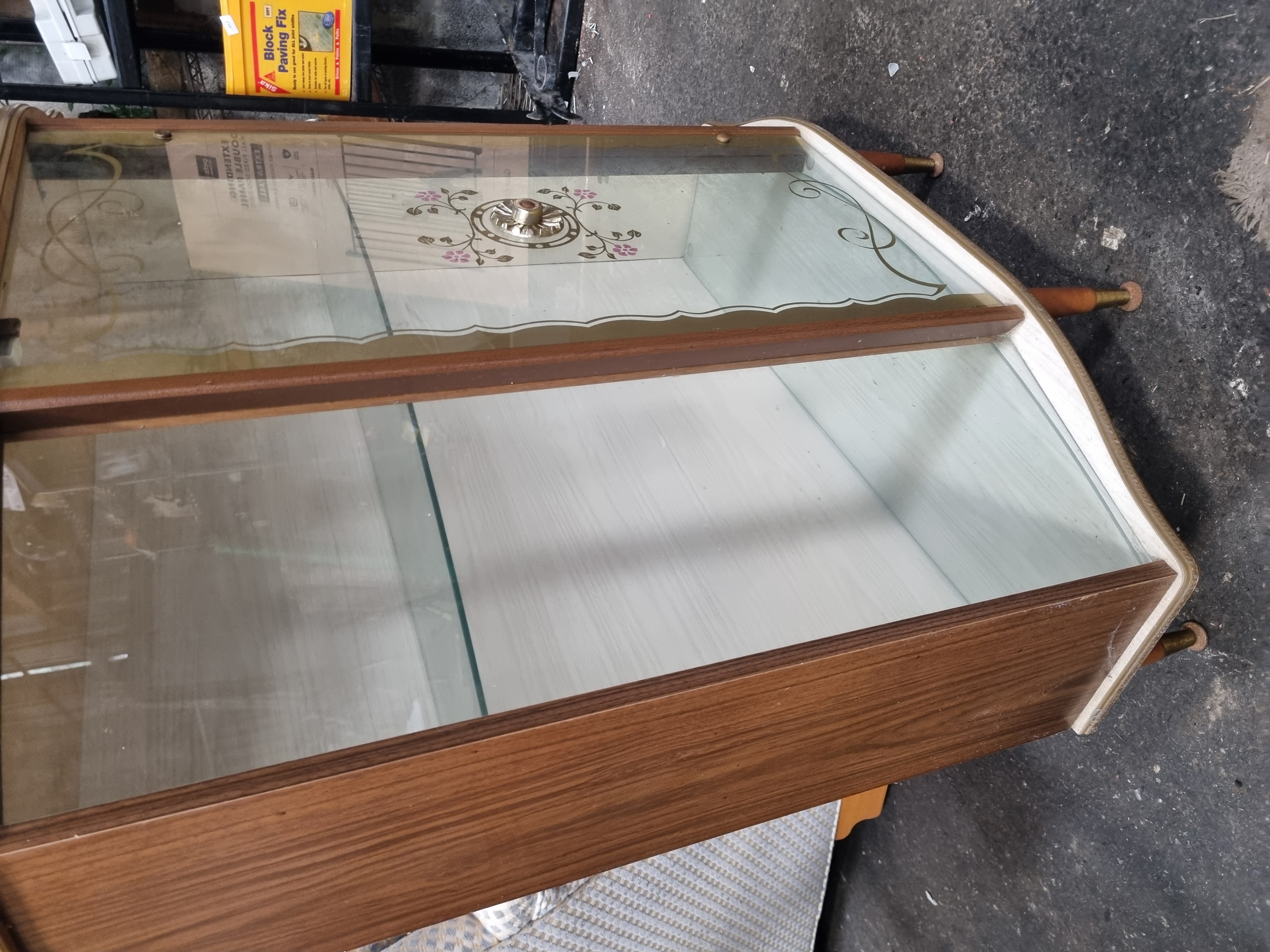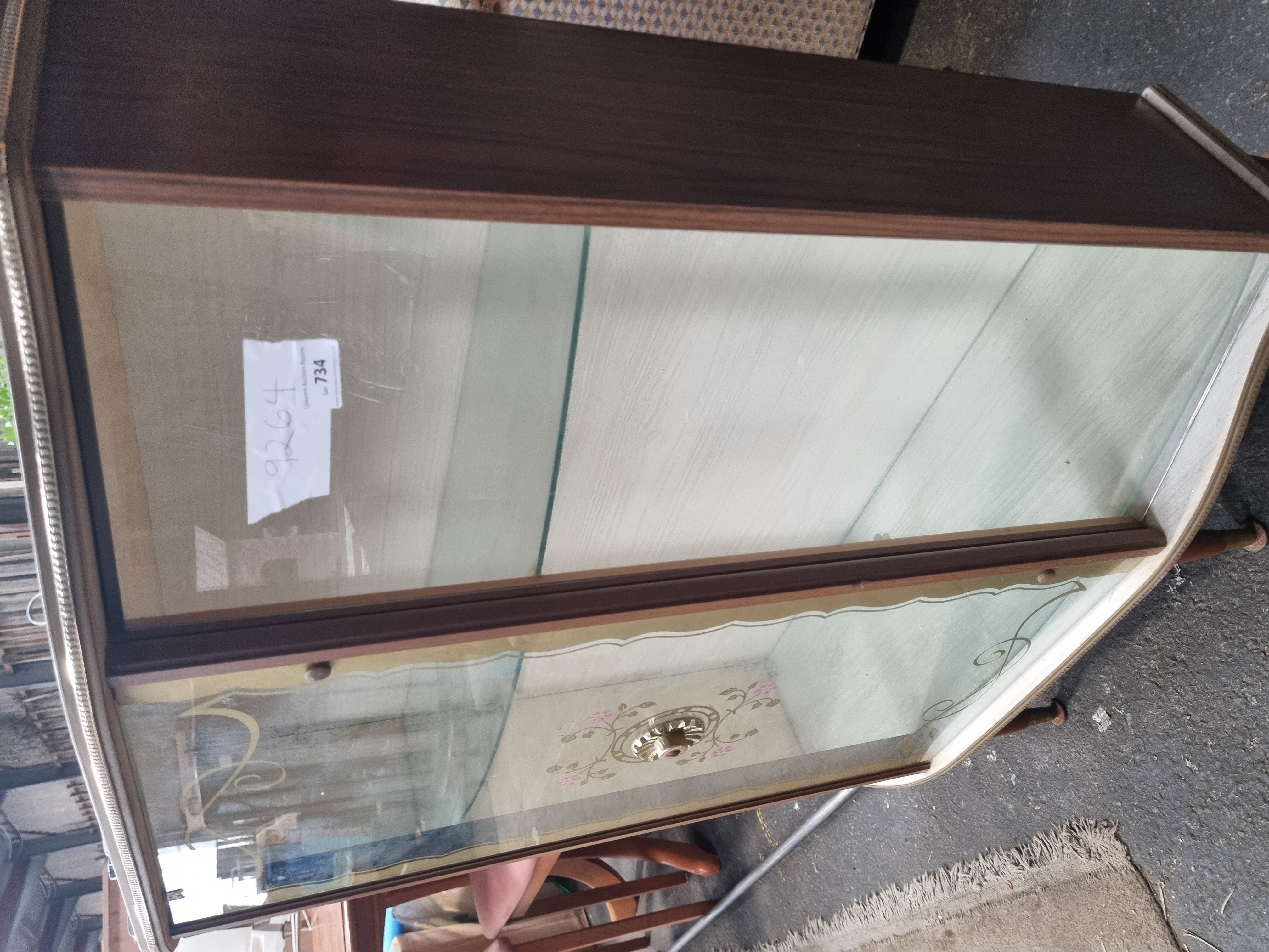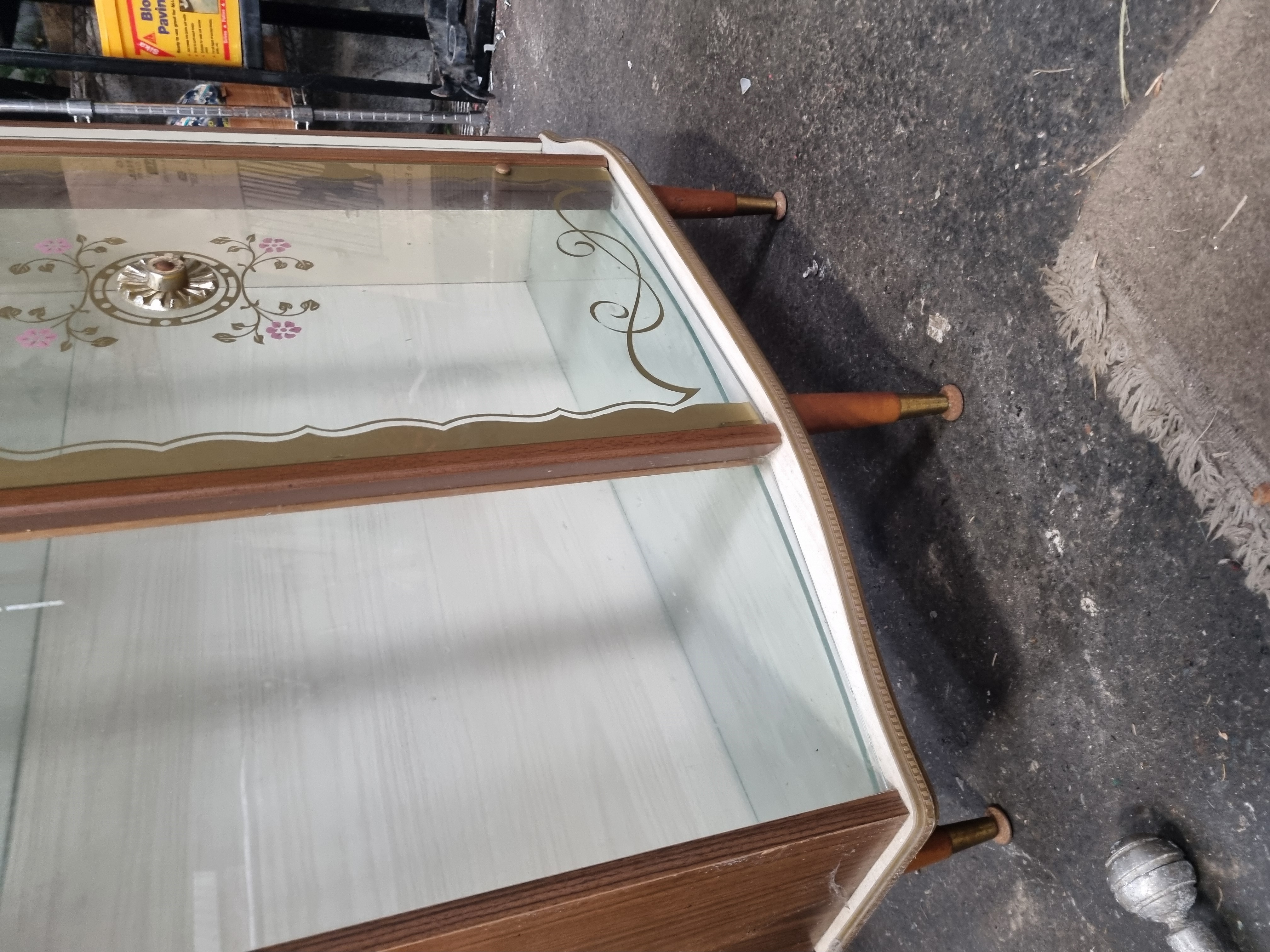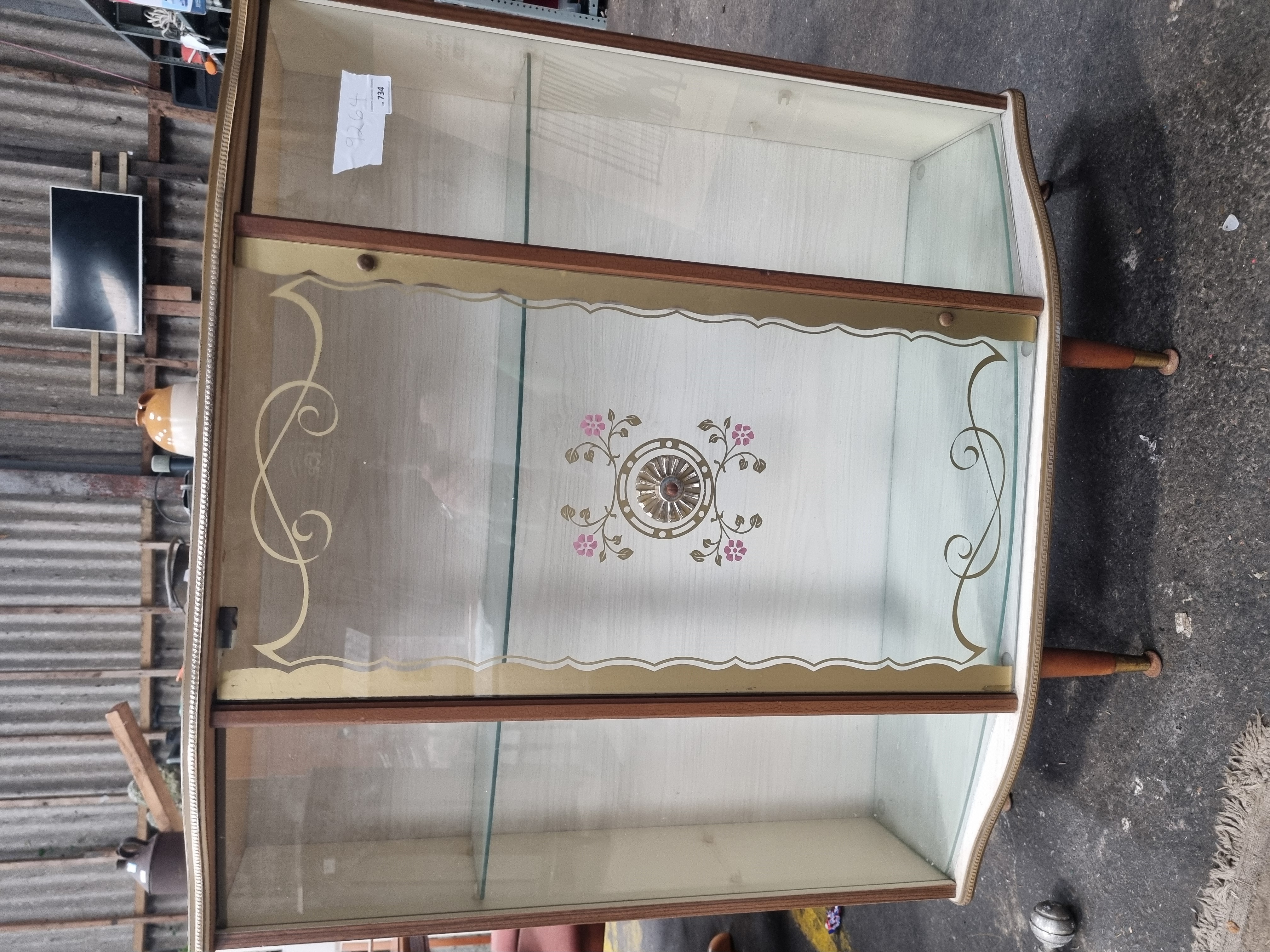 A mid-20th-century one-piece display cabinet of bow-fronted form, constructed with a mid-toned wood-grain laminate finish over a composite frame. The unit features curved glass side panels and a single central glazed door. The door is decorated with a gilt-effect scrolled border and a central transfer-printed motif depicting pink flowers and green foliage surrounding a circular design. The interior contains two glass shelves set against a light-toned wood-effect laminate back panel and base. The cabinet is supported by four tapered, splayed wooden legs, each terminating in a brass-toned metal ferrule and foot. The central door retains a circular, fluted metal pull handle. A white auction label is present on the front glazing.