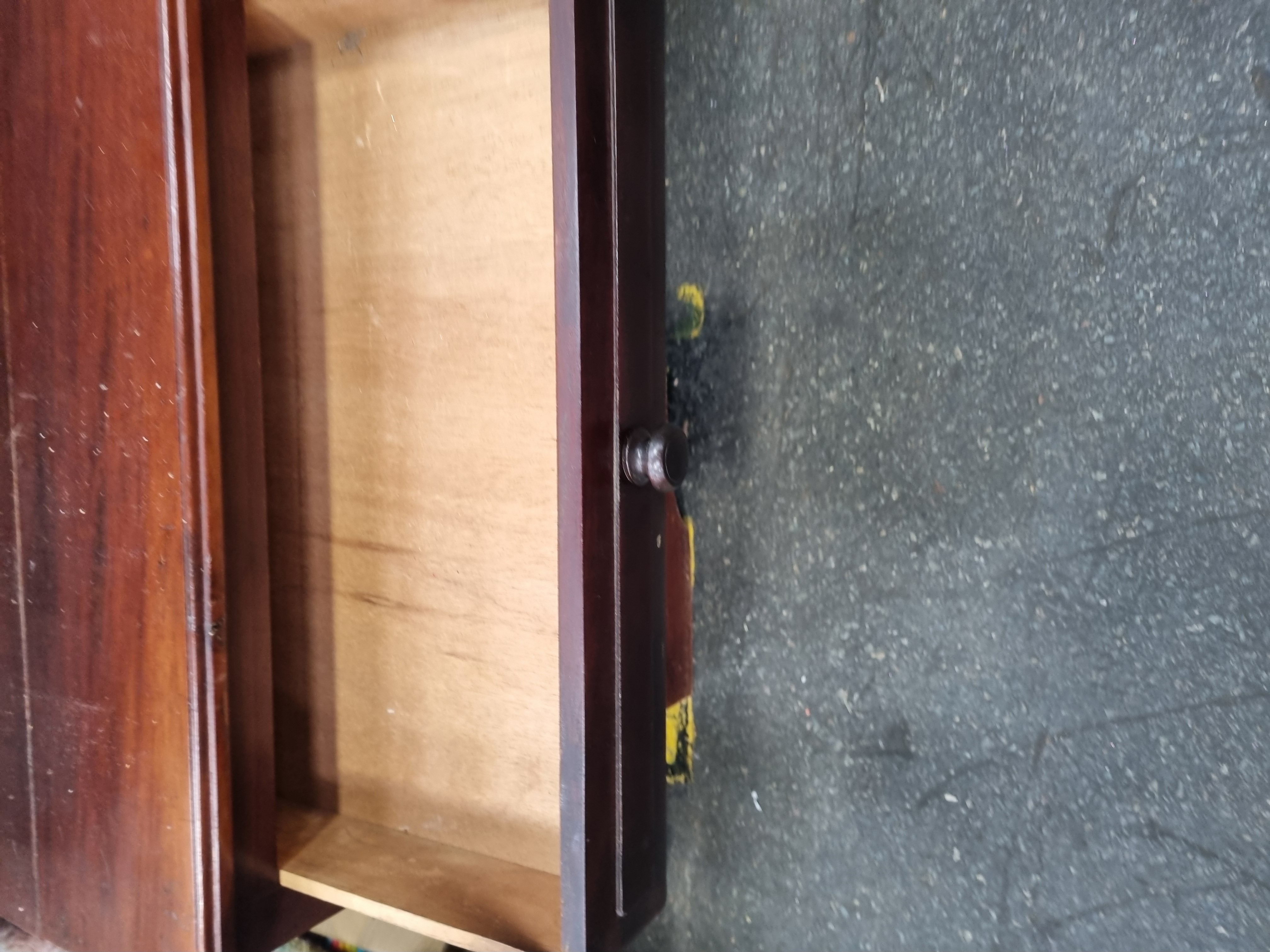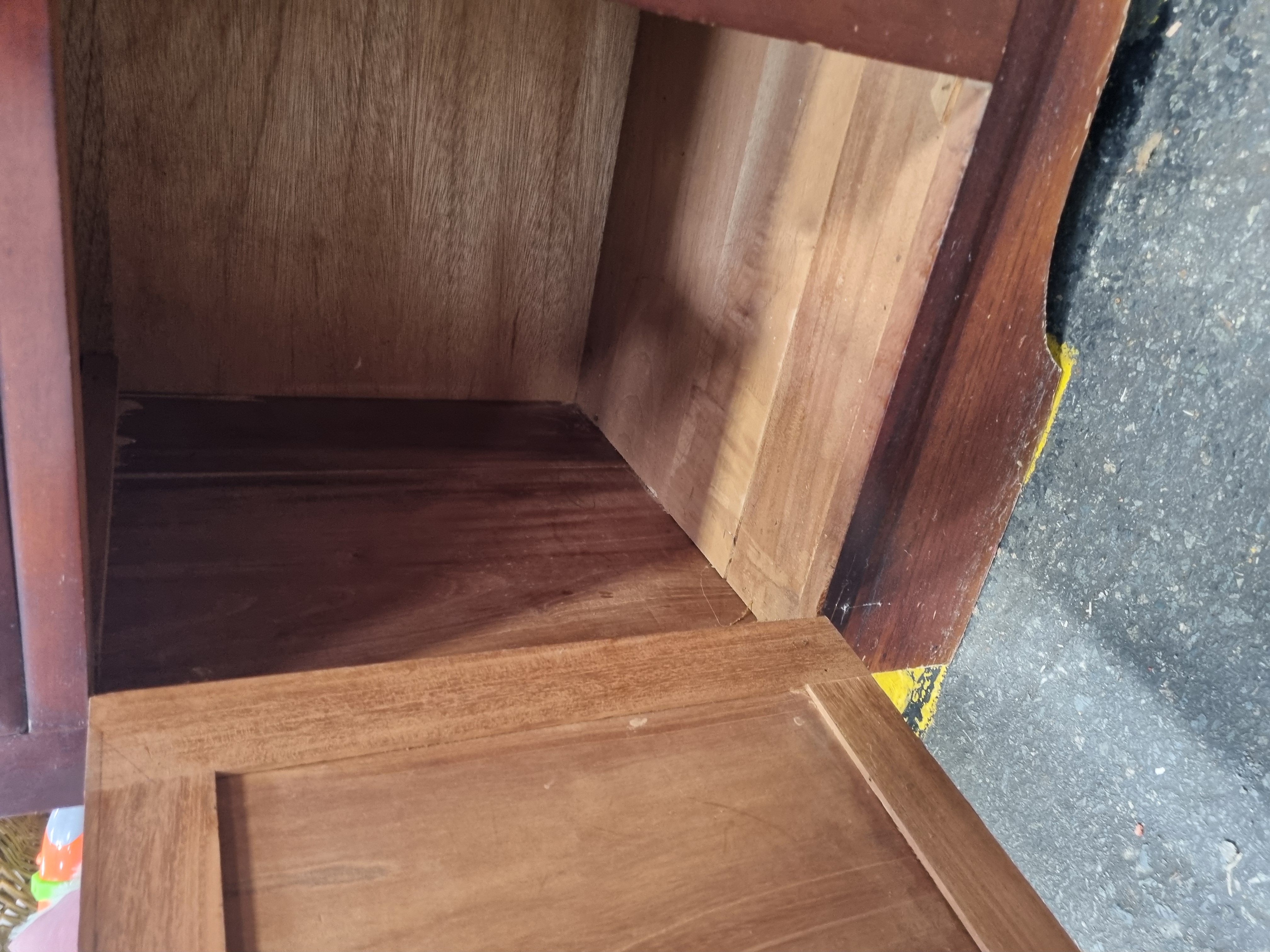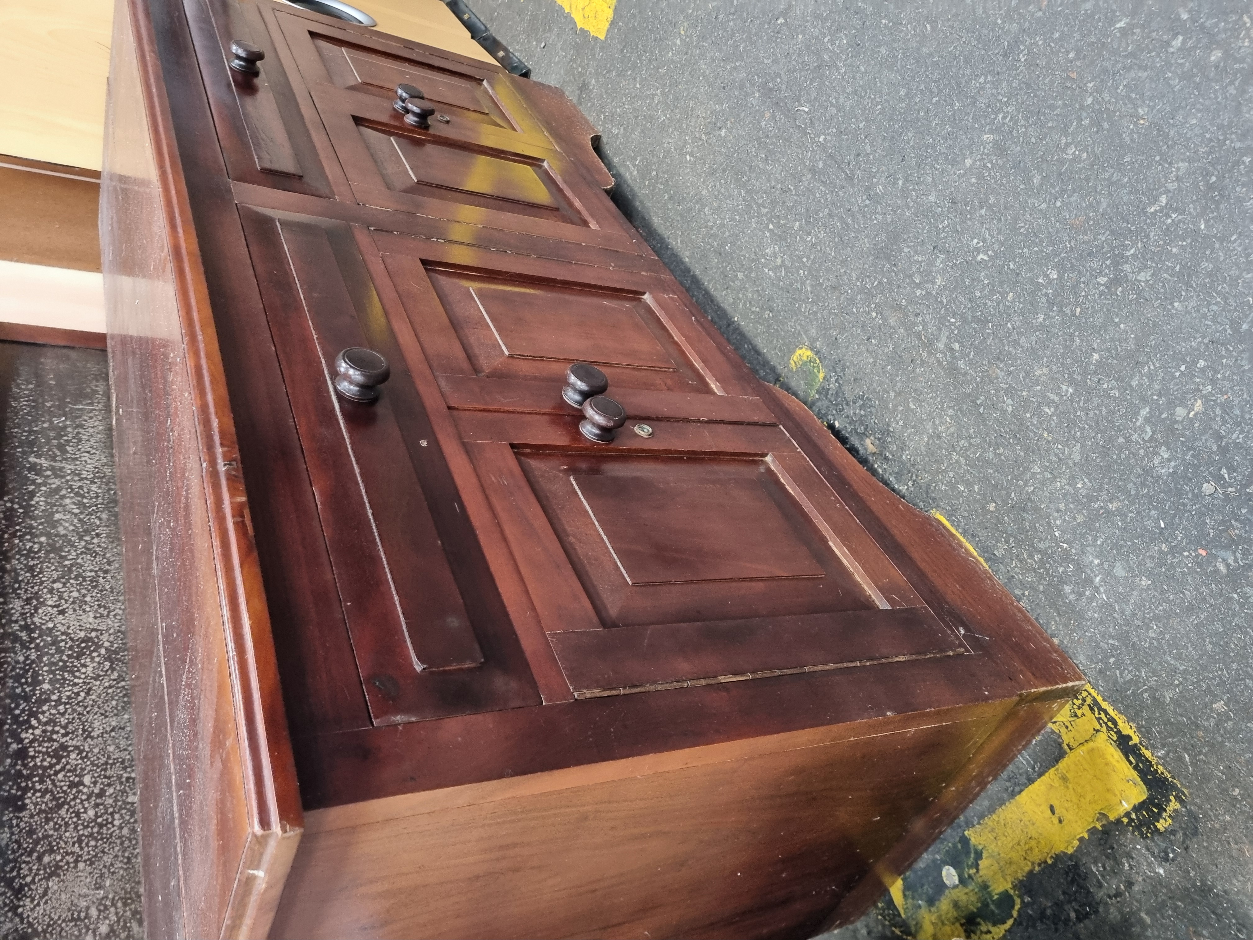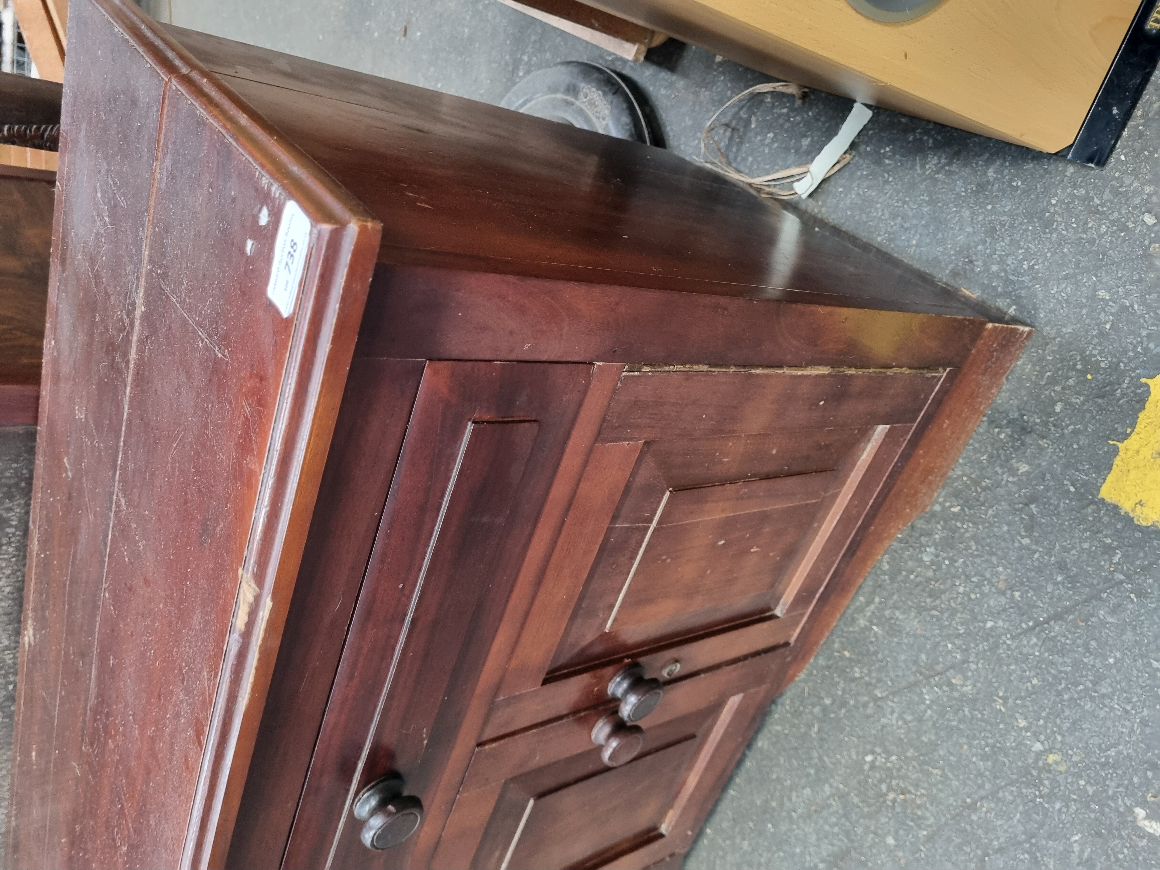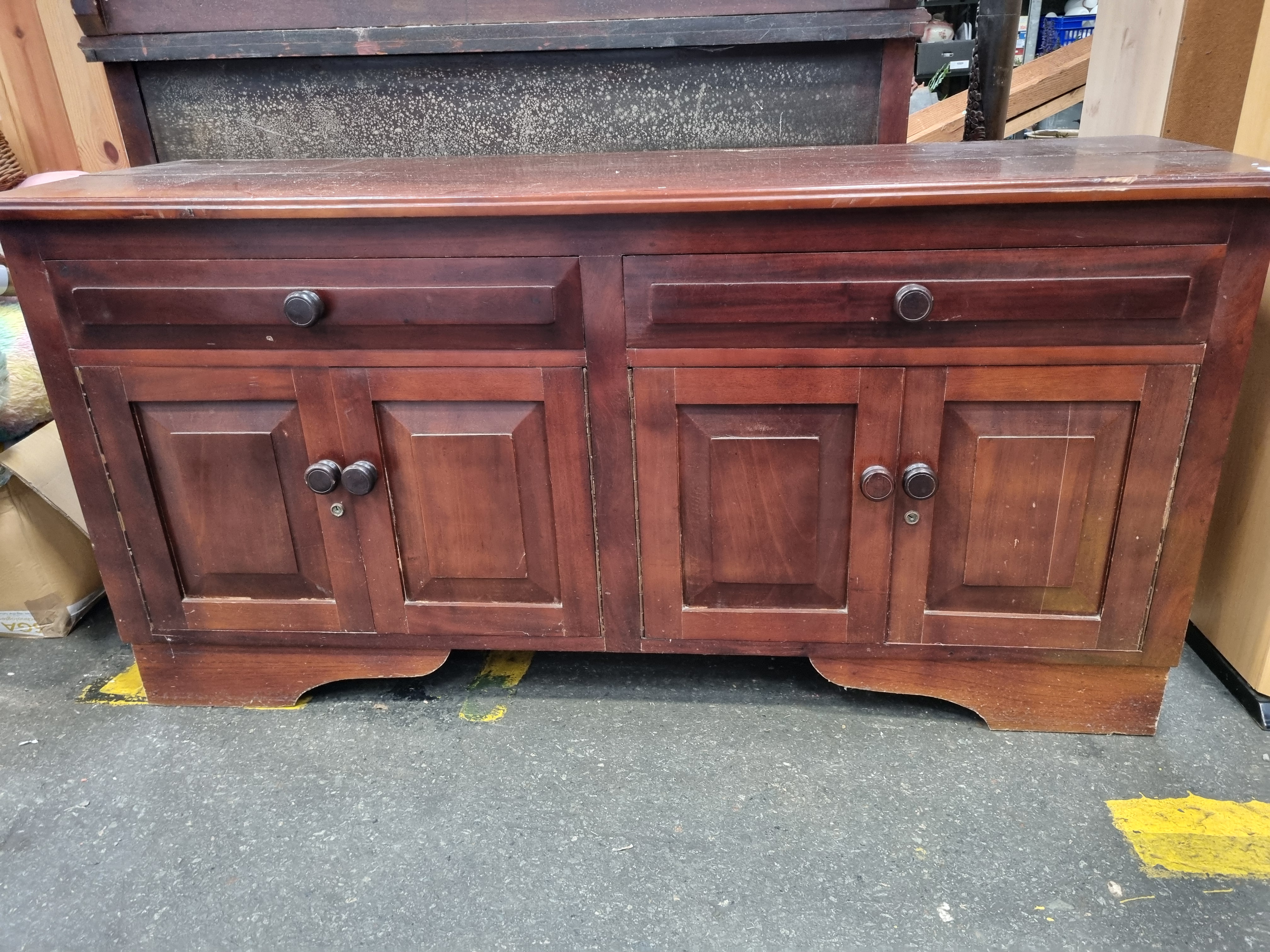 A Victorian style mahogany or mahogany-stained hardwood sideboard. The rectangular top features a moulded edge above a pair of frieze drawers. The lower section consists of two pairs of panelled cupboard doors, with each pair opening to an undivided storage compartment. The unit is raised on a shaped plinth base with bracket-style cutouts. The drawers and doors are fitted with turned wooden knobs. Two brass-rimmed keyholes are located on the cupboard doors. The interior shows a secondary wood construction for the carcass and drawer linings. A white auction lot sticker with the number 738 is adhered to the top left corner.