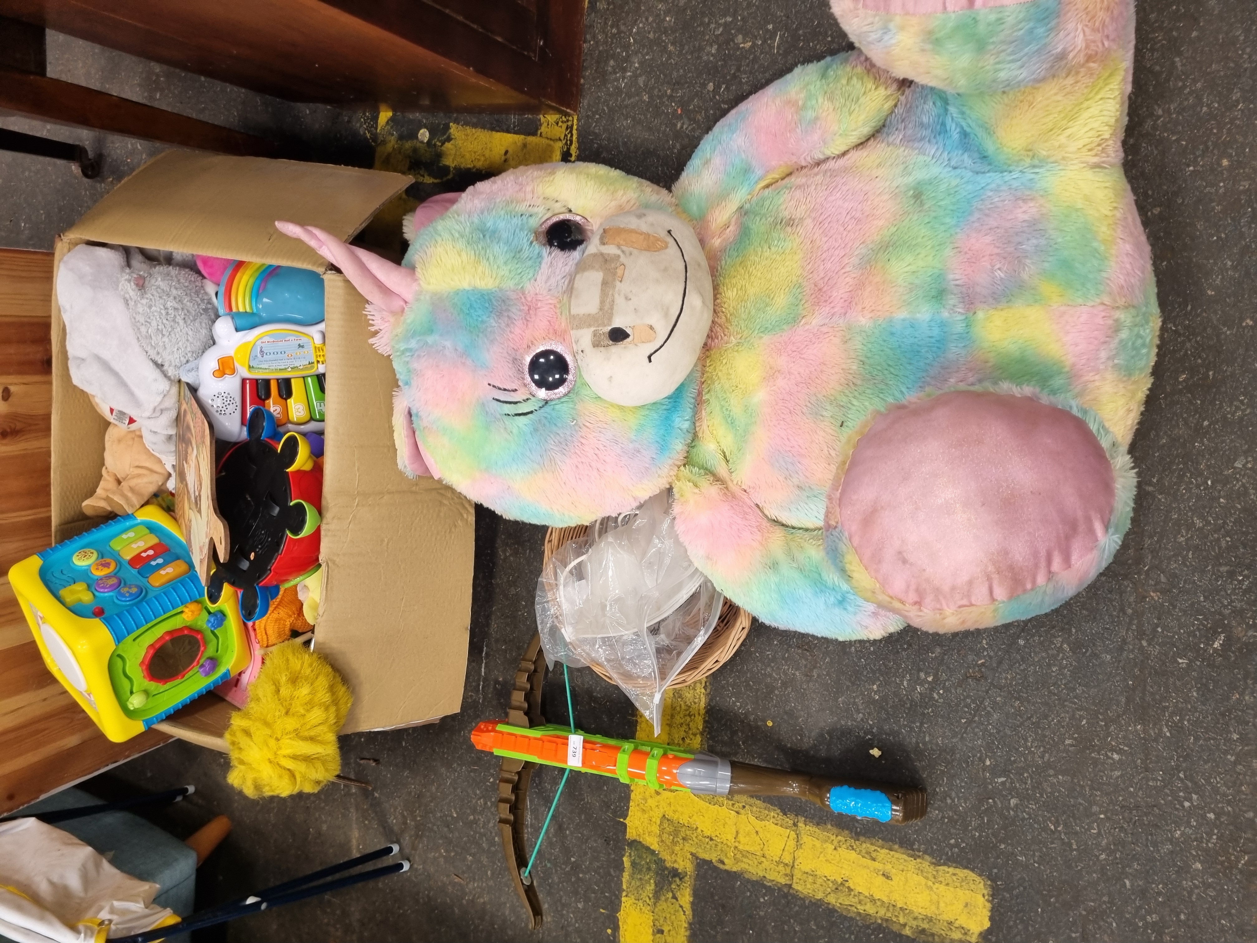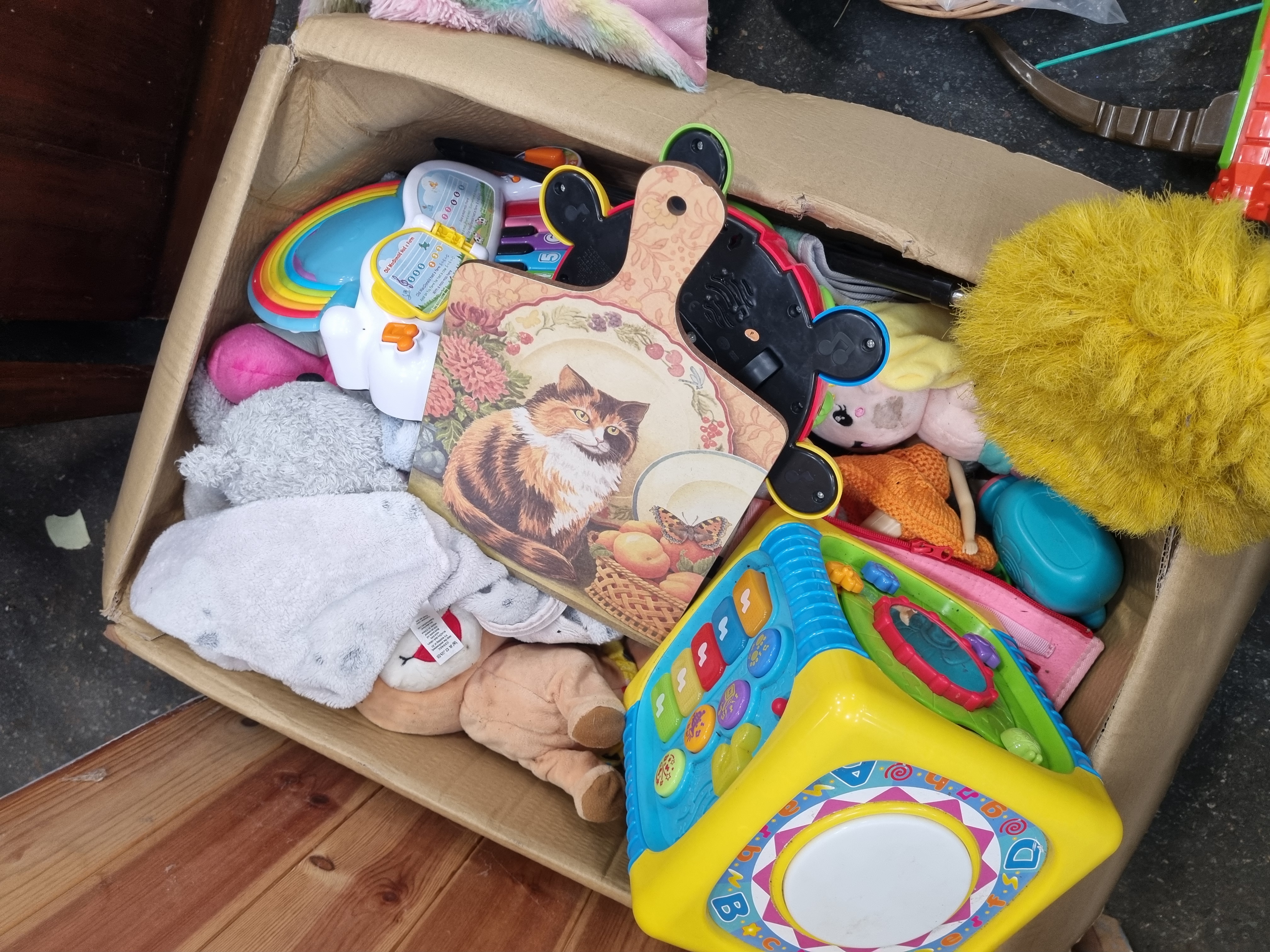 The lot further includes a cardboard box containing an assortment of play items and decorative pieces. This includes a multi-coloured plastic infant activity cube with various buttons and gears, a wooden rectangular cutting board with a handle featuring a printed illustration of a calico cat amongst flowers, and a black Mickey Mouse silhouette plastic component. Also present is a small plastic toy piano with multi-coloured keys, several small plush animals, dolls, and a small wicker basket containing unidentified contents in a clear plastic bag.