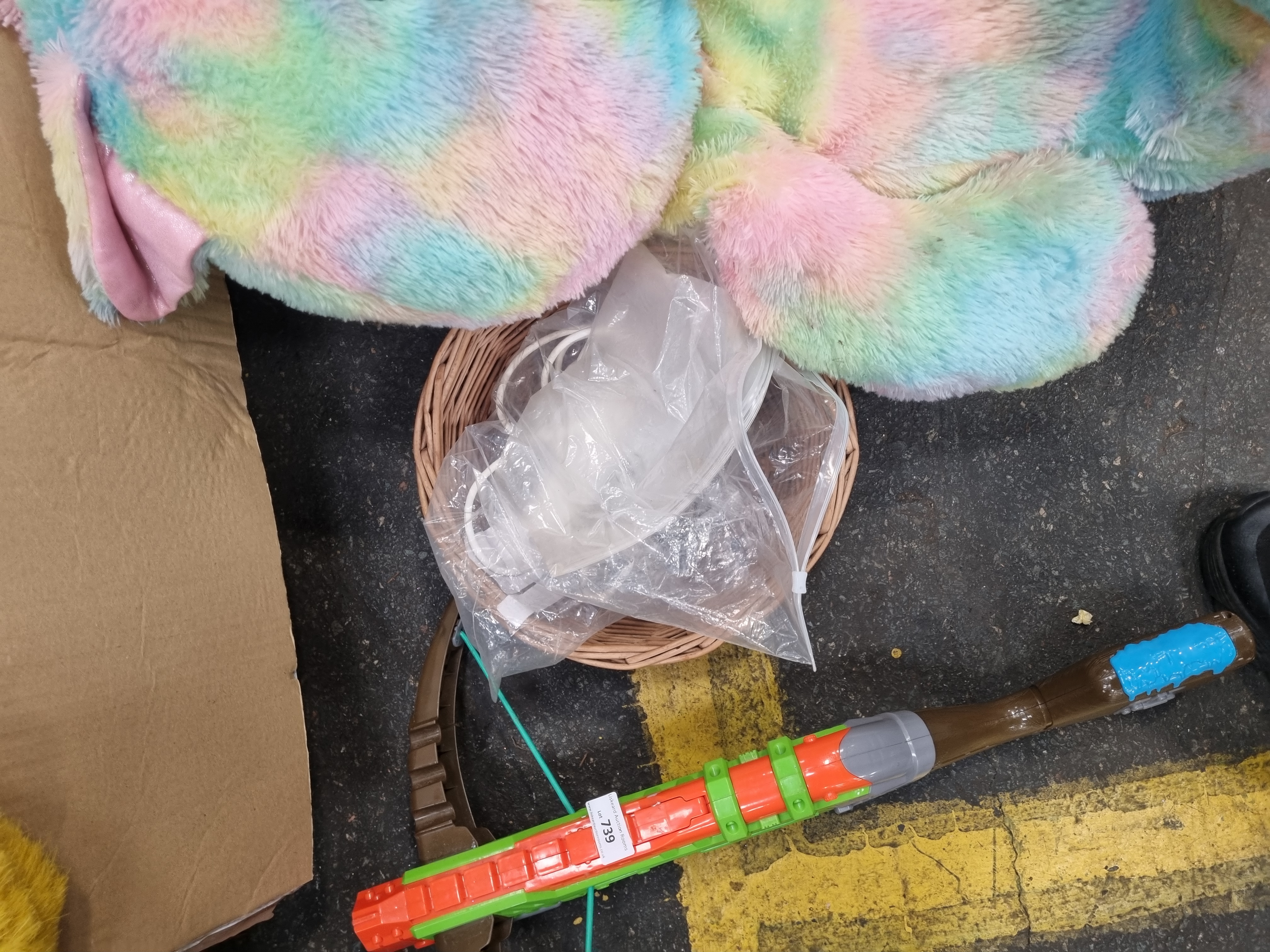 A collection of assorted childrens toys and household items featuring a Petron toy crossbow and a large Holiday Home plush unicorn. The toy crossbow is constructed from plastic with a green and orange barrel and a brown stock, featuring a manual pull-back string mechanism. It bears a white adhesive lot tag from Lizard Auction Rooms marked Lot 739. The jumbo plush unicorn is finished in a multi-coloured pastel rainbow tie-dye pattern with large iridescent glitter eyes and pink fabric ears.