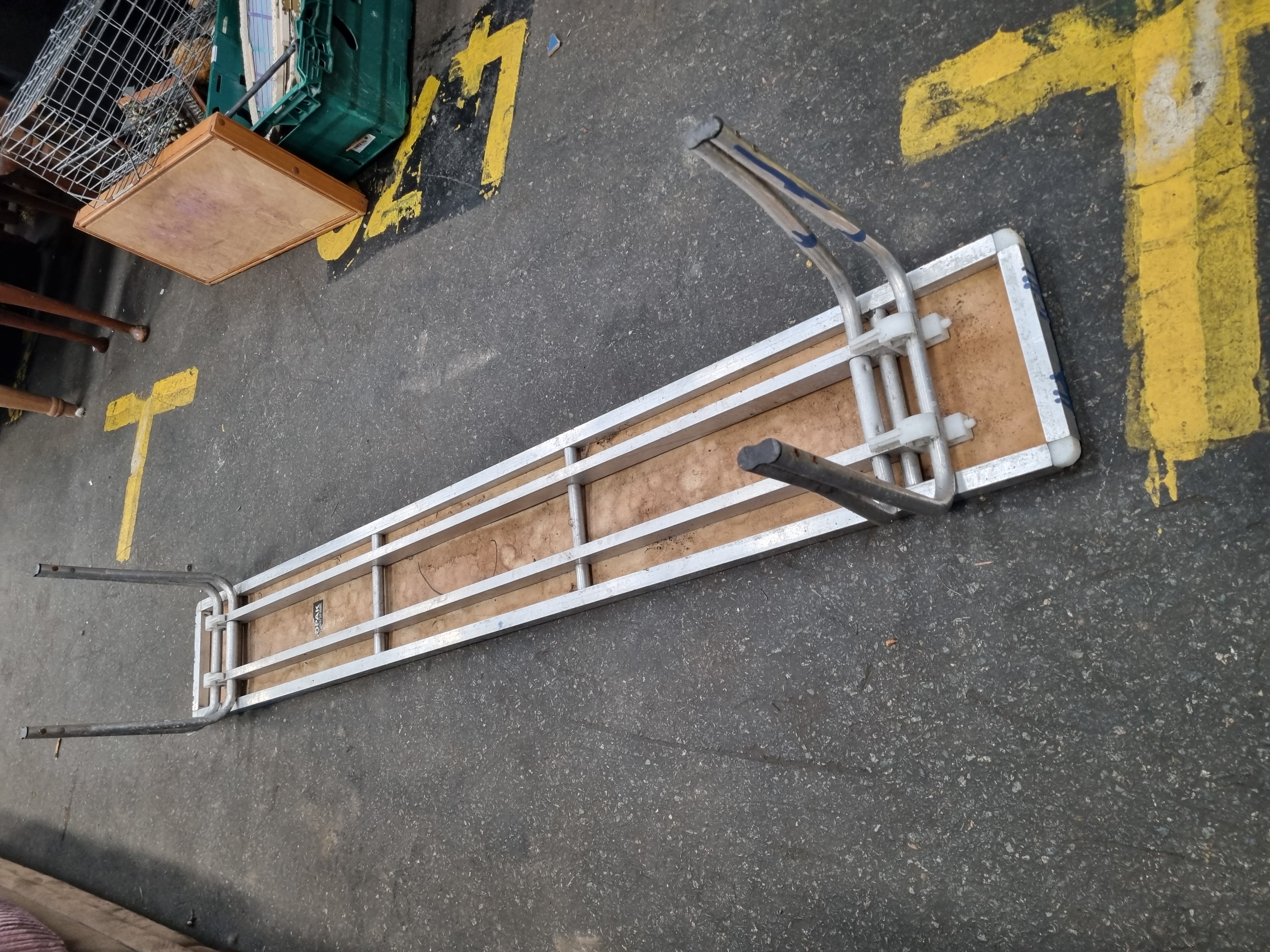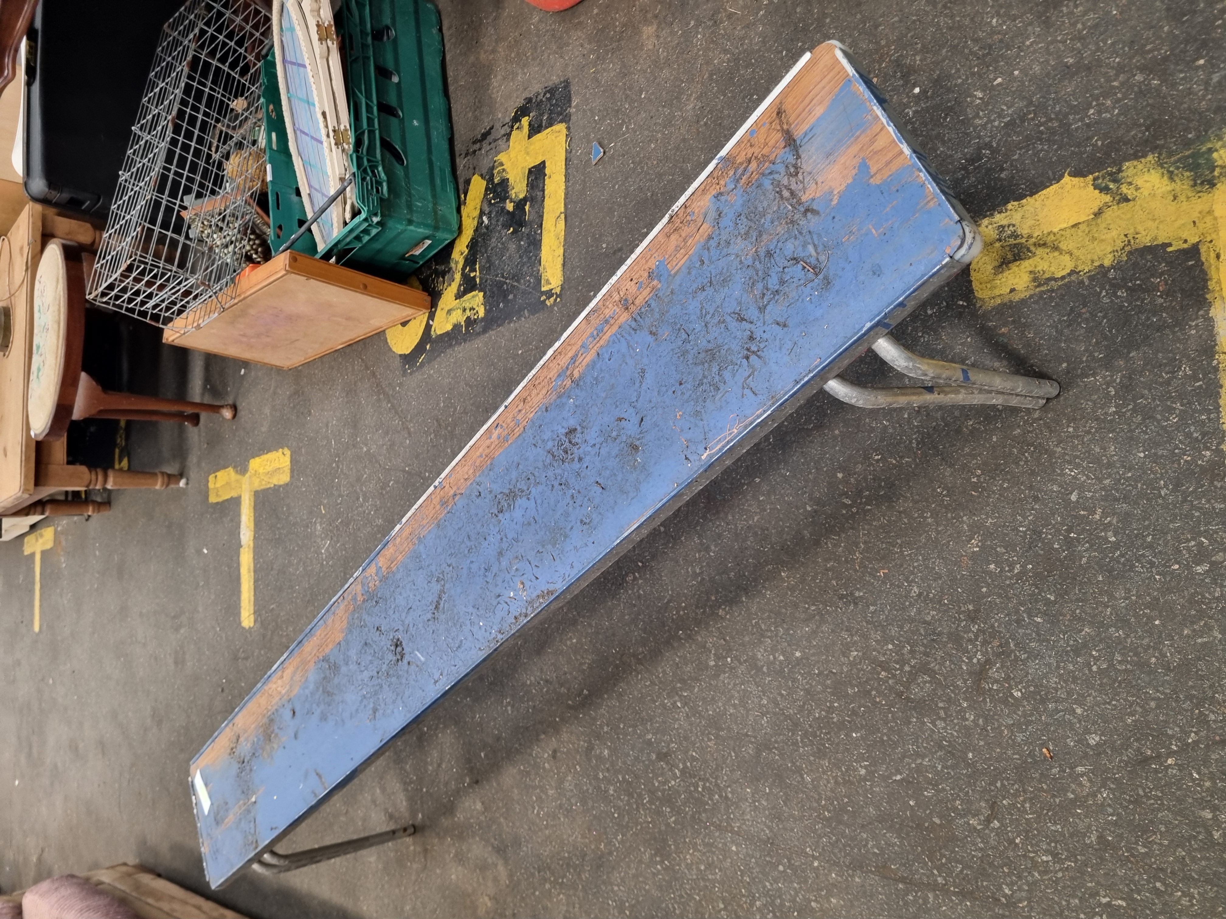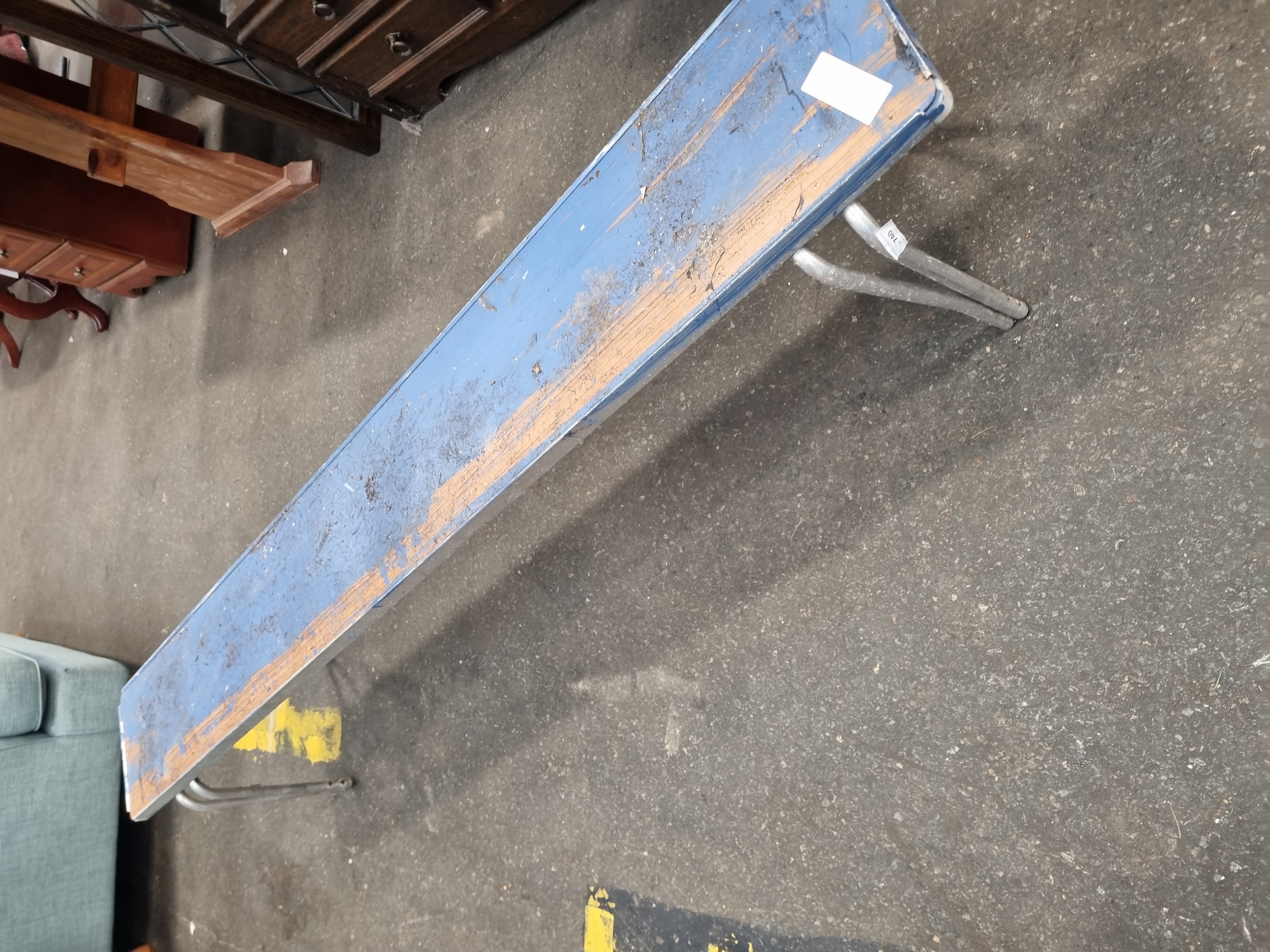 A vintage folding bench manufactured by Gopak. The bench features a rectangular wooden seat board mounted within an aluminium frame. It is supported by two folding U-shaped tubular aluminium leg assemblies. The wooden seat surface shows remnants of distressed blue paint. The underside of the frame carries a manufacturer’s label for Gopak.